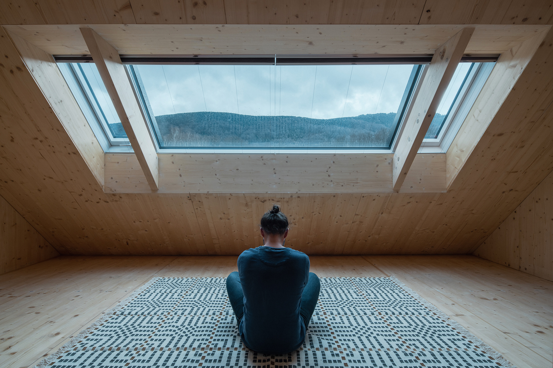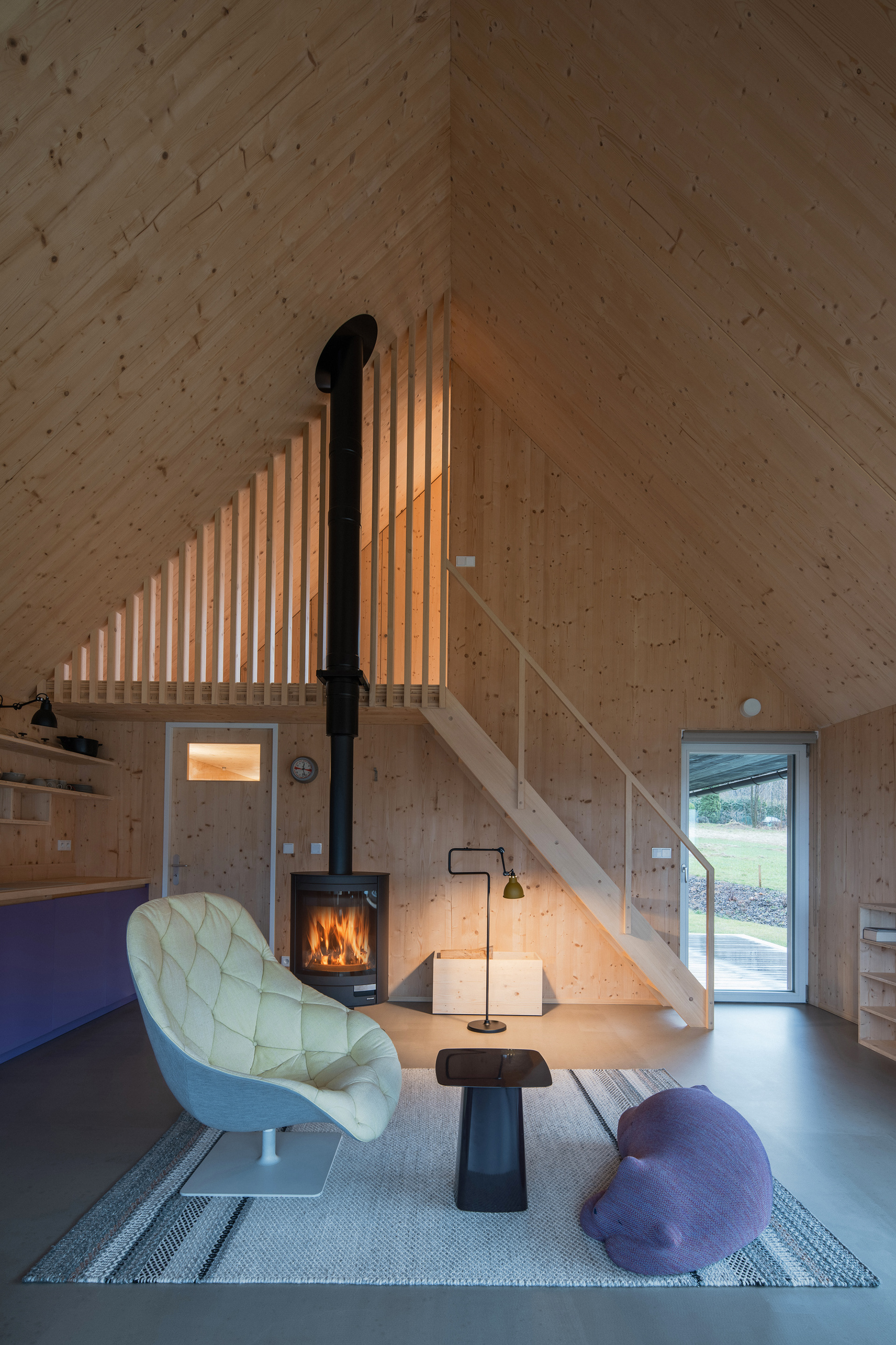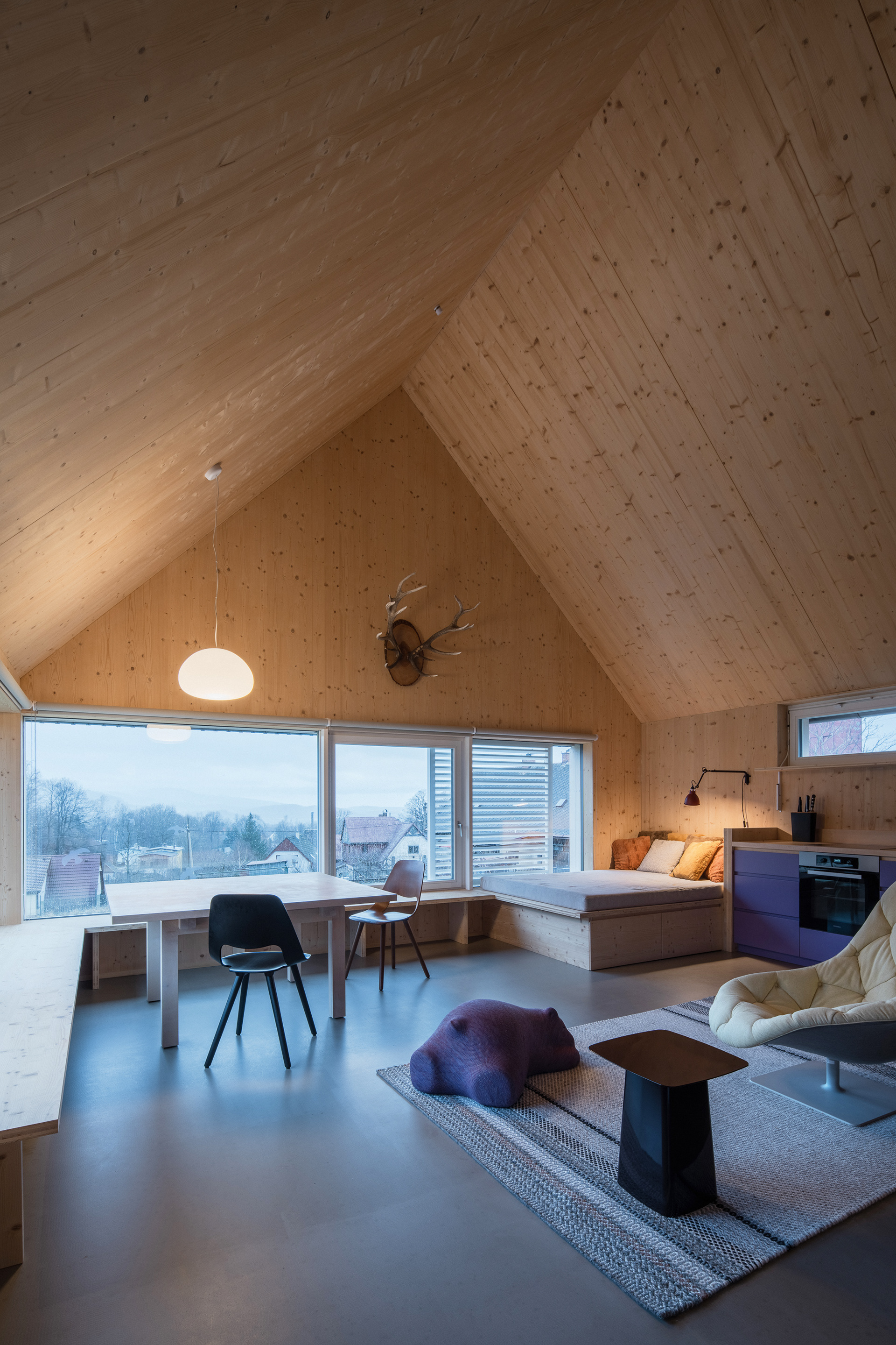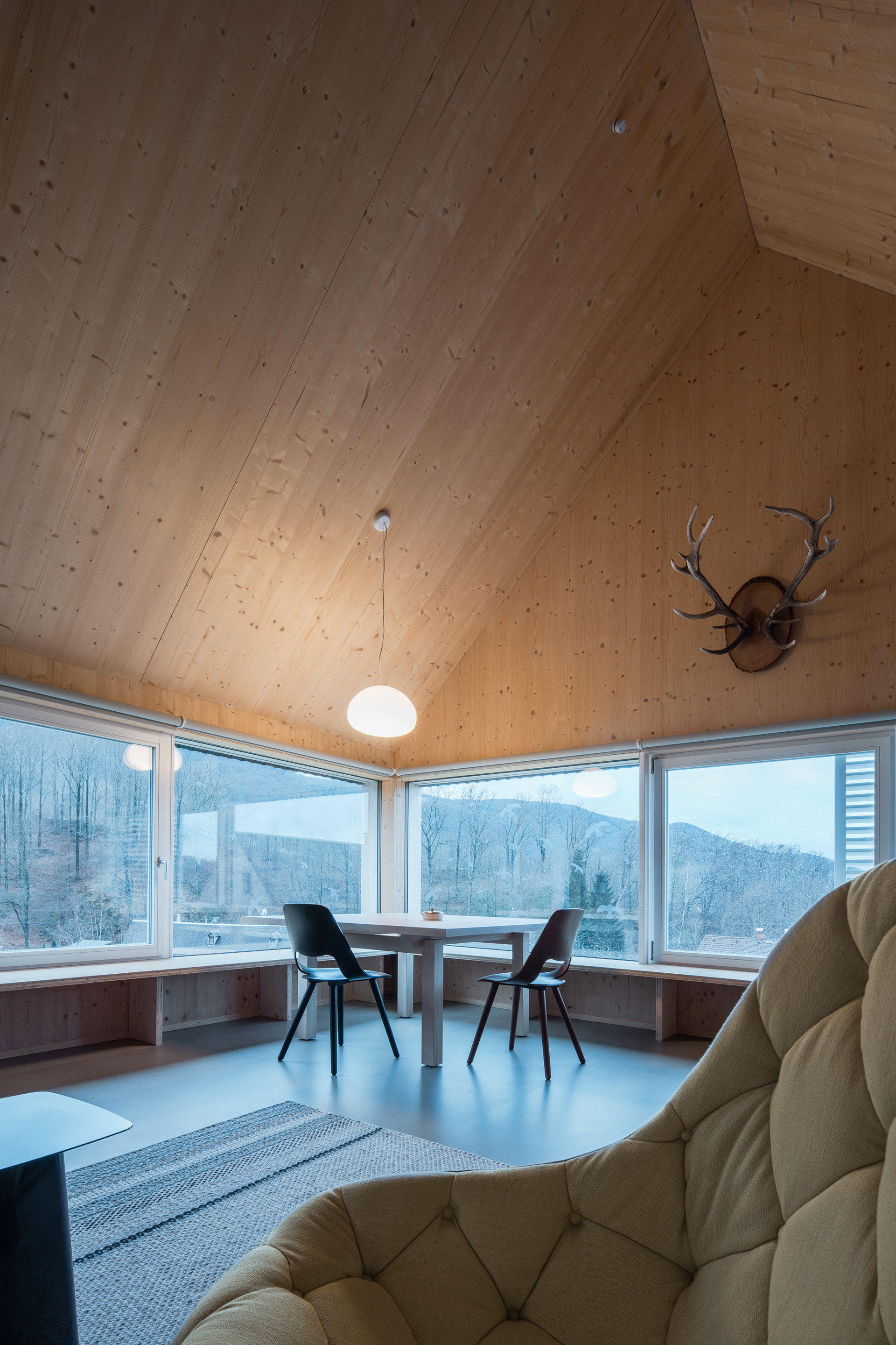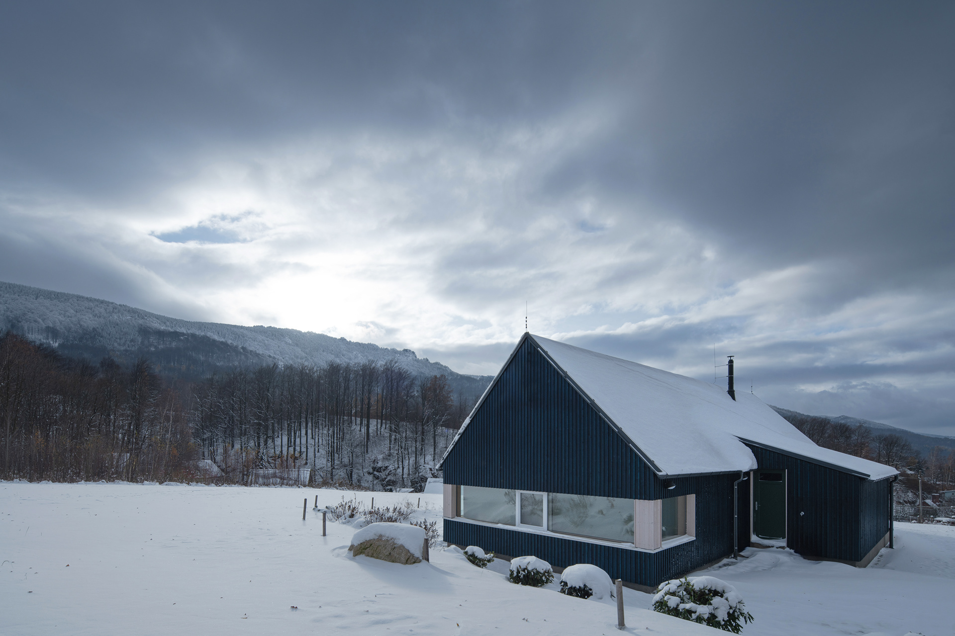 Natural materials typical of the local region and location were used to build the mountain hut. Wood, stone and glass. Wood, of course, because of the surrounding dense forests and the abundance of wooden half-timbered houses in the location. Wooden buildings have a strong tradition in the region. Glass also has a sound in the local region and the local glass is even known all over the world. The stone reflects the local mountains and harsh living conditions. On the outside, the hut is equipped with a wooden facade with a blue coating, which also refers to the local tradition. The main building material of the new mountain hut is the massive wooden CLT panel Novatop, which performs both a load-bearing and a visual function.