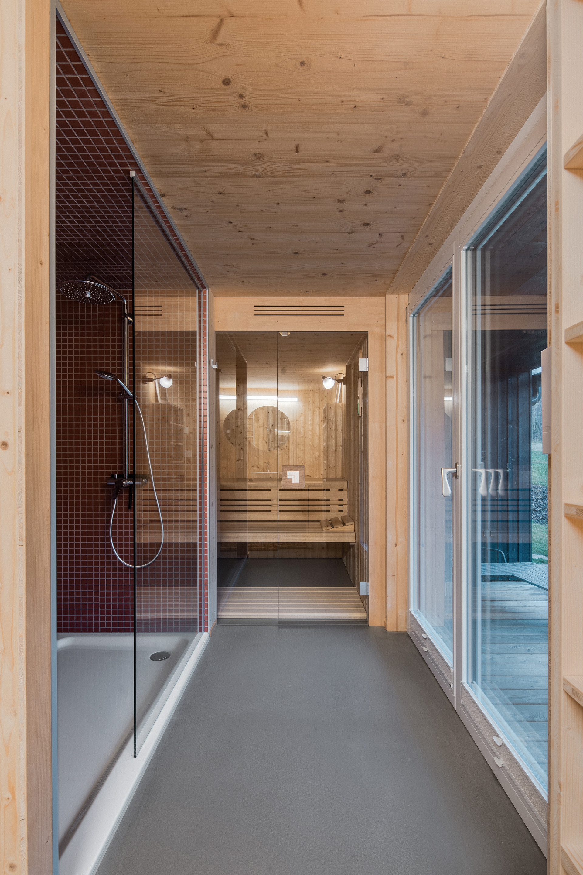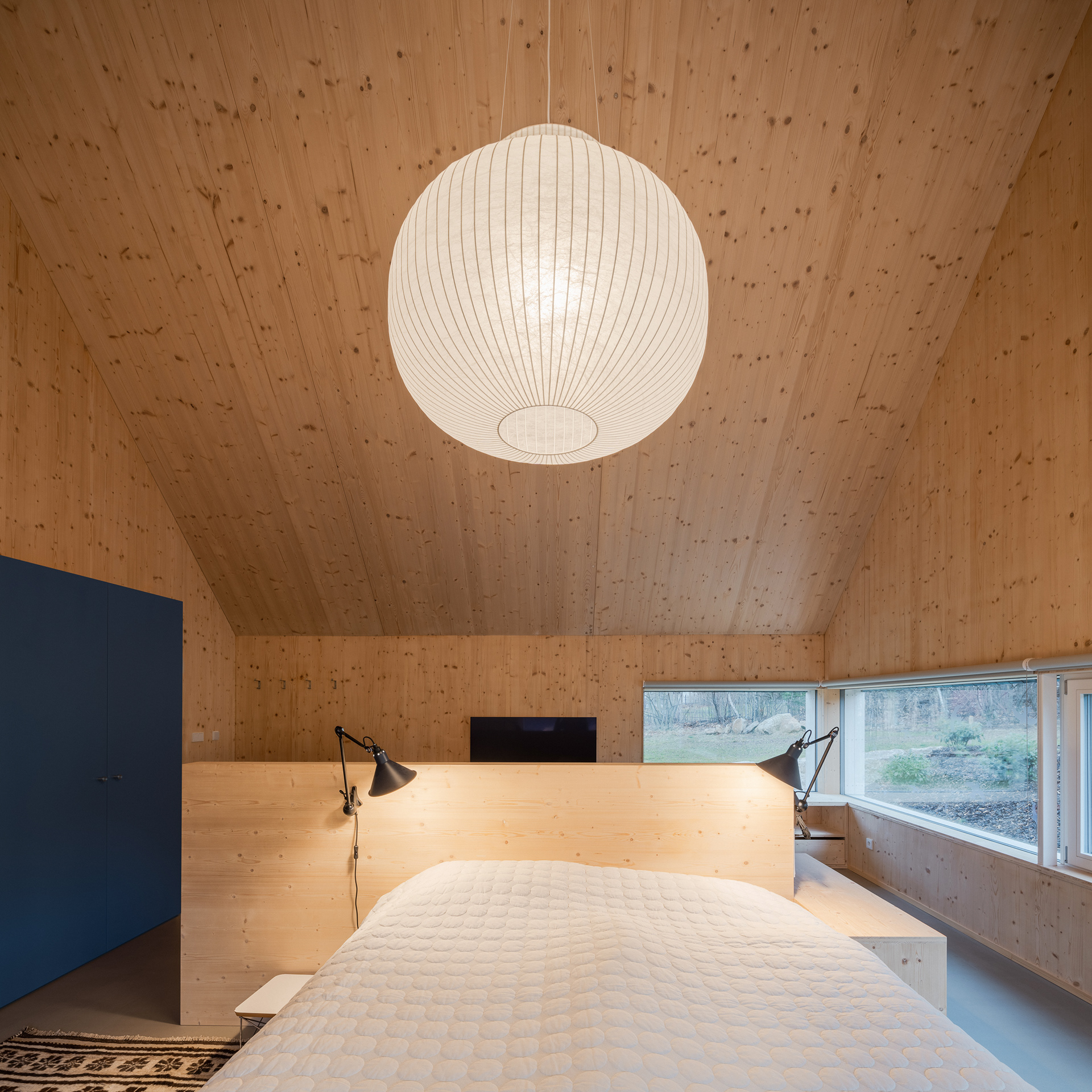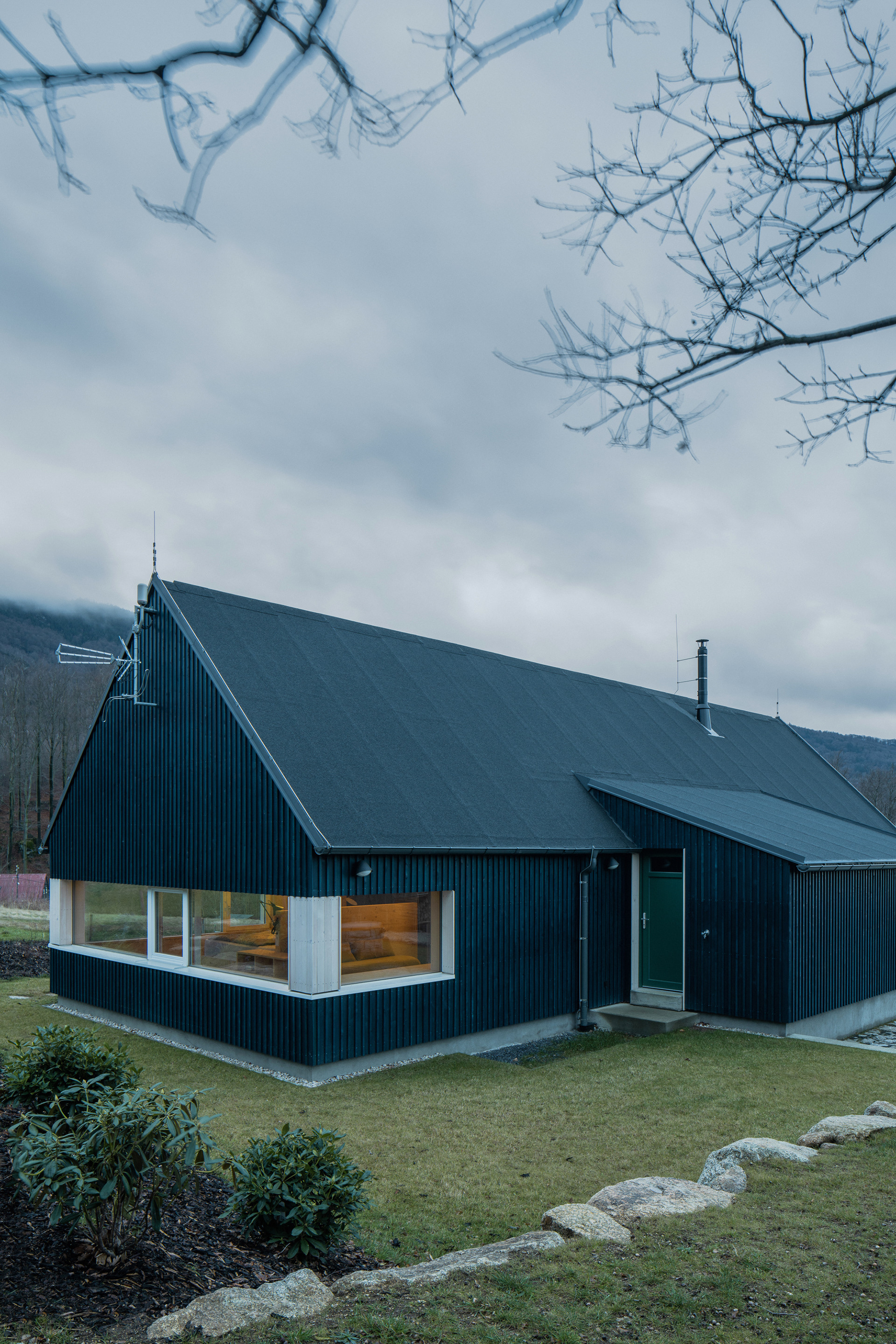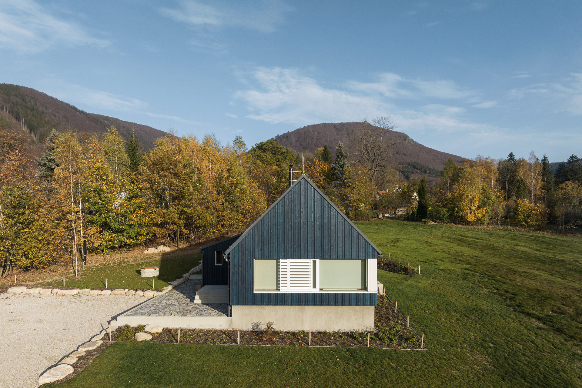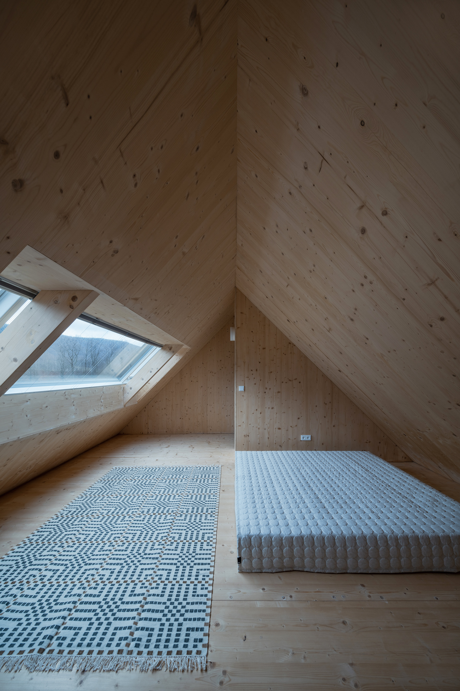 Natural materials typical of the local region and location were used to build the mountain hut. Wood, stone and glass. Wood, of course, because of the surrounding dense forests and the abundance of wooden half-timbered houses in the location. Wooden buildings have a strong tradition in the region. Glass also has a sound in the local region and the local glass is even known all over the world. The stone reflects the local mountains and harsh living conditions. On the outside, the hut is equipped with a wooden facade with a blue coating, which also refers to the local tradition. The main building material of the new mountain hut is the massive wooden CLT panel Novatop, which performs both a load-bearing and a visual function.