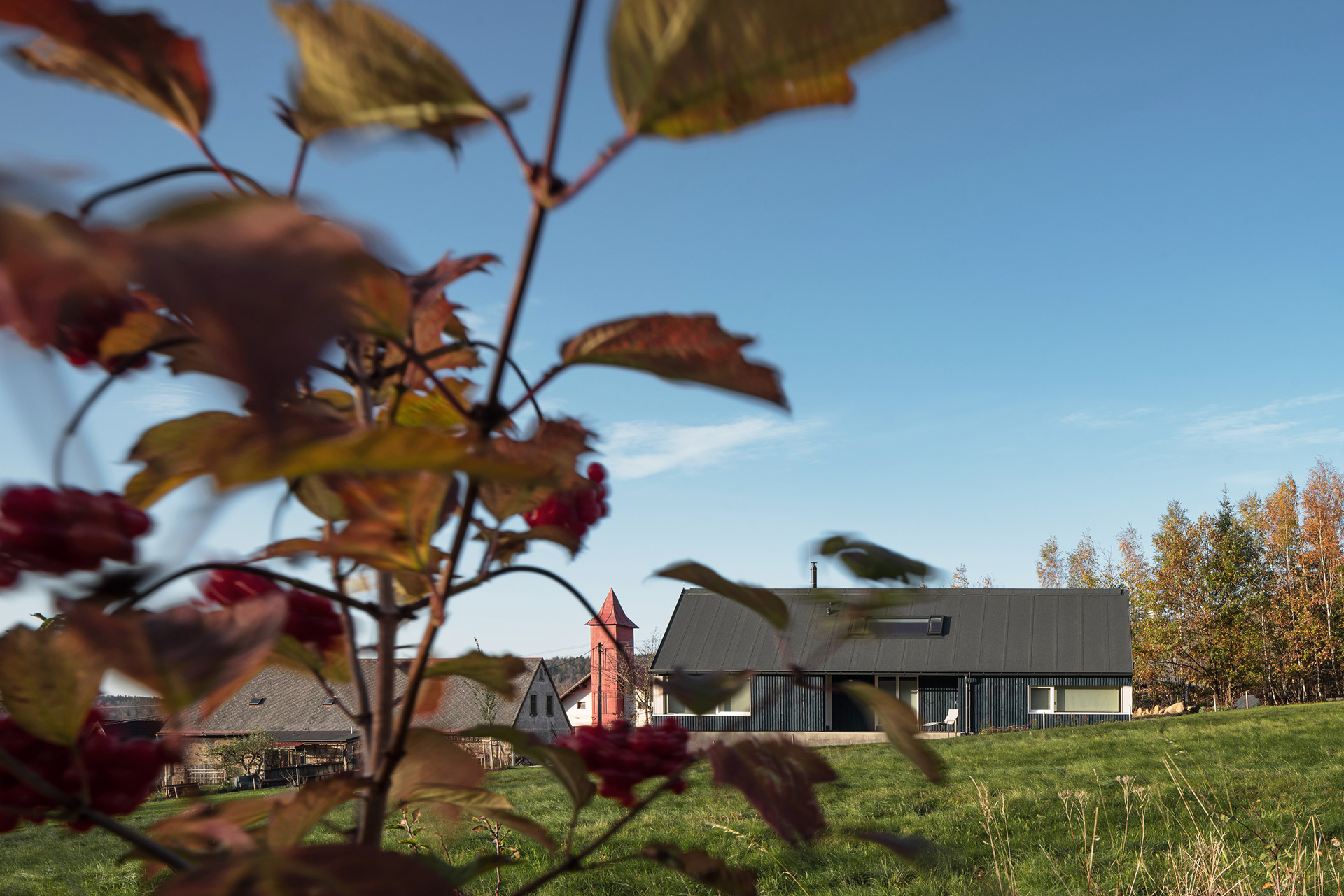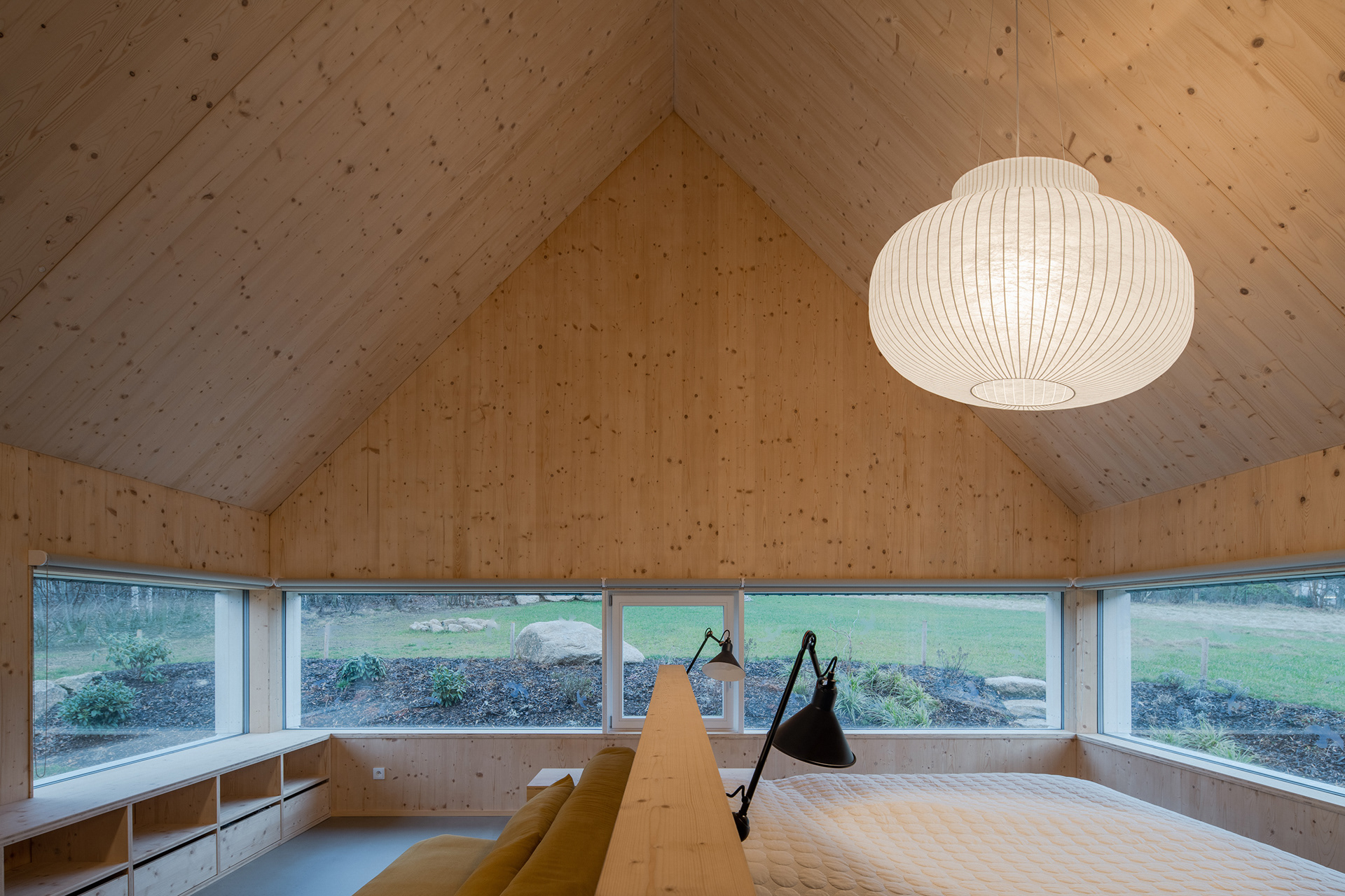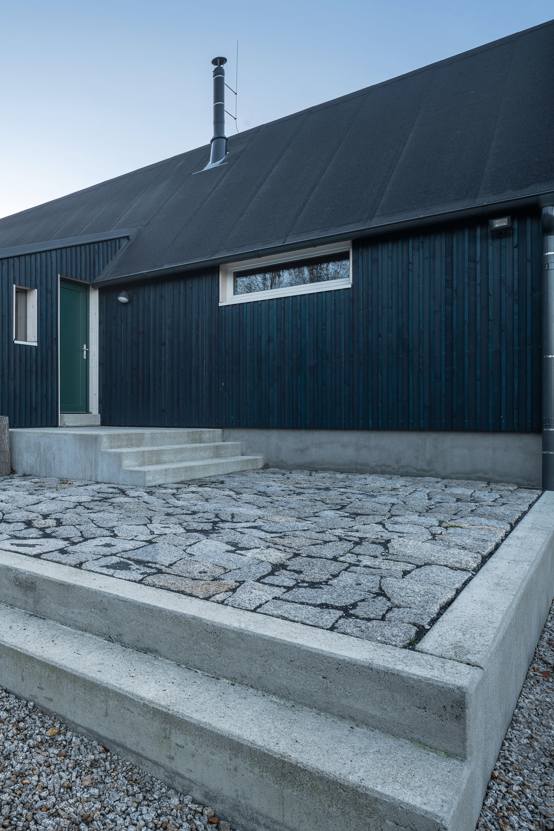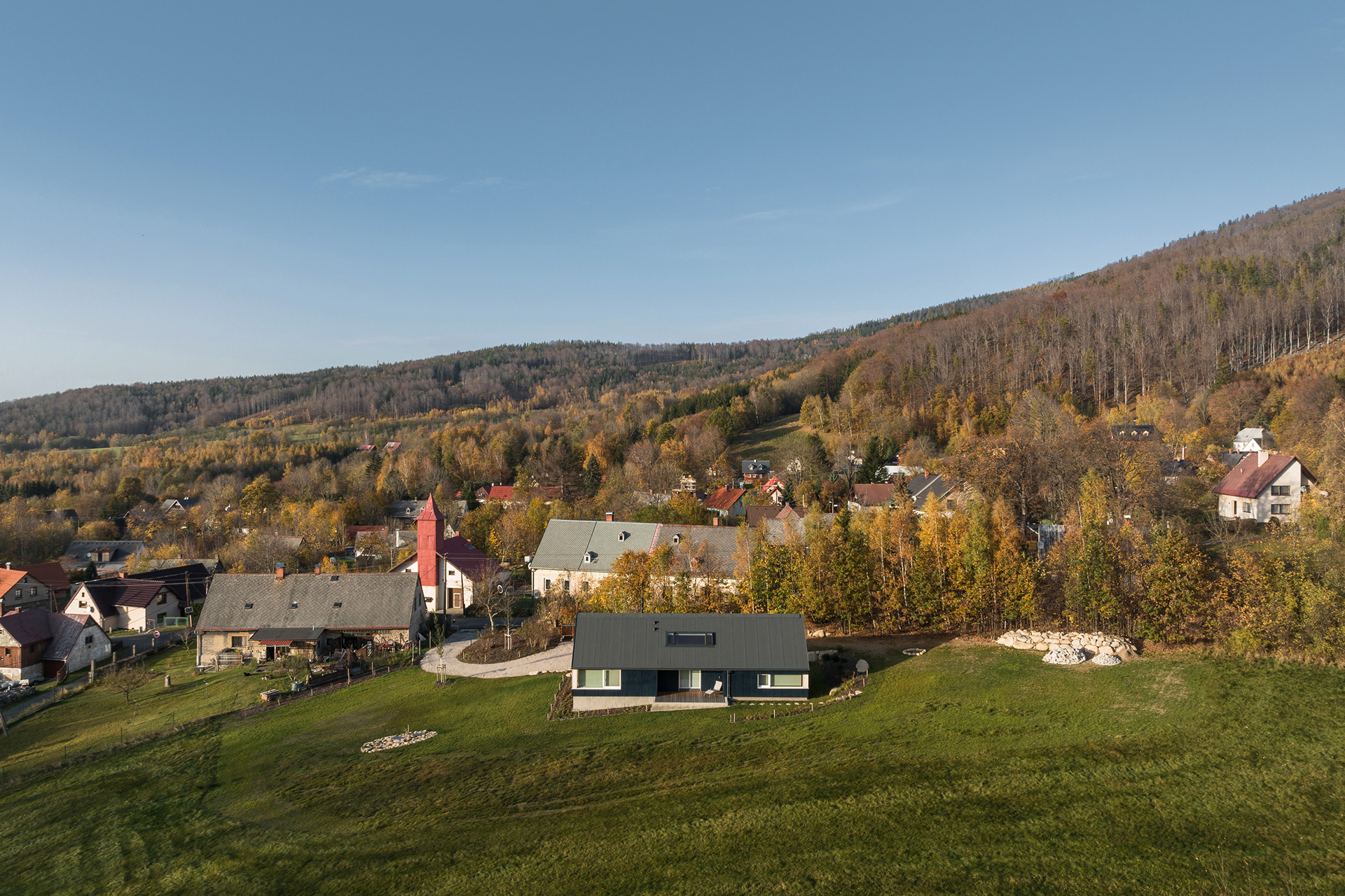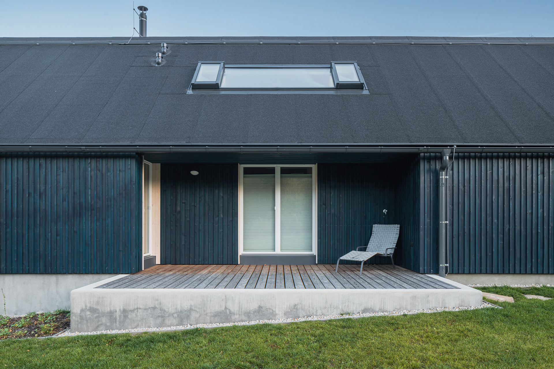 Natural materials typical of the local region and location were used to build the mountain hut. Wood, stone and glass. Wood, of course, because of the surrounding dense forests and the abundance of wooden half-timbered houses in the location. Wooden buildings have a strong tradition in the region. Glass also has a sound in the local region and the local glass is even known all over the world. The stone reflects the local mountains and harsh living conditions. On the outside, the hut is equipped with a wooden facade with a blue coating, which also refers to the local tradition. The main building material of the new mountain hut is the massive wooden CLT panel Novatop, which performs both a load-bearing and a visual function.