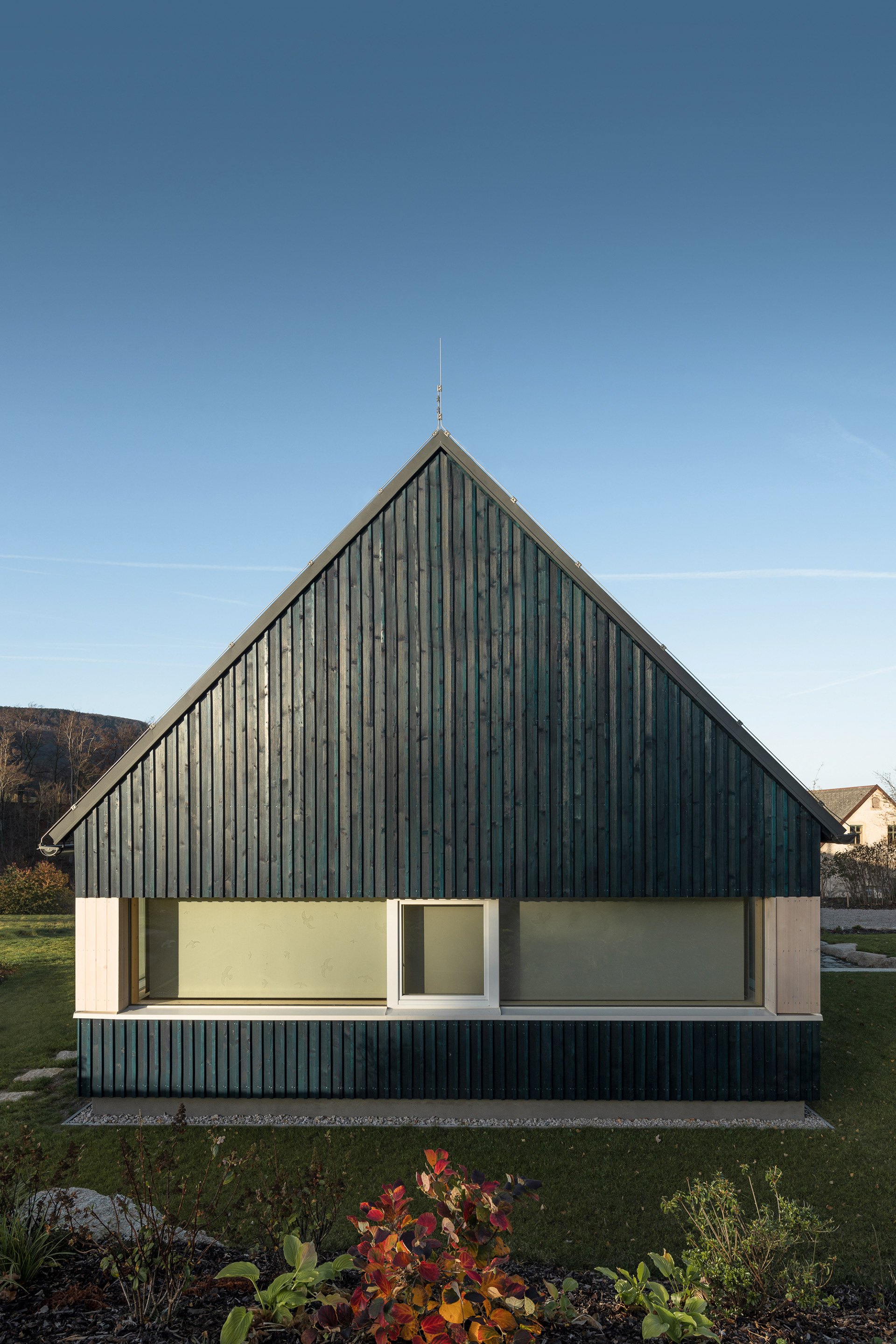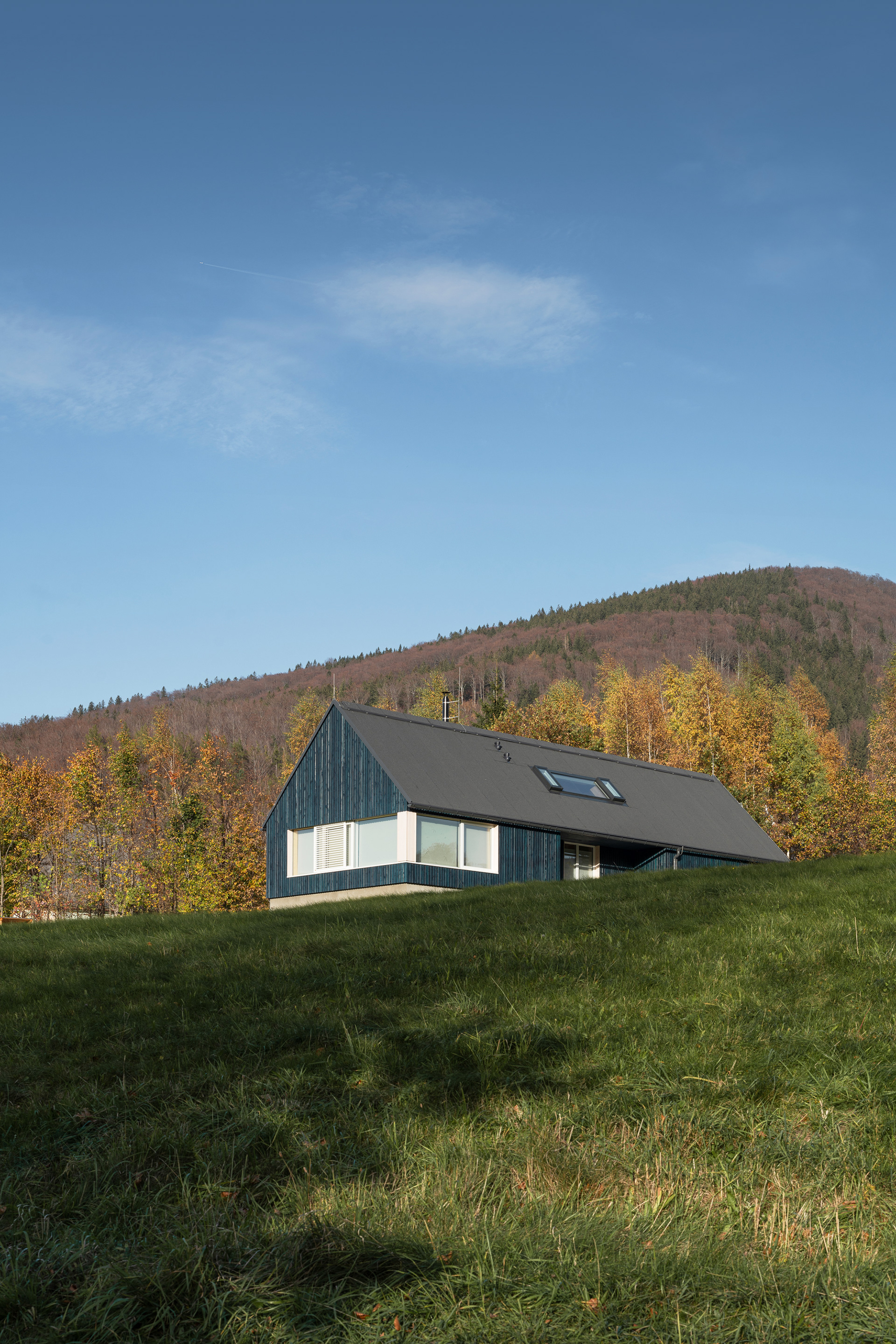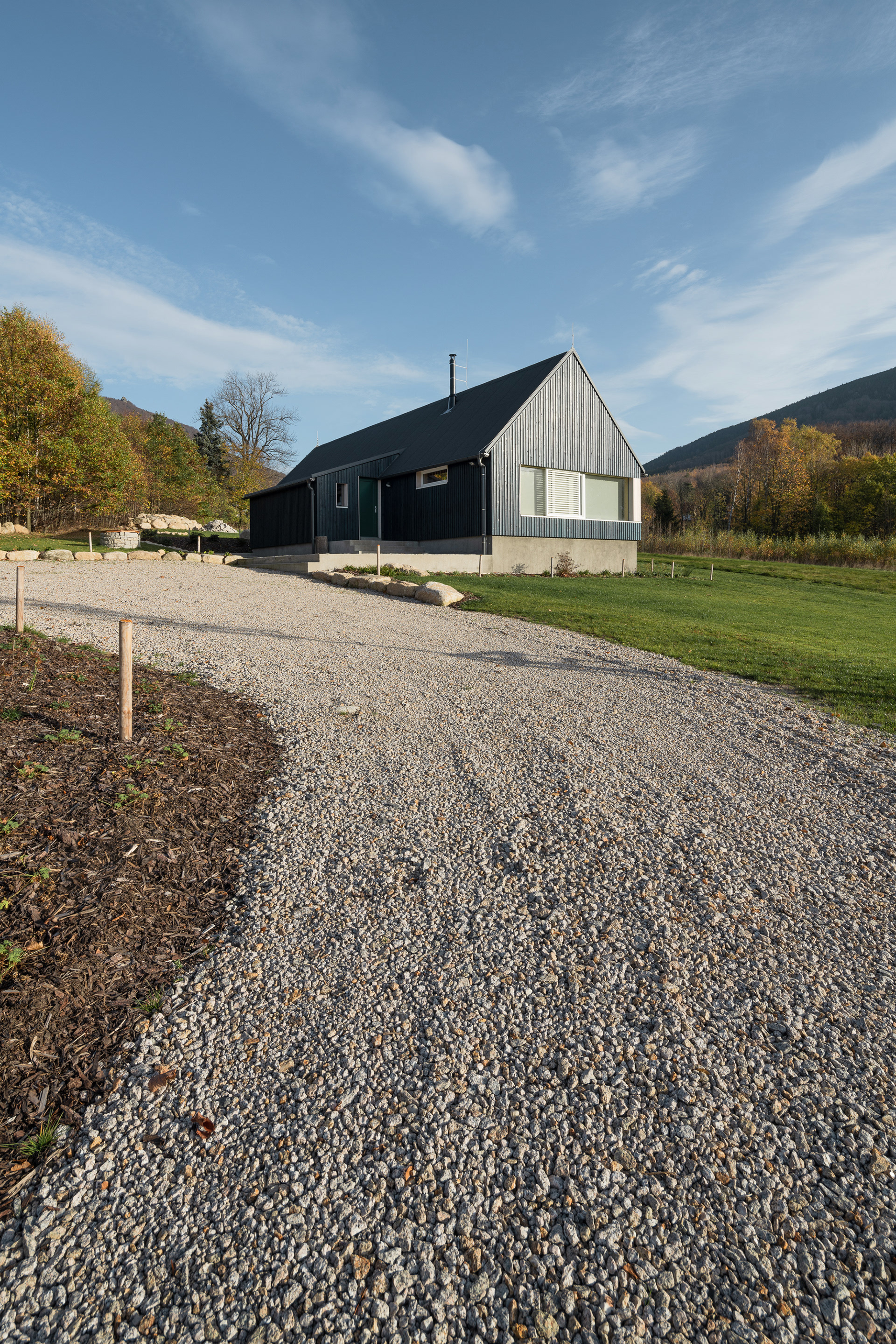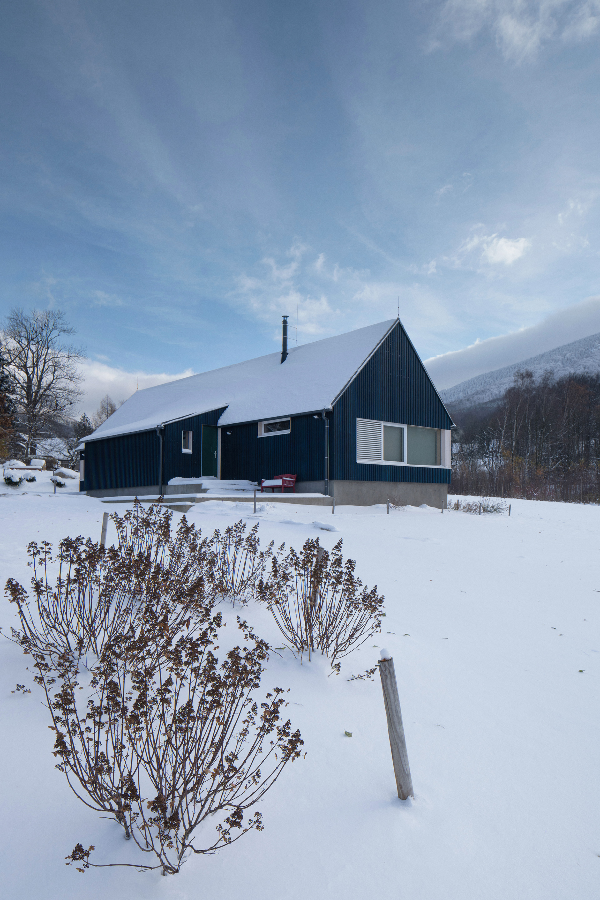 Na stavbu horské chaty byly použité přírodní materiály typické pro místní kraj a lokalitu. Dřevo, kámen a sklo. Dřevo samozřejmě kvůli okolním hustým lesům a množství dřevěných roubenek v lokalitě. Dřevostavby mají ve zdejším kraji silnou tradici. Také sklo má v místním kraji zvuk a místní sklo je dokonce známé po celém světě. Kámen pak reflektuje místní hory a tvrdé životní podmínky. Zvenčí je chata opatřena dřevěnou fasádou s modrým nátěrem, který také odkazuje na místní tradici. Hlavním stavebním materiálem nové horské chaty je masivní dřevěný CLT panel Novatop, který plní funkci nosnou i pohledovou.