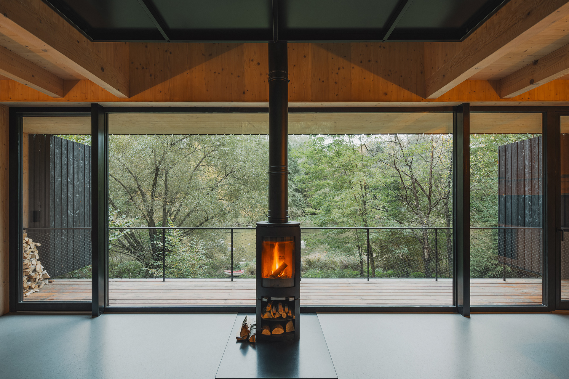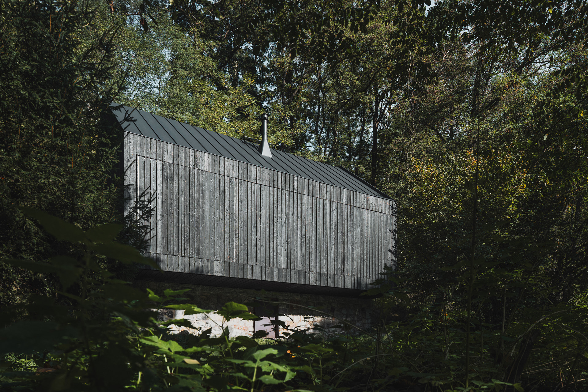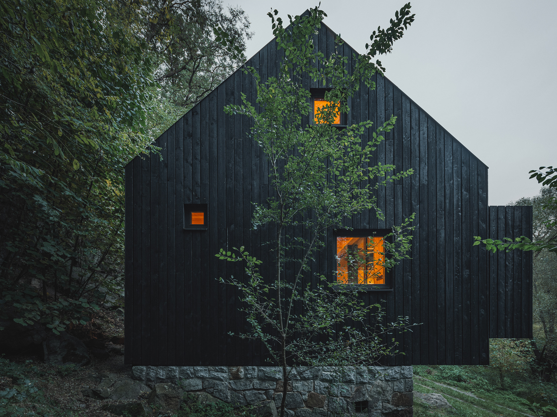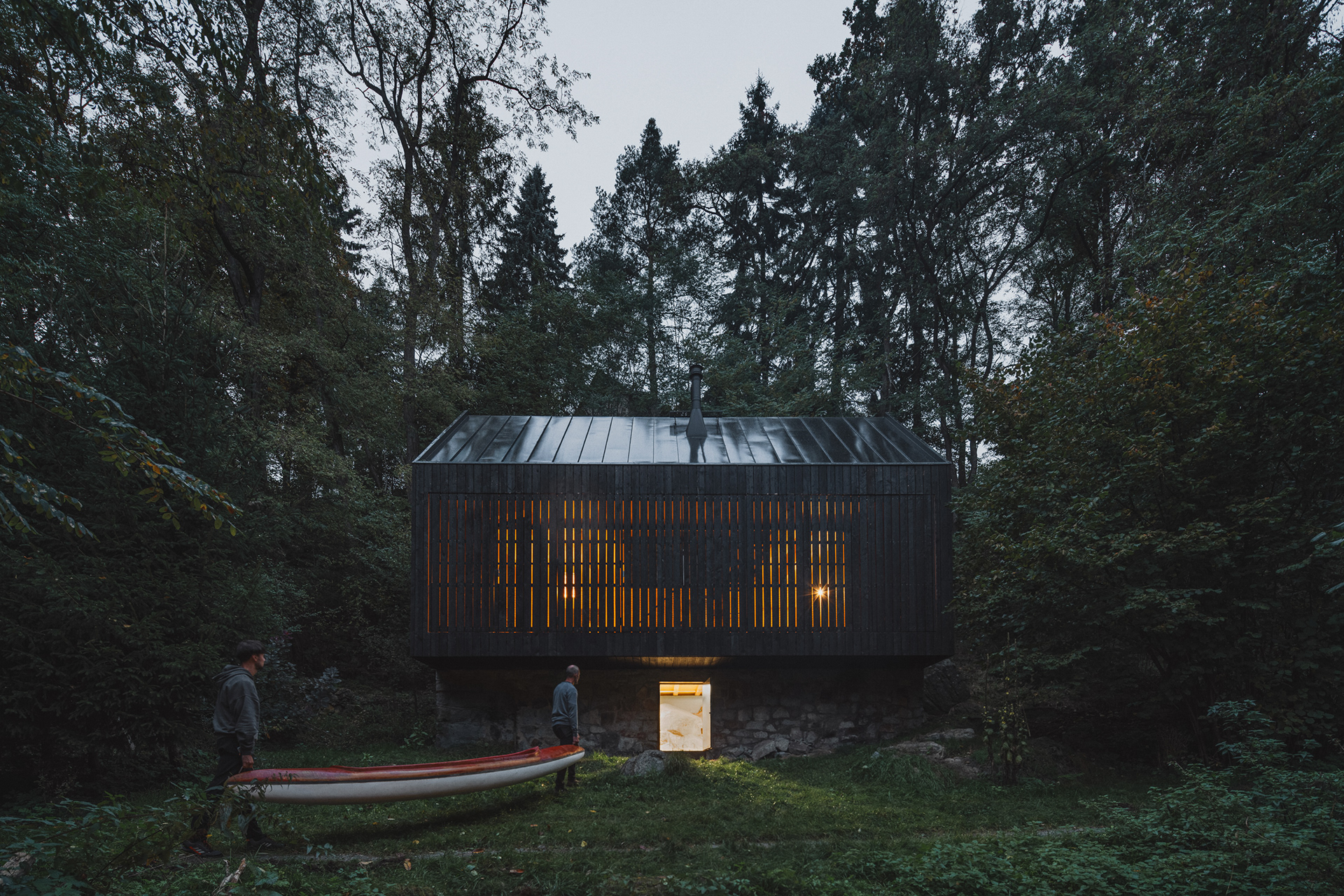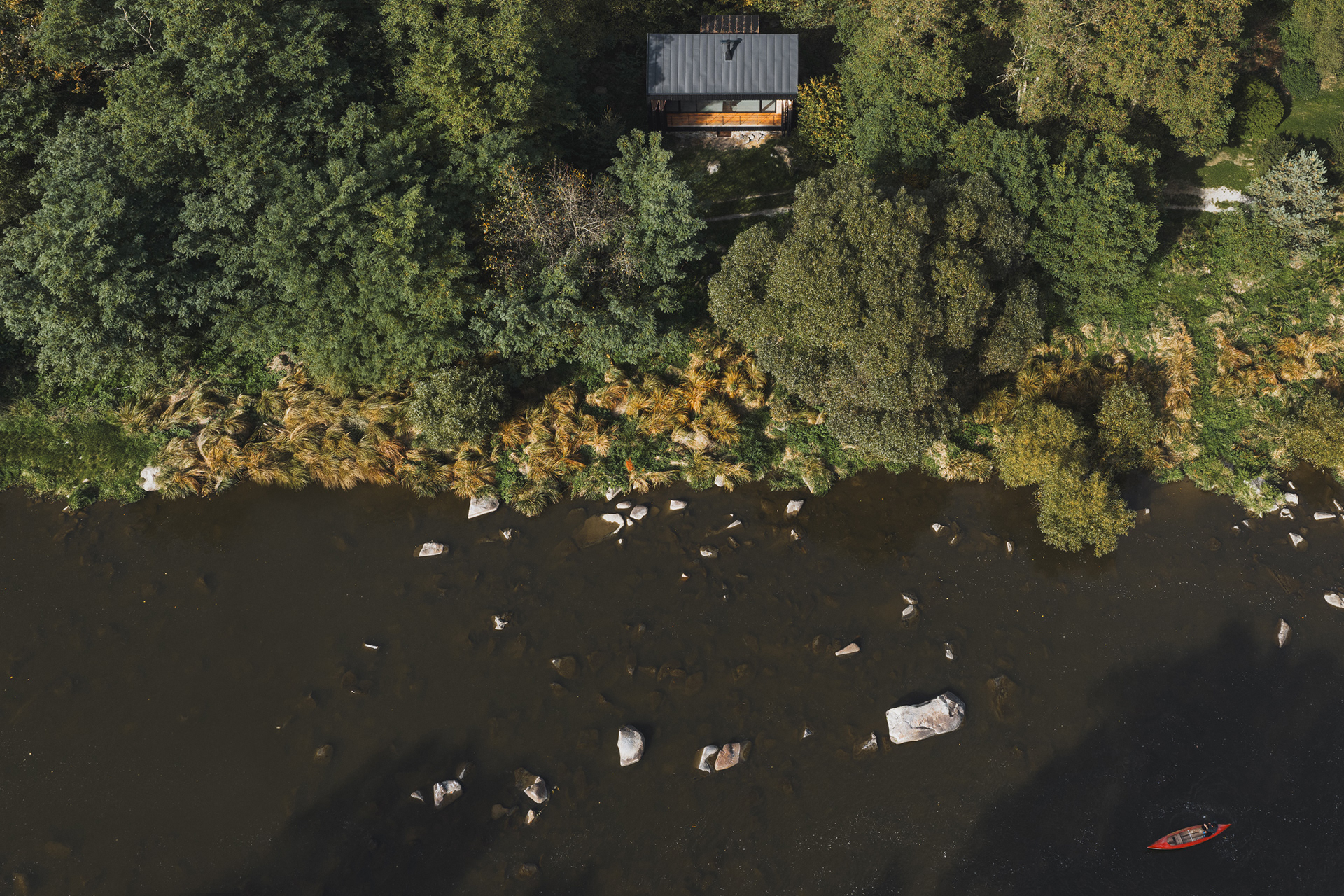 The cottage on the banks of the Sázava River replaces its predecessor in the same location. After the fire, only the stone foundation remained of the original cottage, which the new building uses in a natural way. It provides protection from floods and a view - over the river and perhaps even over the everyday hustle and bustle. Just close the shutters opening the cottage to the river and then just listen to the splashing of the river and the rustling of the pine trees.