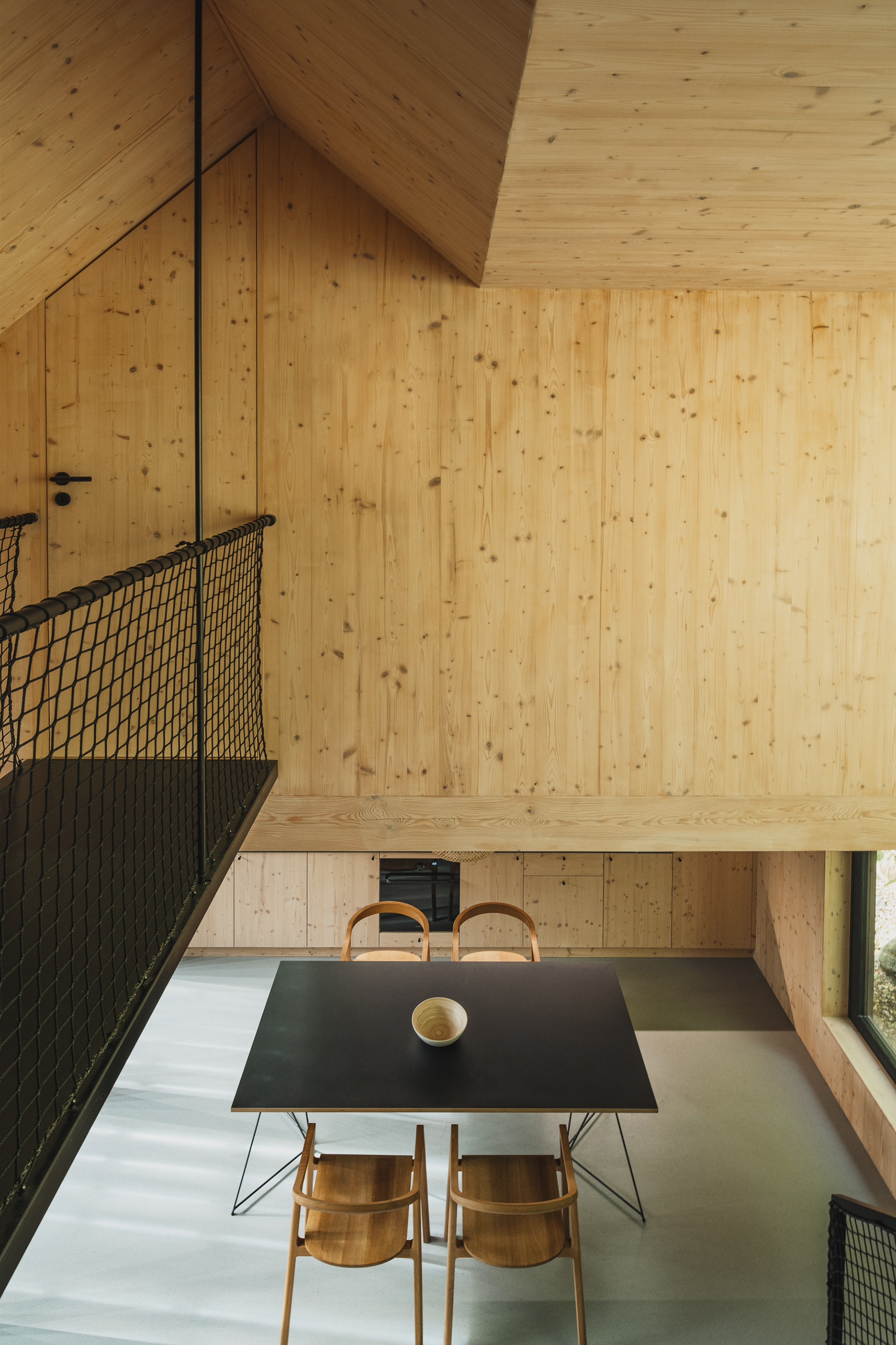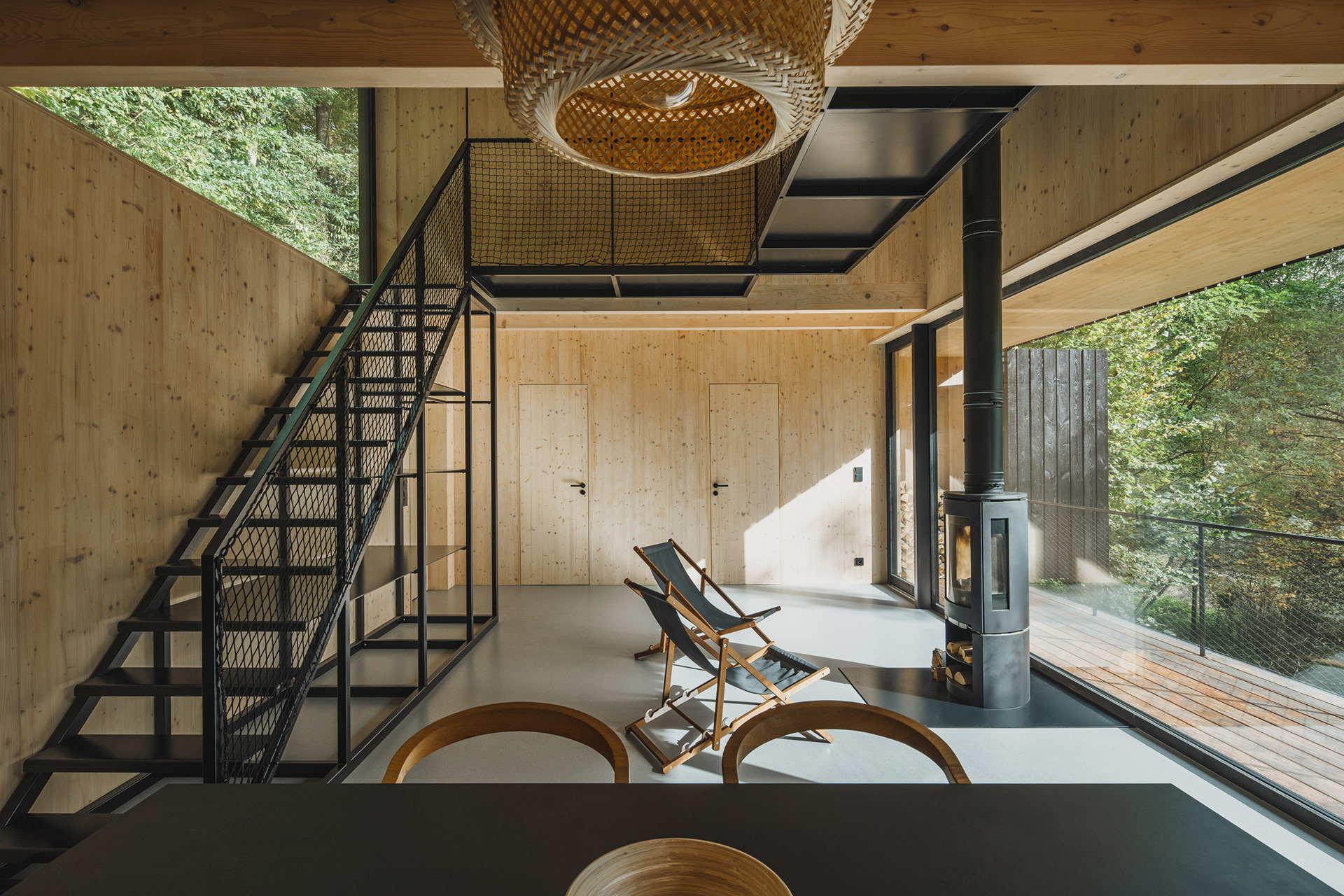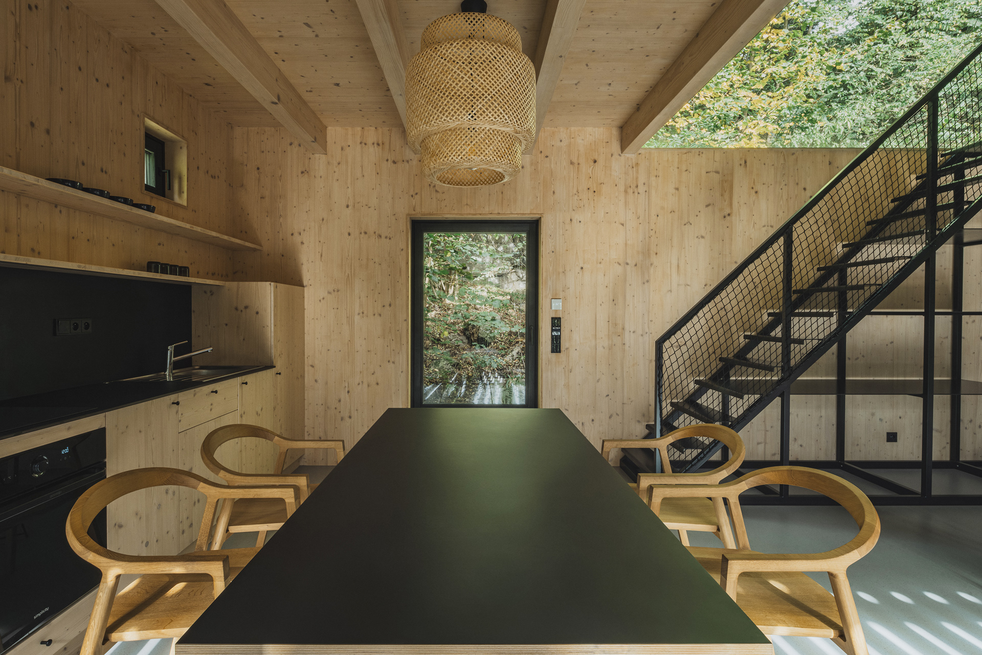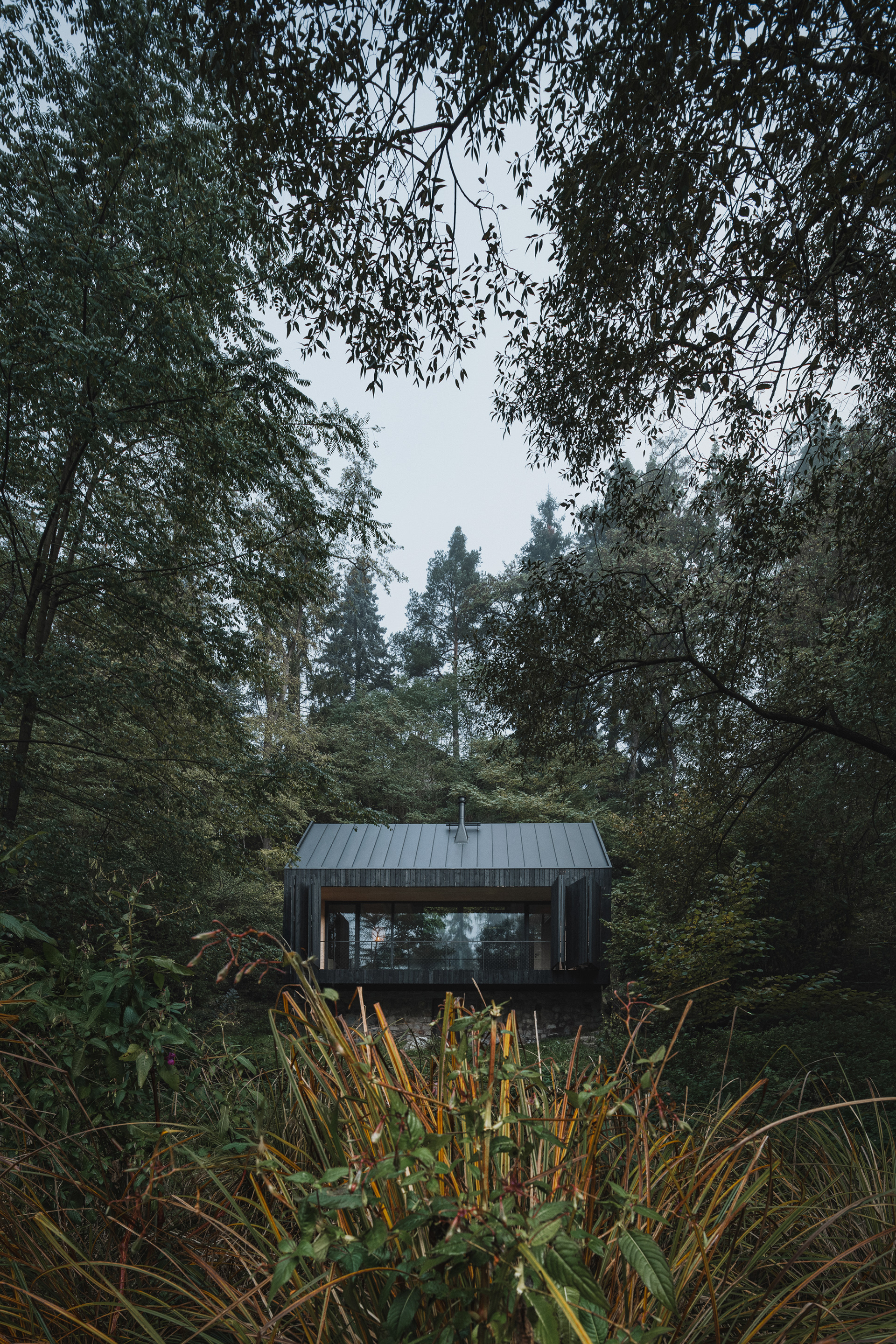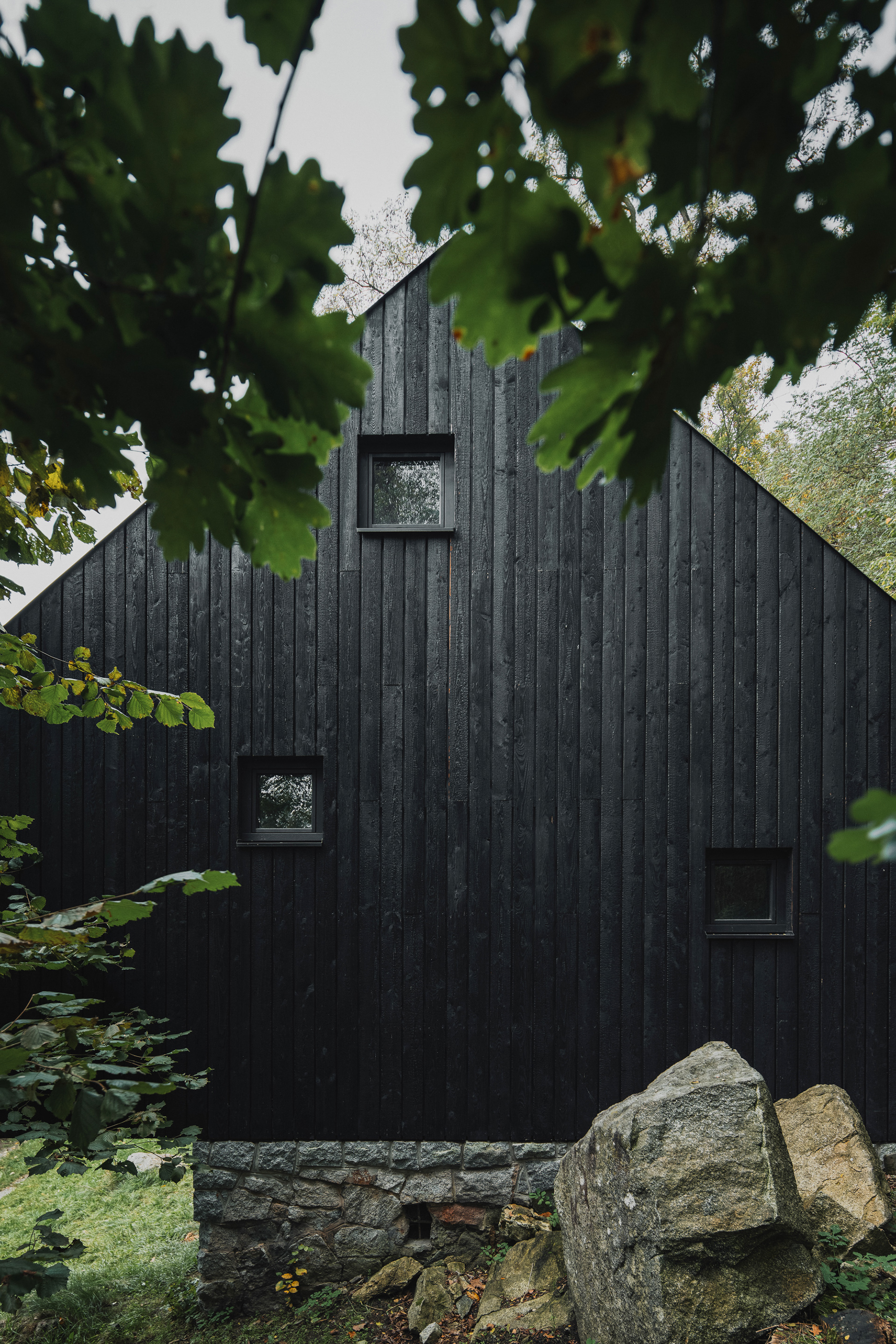 The cottage on the banks of the Sázava River replaces its predecessor in the same location. After the fire, only the stone foundation remained of the original cottage, which the new building uses in a natural way. It provides protection from floods and a view - over the river and perhaps even over the everyday hustle and bustle. Just close the shutters opening the cottage to the river and then just listen to the splashing of the river and the rustling of the pine trees.