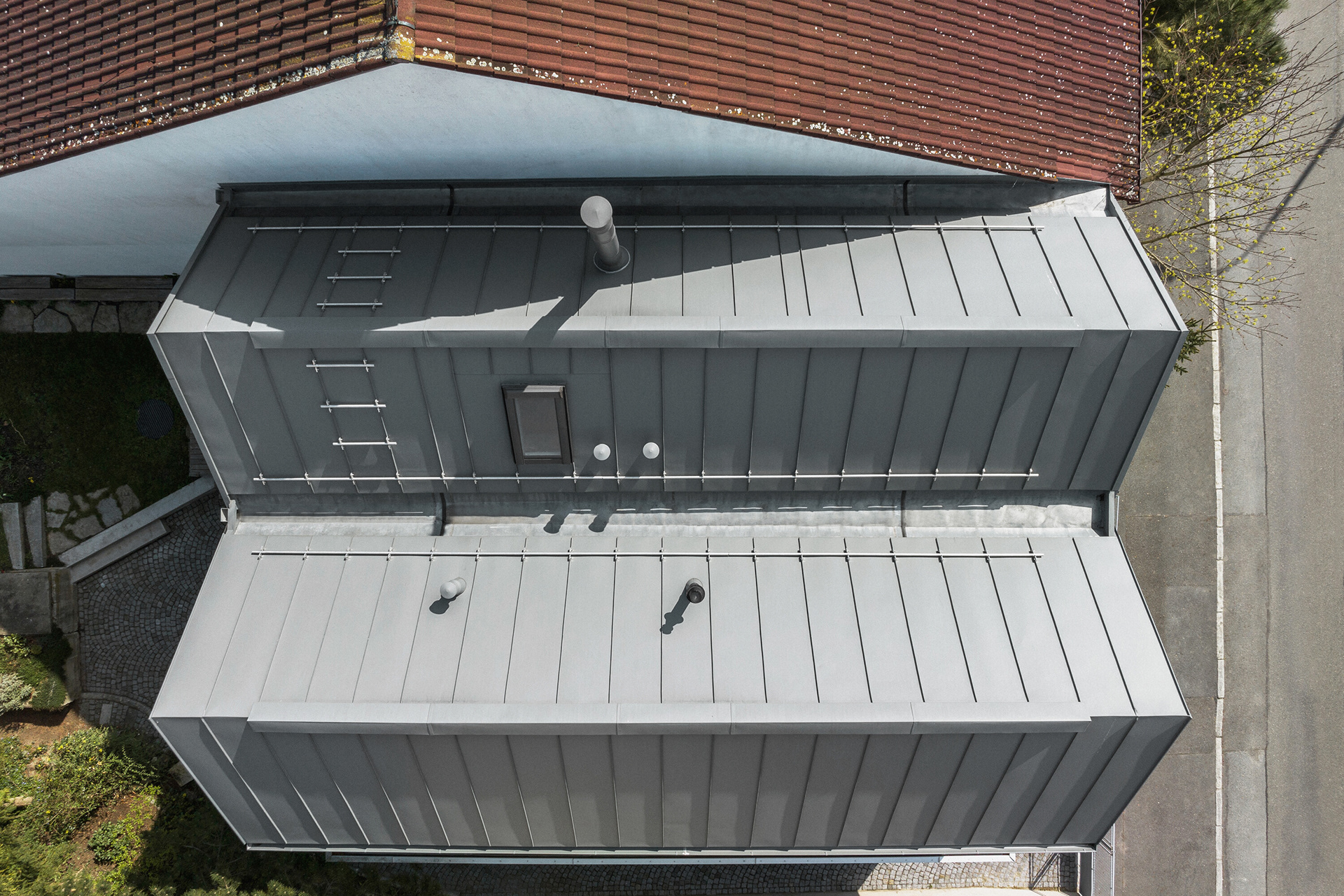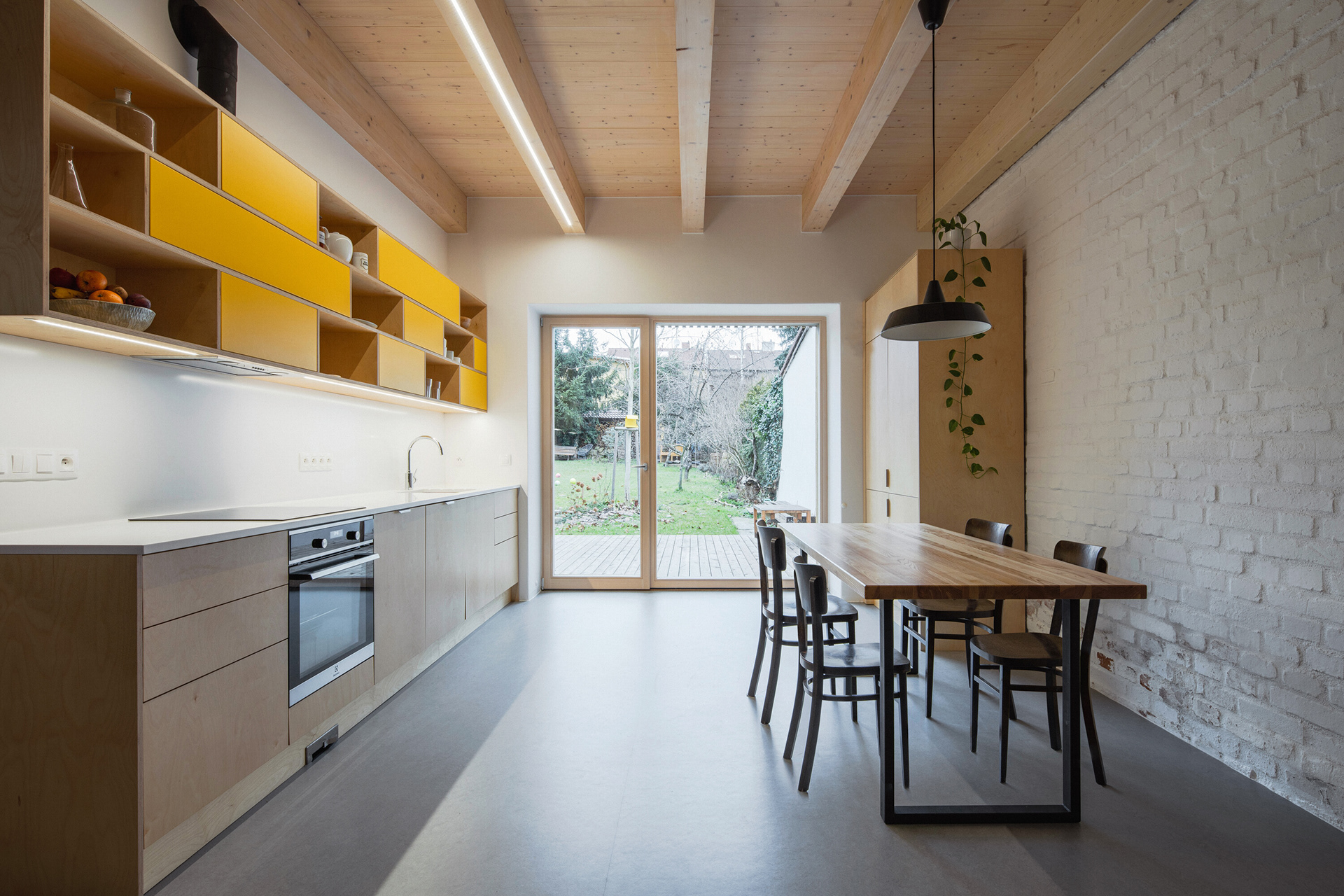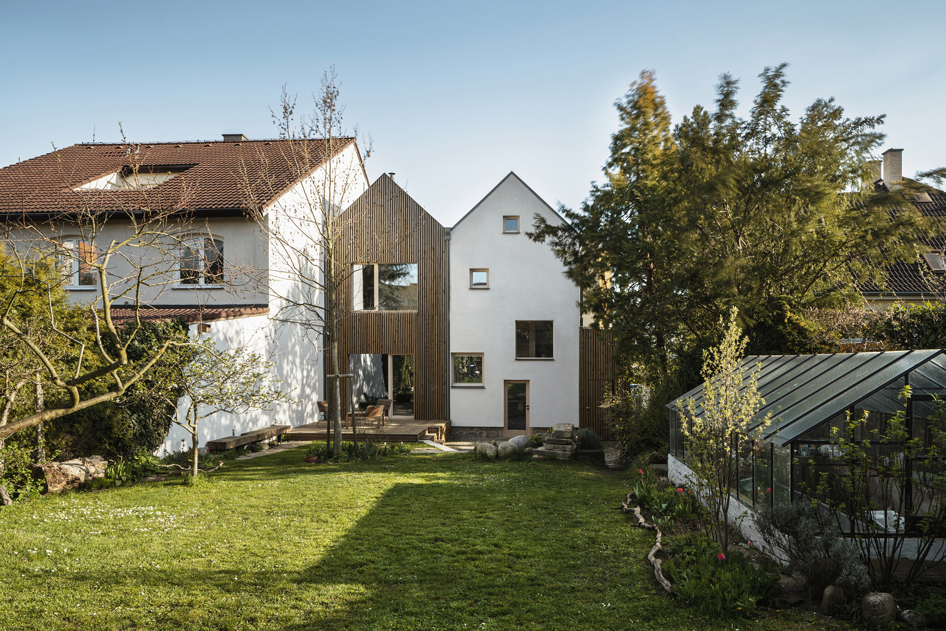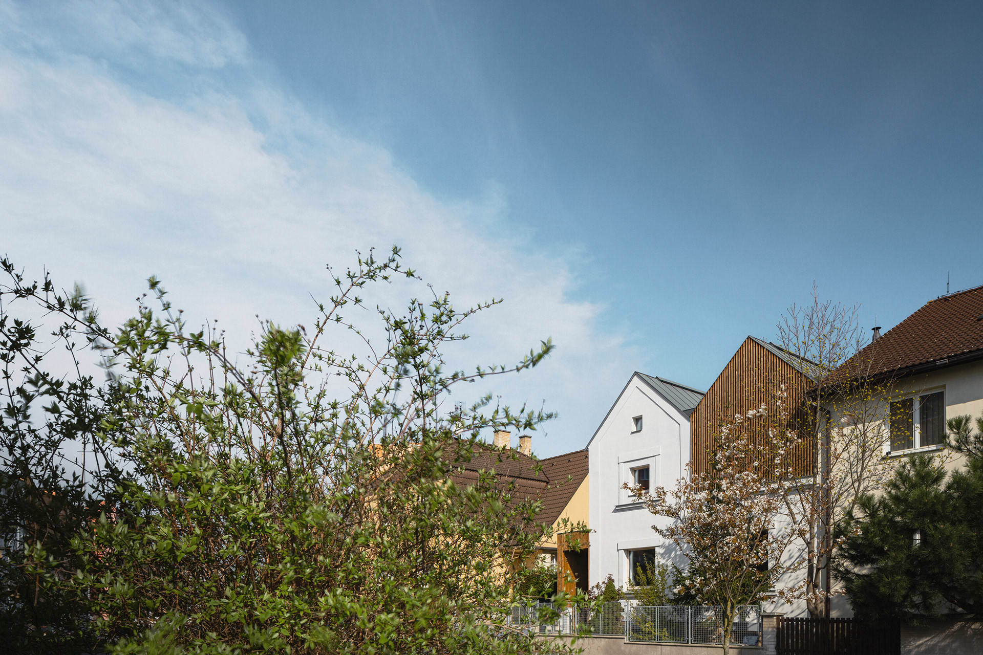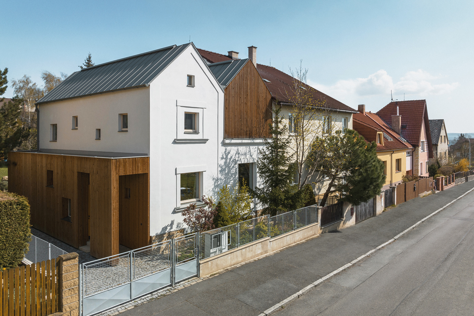 A number of older family houses in Plzeň-Lochotín have been preserved amidst panel houses, creating an interesting island of privacy with gardens in the middle of the housing estate. Most of the surrounding houses have already been renovated and enlarged with various extensions, which has largely lost the scale of the original development. The reconstruction design tries to respond to the current needs and requirements of a young family, but at the same time tries not to inflate the mass of the house, but to bring a new, contemporary layer that works with the archetypal element of the gable with a gable roof.