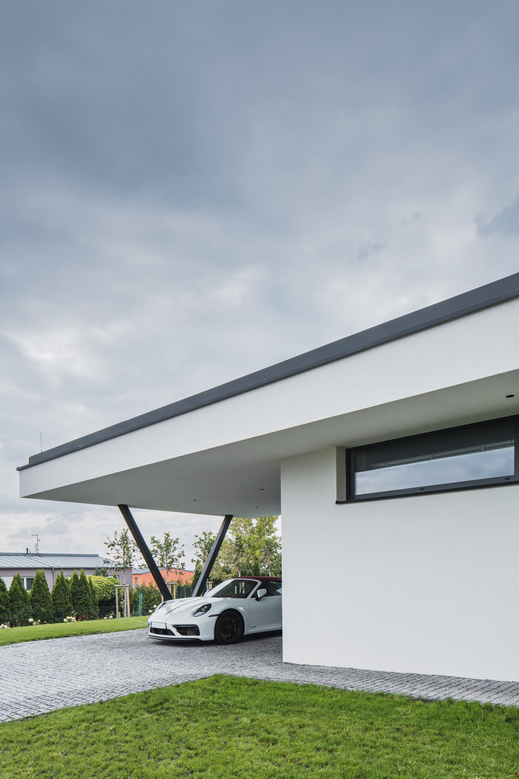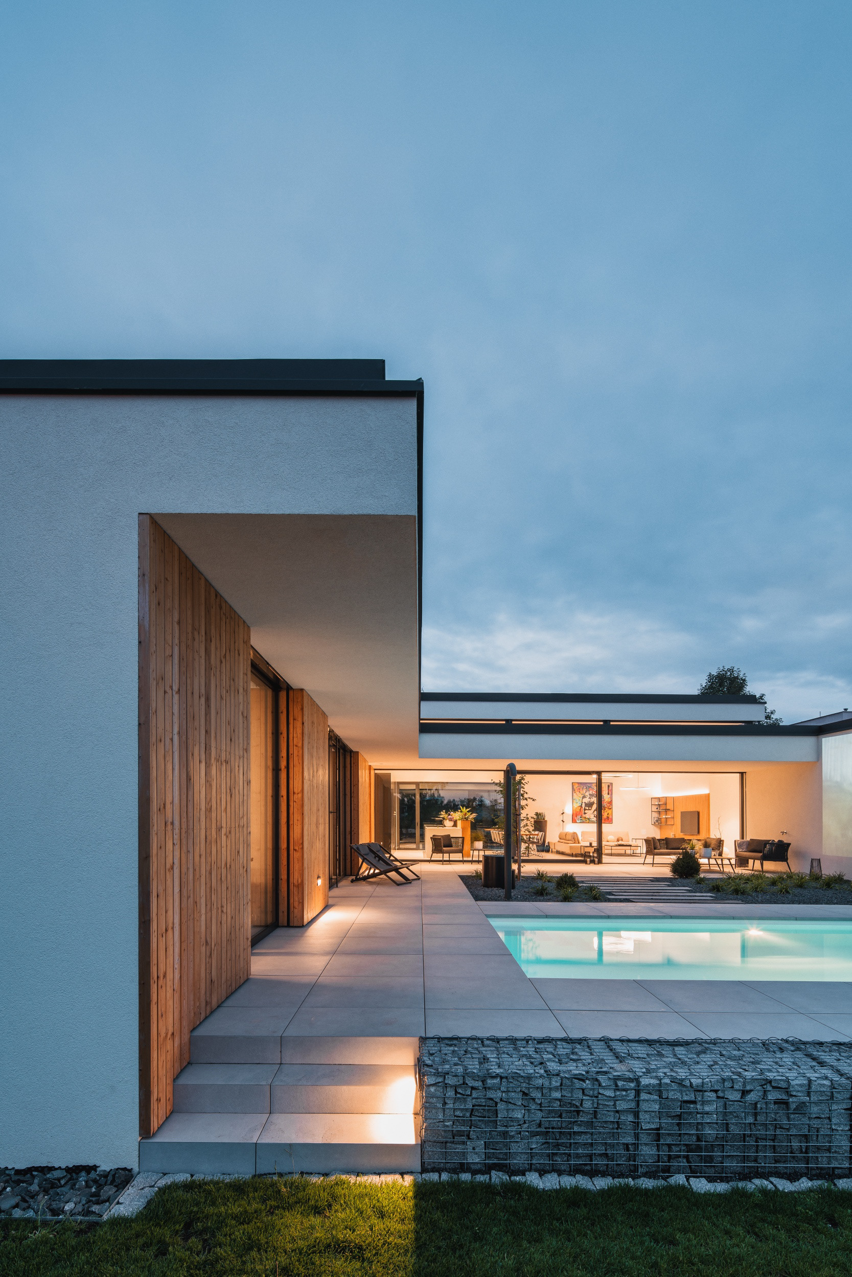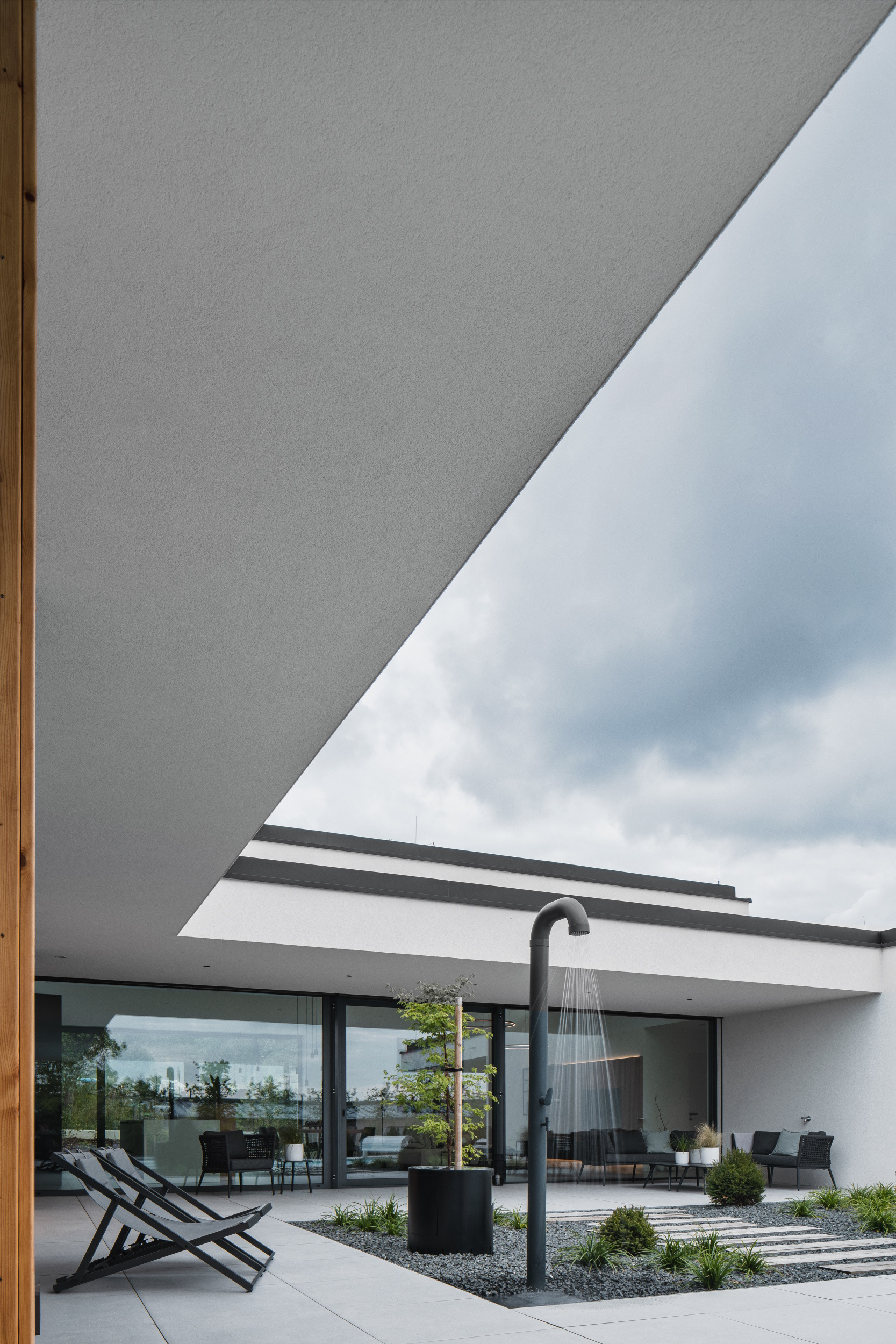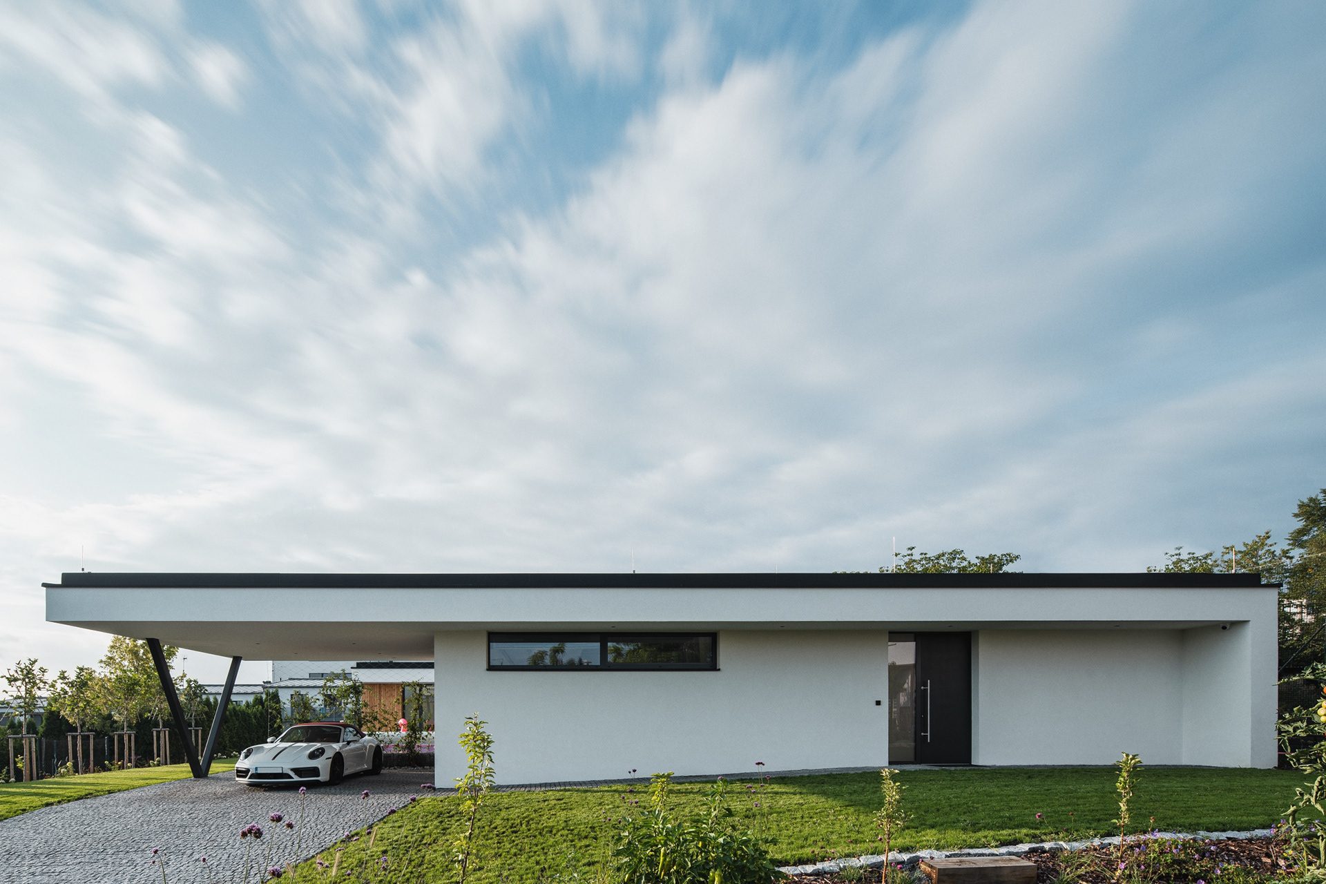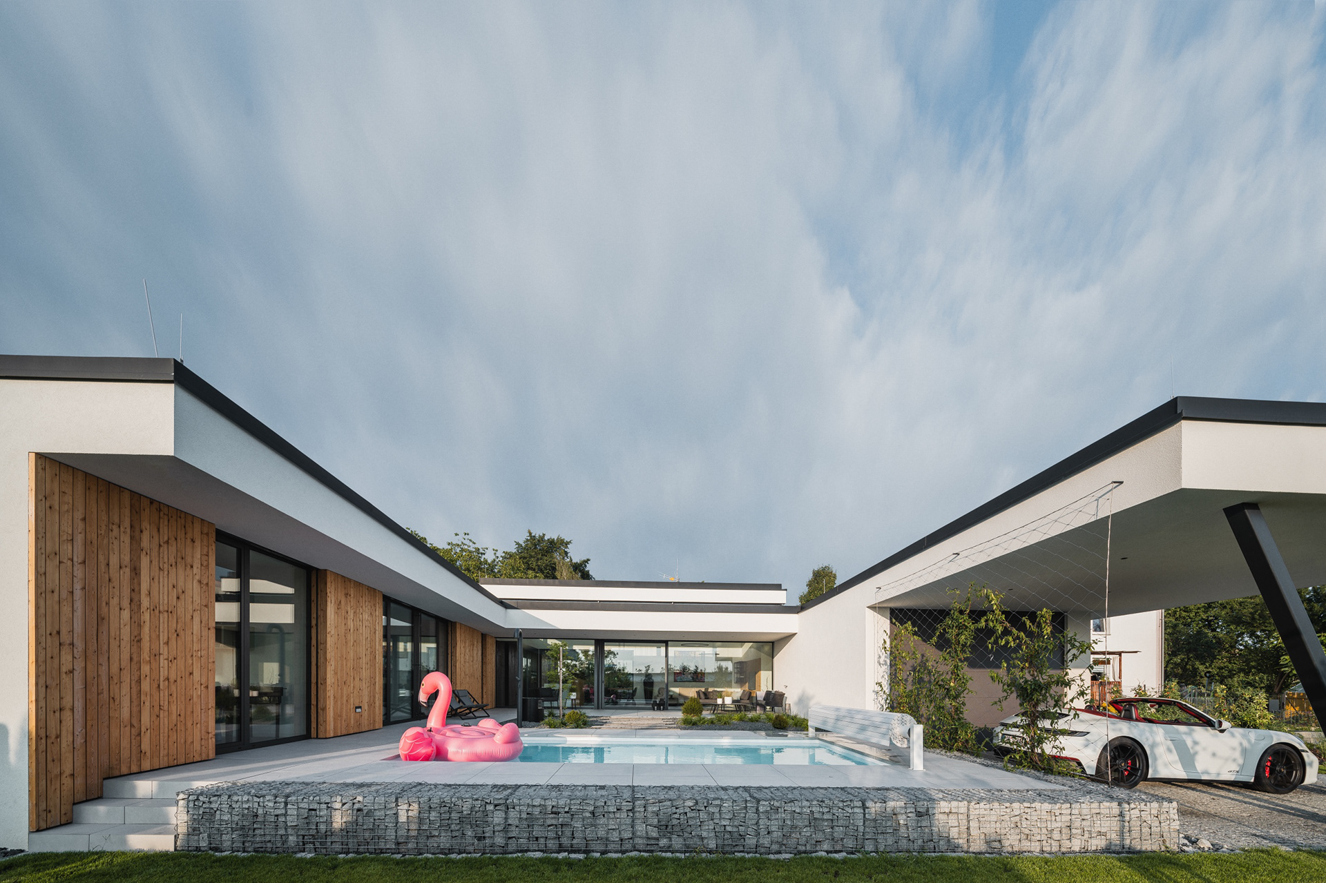 Koncept návrhu domu vychází z potřeby vypořádat se se soukromím na pozemku a z logických provozních vazeb. Dům má tak tvar písmene „U“ s tím, že atrium se otevírá směrem k jiho-západu a poskytuje tak majitelům dostatek soukromí při pobytu v exteriéru. Do atria, kde je umístěno venkovní kryté sezení je přístup ze všech hlavních obytných místností domu.