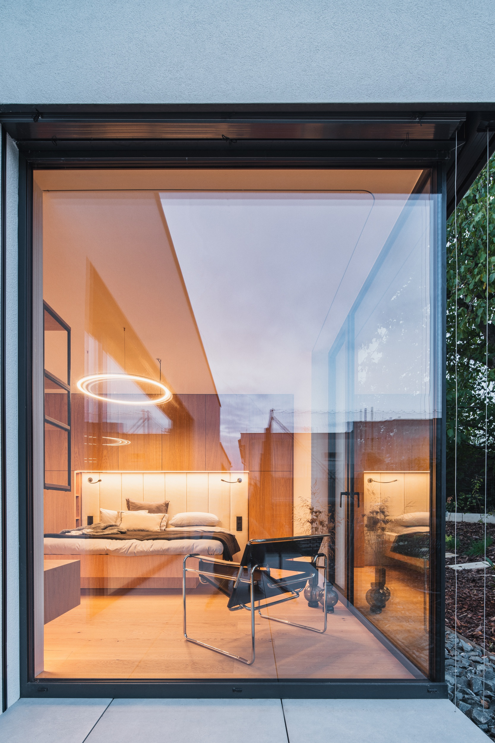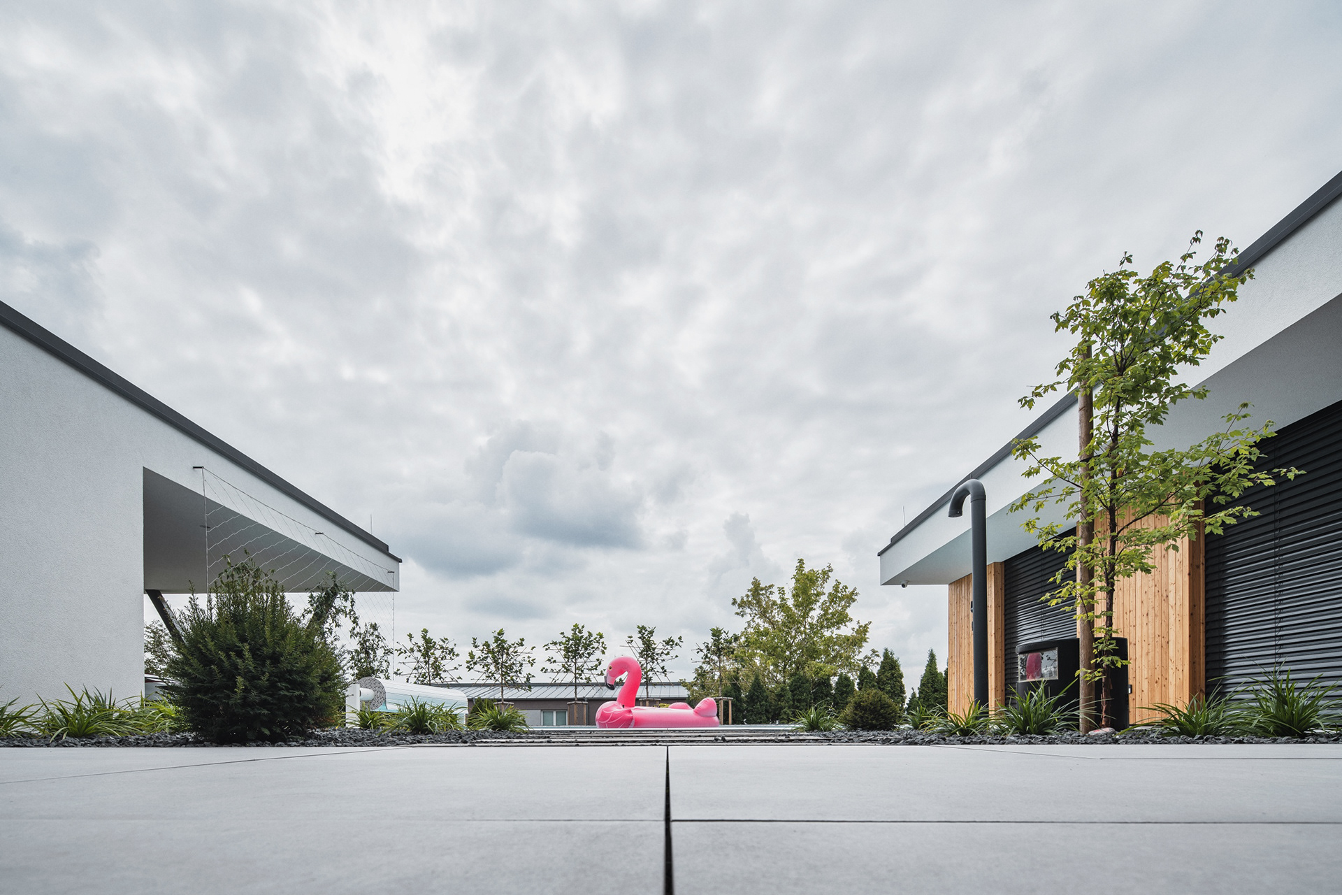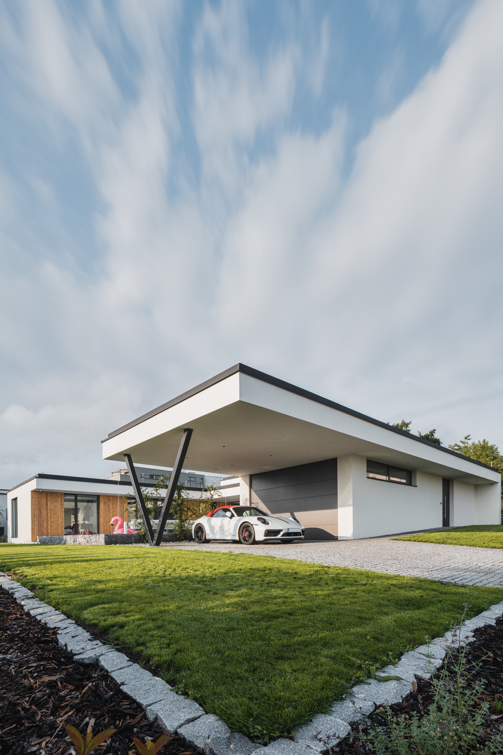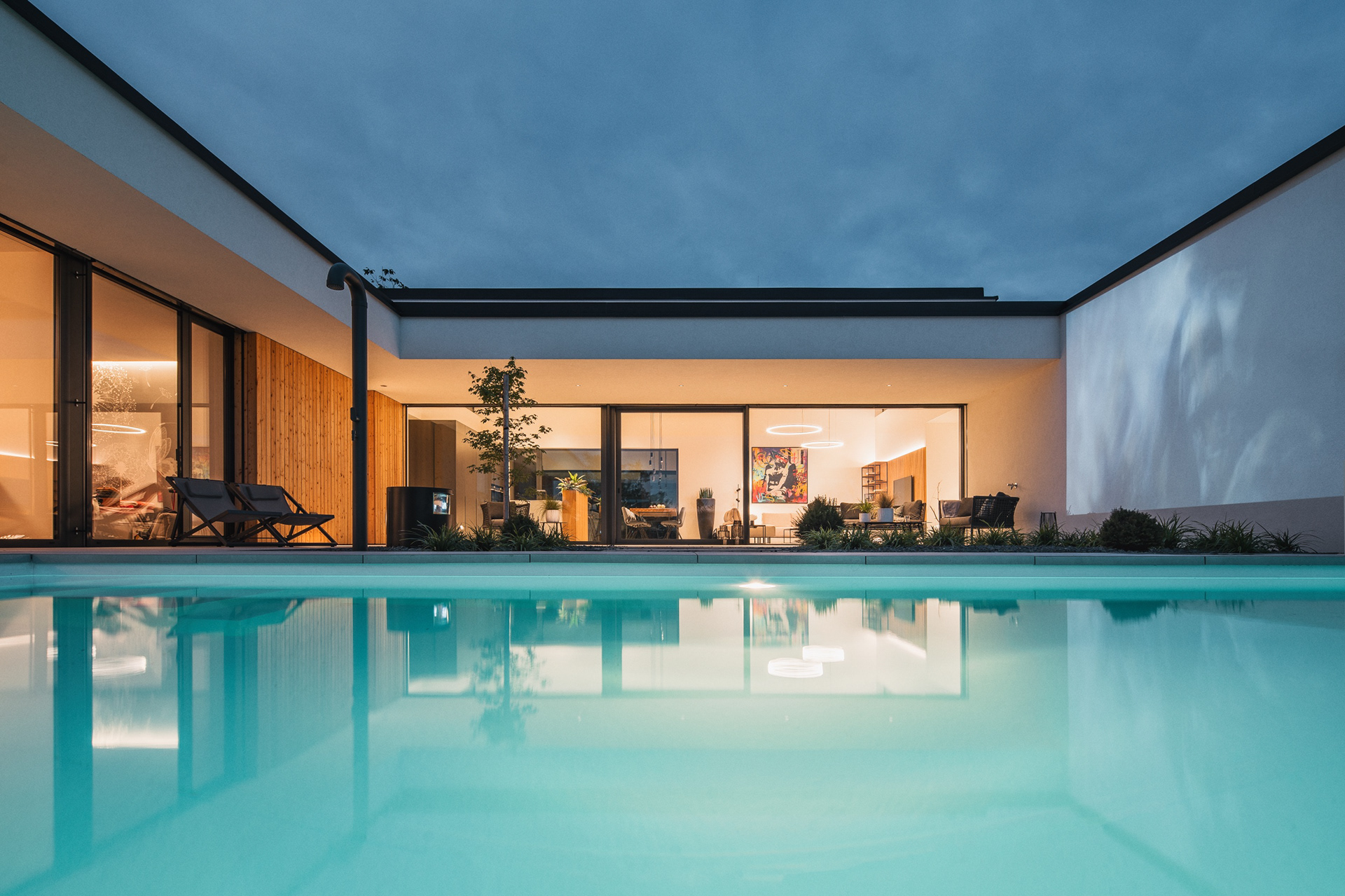 Koncept návrhu domu vychází z potřeby vypořádat se se soukromím na pozemku a z logických provozních vazeb. Dům má tak tvar písmene „U“ s tím, že atrium se otevírá směrem k jiho-západu a poskytuje tak majitelům dostatek soukromí při pobytu v exteriéru. Do atria, kde je umístěno venkovní kryté sezení je přístup ze všech hlavních obytných místností domu.