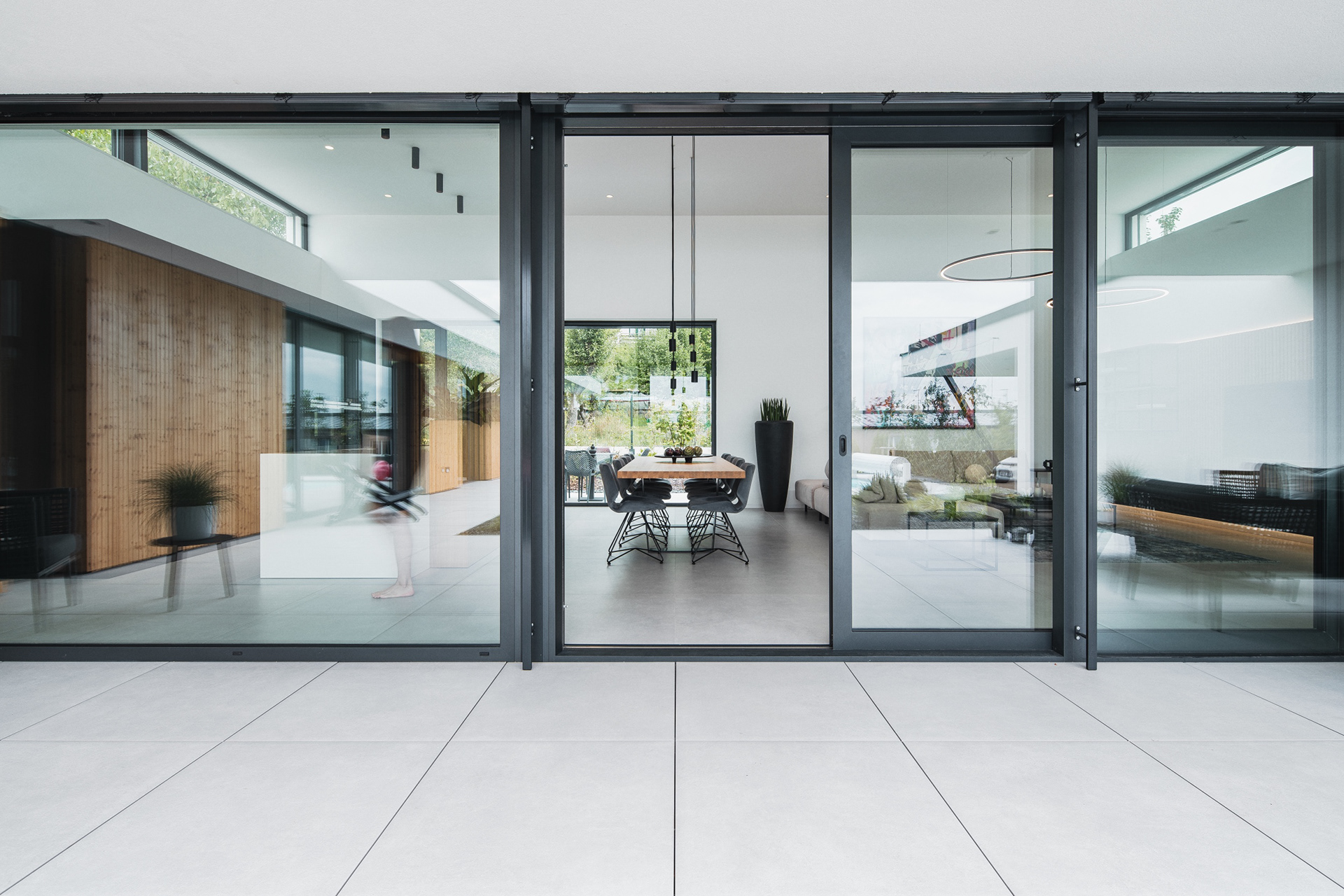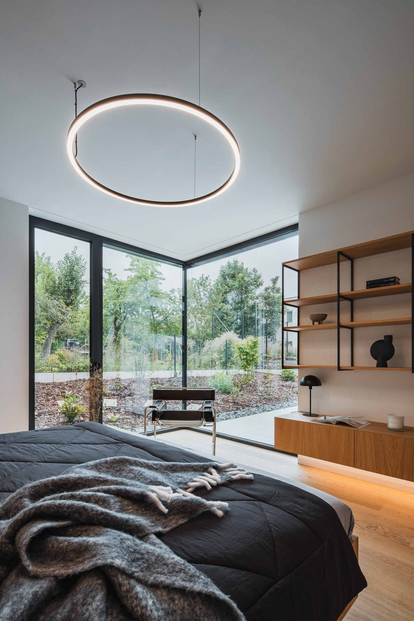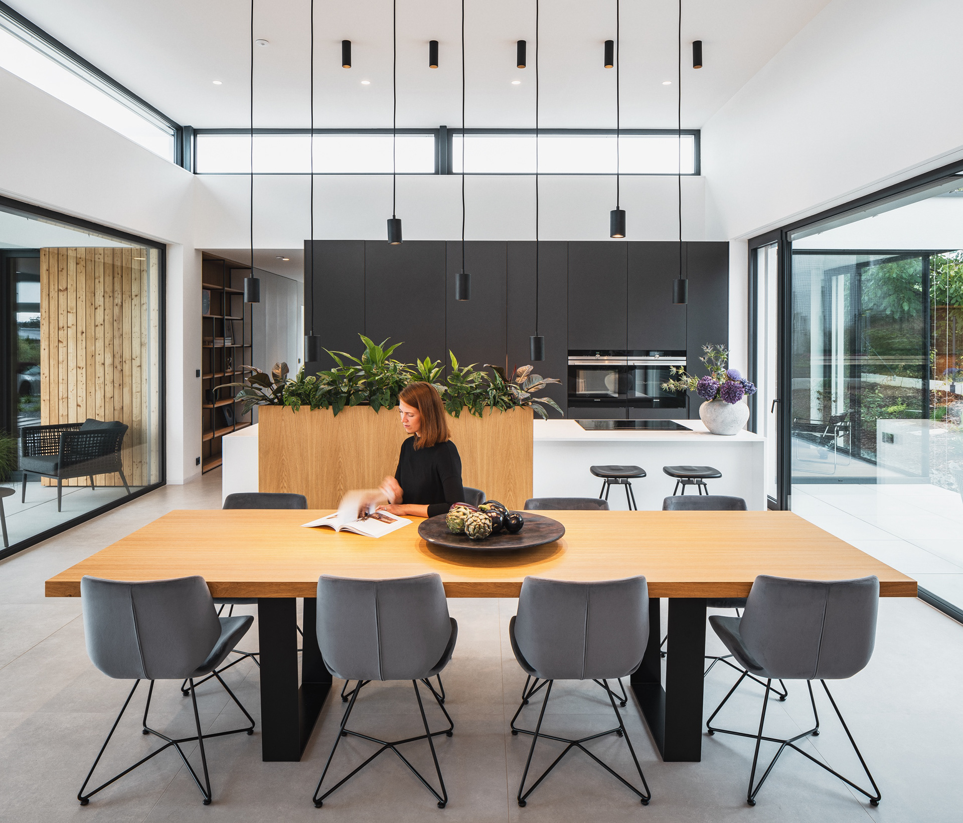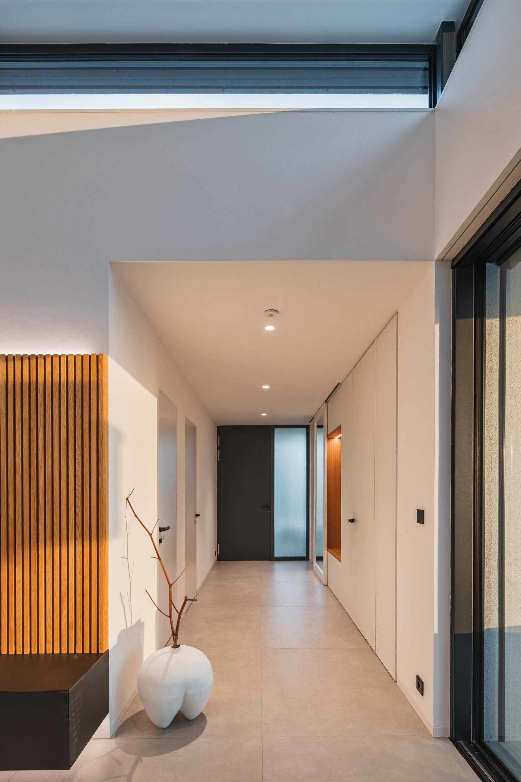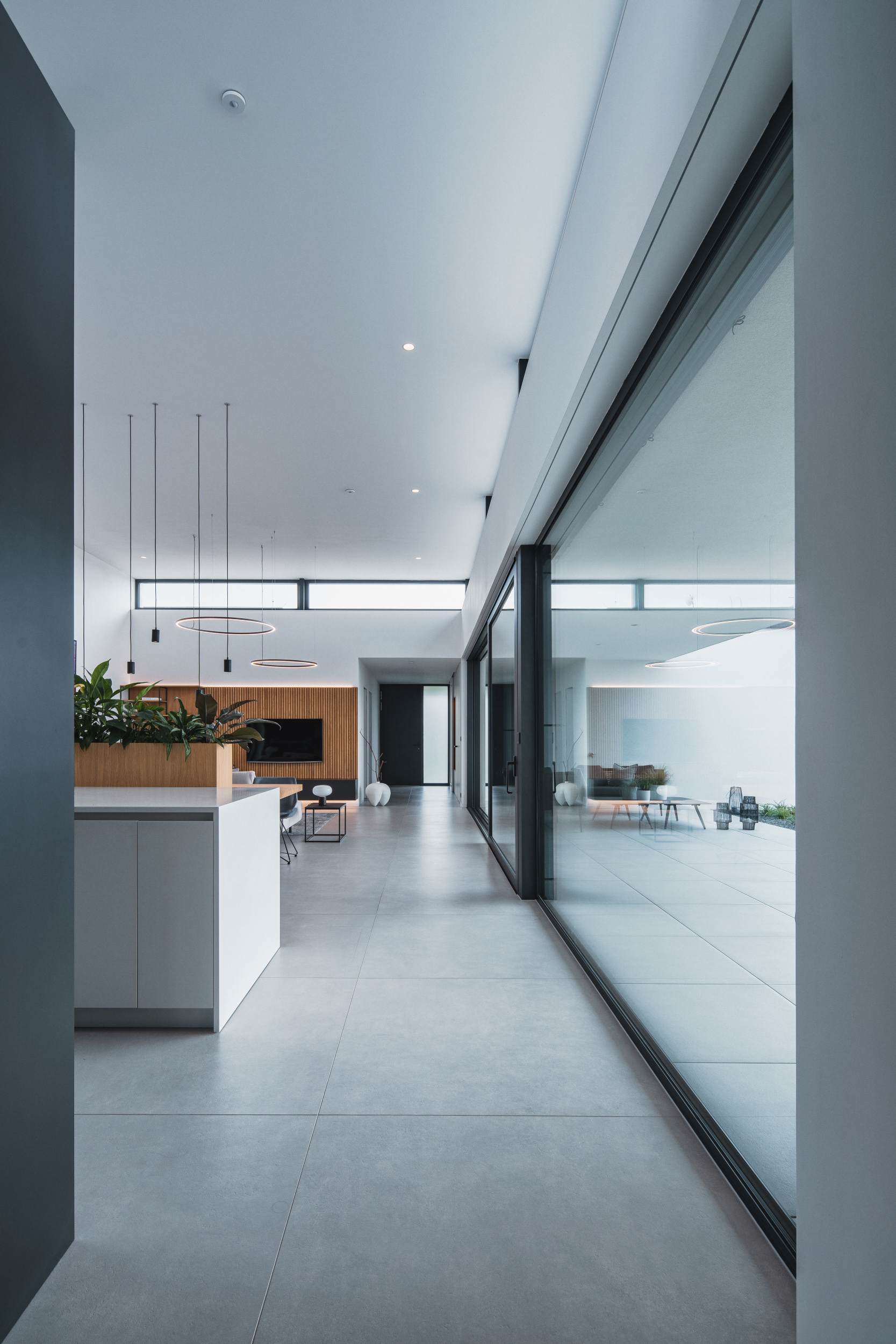 Koncept návrhu domu vychází z potřeby vypořádat se se soukromím na pozemku a z logických provozních vazeb. Dům má tak tvar písmene „U“ s tím, že atrium se otevírá směrem k jiho-západu a poskytuje tak majitelům dostatek soukromí při pobytu v exteriéru. Do atria, kde je umístěno venkovní kryté sezení je přístup ze všech hlavních obytných místností domu.