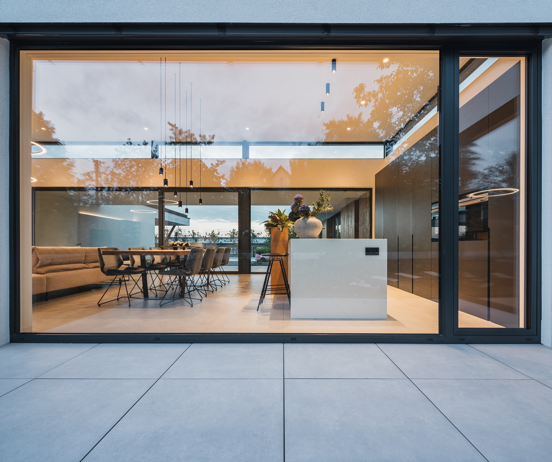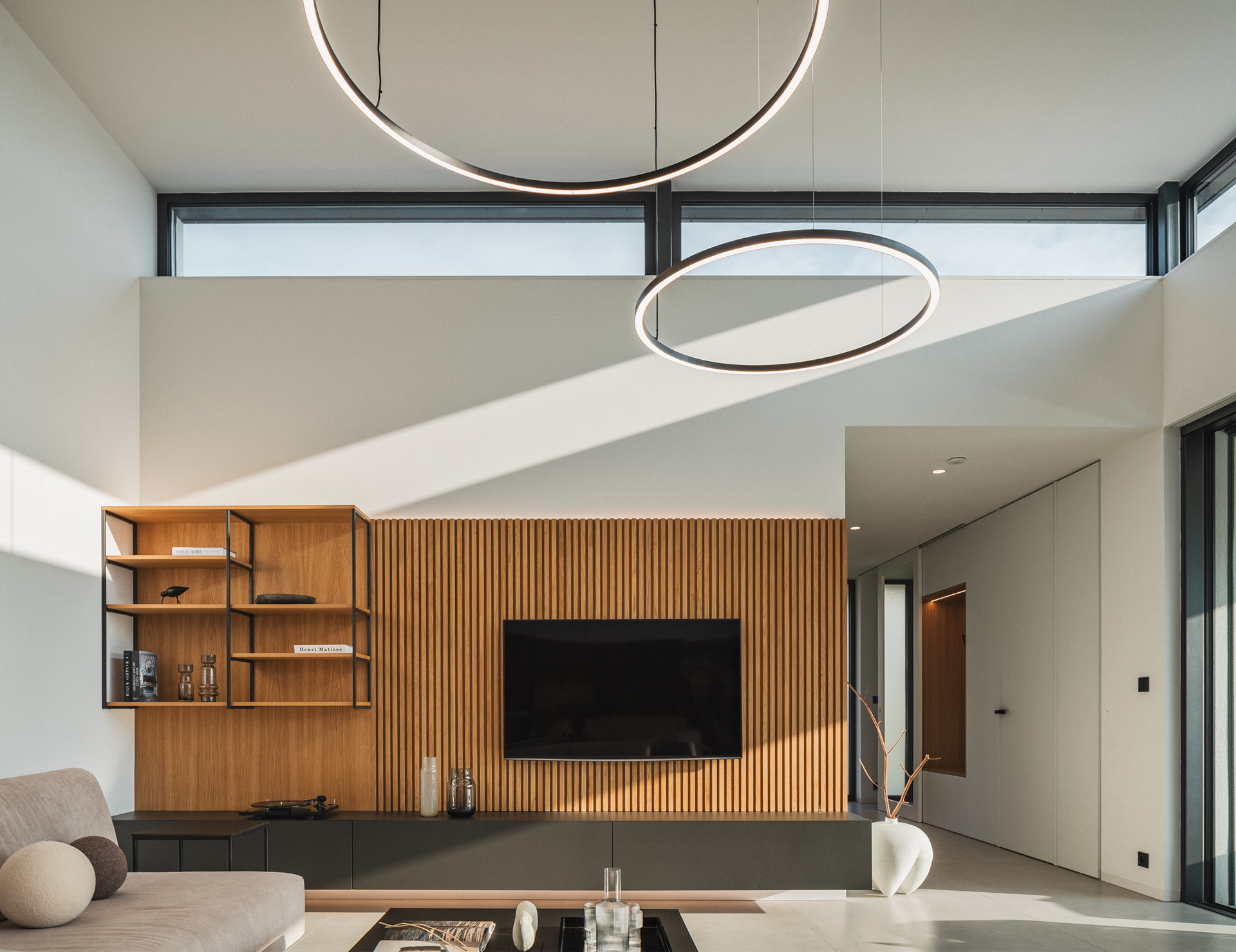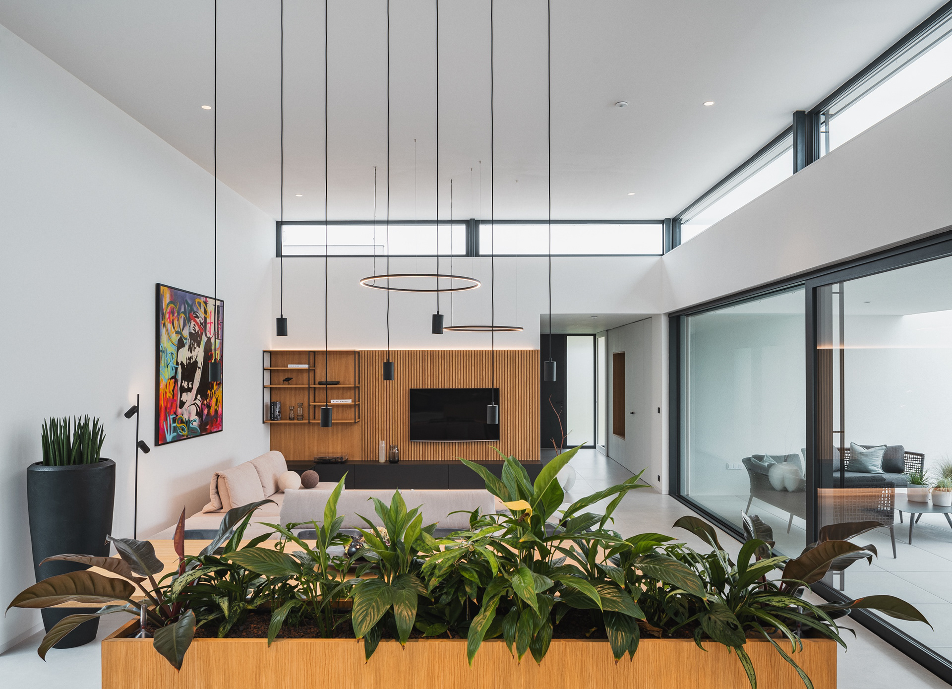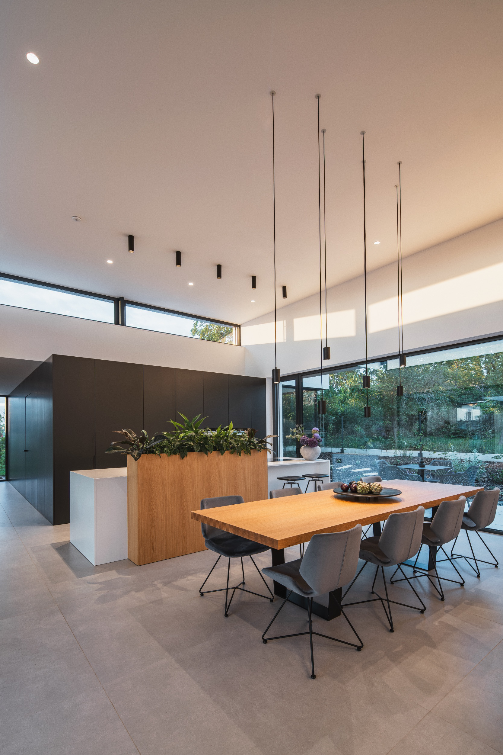 Koncept návrhu domu vychází z potřeby vypořádat se se soukromím na pozemku a z logických provozních vazeb. Dům má tak tvar písmene „U“ s tím, že atrium se otevírá směrem k jiho-západu a poskytuje tak majitelům dostatek soukromí při pobytu v exteriéru. Do atria, kde je umístěno venkovní kryté sezení je přístup ze všech hlavních obytných místností domu.