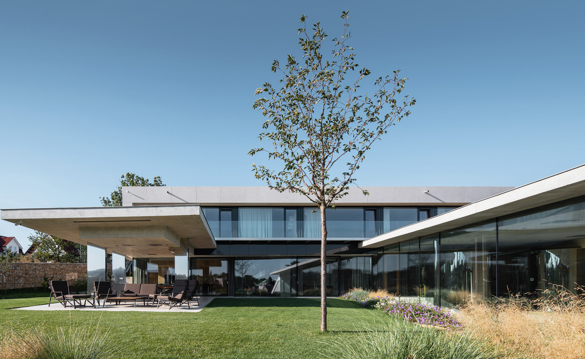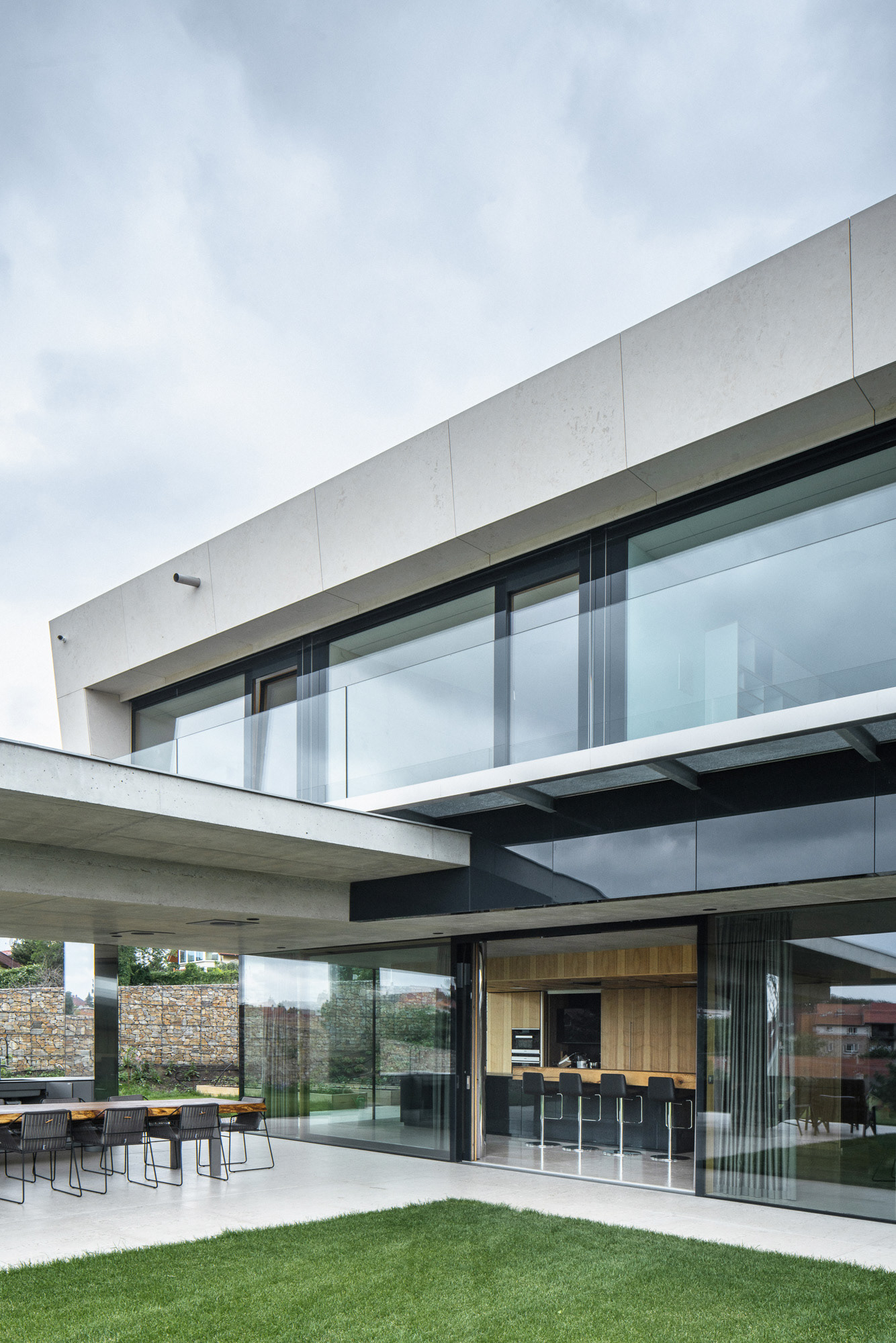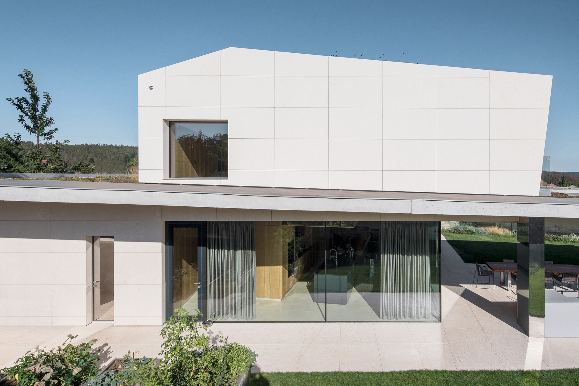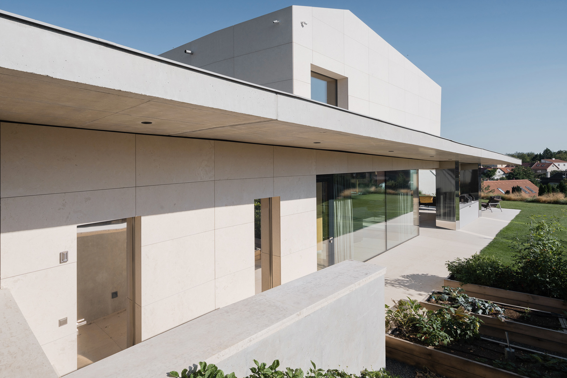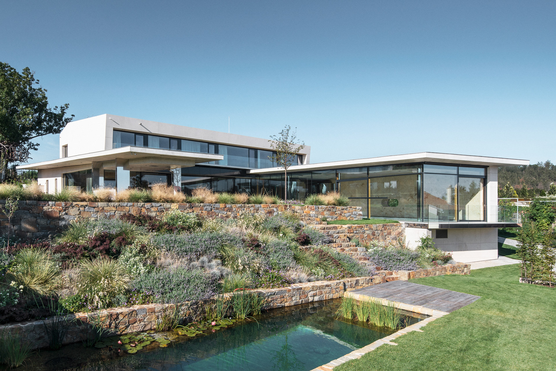 The house is located on a plot of land sloping to the south, naturally responding to this morphology. It has a C-shaped ground plan to protect privacy and increase intimacy. There is a bathing biotope in the lower part of the plot. The house is clad in limestone to the inner courtyard, and extensive greenery covers the partially open roofs. Access to daylight is ensured by large-format windows facing south to the full height of the floor. The house is divided into several units that naturally connect and are interconnected.
