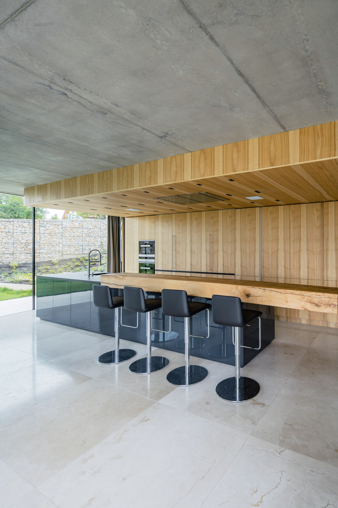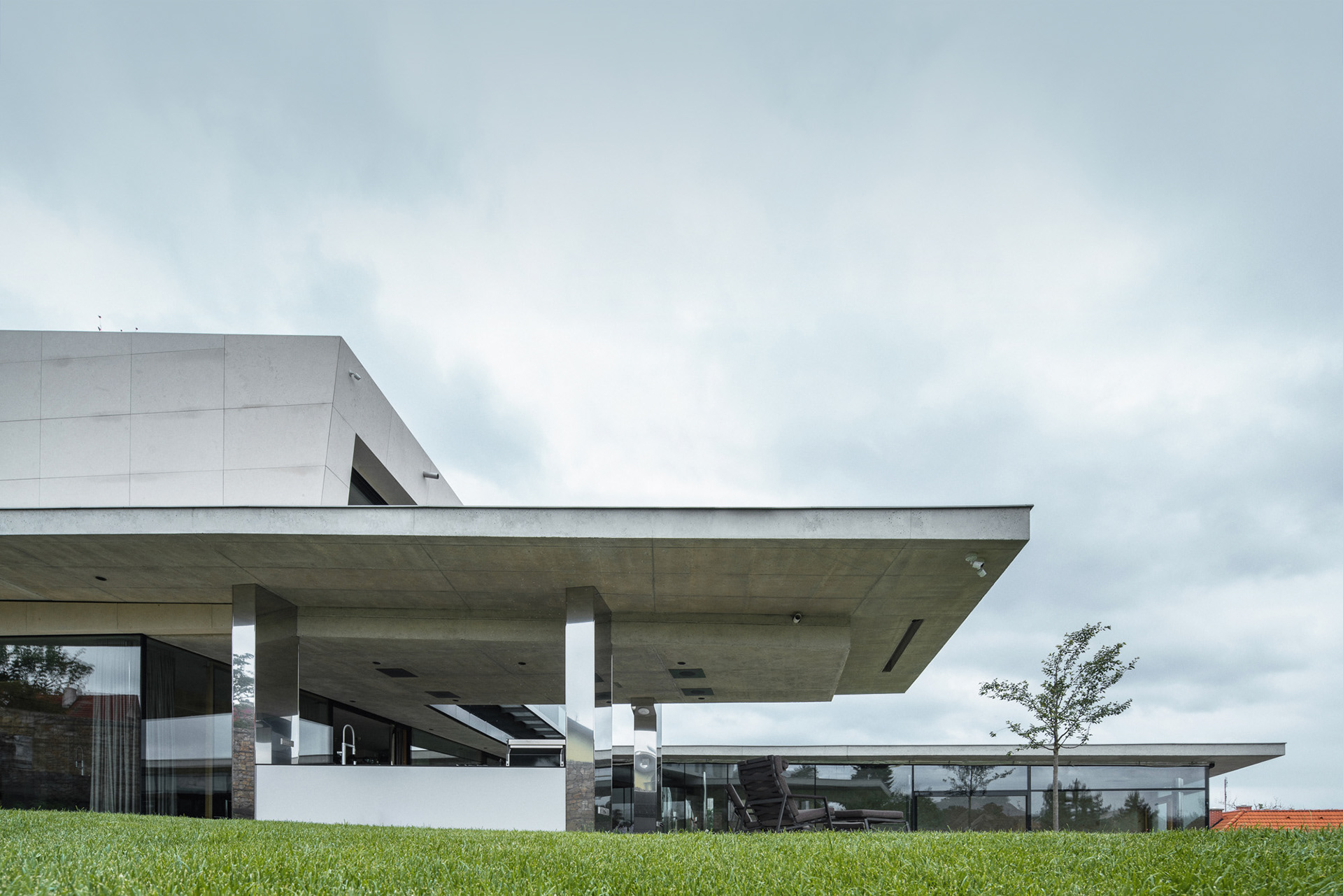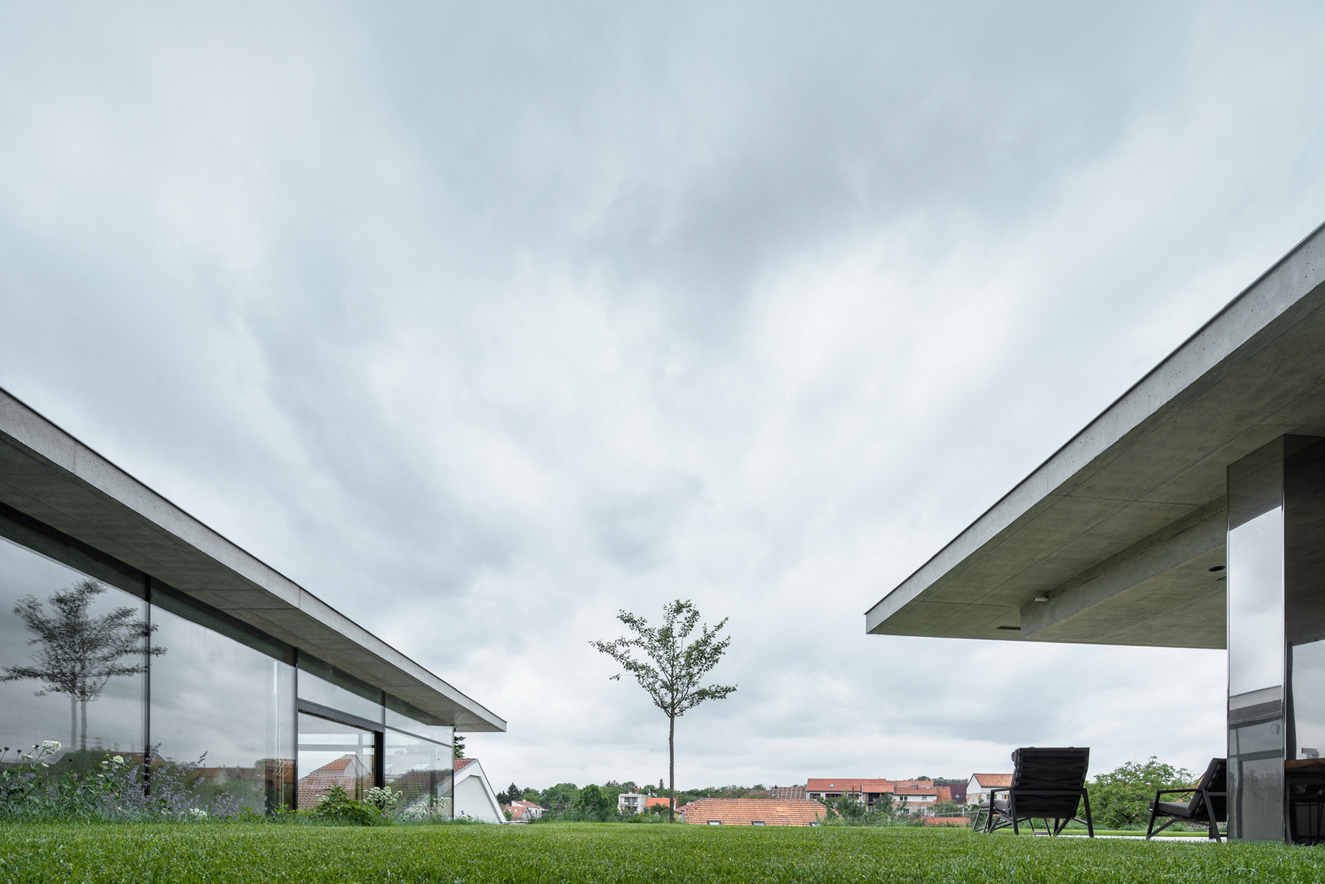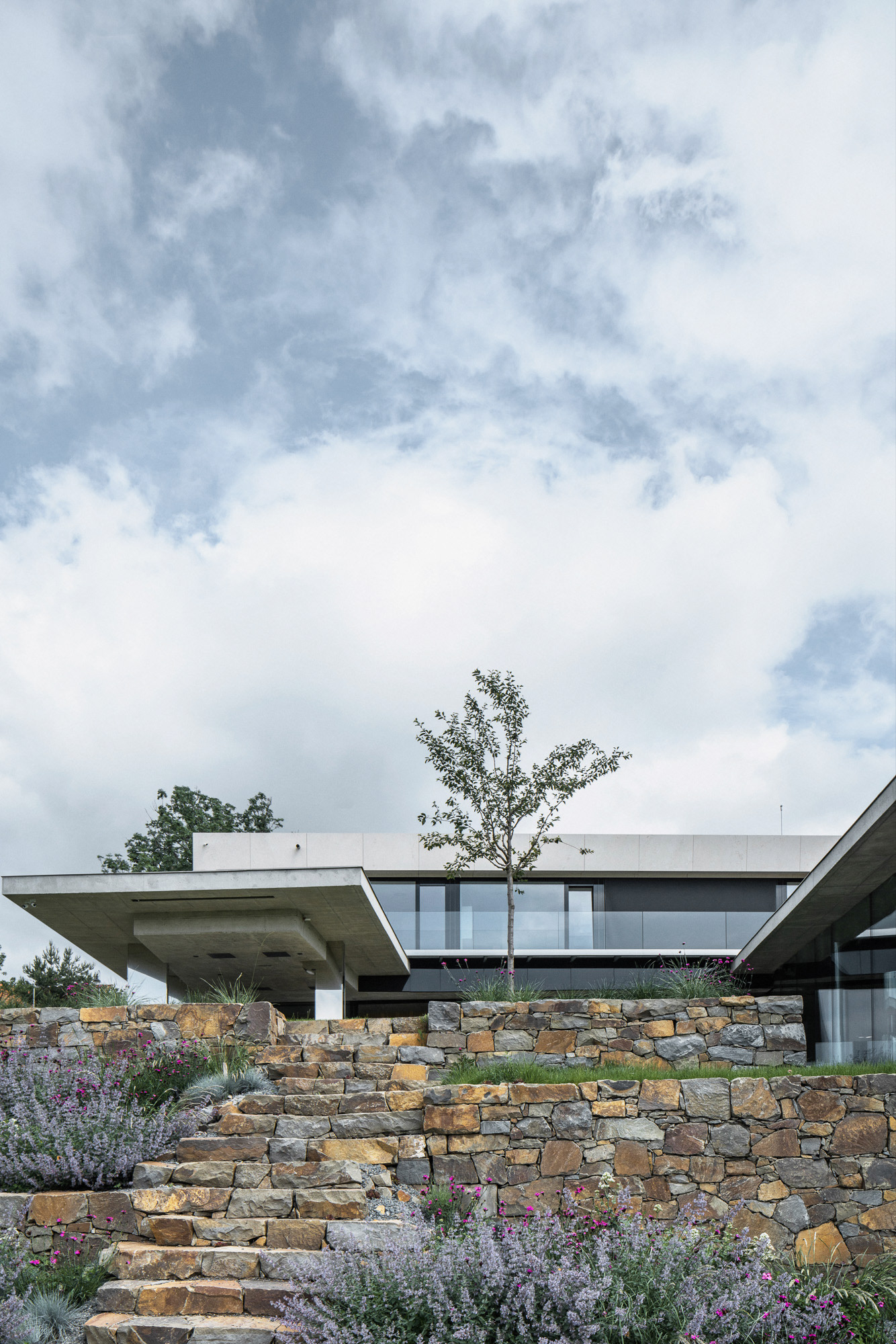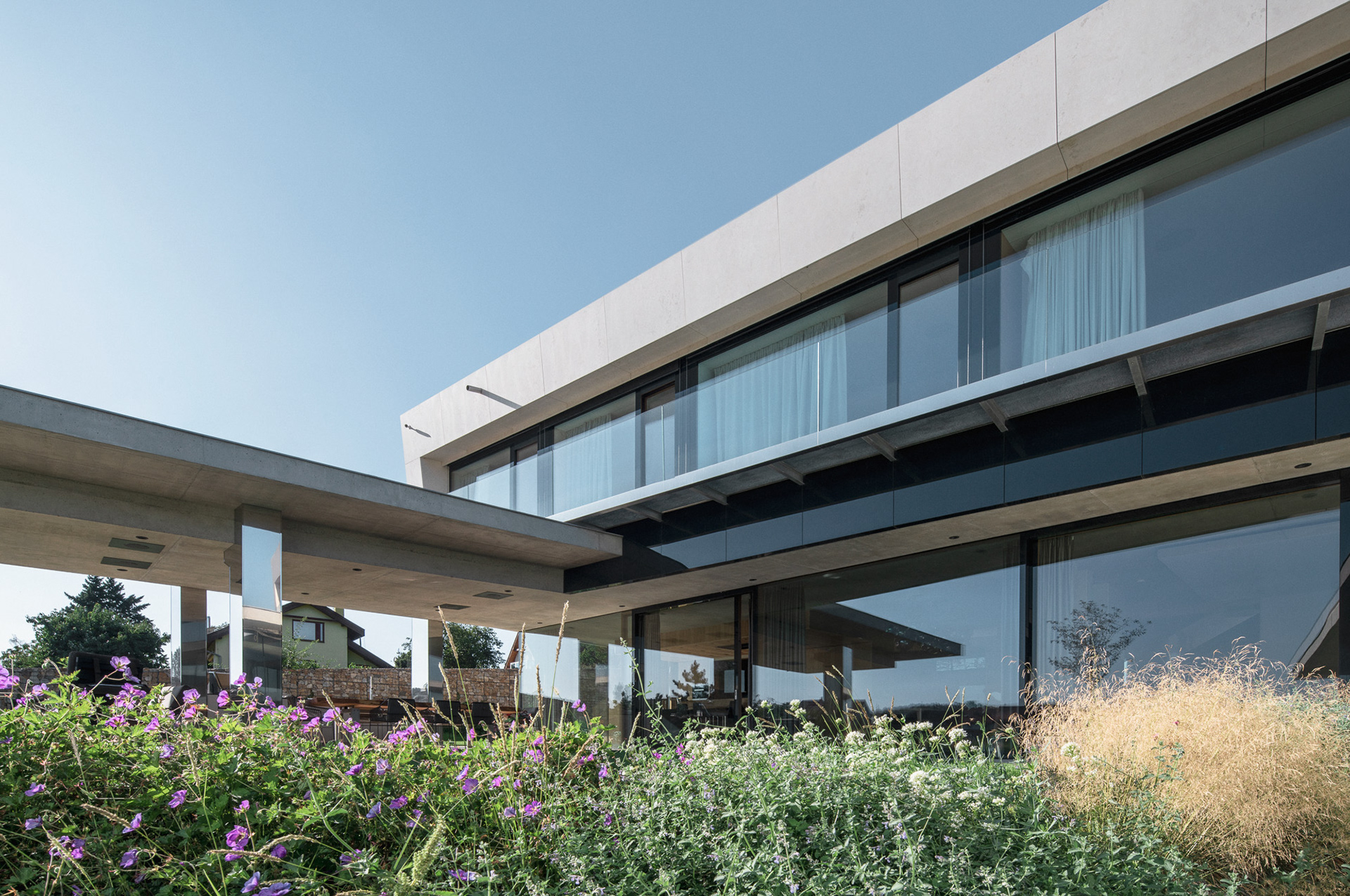 The house is located on a plot of land sloping to the south, naturally responding to this morphology. It has a C-shaped ground plan to protect privacy and increase intimacy. There is a bathing biotope in the lower part of the plot. The house is clad in limestone to the inner courtyard, and extensive greenery covers the partially open roofs. Access to daylight is ensured by large-format windows facing south to the full height of the floor. The house is divided into several units that naturally connect and are interconnected.