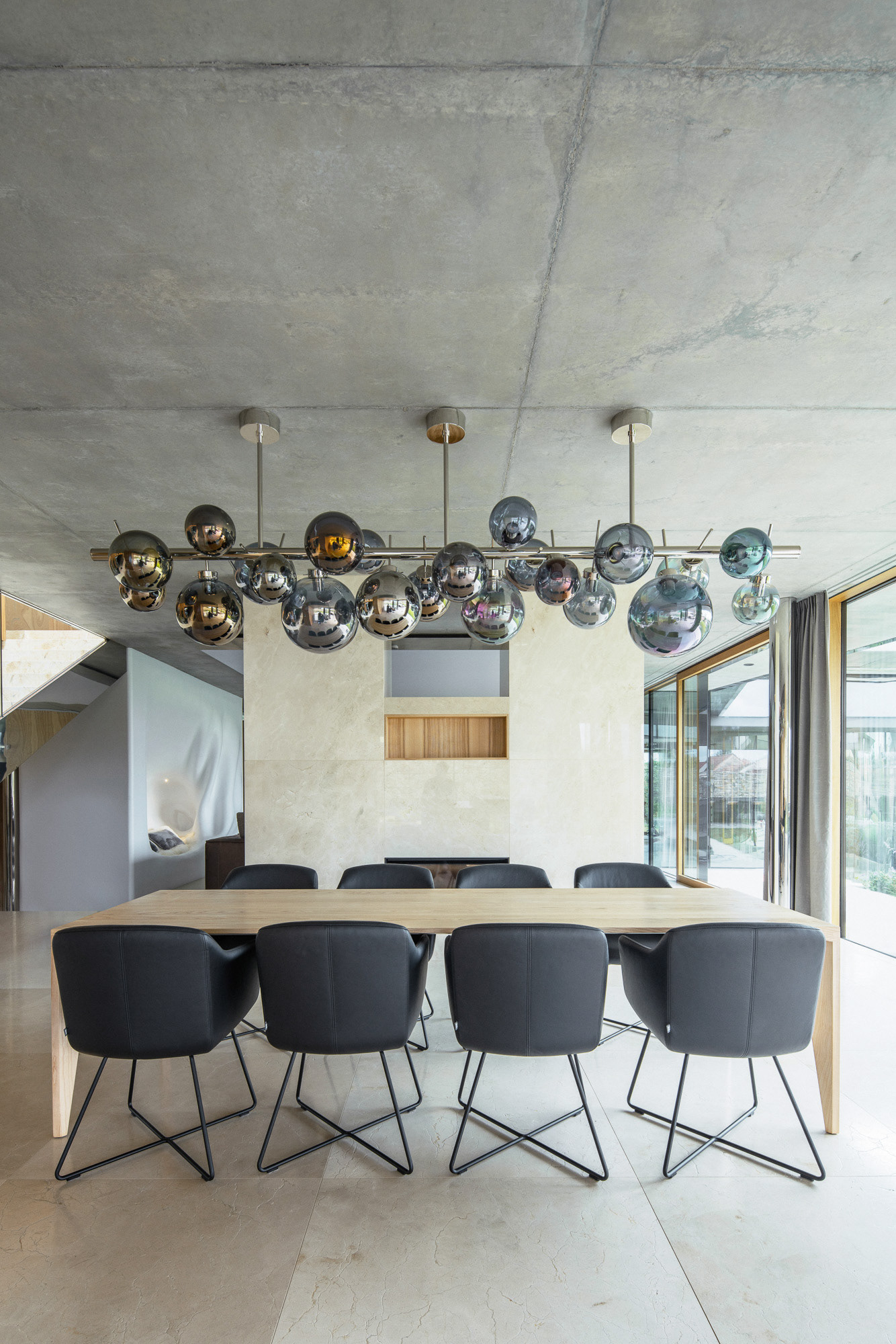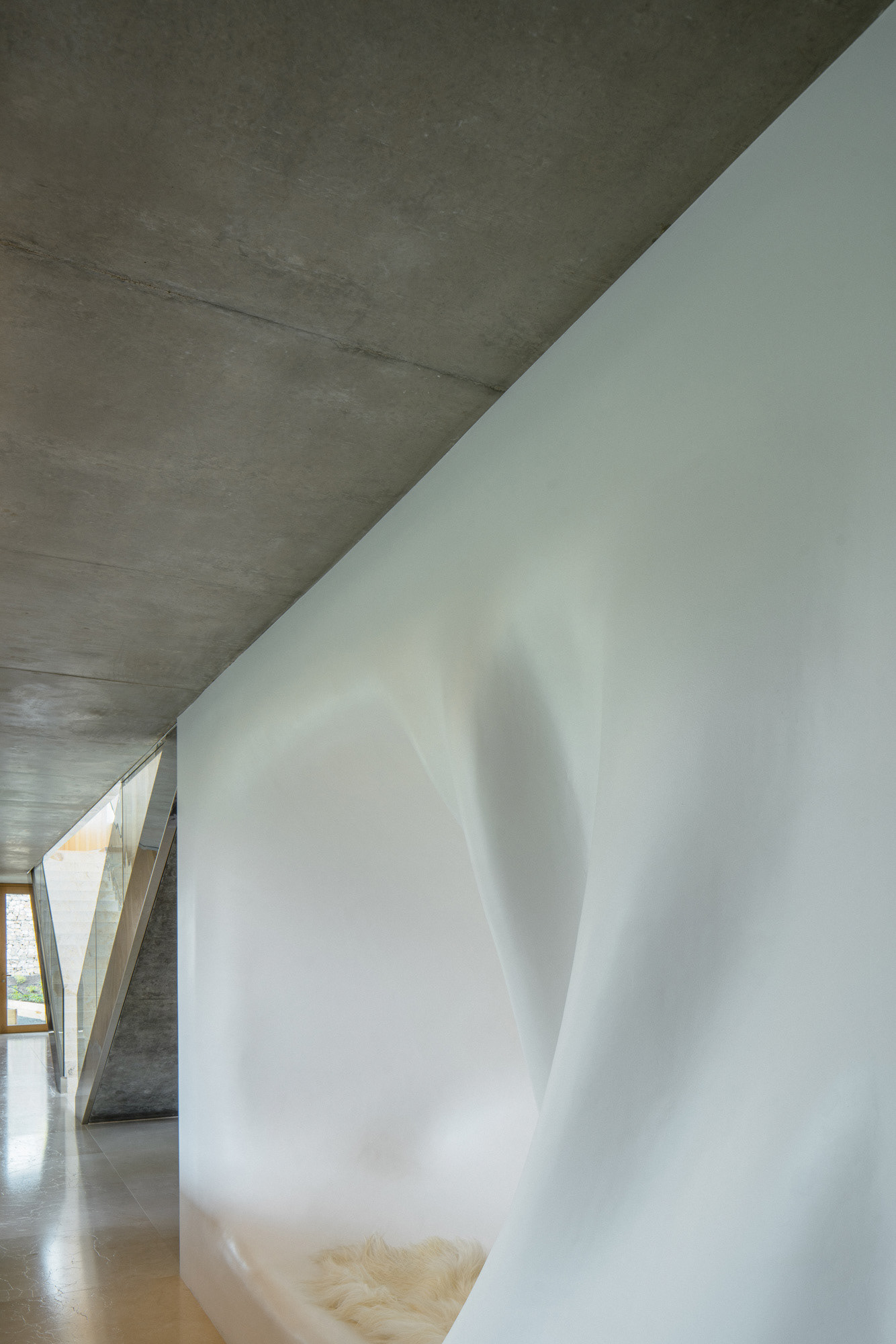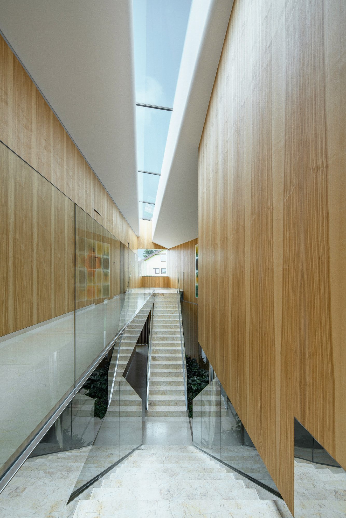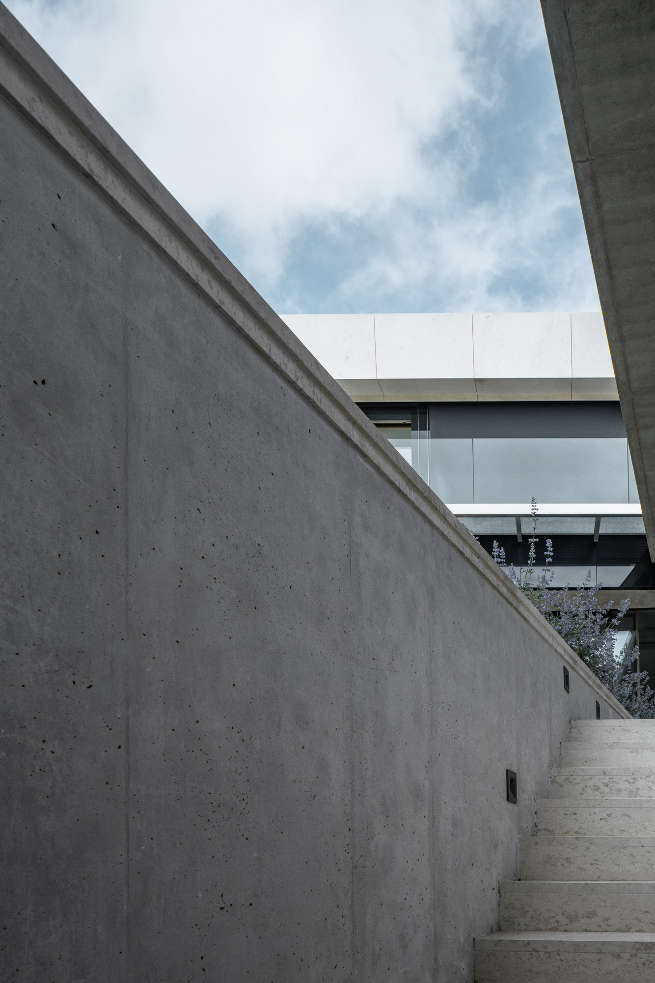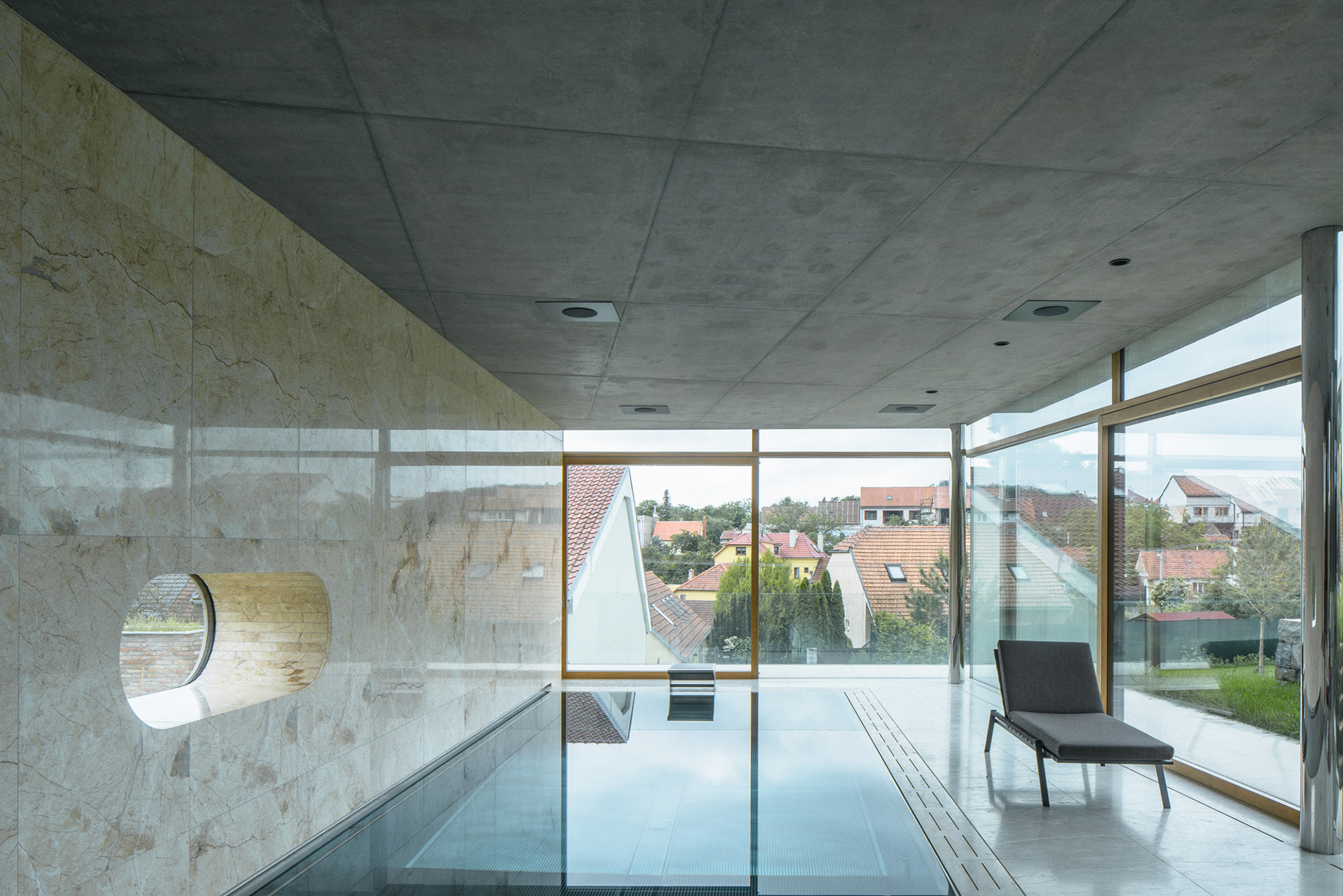 The house is located on a plot of land sloping to the south, naturally responding to this morphology. It has a C-shaped ground plan to protect privacy and increase intimacy. There is a bathing biotope in the lower part of the plot. The house is clad in limestone to the inner courtyard, and extensive greenery covers the partially open roofs. Access to daylight is ensured by large-format windows facing south to the full height of the floor. The house is divided into several units that naturally connect and are interconnected.