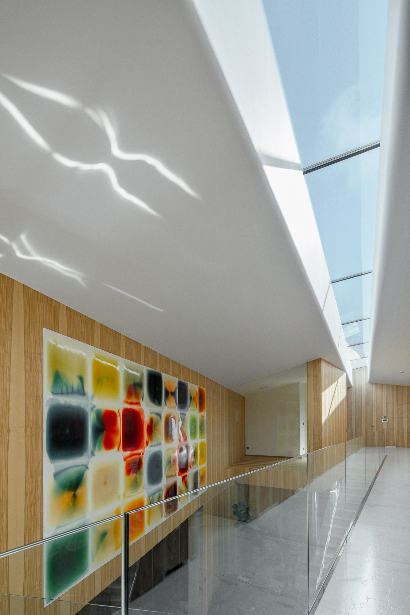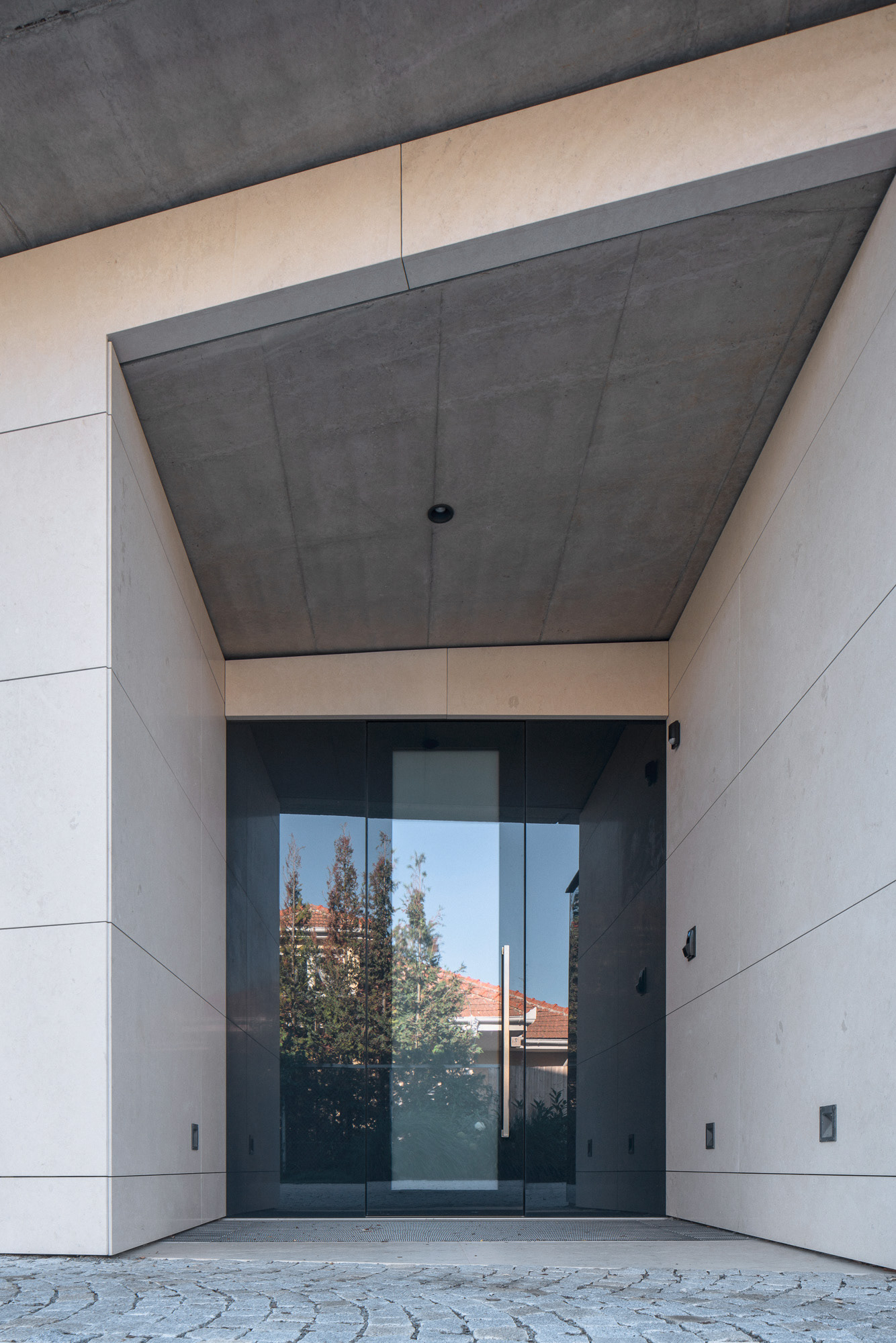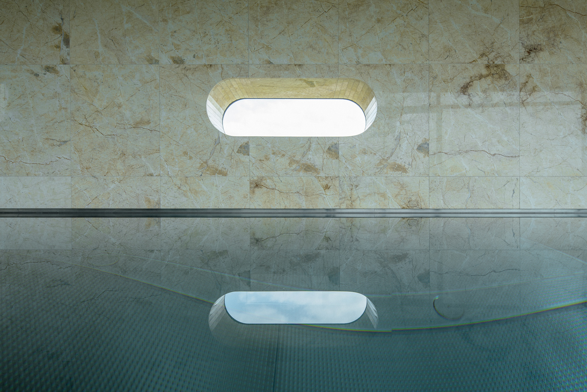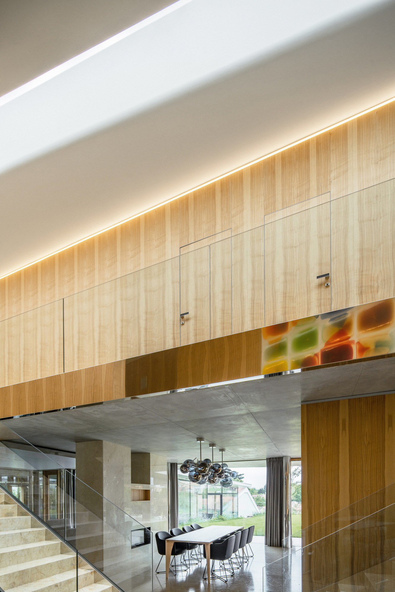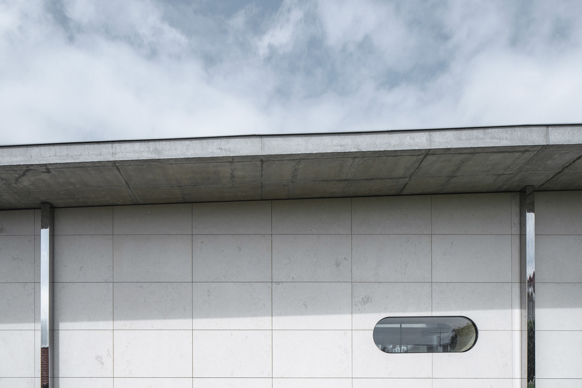 The house is located on a plot of land sloping to the south, naturally responding to this morphology. It has a C-shaped ground plan to protect privacy and increase intimacy. There is a bathing biotope in the lower part of the plot. The house is clad in limestone to the inner courtyard, and extensive greenery covers the partially open roofs. Access to daylight is ensured by large-format windows facing south to the full height of the floor. The house is divided into several units that naturally connect and are interconnected.