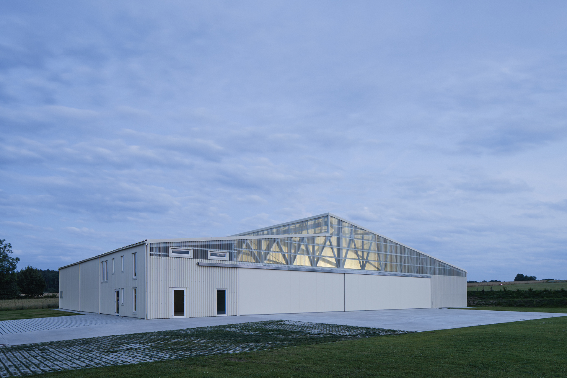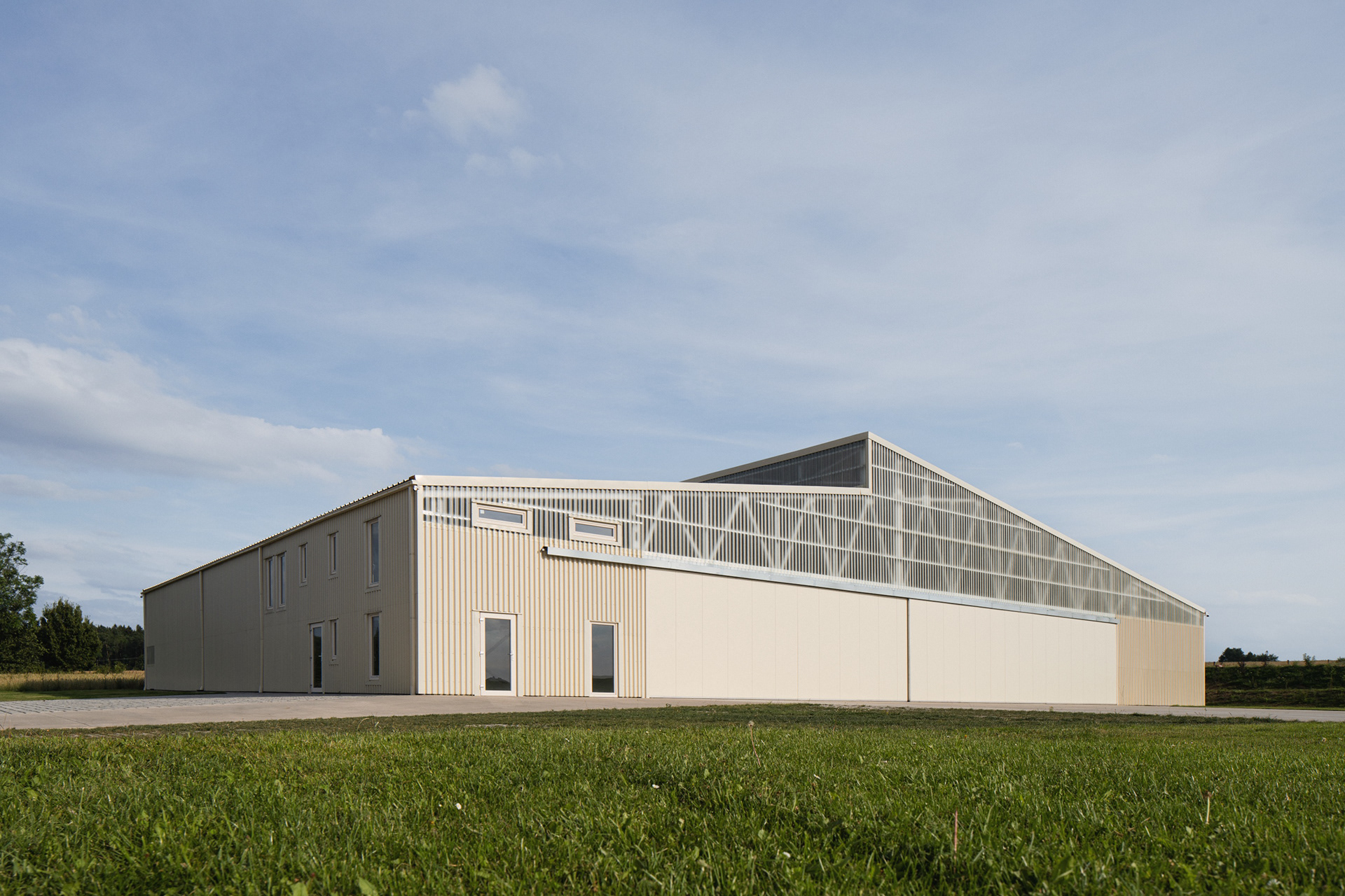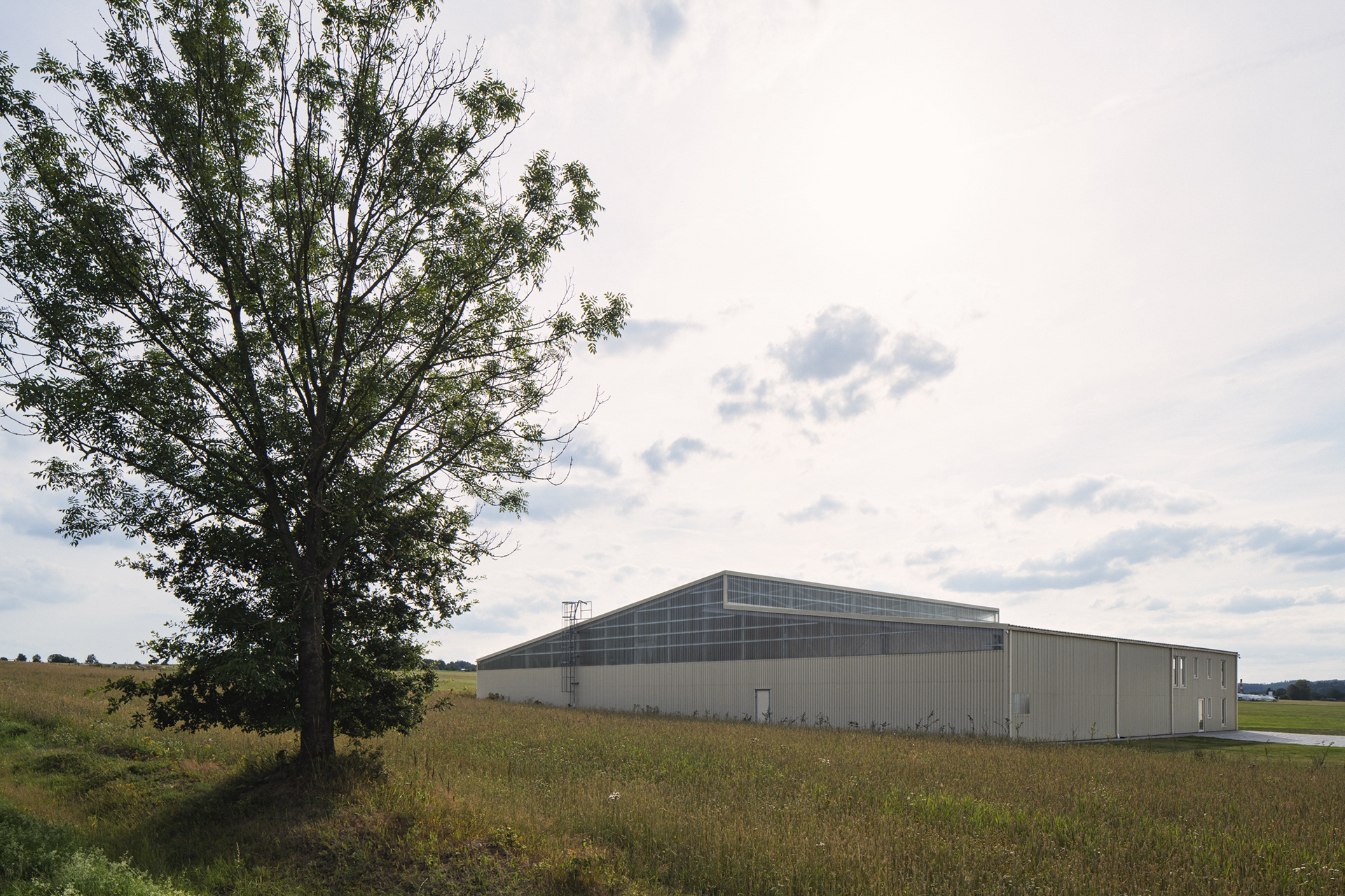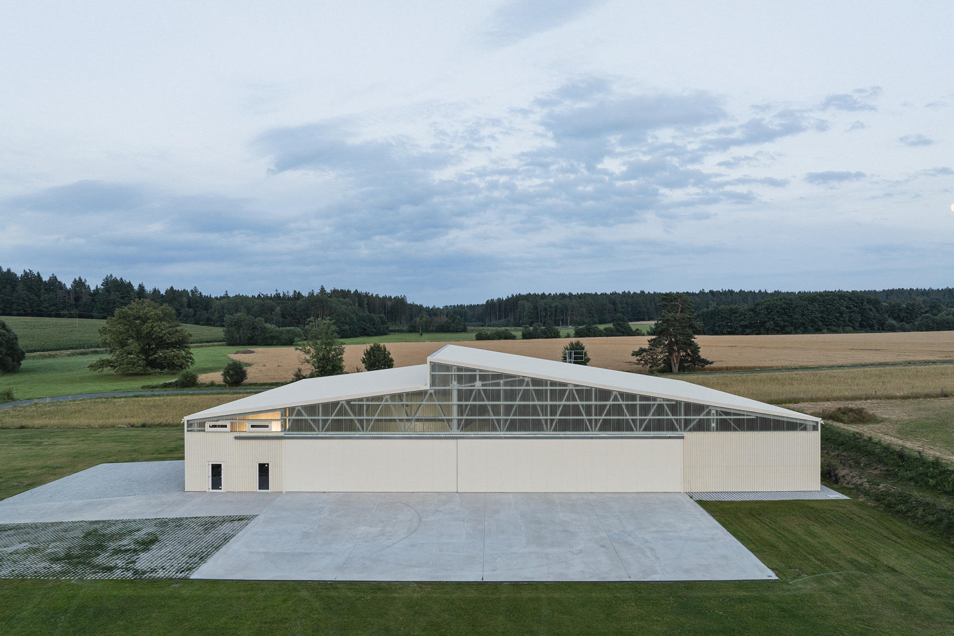Umístění haly jsme navrhli tak, aby krajina netrpěla. V pohledu od vesnice zakrývá stavbu kopec. Od luk, polí a lesa ji stíní dvě zelené stěny. Krajinné výhledy zůstaly zachovány přírodě.