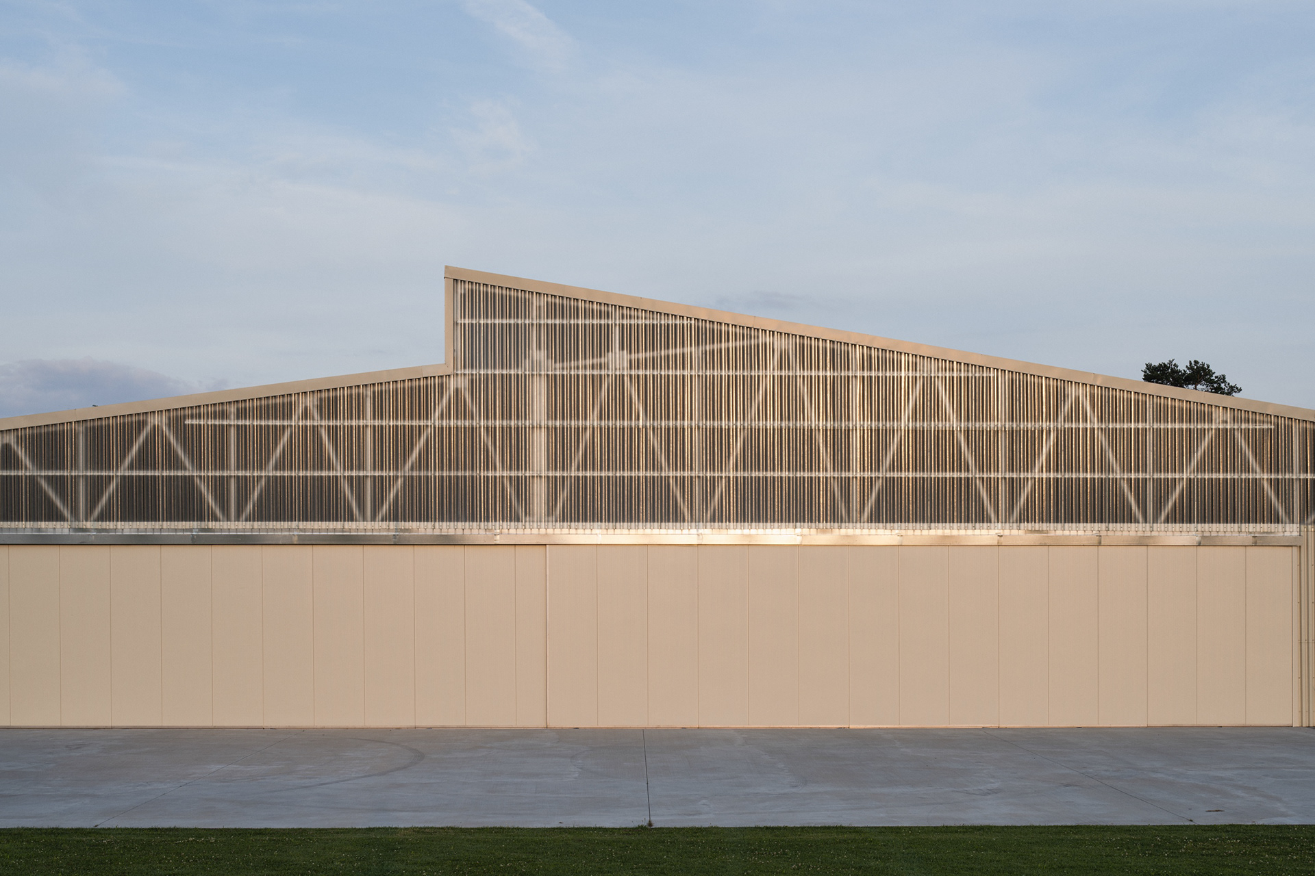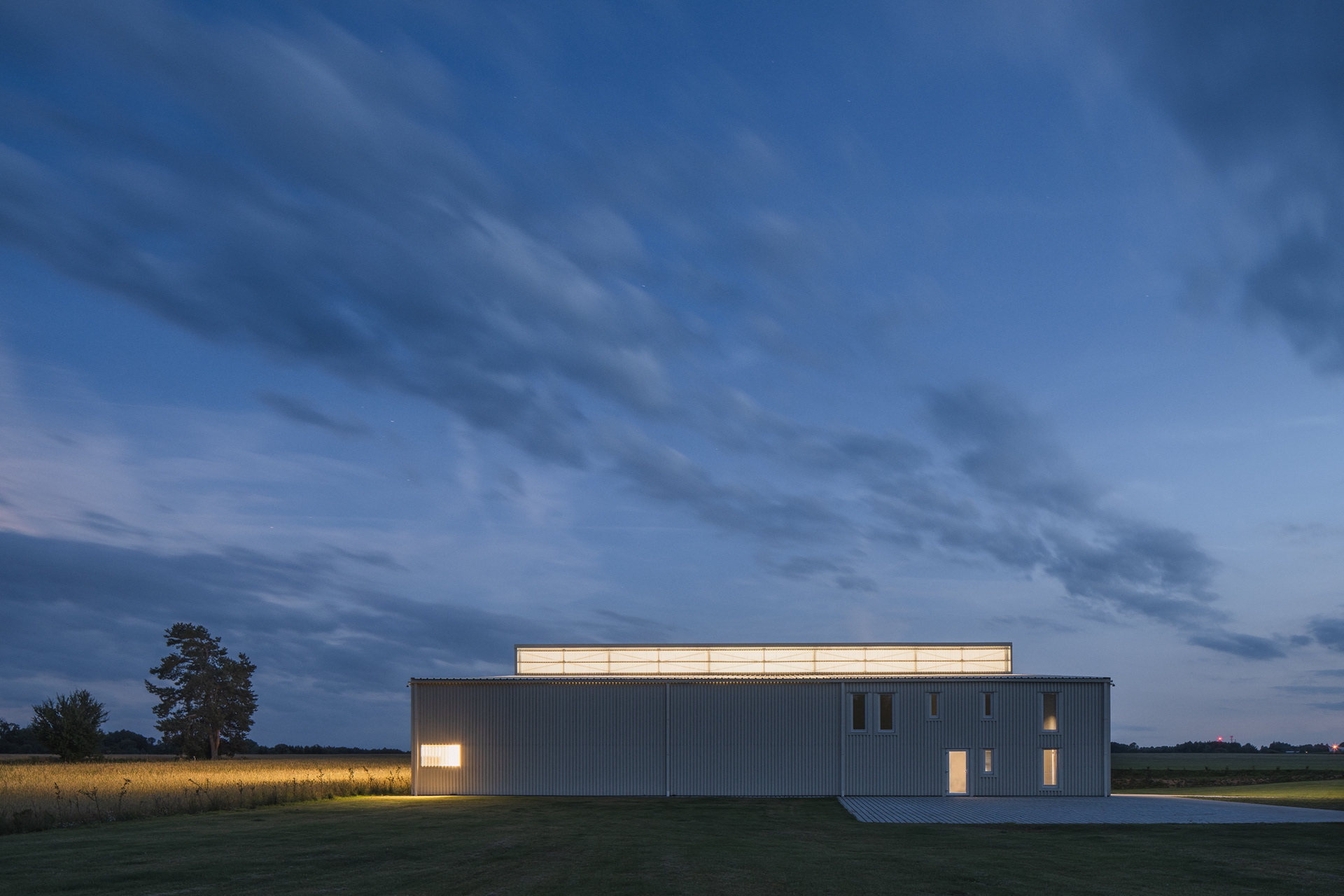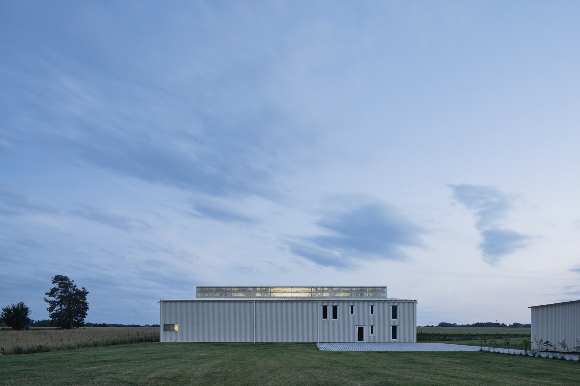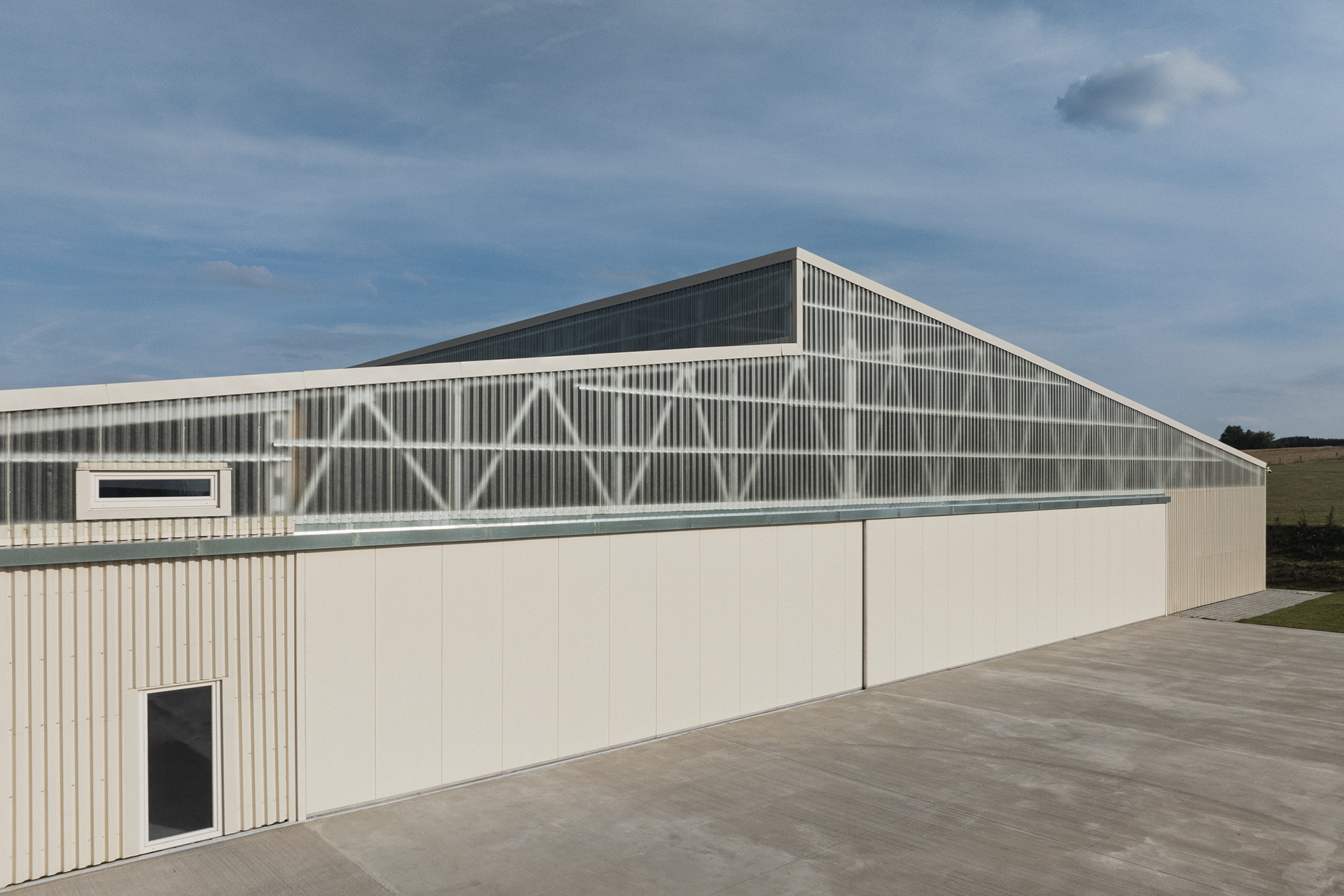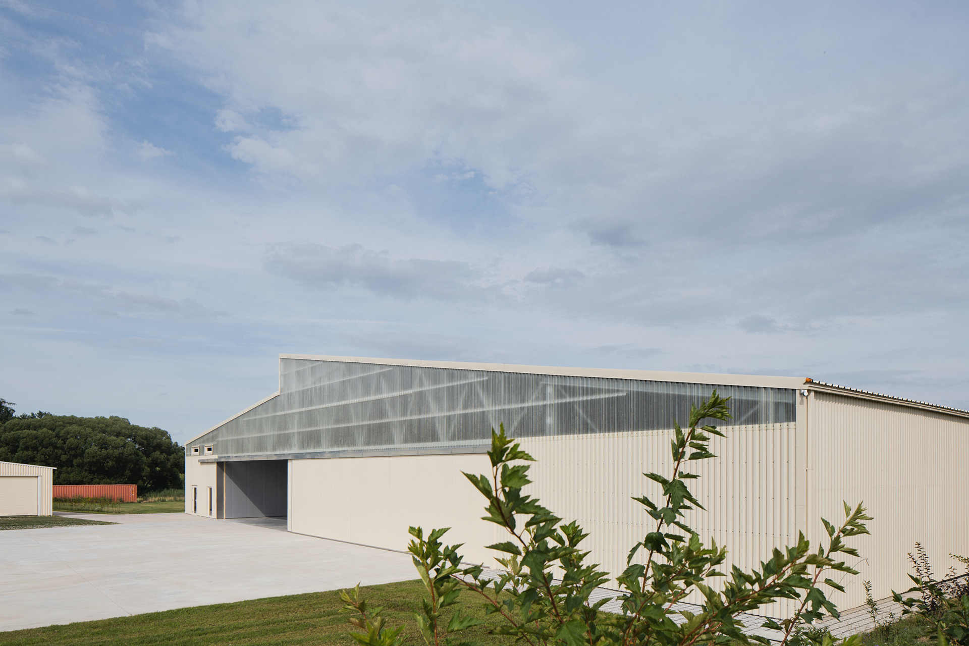 Umístění haly jsme navrhli tak, aby krajina netrpěla. V pohledu od vesnice zakrývá stavbu kopec. Od luk, polí a lesa ji stíní dvě zelené stěny. Krajinné výhledy zůstaly zachovány přírodě.