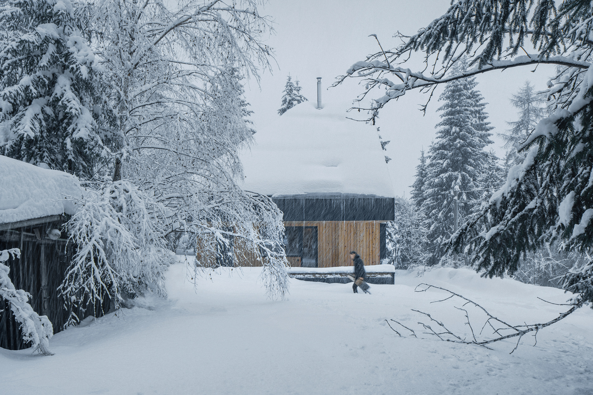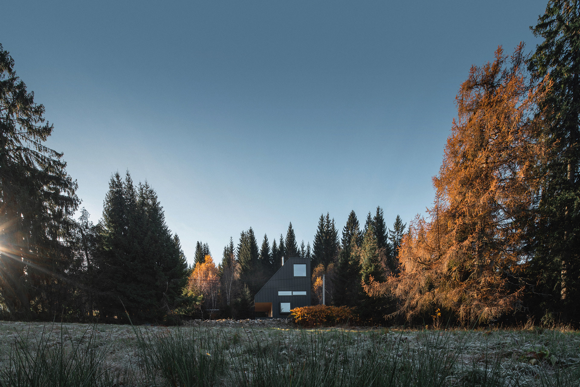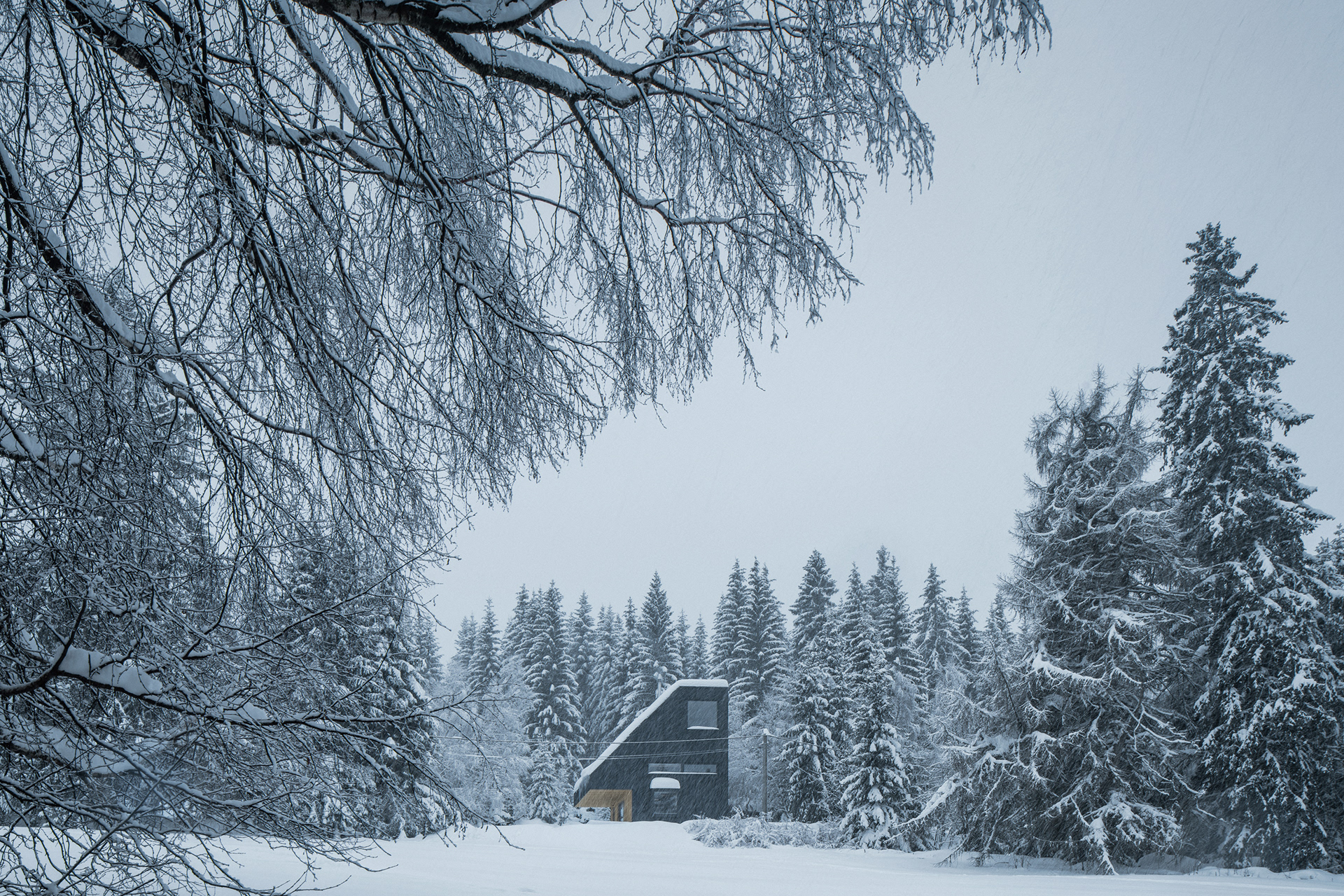 The house is just a few meters from the edge of the forest, from where it grows upwards towards the tops of the spruce trees. Nestled among the trees, almost hidden compared to the other white plastered houses of the neighboring houses, it almost looks as if it has been swallowed up by the forest. From a formal point of view, the new building is represented by an aerodynamic but angular figure, where classic elements such as the roof and the wall give way to a clear shape and merge into each other. The external appearance was created through many precisely set spatial scenes of the interior and based on the seasonally changing local climatic conditions, as the snow load in winter requires the steep angle of the roof.