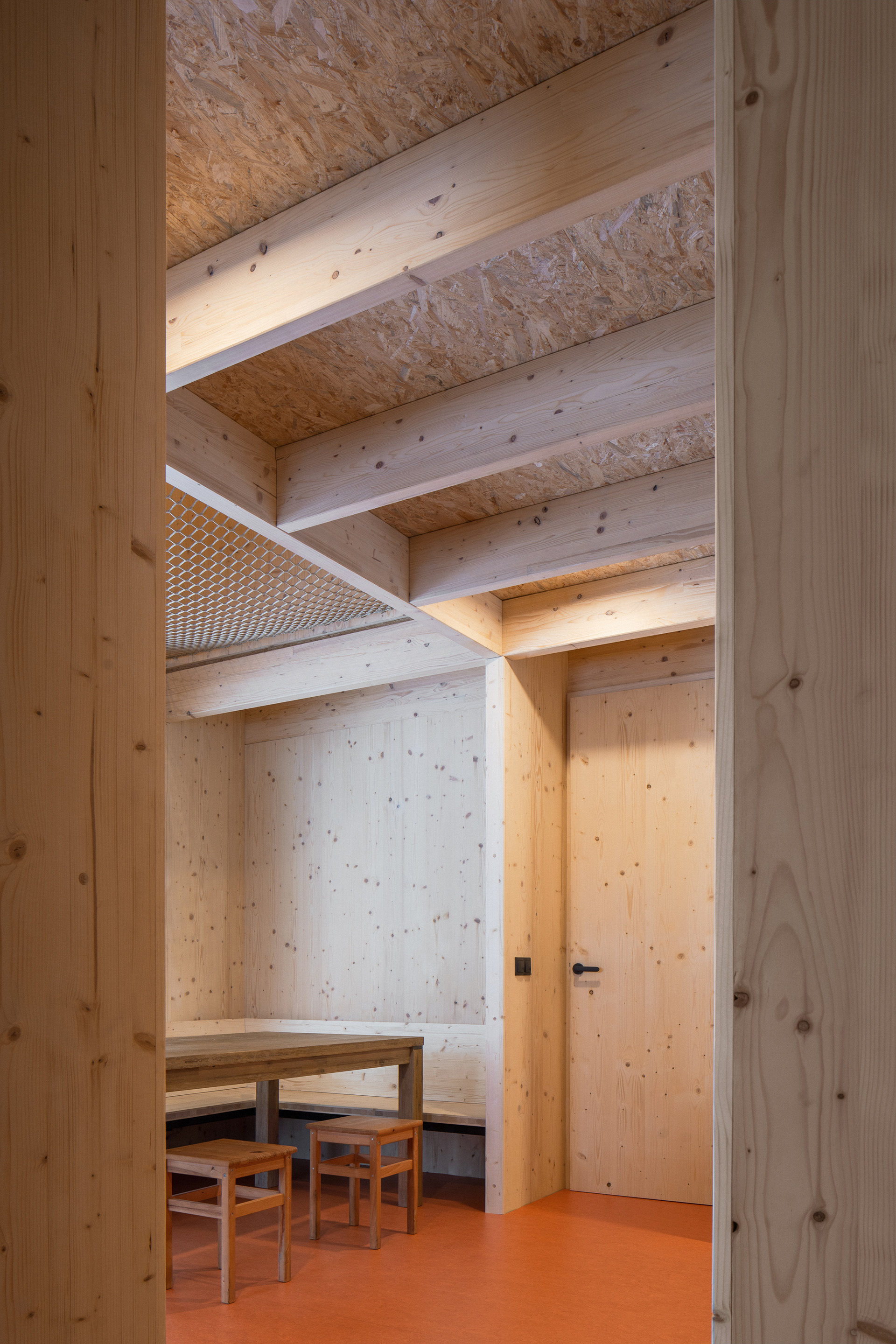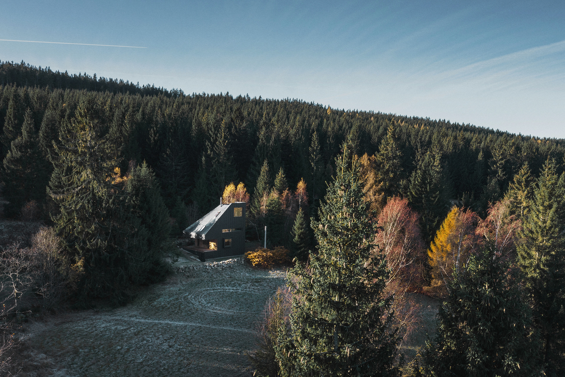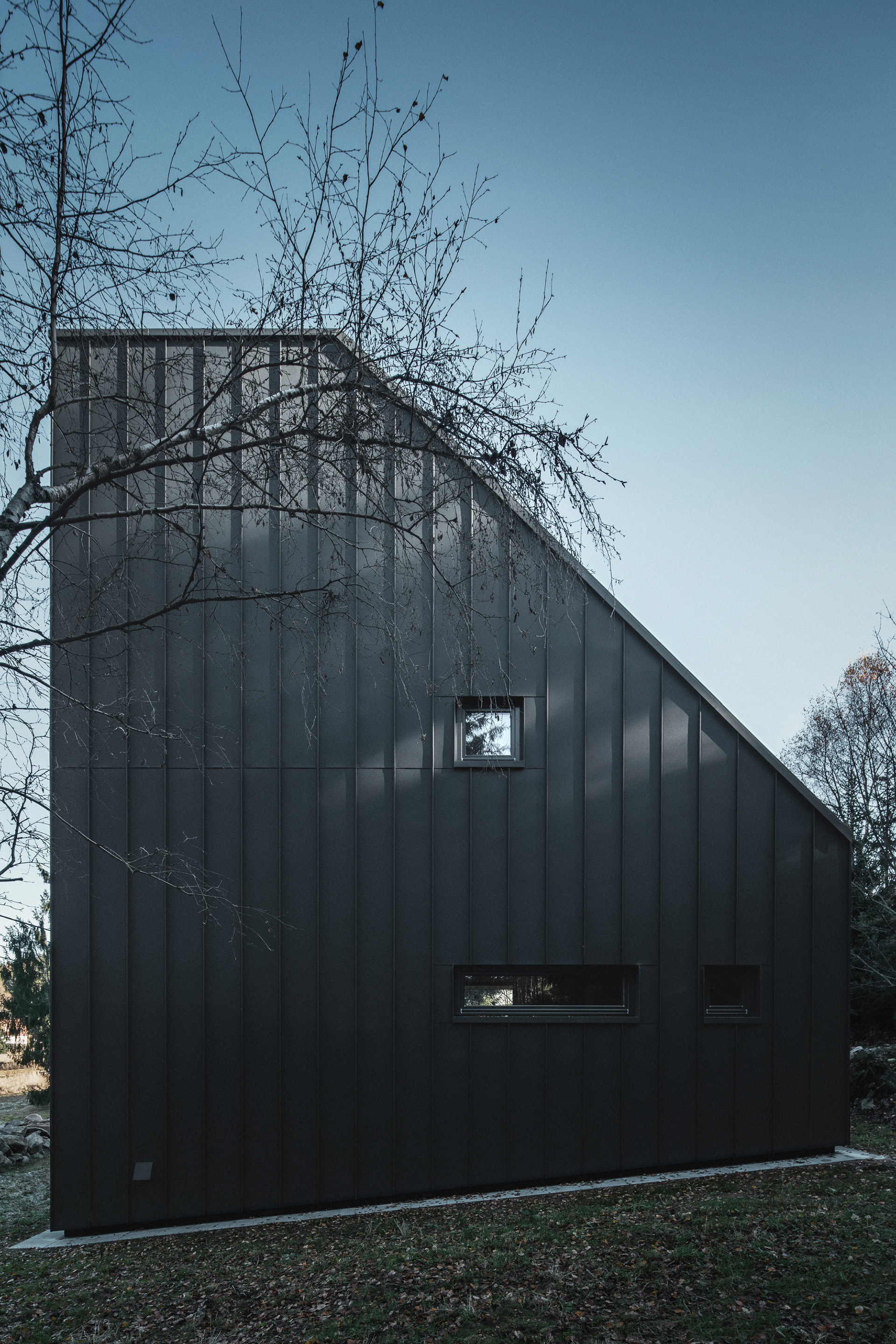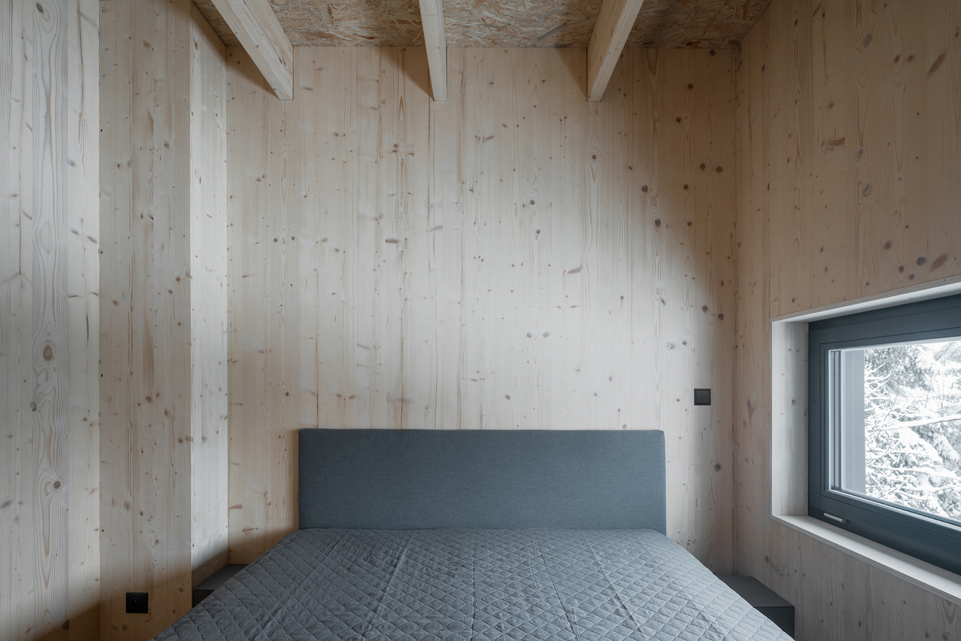 The house is just a few meters from the edge of the forest, from where it grows upwards towards the tops of the spruce trees. Nestled among the trees, almost hidden compared to the other white plastered houses of the neighboring houses, it almost looks as if it has been swallowed up by the forest. From a formal point of view, the new building is represented by an aerodynamic but angular figure, where classic elements such as the roof and the wall give way to a clear shape and merge into each other. The external appearance was created through many precisely set spatial scenes of the interior and based on the seasonally changing local climatic conditions, as the snow load in winter requires the steep angle of the roof.