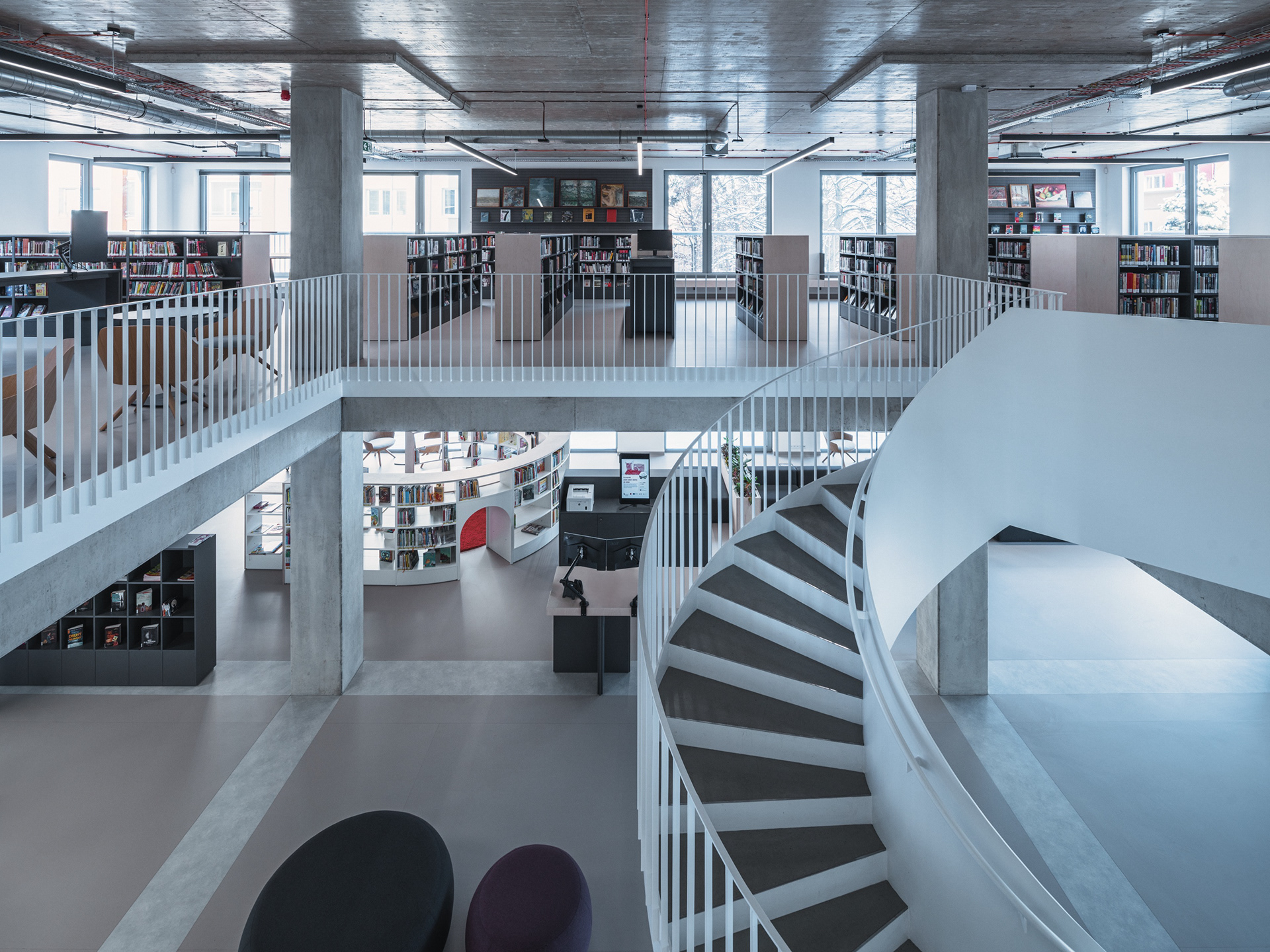 Regály s knihami se nacházejí v prvním a druhém podlaží, která jsou spojená atriem, jemuž dominuje točité schodiště. Najdeme tu také řadu míst pro čtení, a to jak studijních u stolů (38 míst), tak relaxačních na křeslech a pohovkách (50 míst). A dá se vyjít i ven a sednout si pod pergolou. Prostě městský obývák.