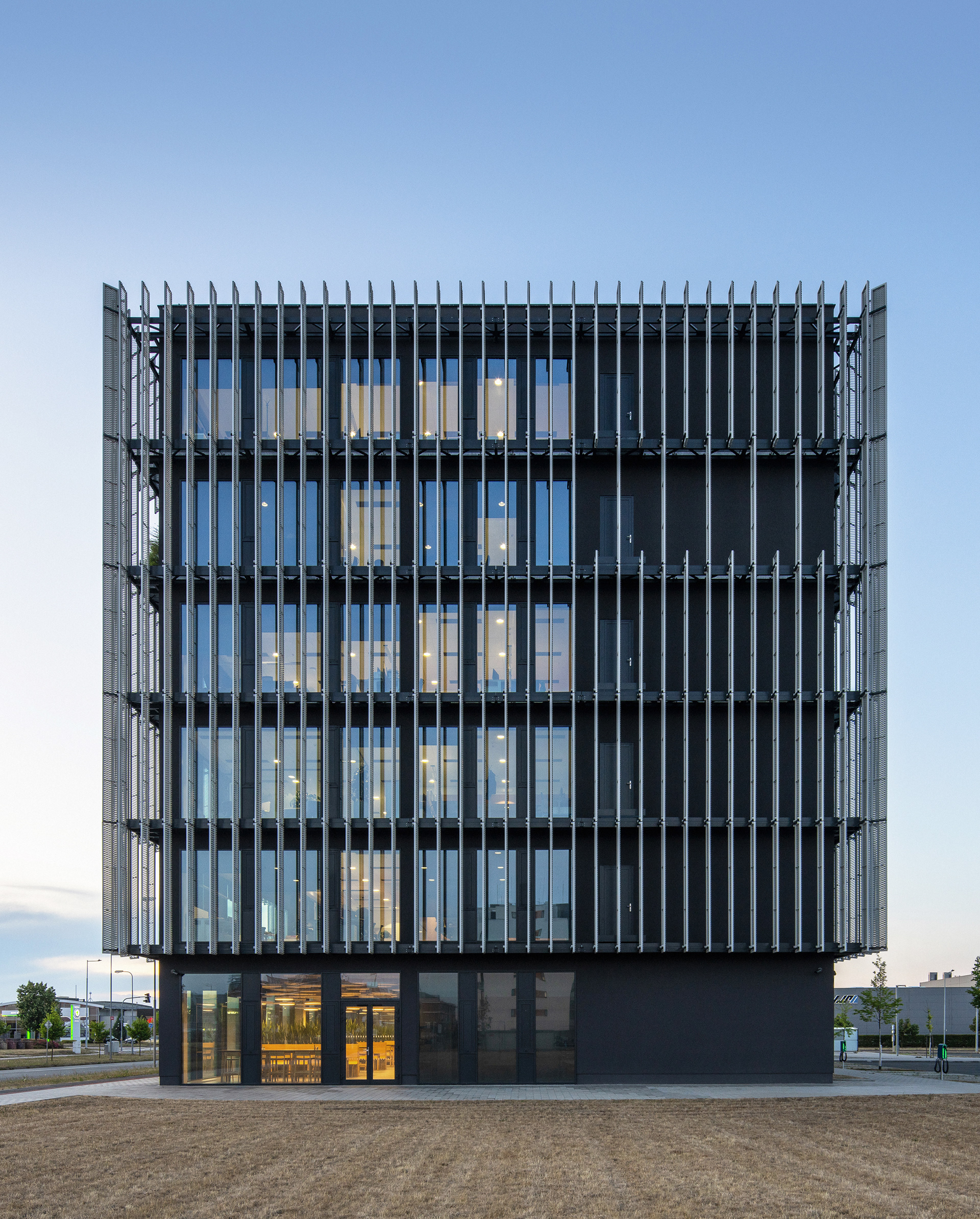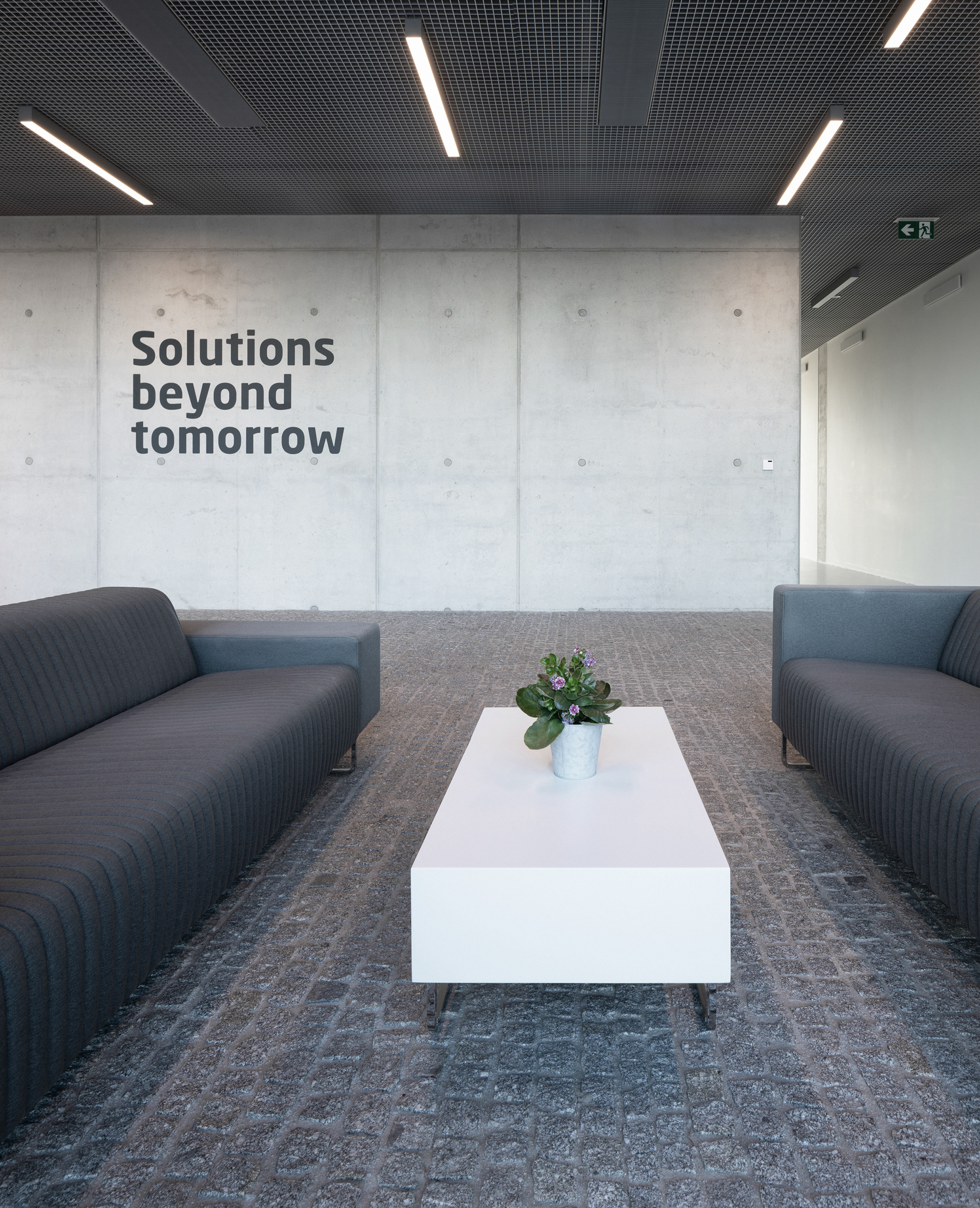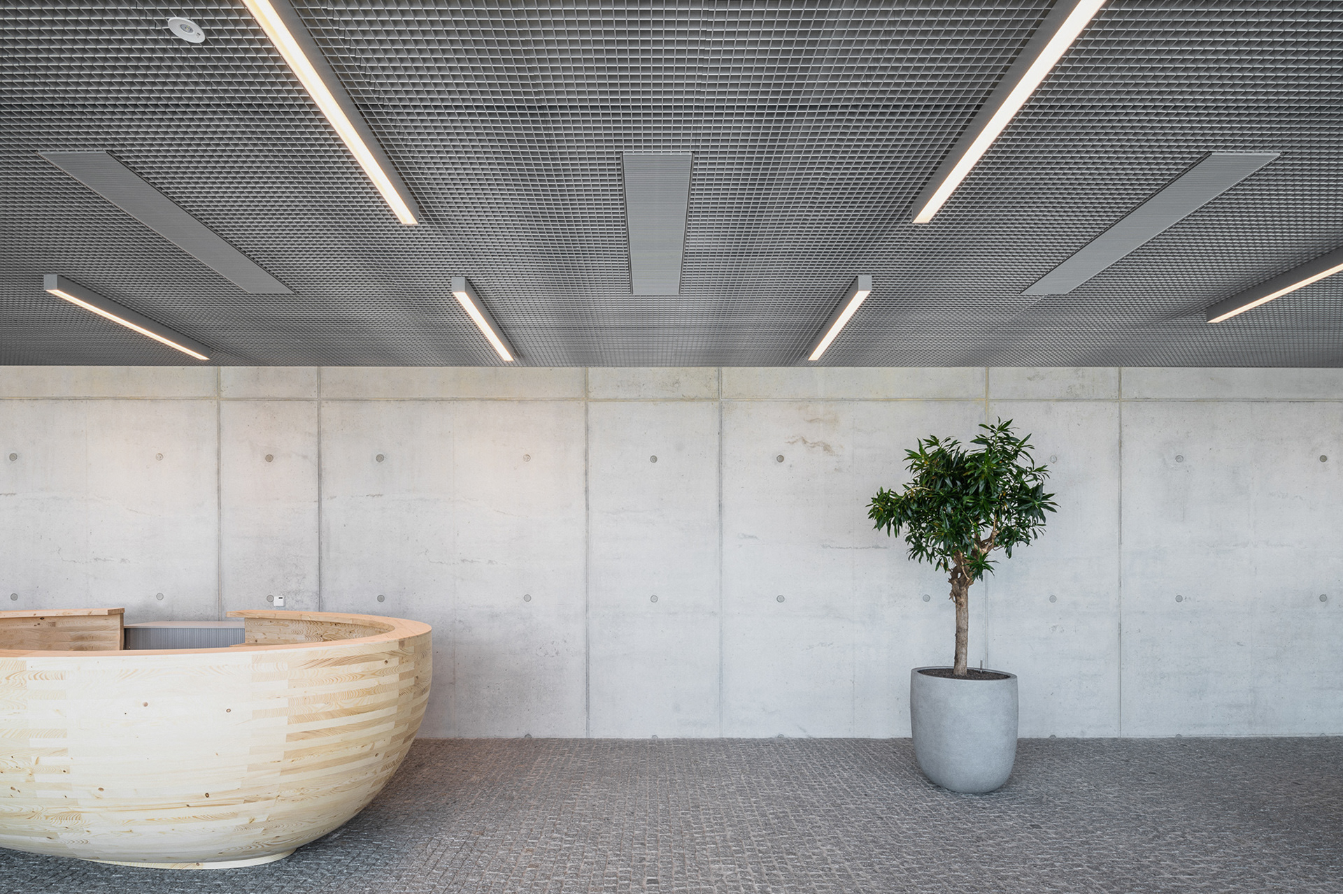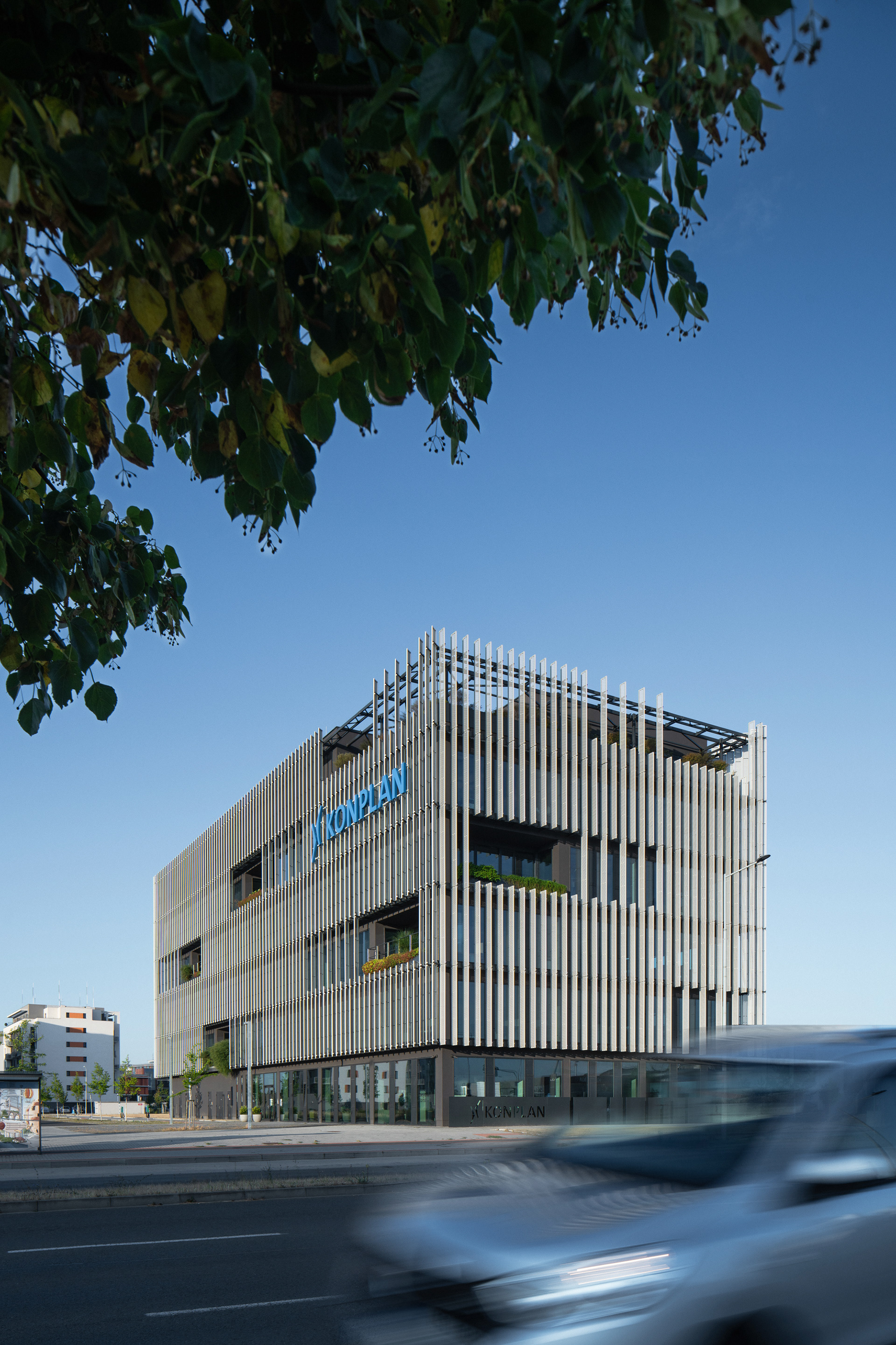 The Konplan office building is a new landmark in Pilsen, Borské Pole. The classic three-phase building with an inner core and workplaces around the perimeter has a unique facade. It consists of perforated slats that are turned towards the sun. The strict metal grid is interrupted by green islands. Giant flower pots have the potential for tall greenery. These green oases are also linked to the interior design. The relaxation zones on the individual floors are concentrated around them.