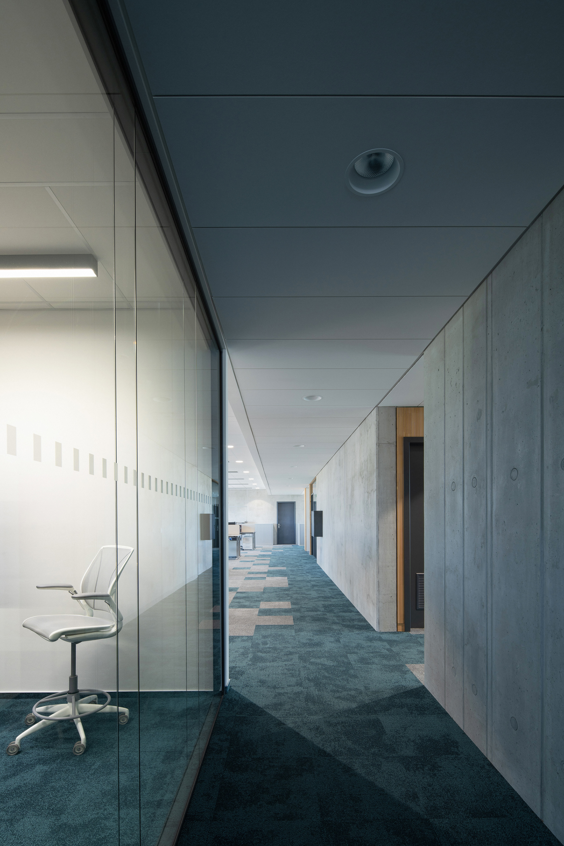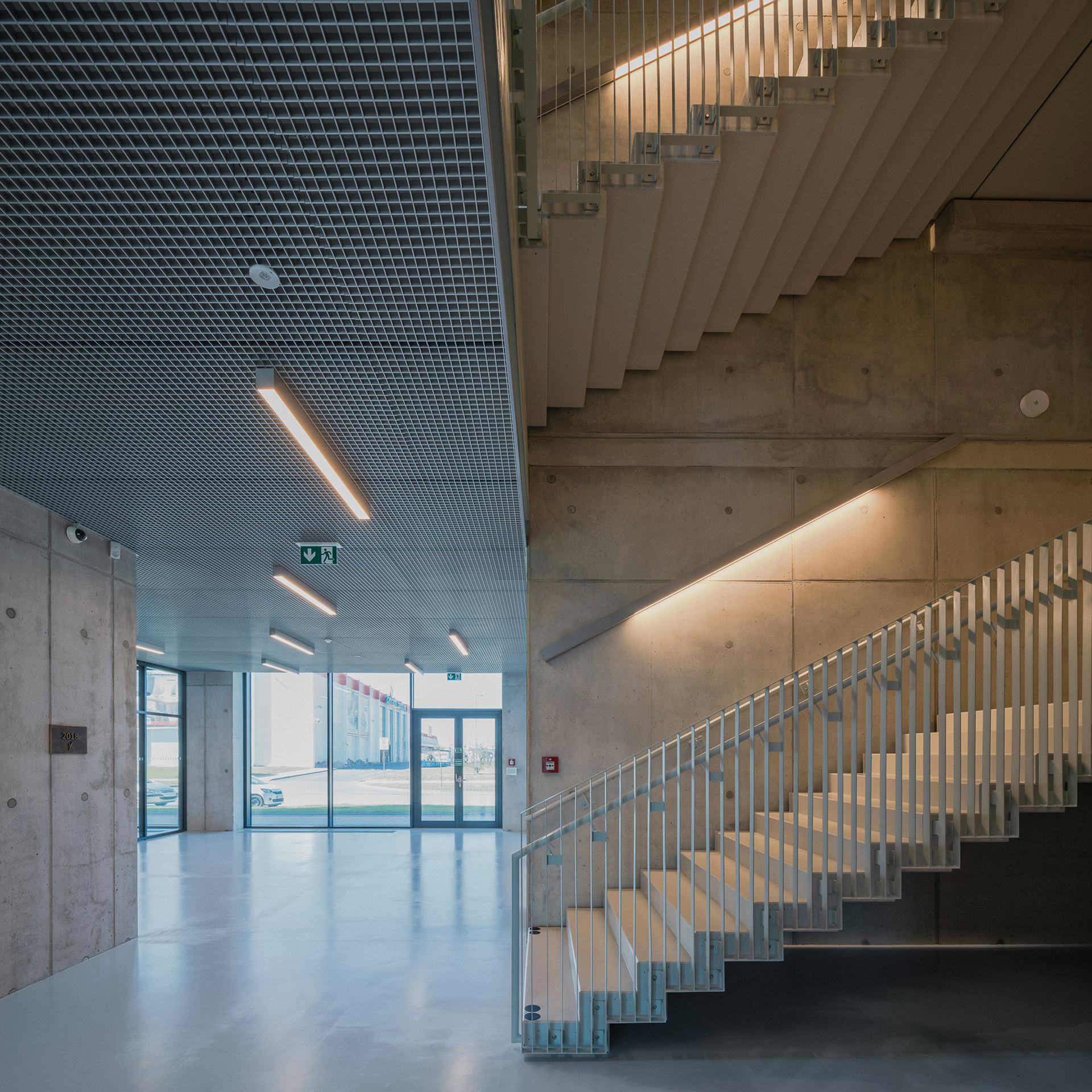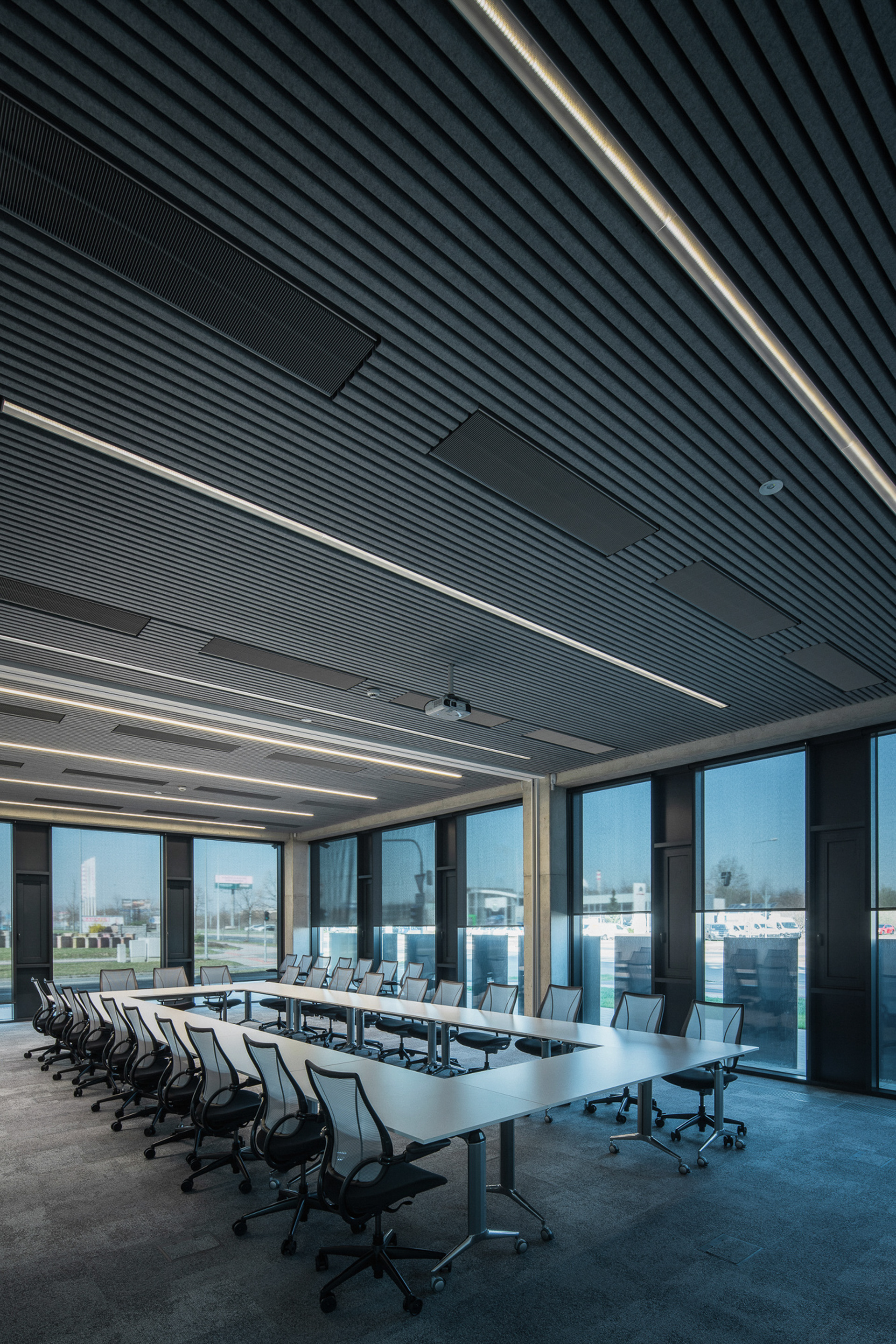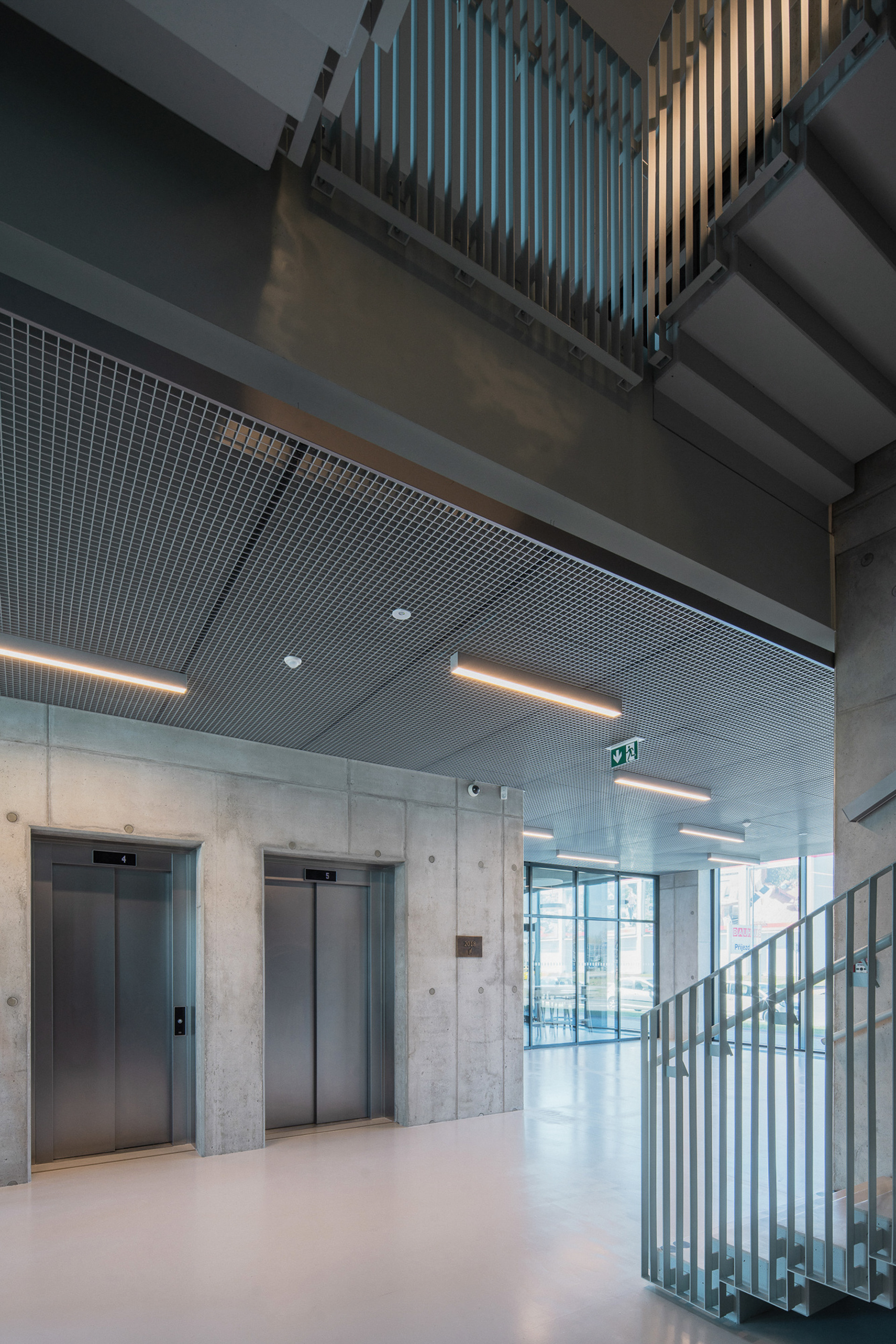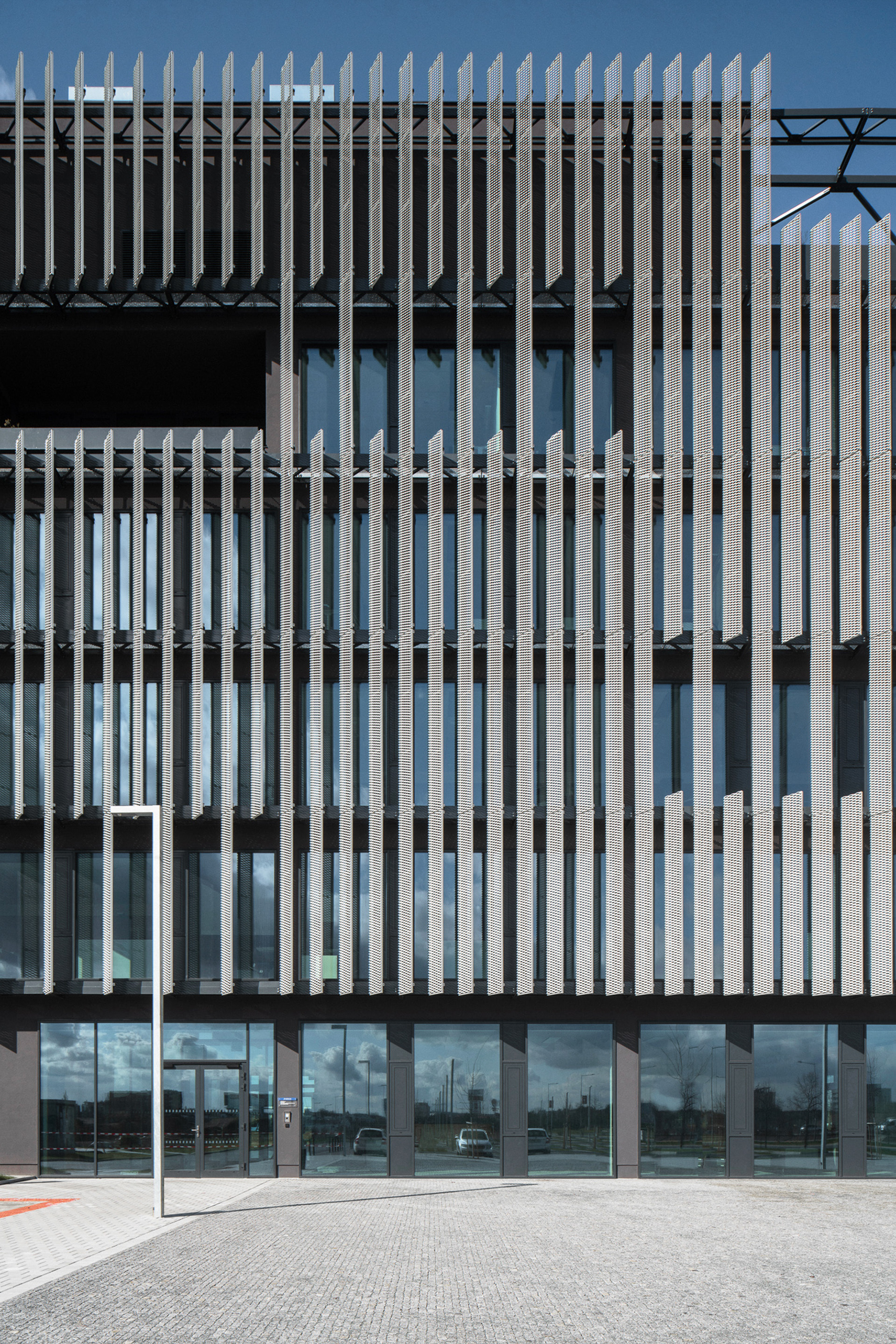 The Konplan office building is a new landmark in Pilsen, Borské Pole. The classic three-phase building with an inner core and workplaces around the perimeter has a unique facade. It consists of perforated slats that are turned towards the sun. The strict metal grid is interrupted by green islands. Giant flower pots have the potential for tall greenery. These green oases are also linked to the interior design. The relaxation zones on the individual floors are concentrated around them.
