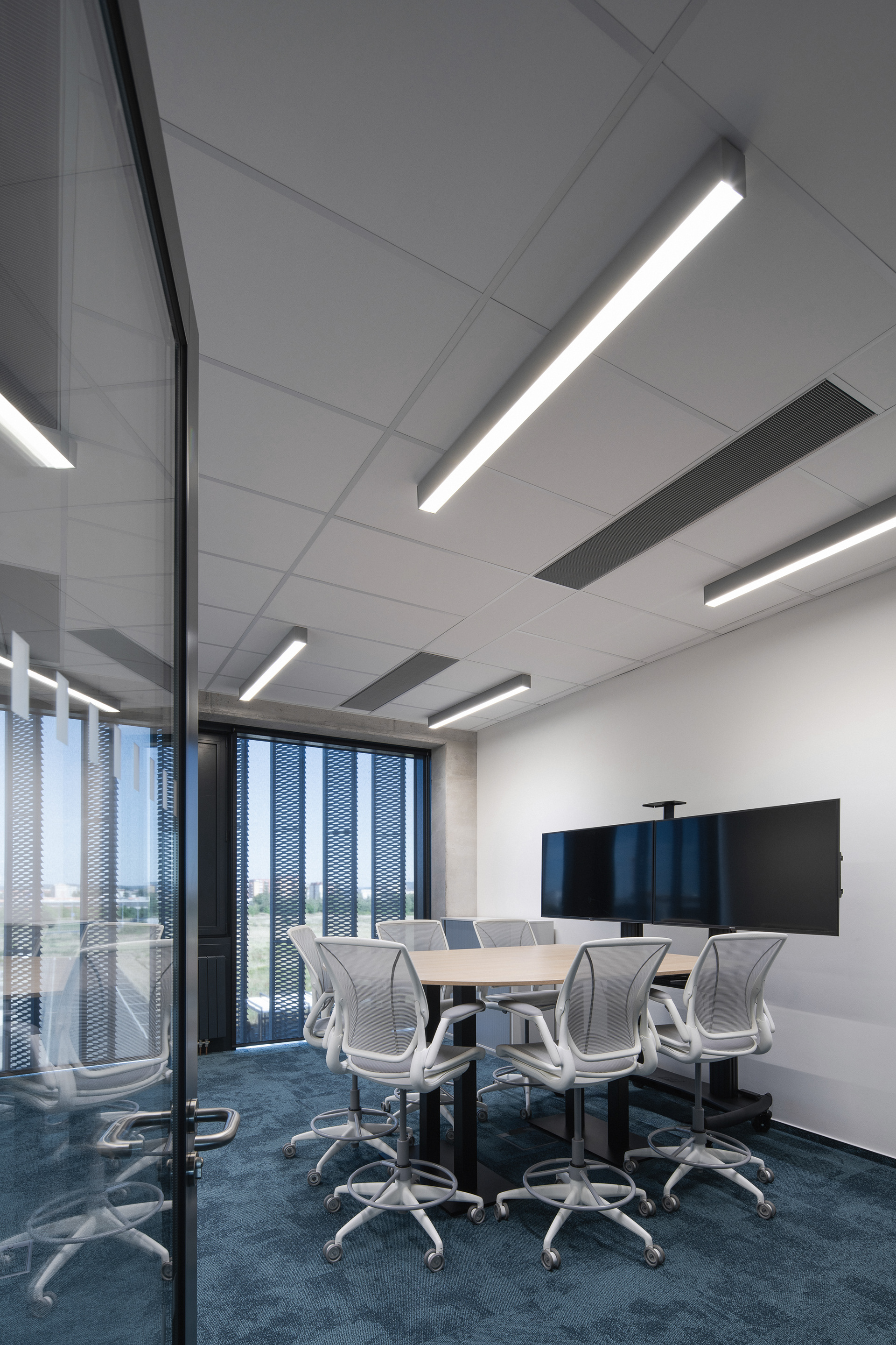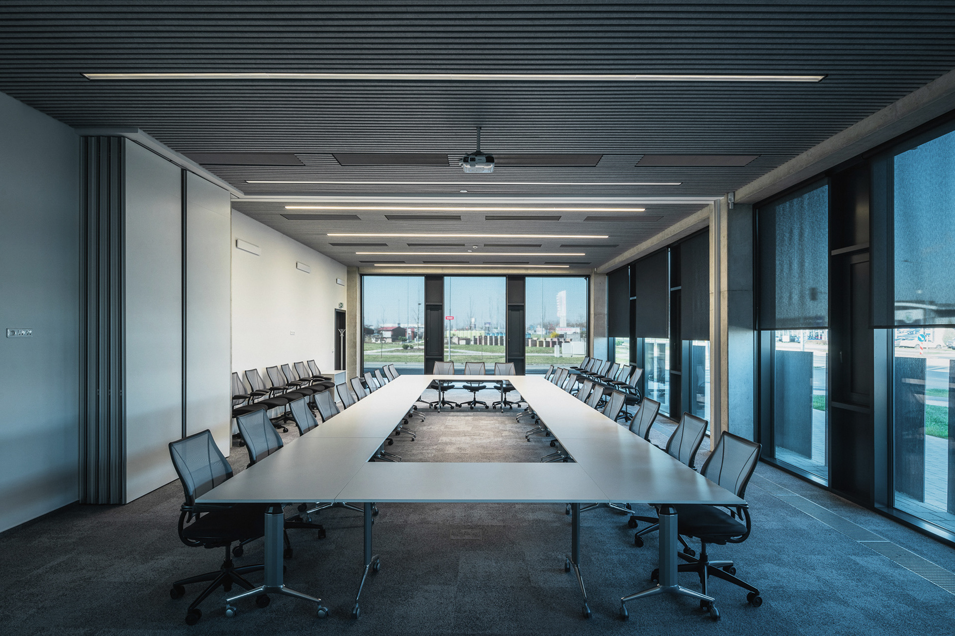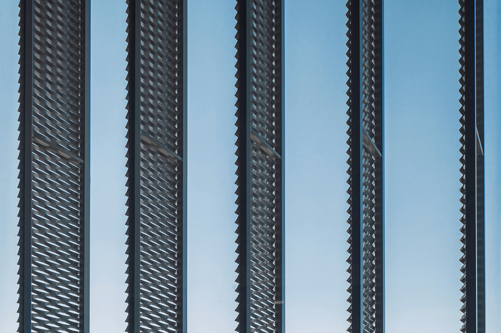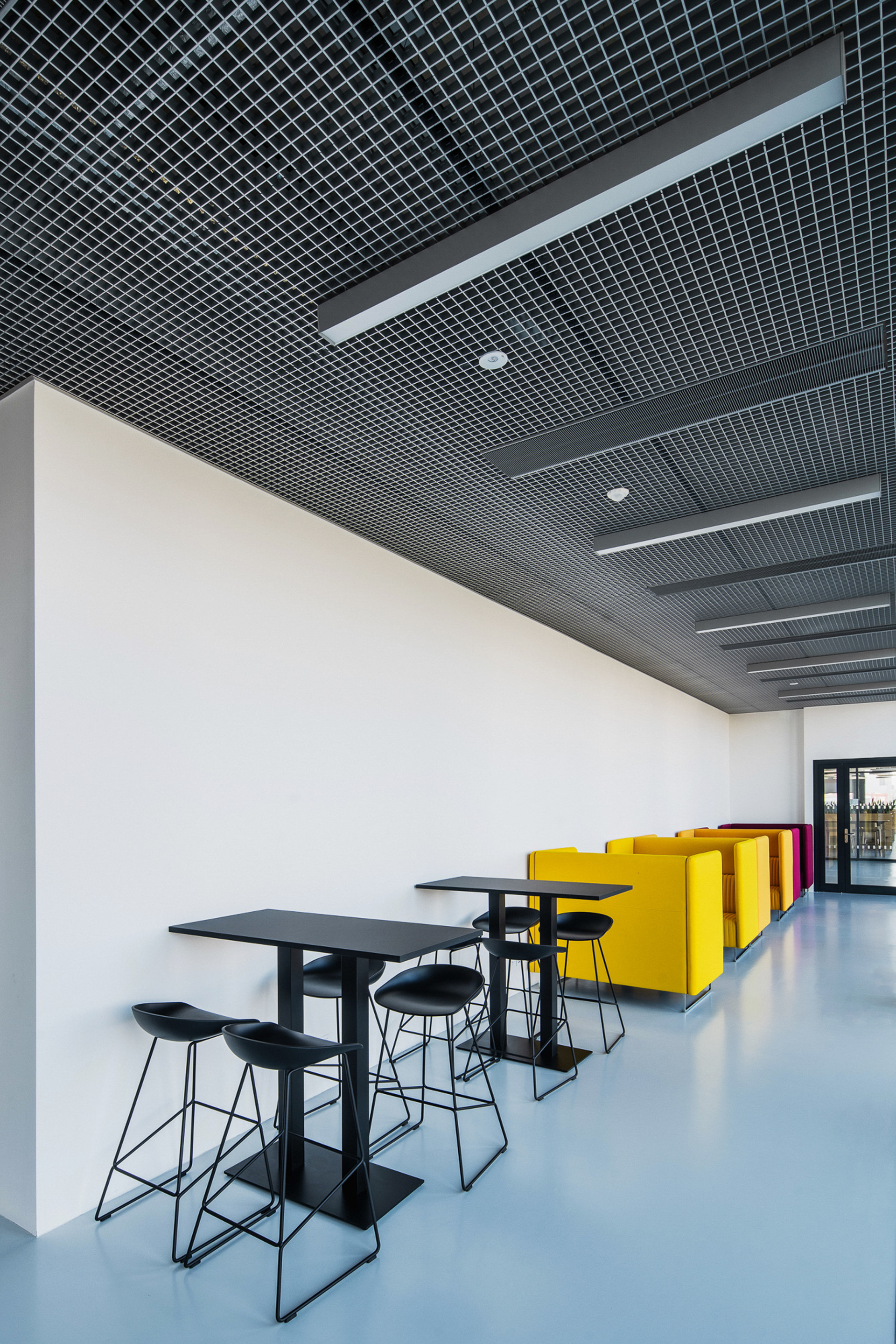 The Konplan office building is a new landmark in Pilsen, Borské Pole. The classic three-phase building with an inner core and workplaces around the perimeter has a unique facade. It consists of perforated slats that are turned towards the sun. The strict metal grid is interrupted by green islands. Giant flower pots have the potential for tall greenery. These green oases are also linked to the interior design. The relaxation zones on the individual floors are concentrated around them.