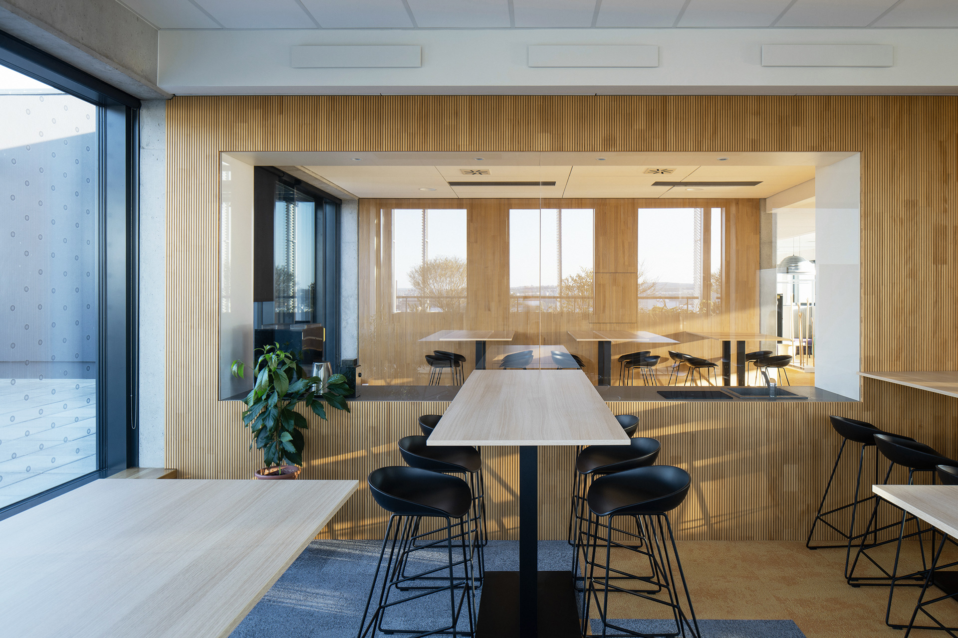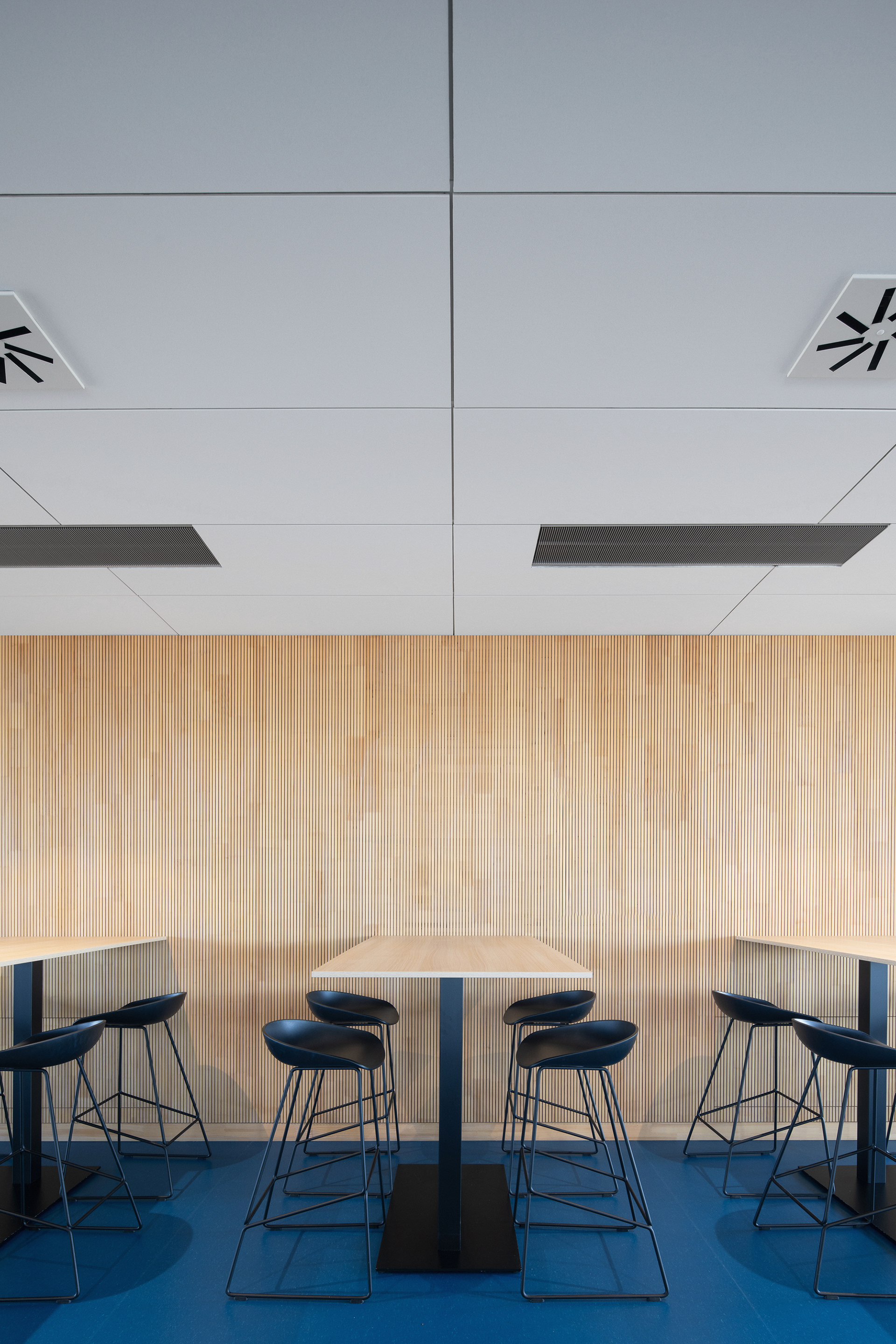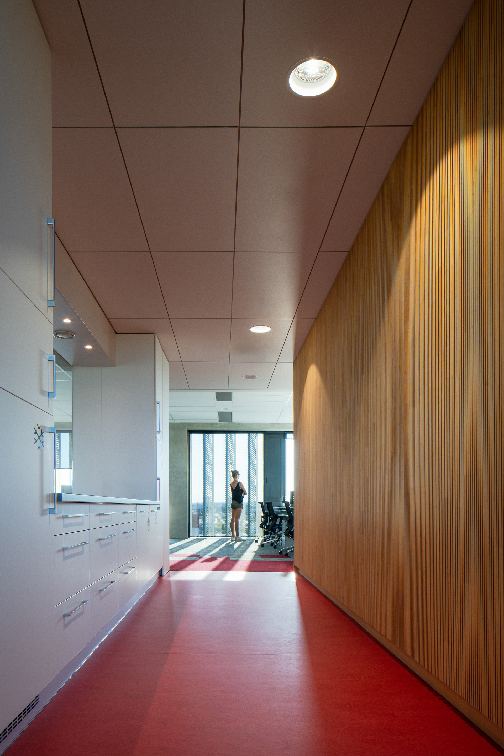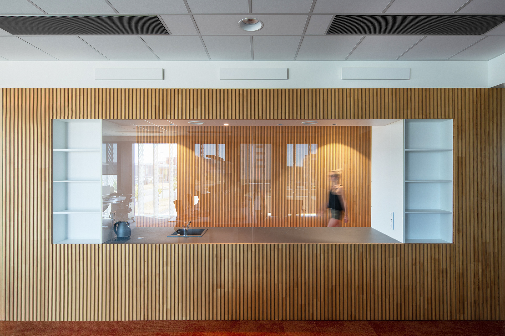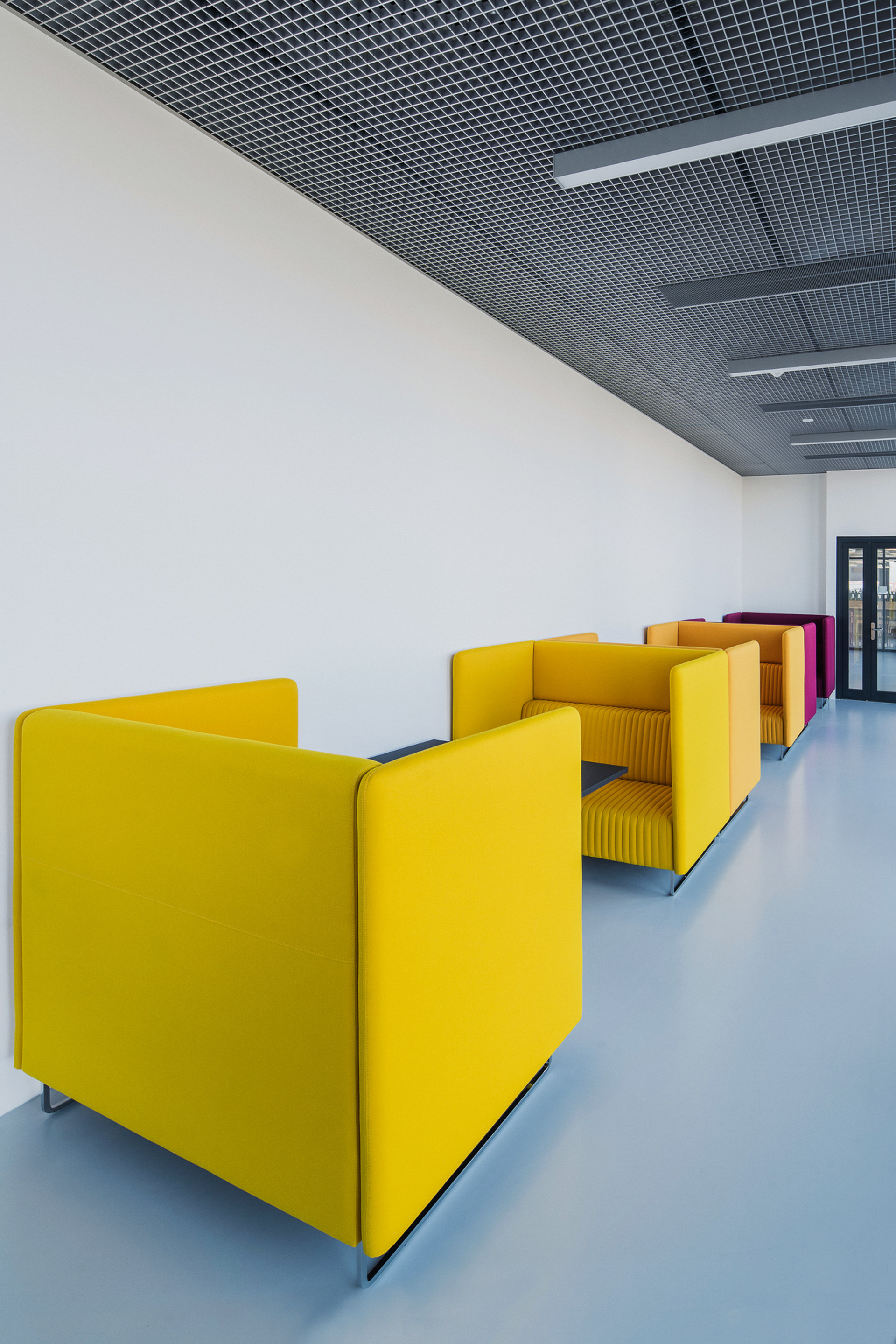 The Konplan office building is a new landmark in Pilsen, Borské Pole. The classic three-phase building with an inner core and workplaces around the perimeter has a unique facade. It consists of perforated slats that are turned towards the sun. The strict metal grid is interrupted by green islands. Giant flower pots have the potential for tall greenery. These green oases are also linked to the interior design. The relaxation zones on the individual floors are concentrated around them.