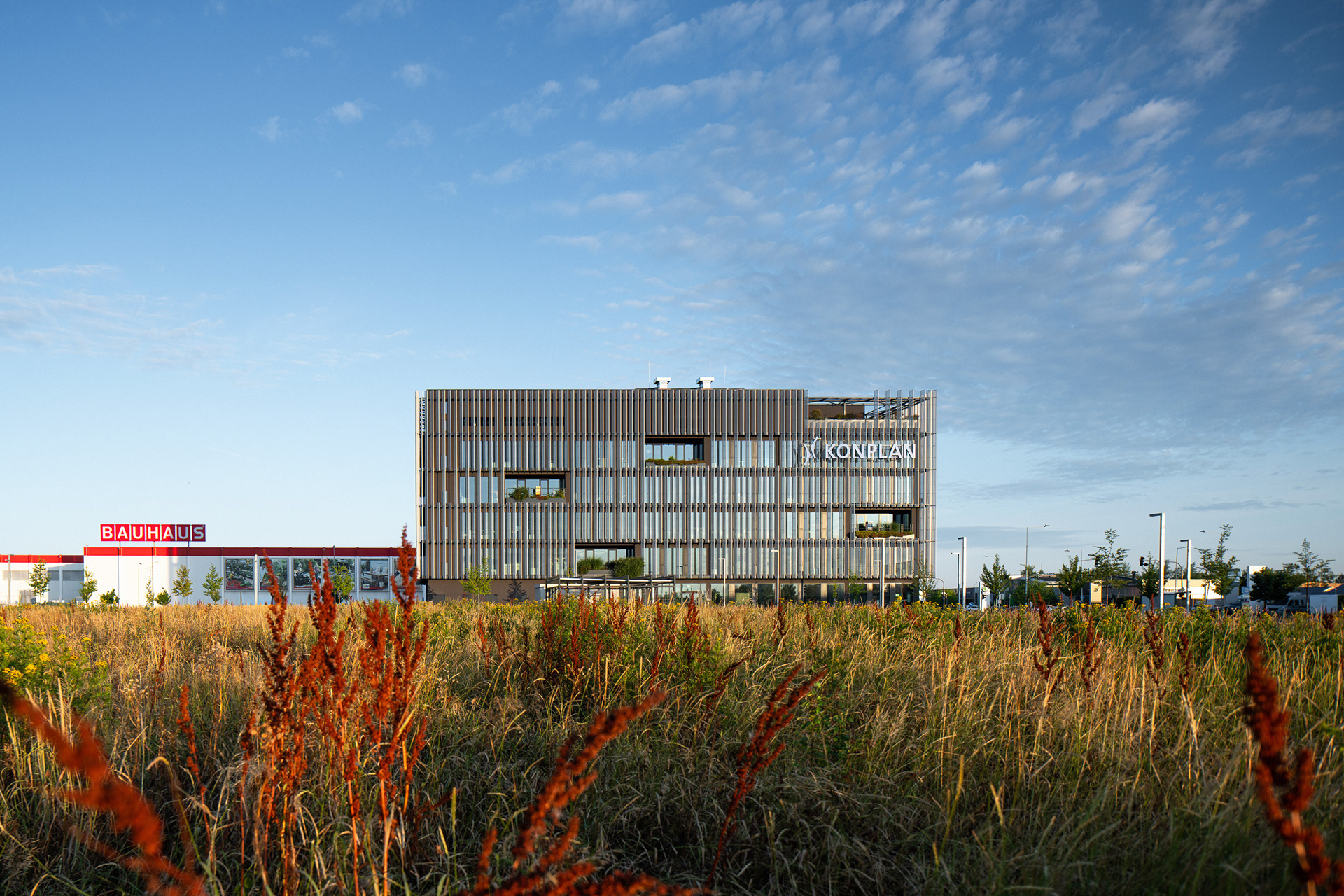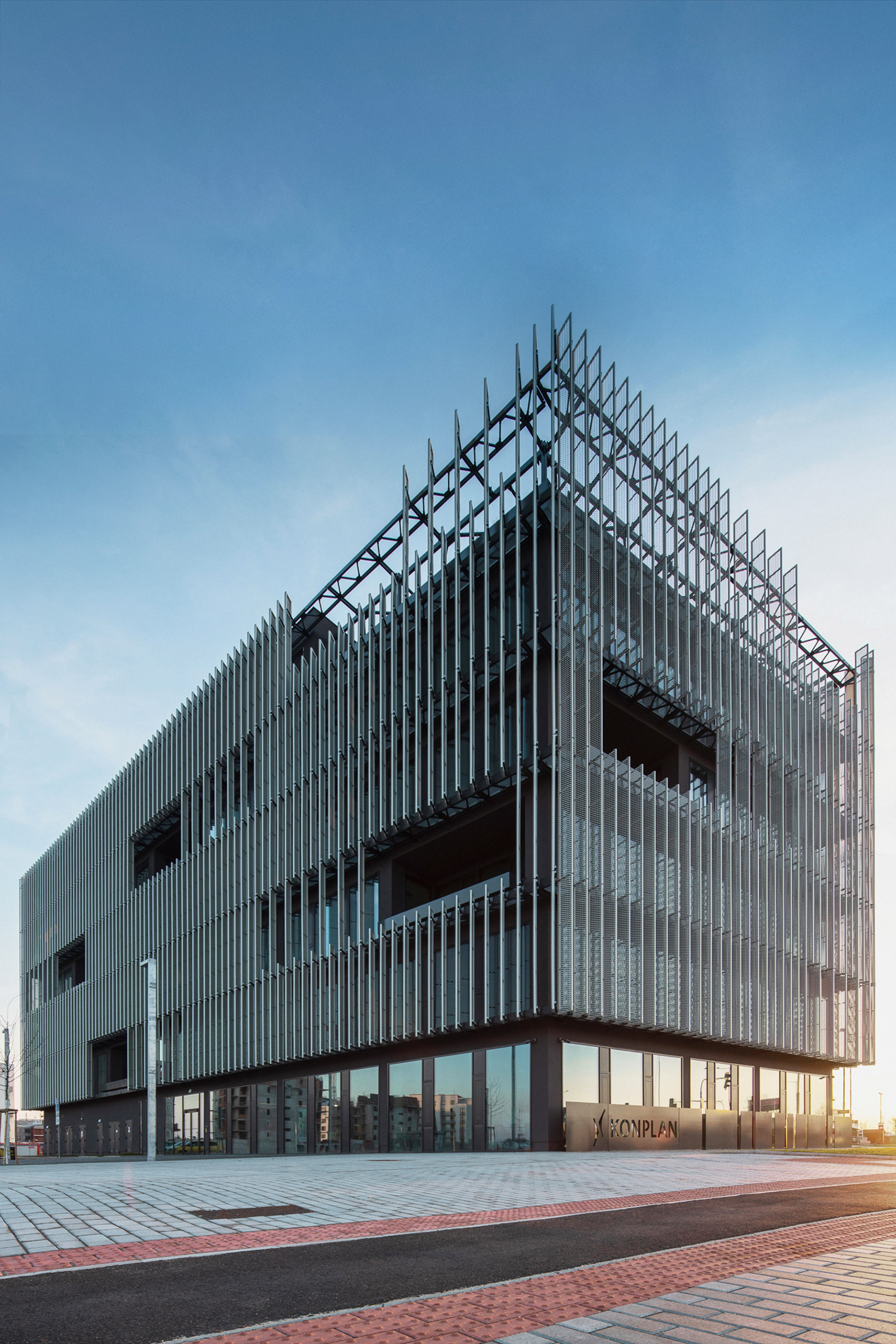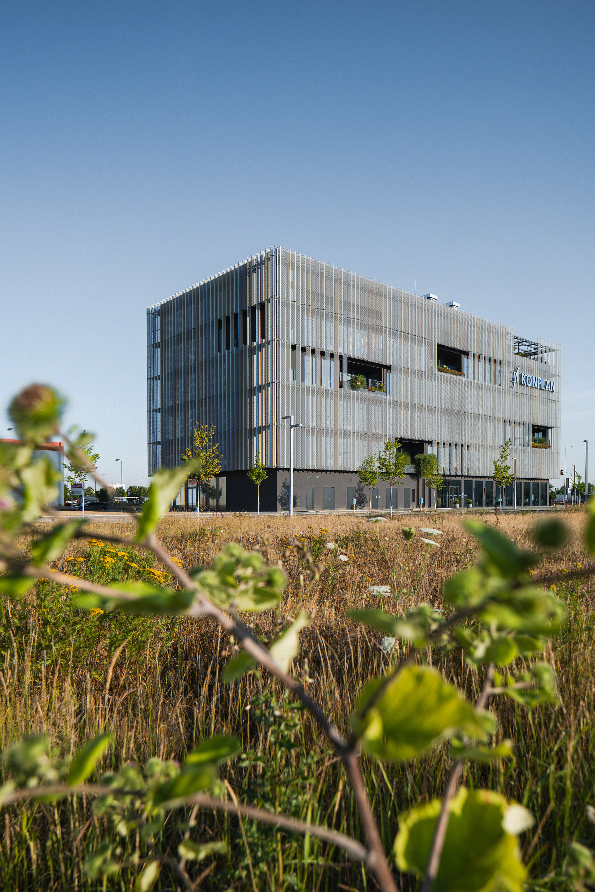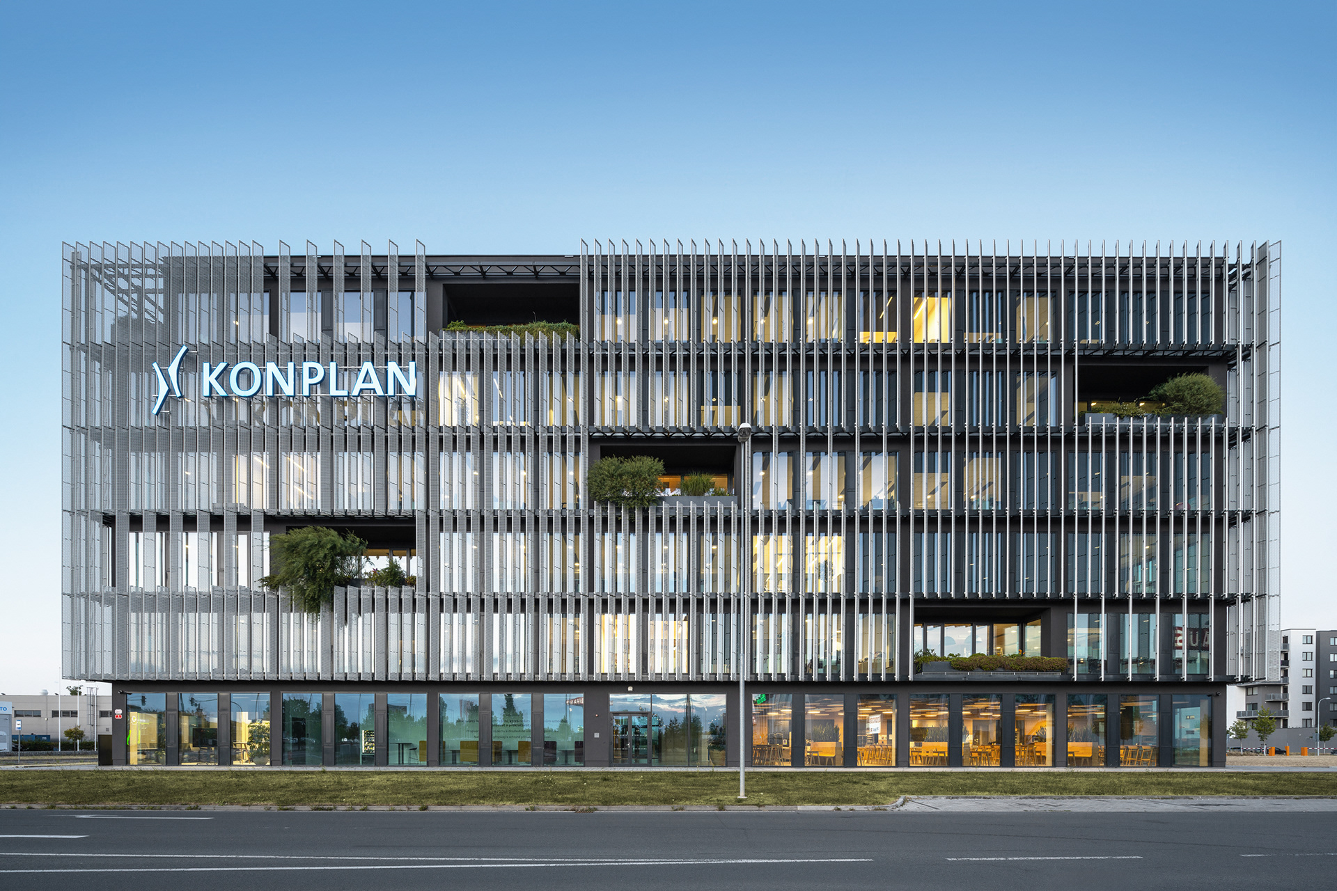Administrativní budova firmy Konplan je novou dominantou V Plzni na Borských polích. Klasický trojtakt s vnitřním jádrem a pracovišti po obvodě má unikátní fasádu. Jde o perforované lamely, které jsou natočené proti slunci. Přísný kovový rastr narušují zelené ostrovy. Obří květináče mají potenciál pro vysokou zeleň. Tyto zelené oázy mají také vazbu na řešení interiéru. Právě okolo nich se soustřeďují odpočinkové zóny na jednotlivých podlažích.
