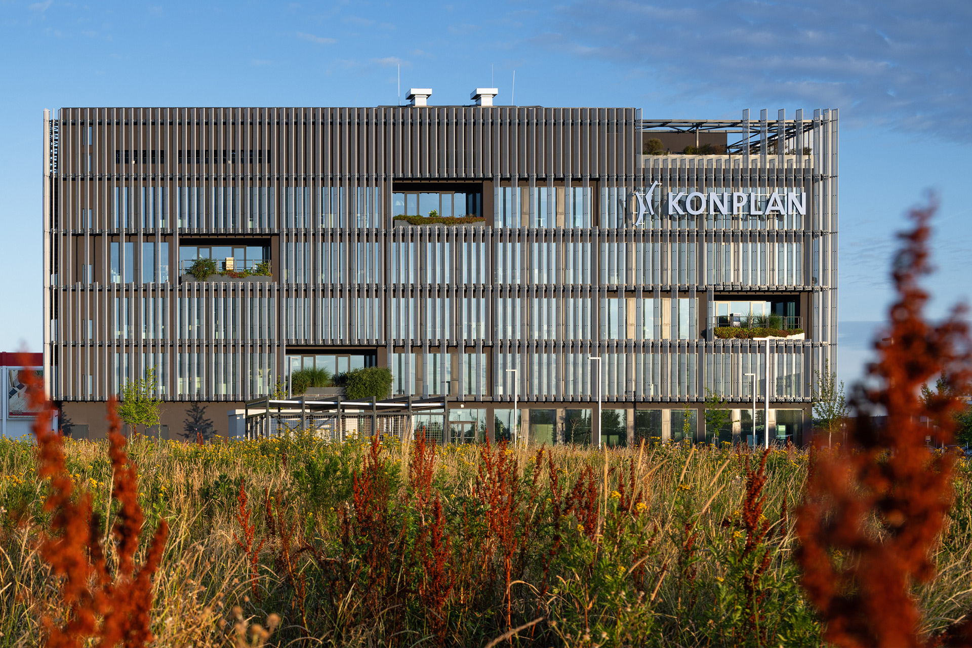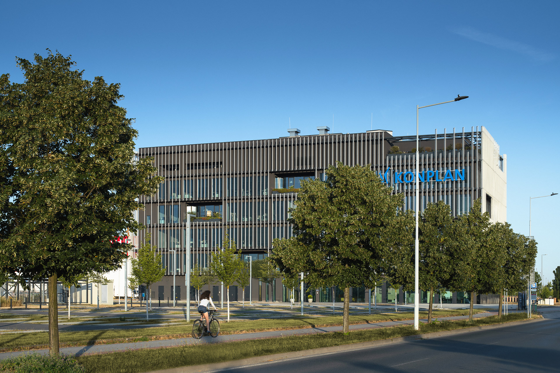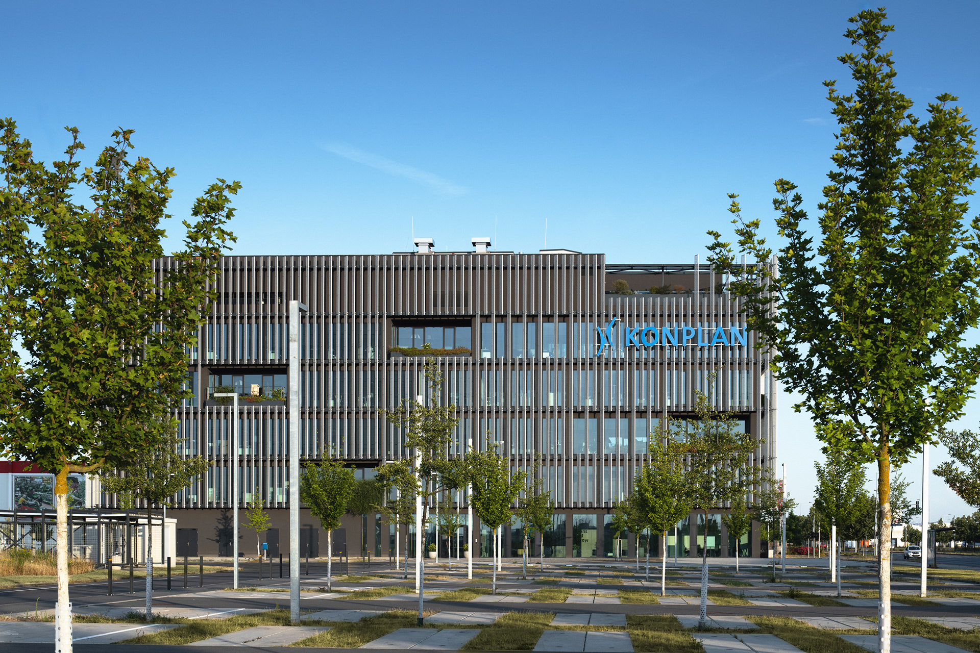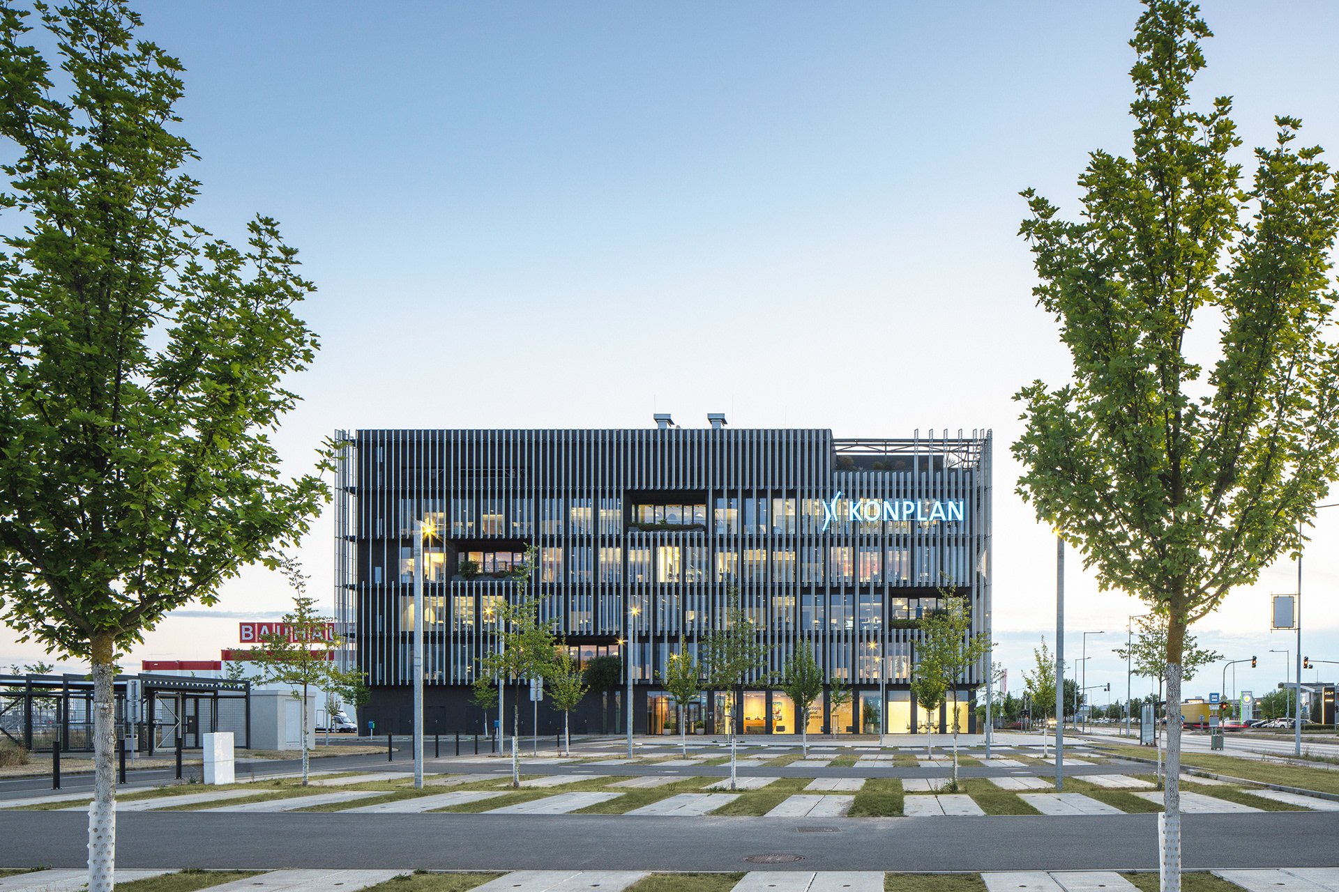 Administrativní budova firmy Konplan je novou dominantou V Plzni na Borských polích. Klasický trojtakt s vnitřním jádrem a pracovišti po obvodě má unikátní fasádu. Jde o perforované lamely, které jsou natočené proti slunci. Přísný kovový rastr narušují zelené ostrovy. Obří květináče mají potenciál pro vysokou zeleň. Tyto zelené oázy mají také vazbu na řešení interiéru. Právě okolo nich se soustřeďují odpočinkové zóny na jednotlivých podlažích.
