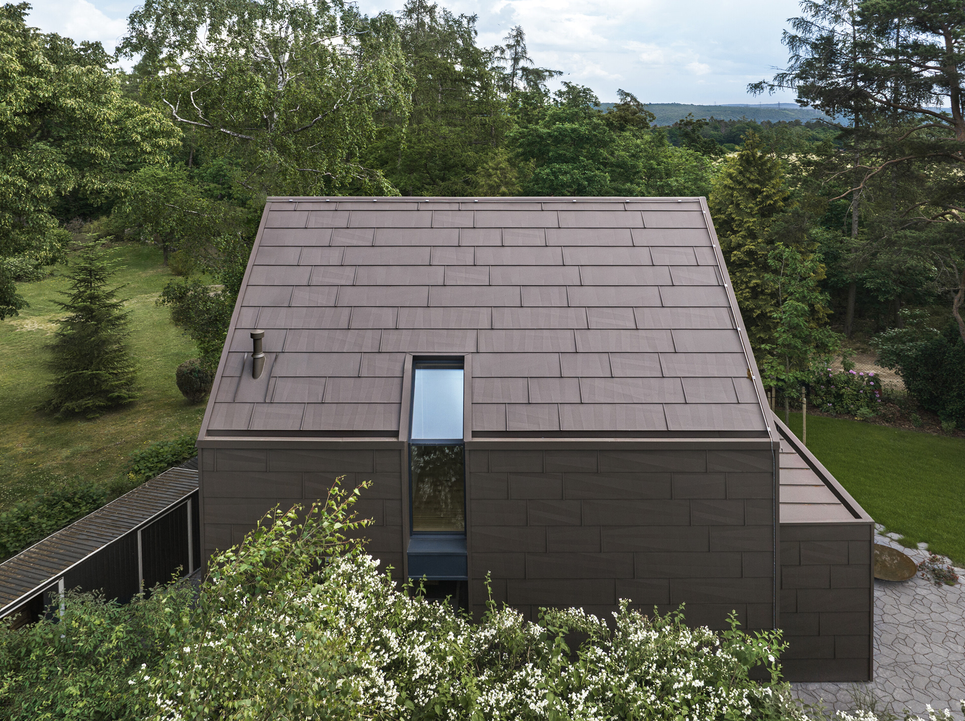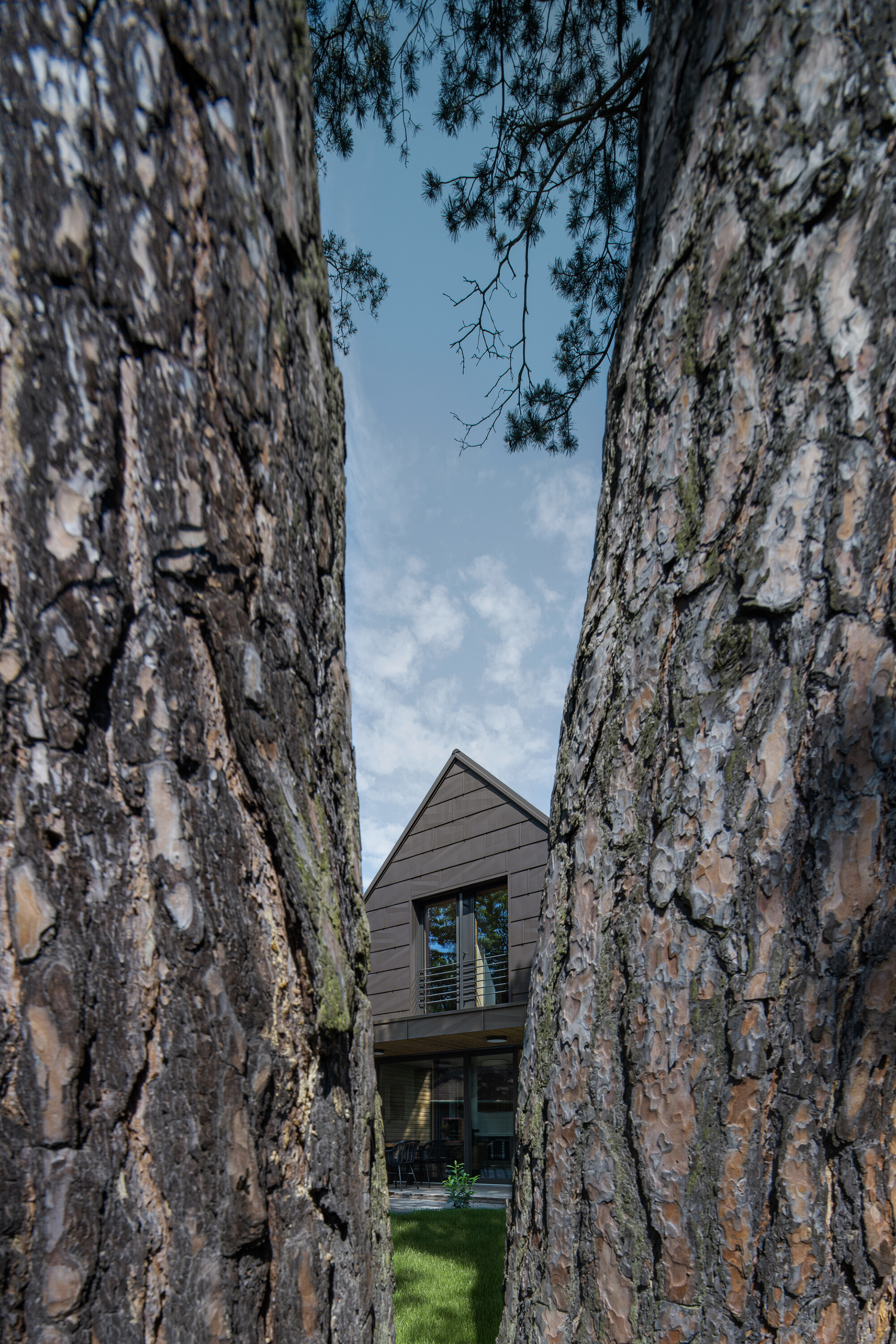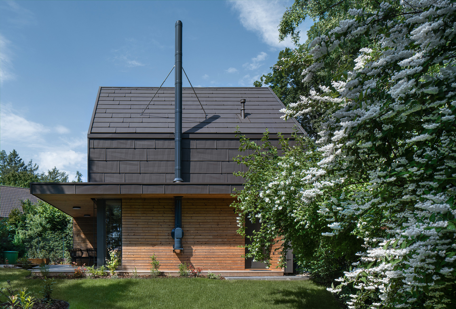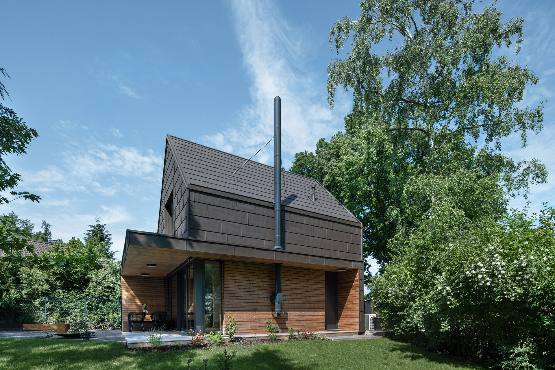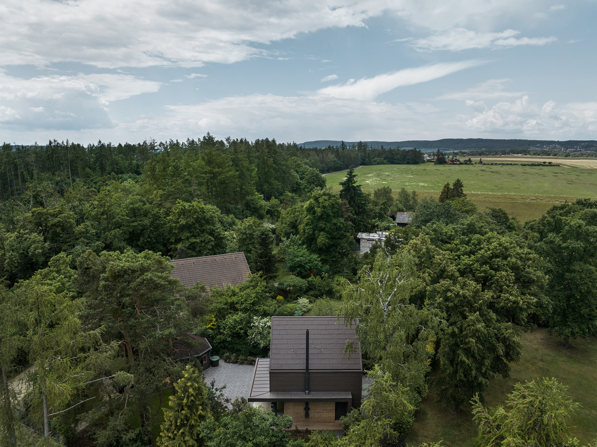 Moderní chata pro rodinnou rekreaci nabízí odpočinek a klid v lesích nedaleko Prahy. Hlavním tématem chaty je pohoda a odpočinek a tomu musely být bezpodmínečně podřízeny i provozní potřeby – prostory. Kuchyňskou linku jsme začlenili do obytné zóny tak, aby působila jako její přirozená součást. Proto jsme nad ni umístili knihovnu vrůstající do stropu a pro části skříněk zvolili sjednocující motiv dubového dřeva se stejnou profilací, jakou má stěna u krbu.