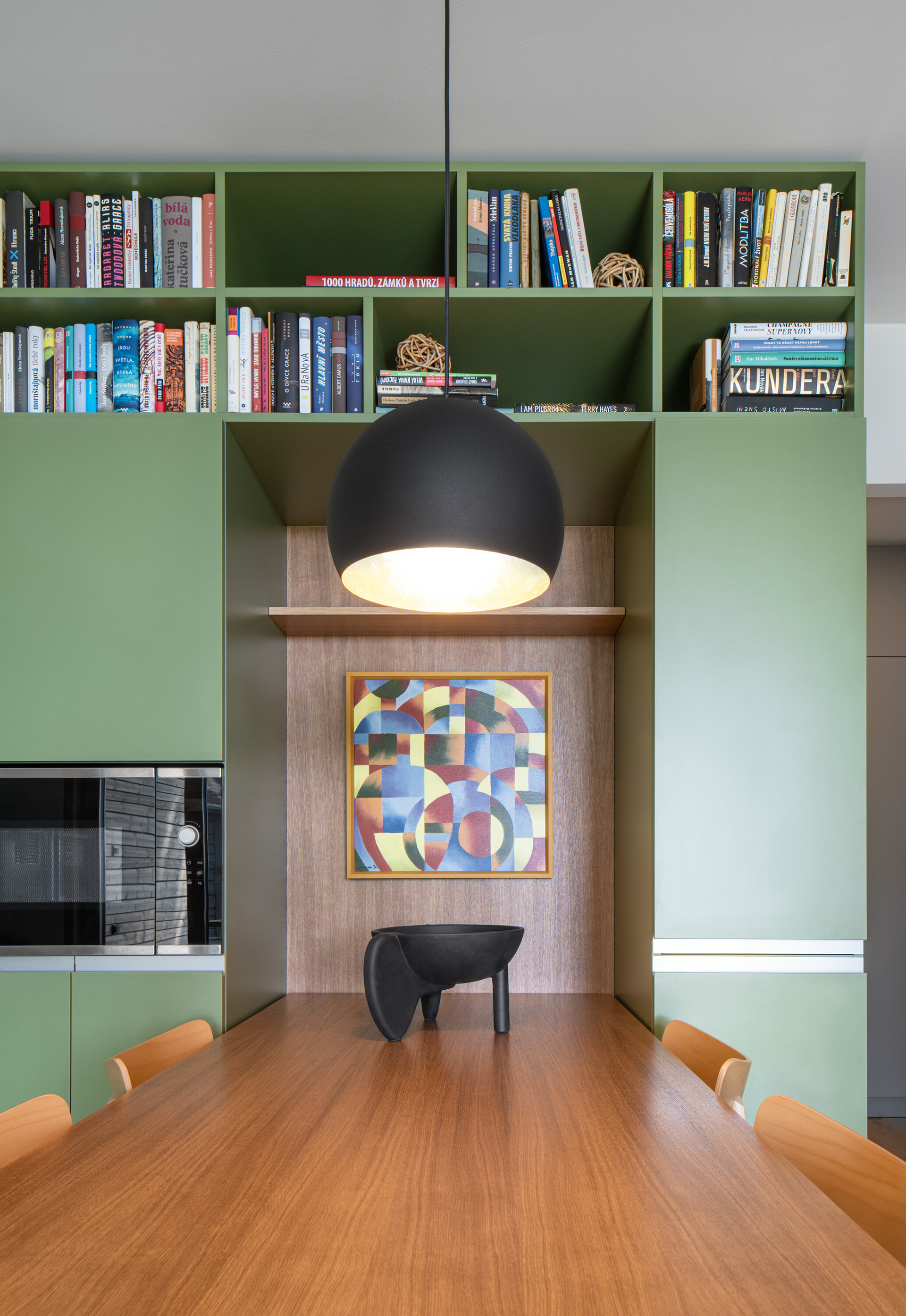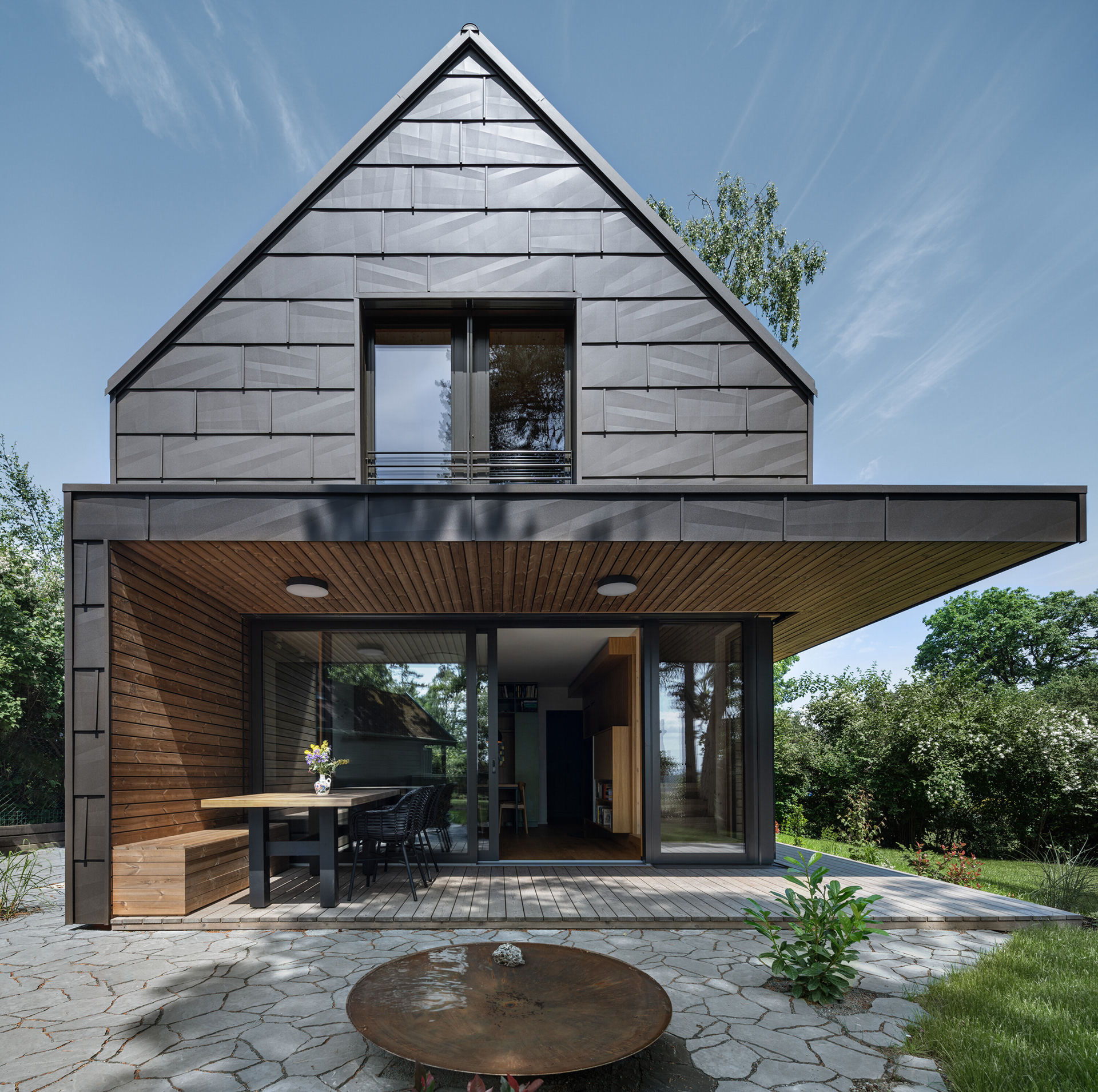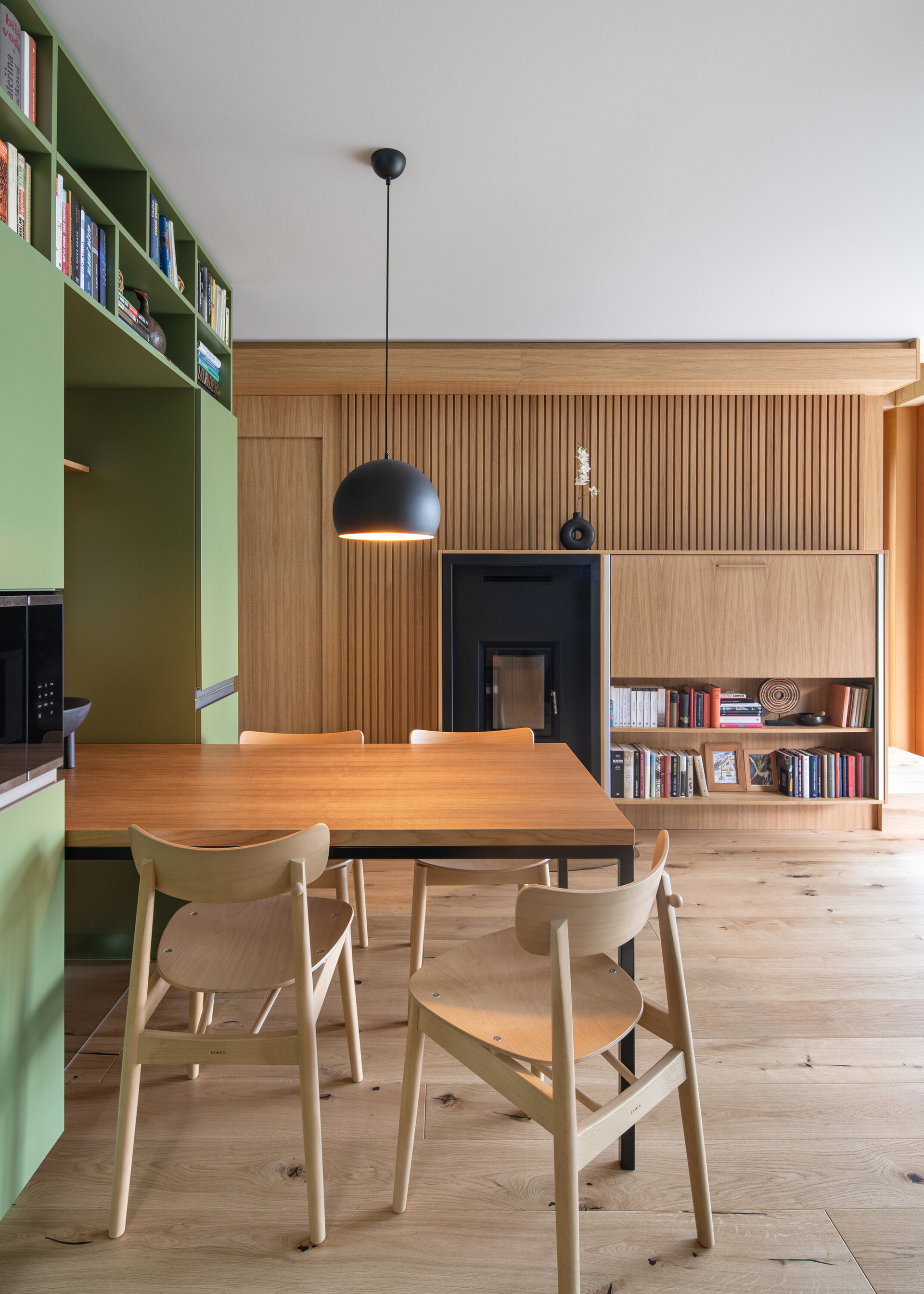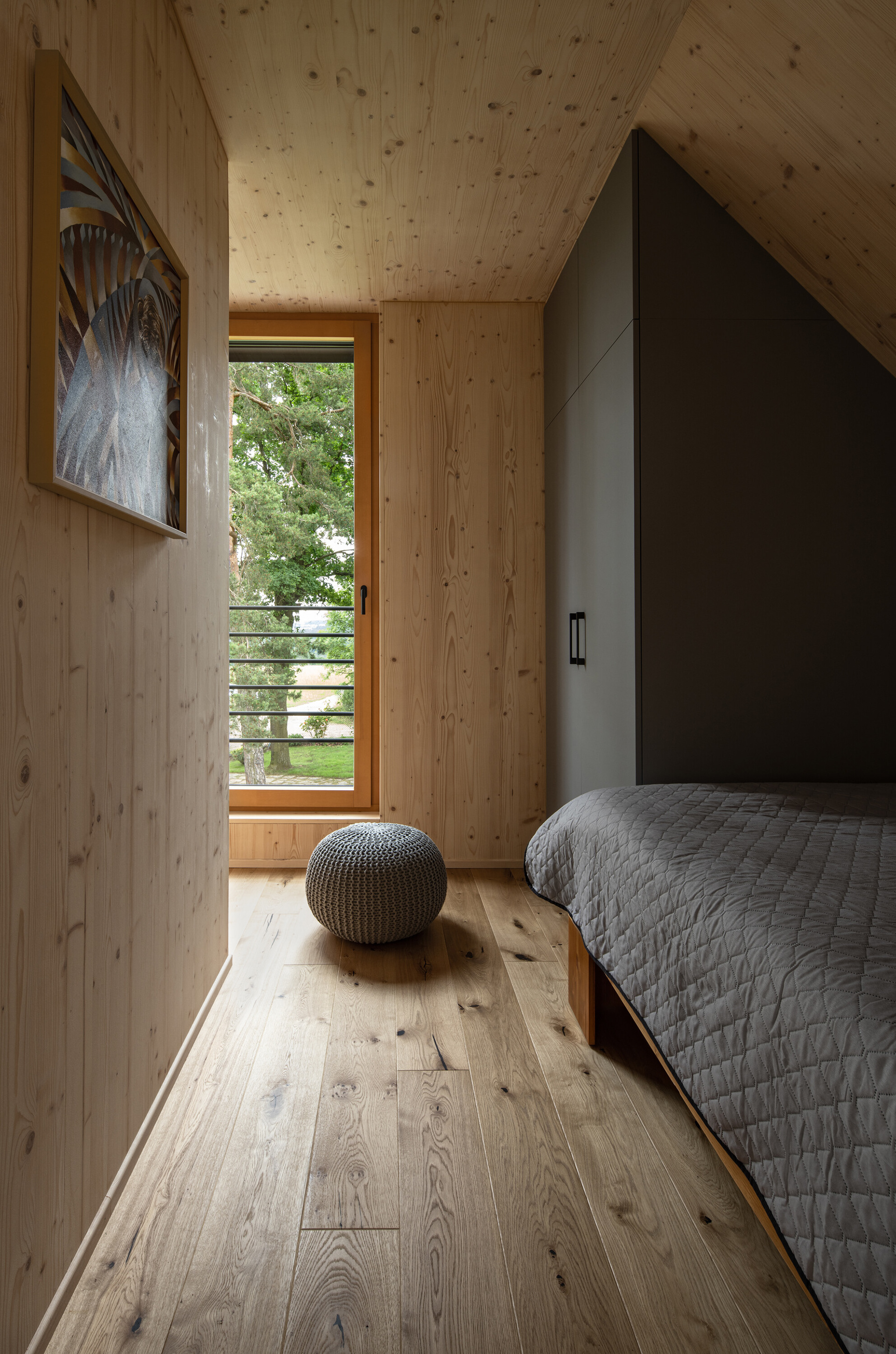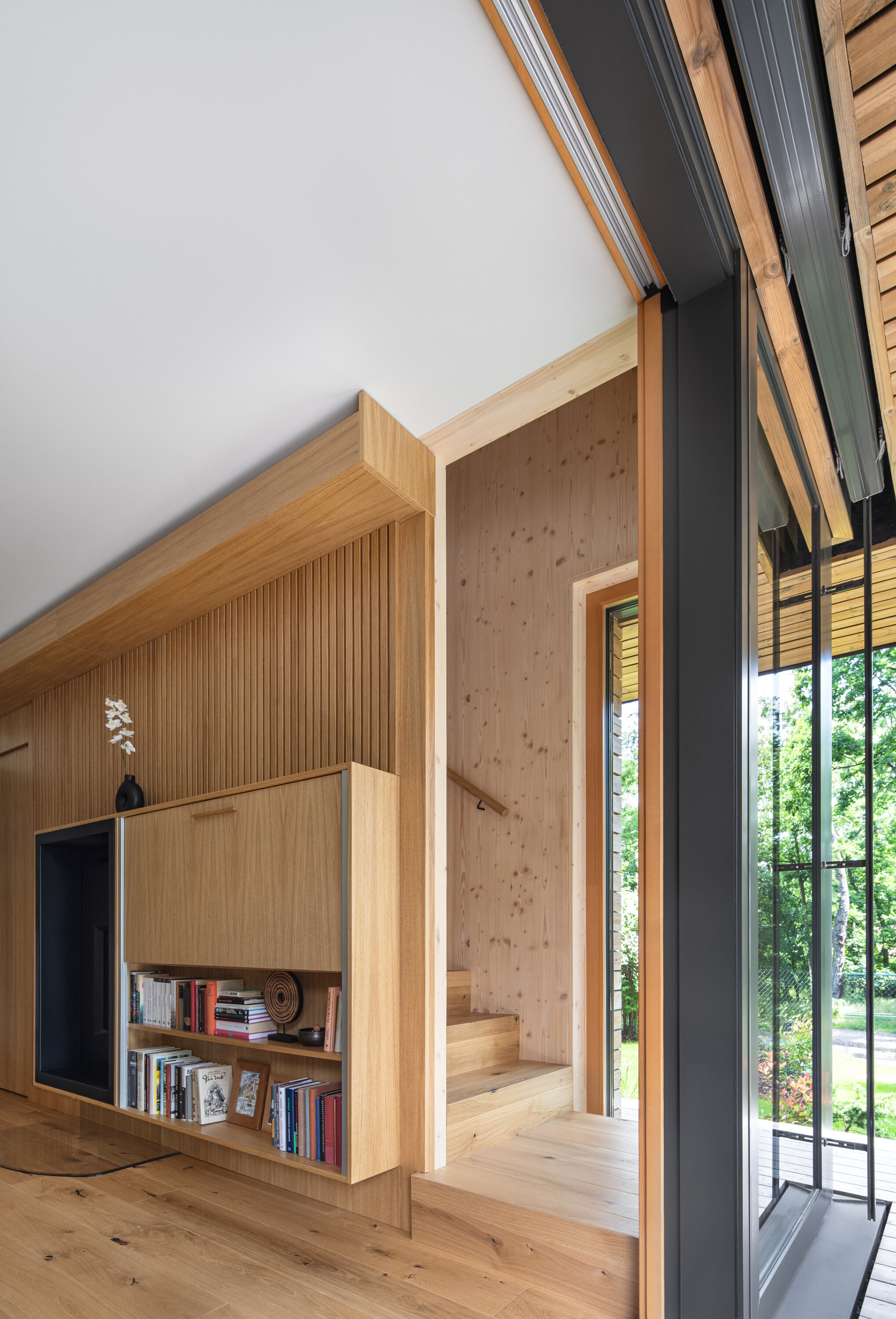 A modern cottage for family recreation offers relaxation and peace in the forests near Prague. The main theme of the cottage is comfort and relaxation, and the operational needs - spaces - had to be unconditionally subordinated to this. We integrated the kitchen unit into the living area so that it would act as a natural part of it. That is why we placed a bookcase above it that grows into the ceiling and for parts of the cabinets we chose a unifying motif of oak wood with the same profiling as the wall by the fireplace.