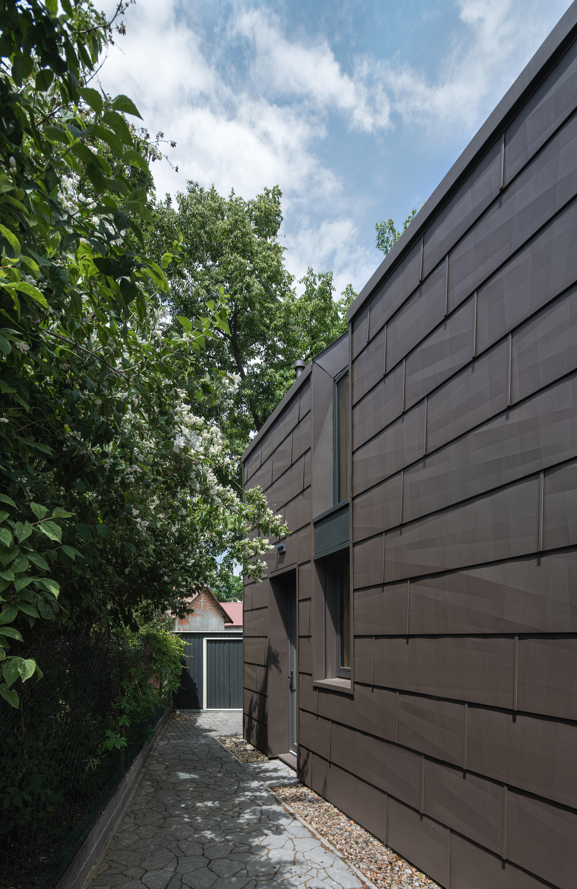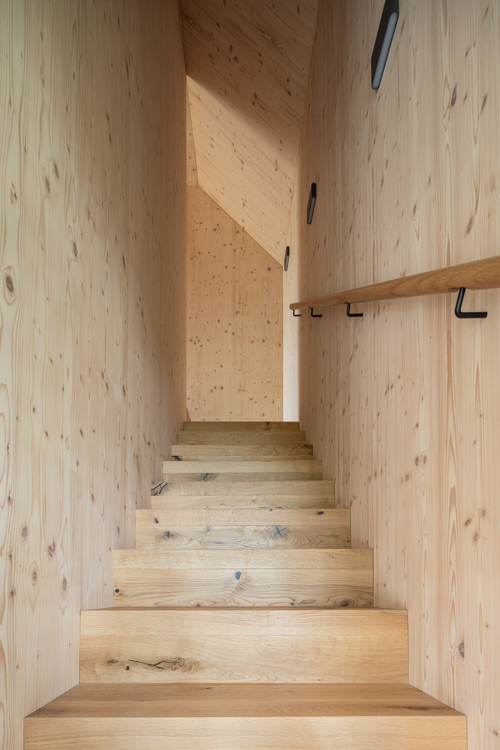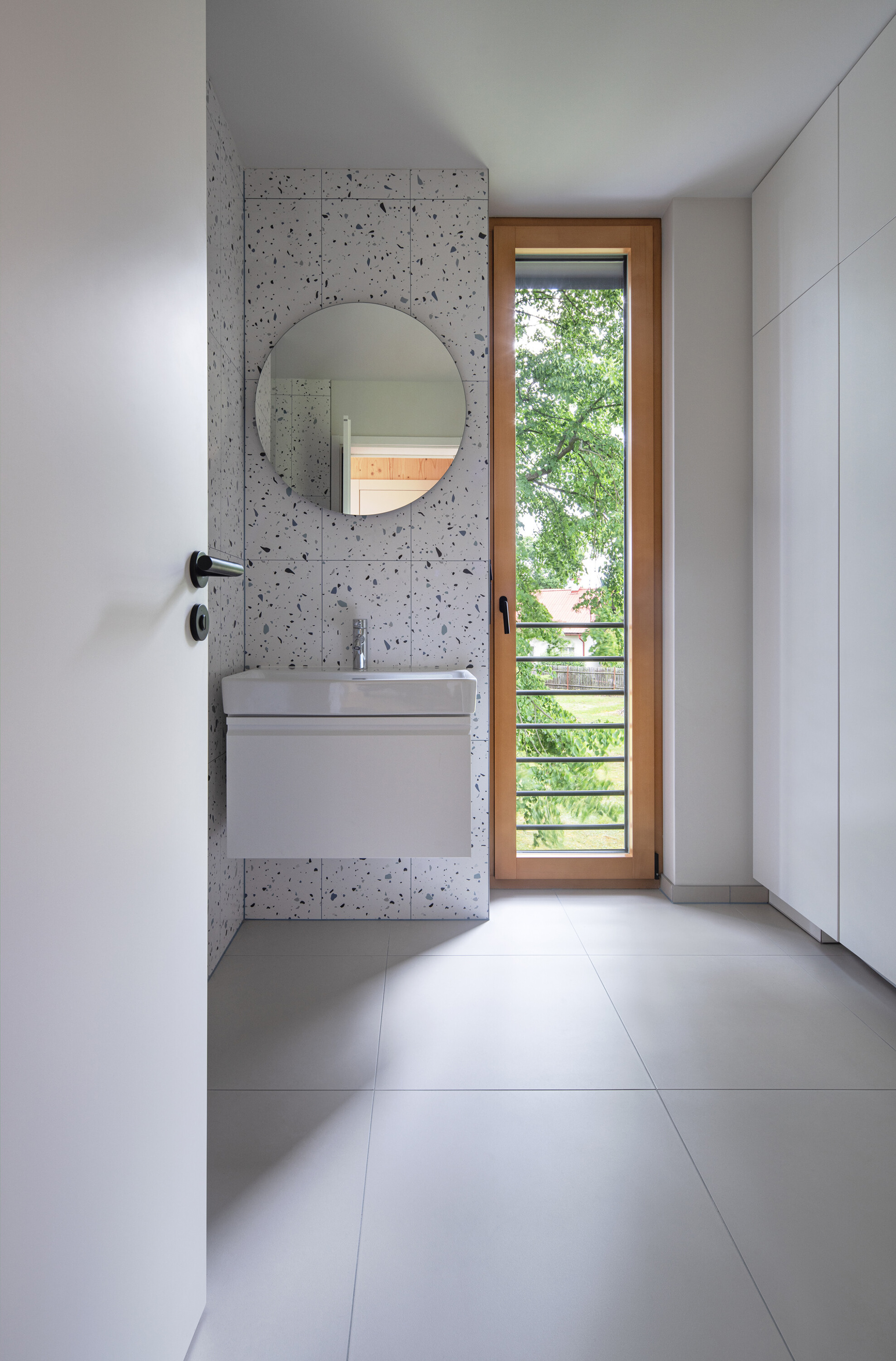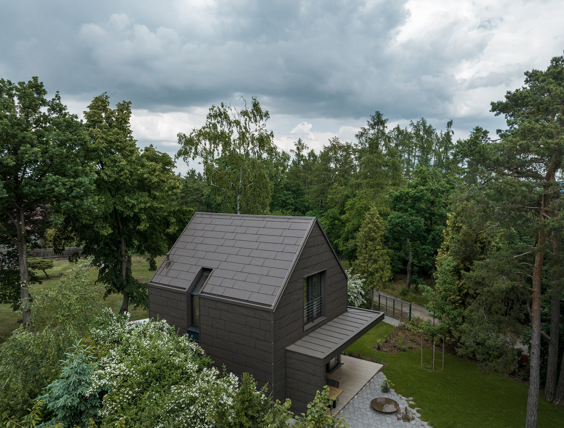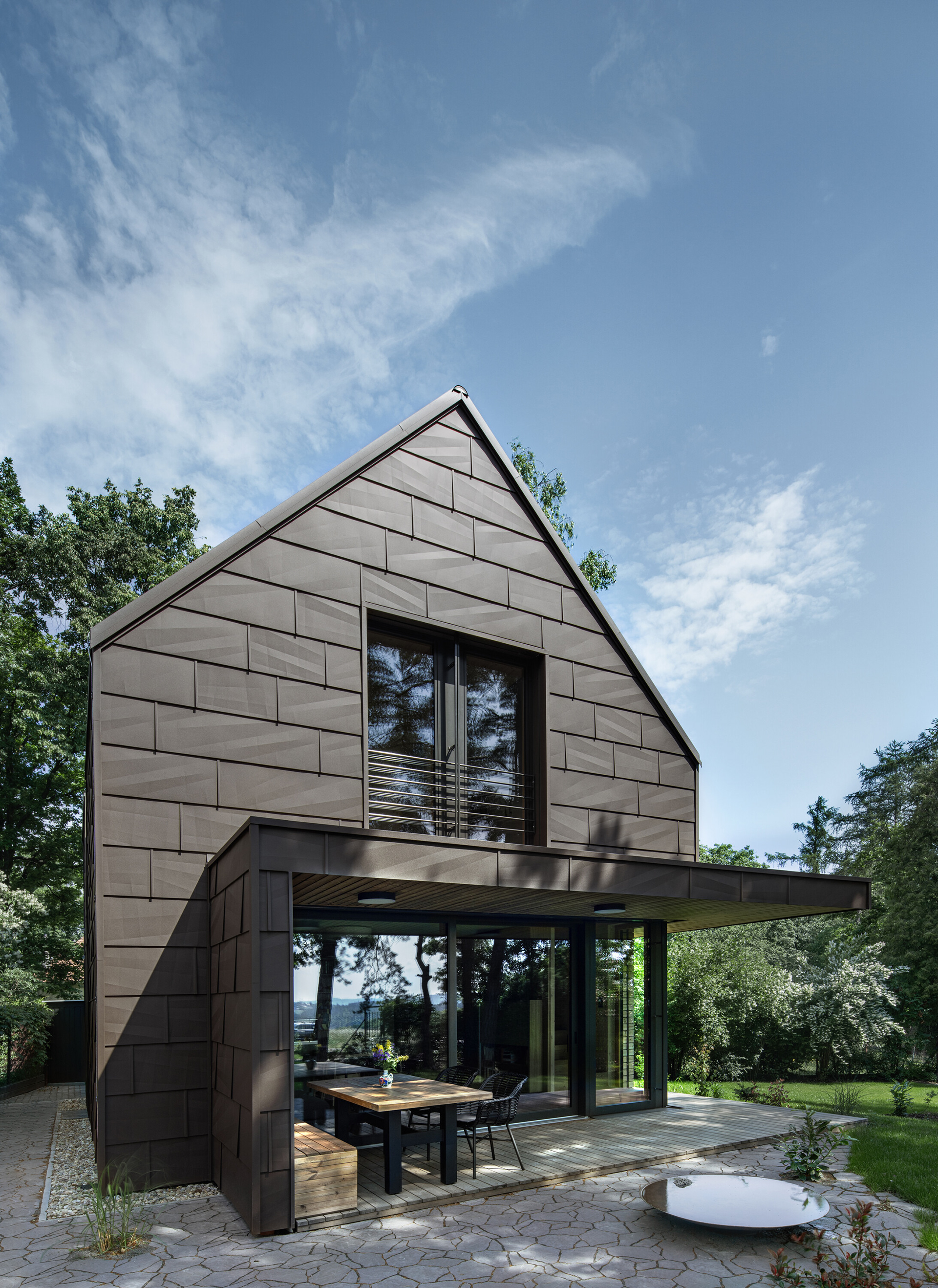 A modern cottage for family recreation offers relaxation and peace in the forests near Prague. The main theme of the cottage is comfort and relaxation, and the operational needs - spaces - had to be unconditionally subordinated to this. We integrated the kitchen unit into the living area so that it would act as a natural part of it. That is why we placed a bookcase above it that grows into the ceiling and for parts of the cabinets we chose a unifying motif of oak wood with the same profiling as the wall by the fireplace.