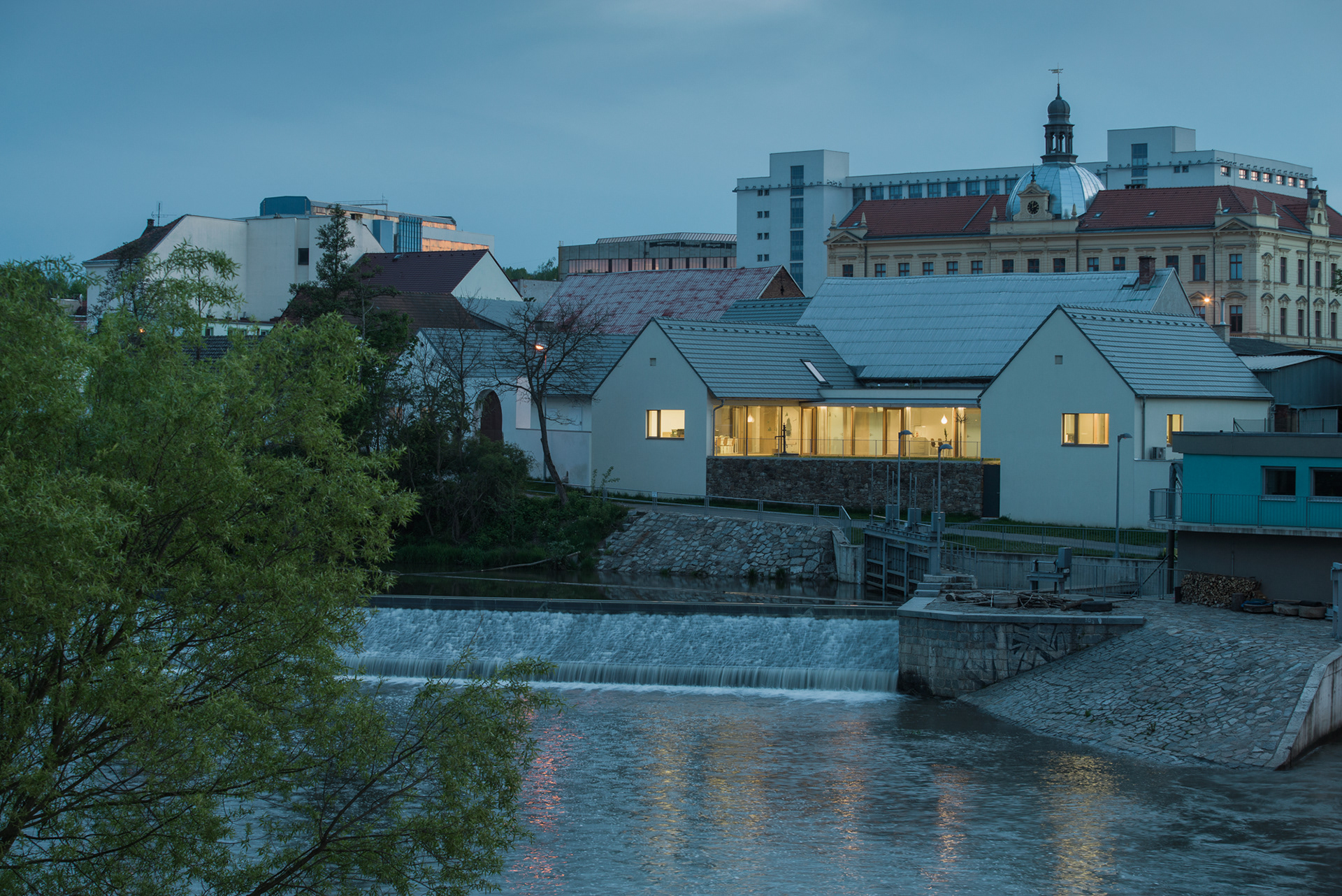 Naším cílem bylo postavit kanceláře se současným standardem a nepokazit atmosféru chalup u řeky. Dům je navržen tak, aby na sebe velikostí nestrhával pozornost, spíše jemně doplnil drobnou strukturu zástavby. Nové stavby částečně vycházejí ze stopy historického zastavění bývalého statku i s vjezdovou branou. Navrhli jsme dva jednoduché domy, otevřené širokým průhledem k řece. Původní chalupa a stodola byly opraveny. Areál má dva dvory. První je vstupní, dlážděný, parkuje se zde a je tady zámečnická dílna pro údržbu elektrárenských strojů. Druhý dvůr je vnitřní, obklopený kancelářským provozem. Je vyvýšen nad ulici o dva metry, je zatravněný, zůstala tu původní studna s pumpou a nově byla vysazena meruňka. Kanceláře jsou otevřeny do prostoru krovu, je možné je předělit posuvnými dveřmi. V interiéru jsou přiznané materiály, betonový strop, dřevěný krov, doplňuje je firemní pastelově modrá barva.
