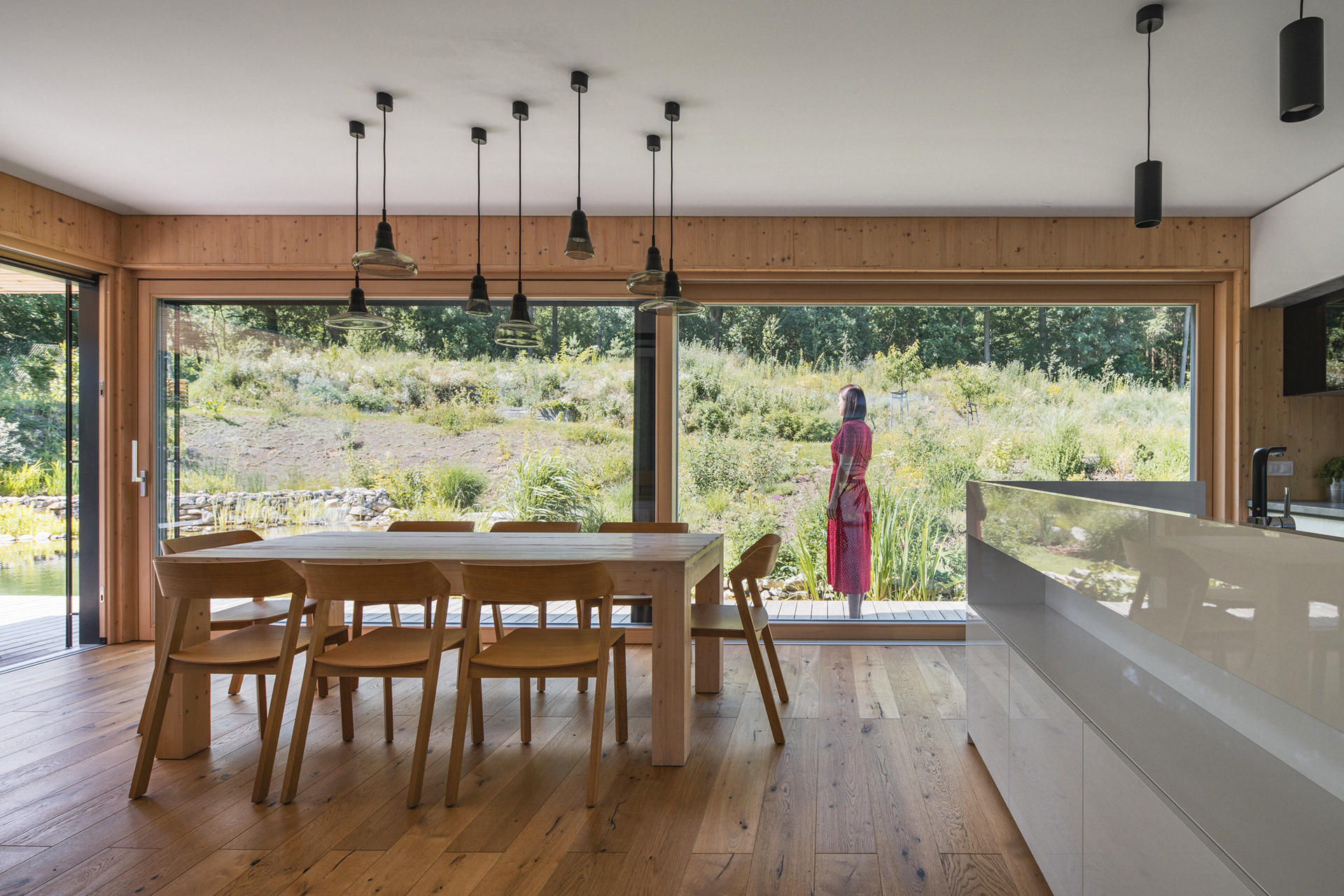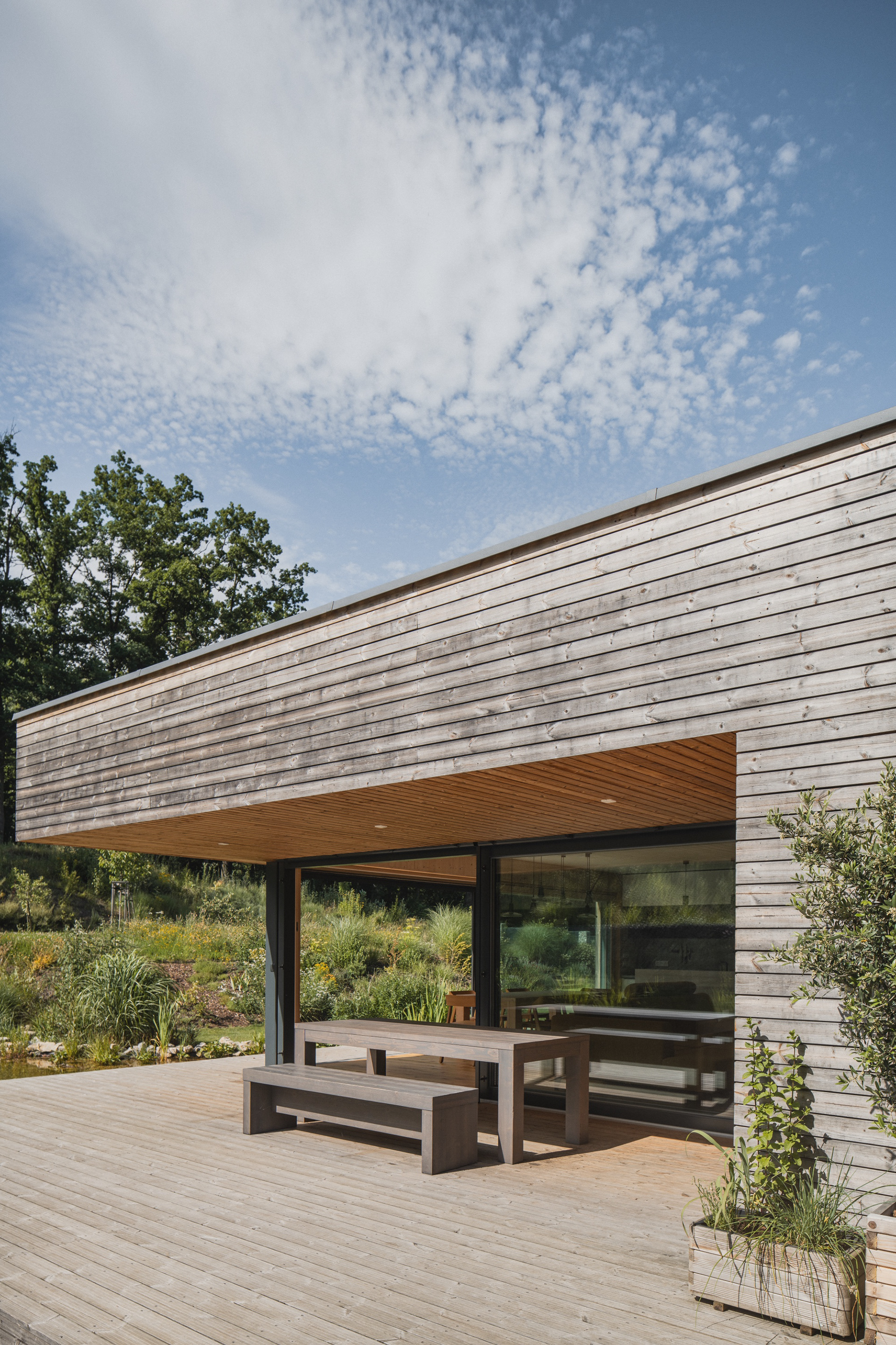 A family home on the edge of a small village near Prague was designed as a thoughtful response to a landscape that was yet to change. At the time of design, the plot was surrounded by wildflower meadows with open views. Nevertheless, the architect chose to orient the house toward the garden—deliberately turning away from a landscape that would eventually become developed. By turning toward the forest and the quieter part of the plot, he anticipated the evolution of the area and created a house that protects its own world.