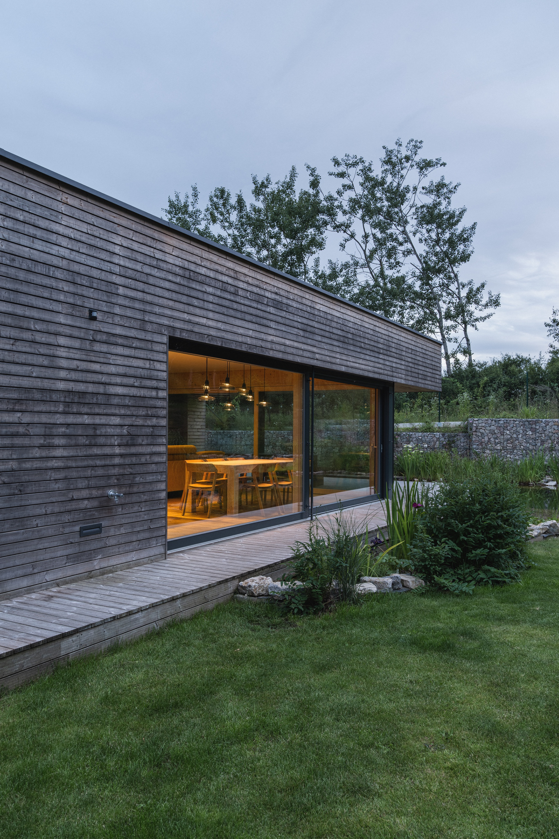 Rodinný dům na okraji malé obce nedaleko Prahy vznikl jako promyšlená reakce na krajinu, která se měla teprve začít proměňovat. V době návrhu obklopovala pozemek květinová louka s volnými výhledy. Architekt se přesto rozhodl orientovat dům směrem do zahrady – vědomě se odvrátil od krajiny, která se měla proměnit v zástavbu. Otočením k lesu a klidné části parcely tak předběhl vývoj místa a vytvořil dům, který si chrání vlastní svět.