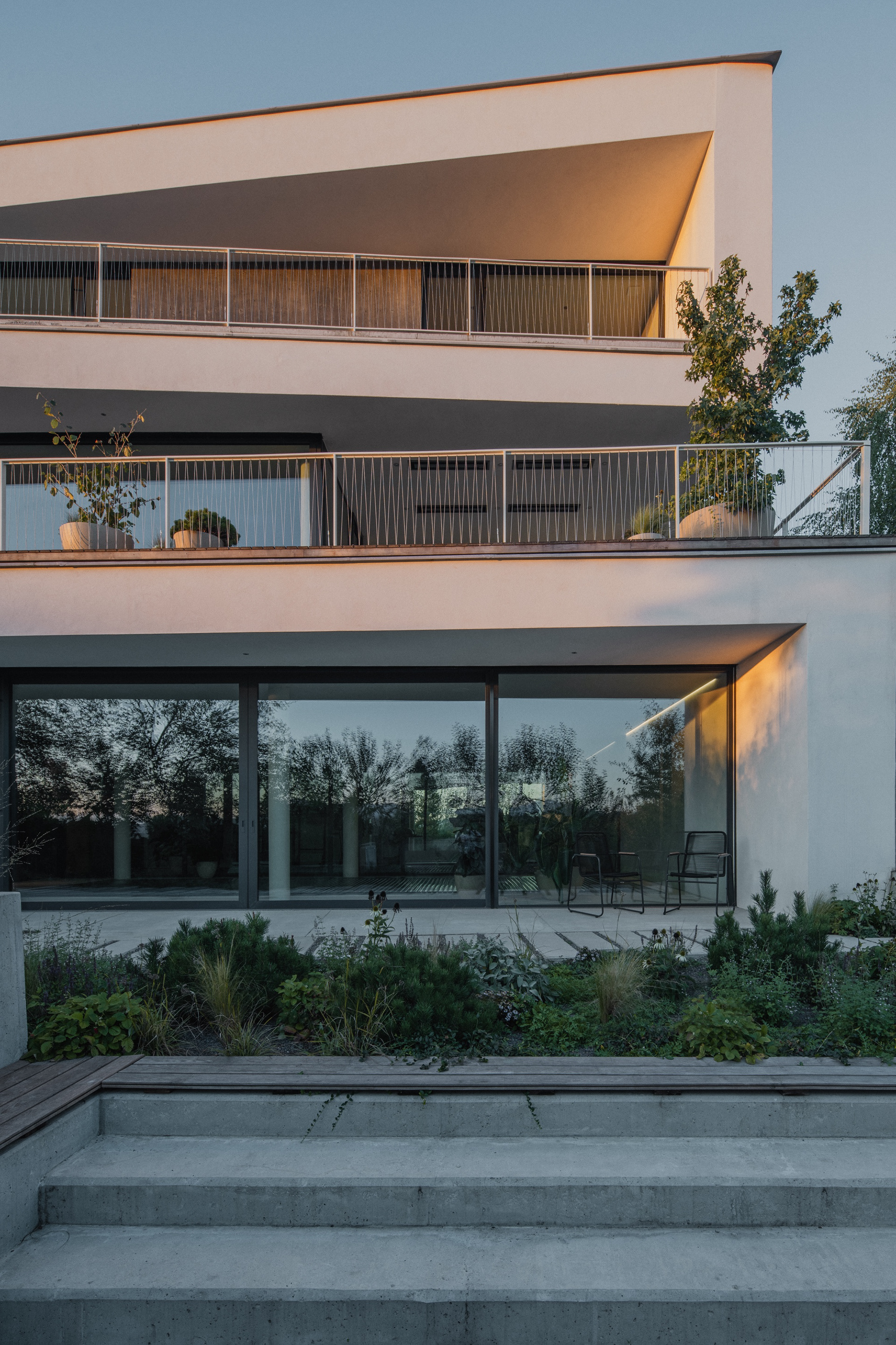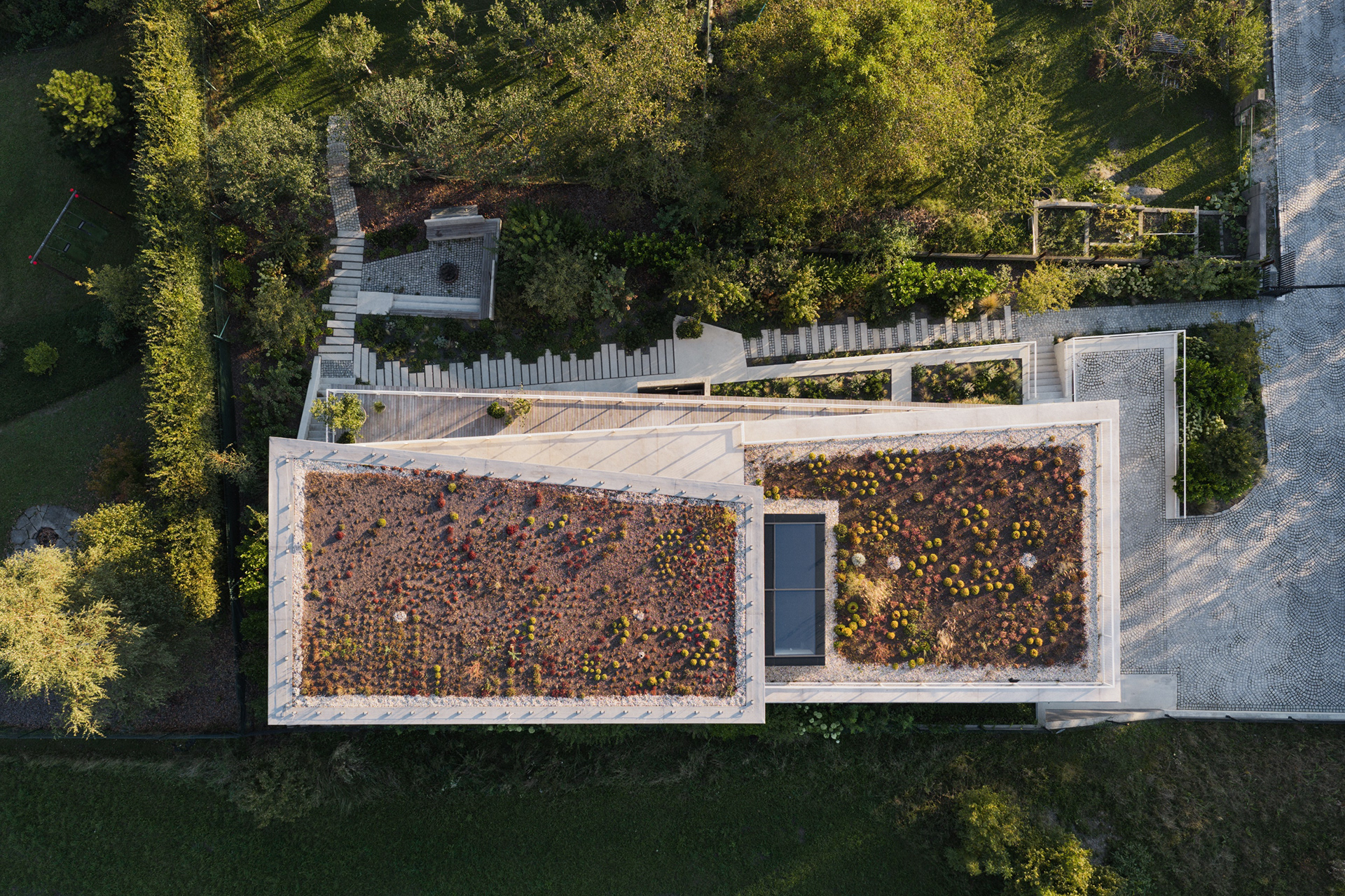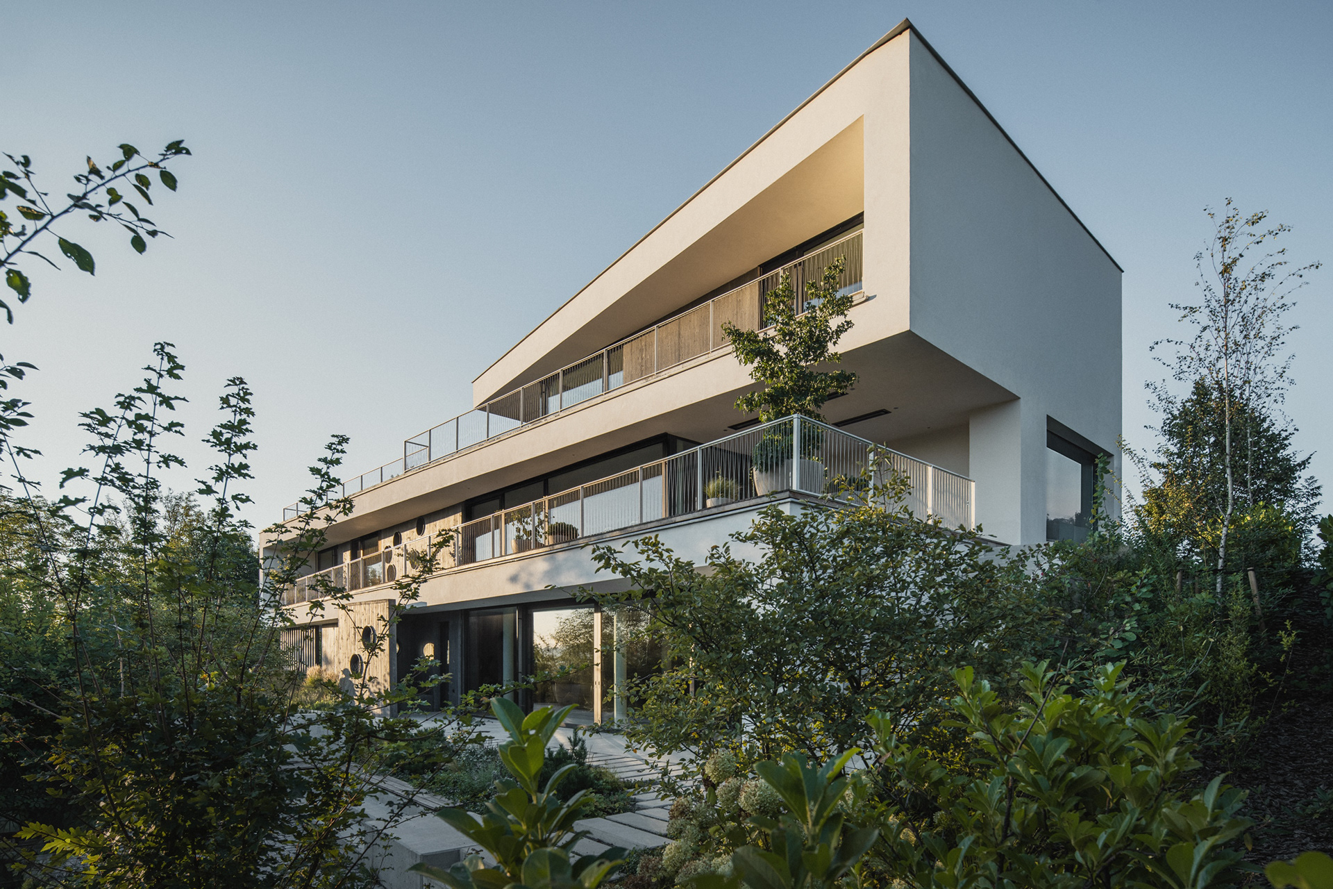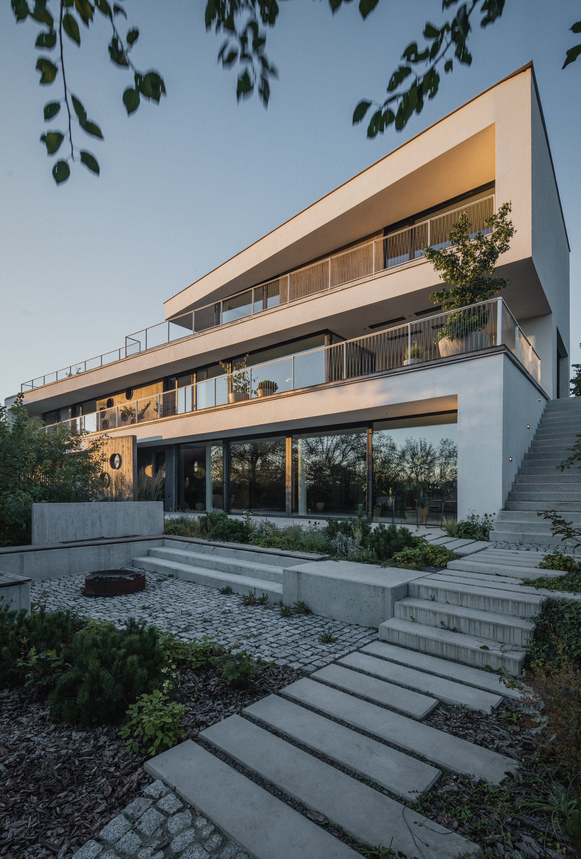 The family house in Skalica was built on an extremely challenging, but at the same time exceptionally attractive plot of land. The entire area is significantly sloping, with a distinct terrain break of one storey in height. This fact became a defining element of the design – the architectural concept works with the terrain not as a limitation, but as an opportunity to create a building that is in direct dialogue with the landscape.