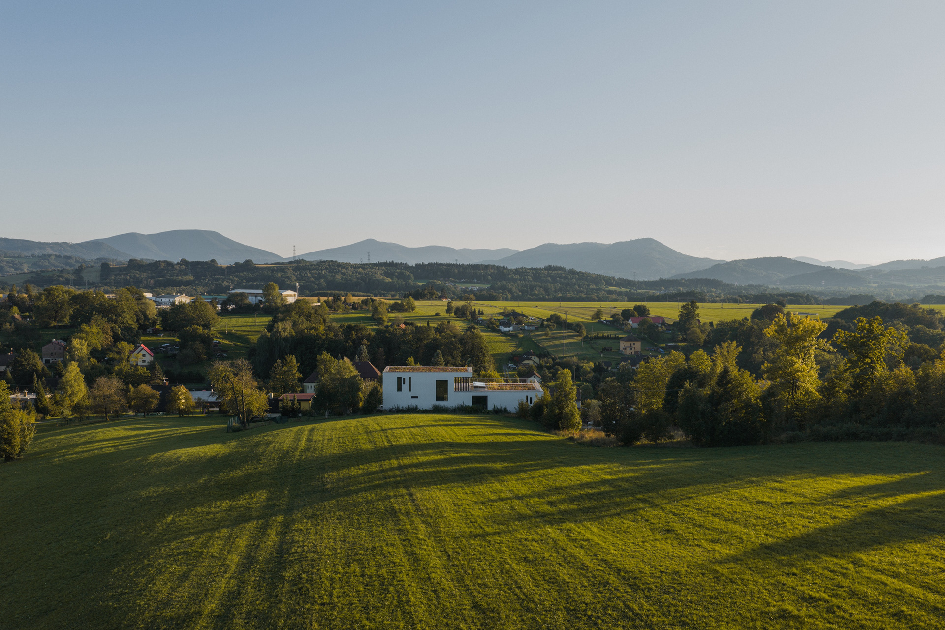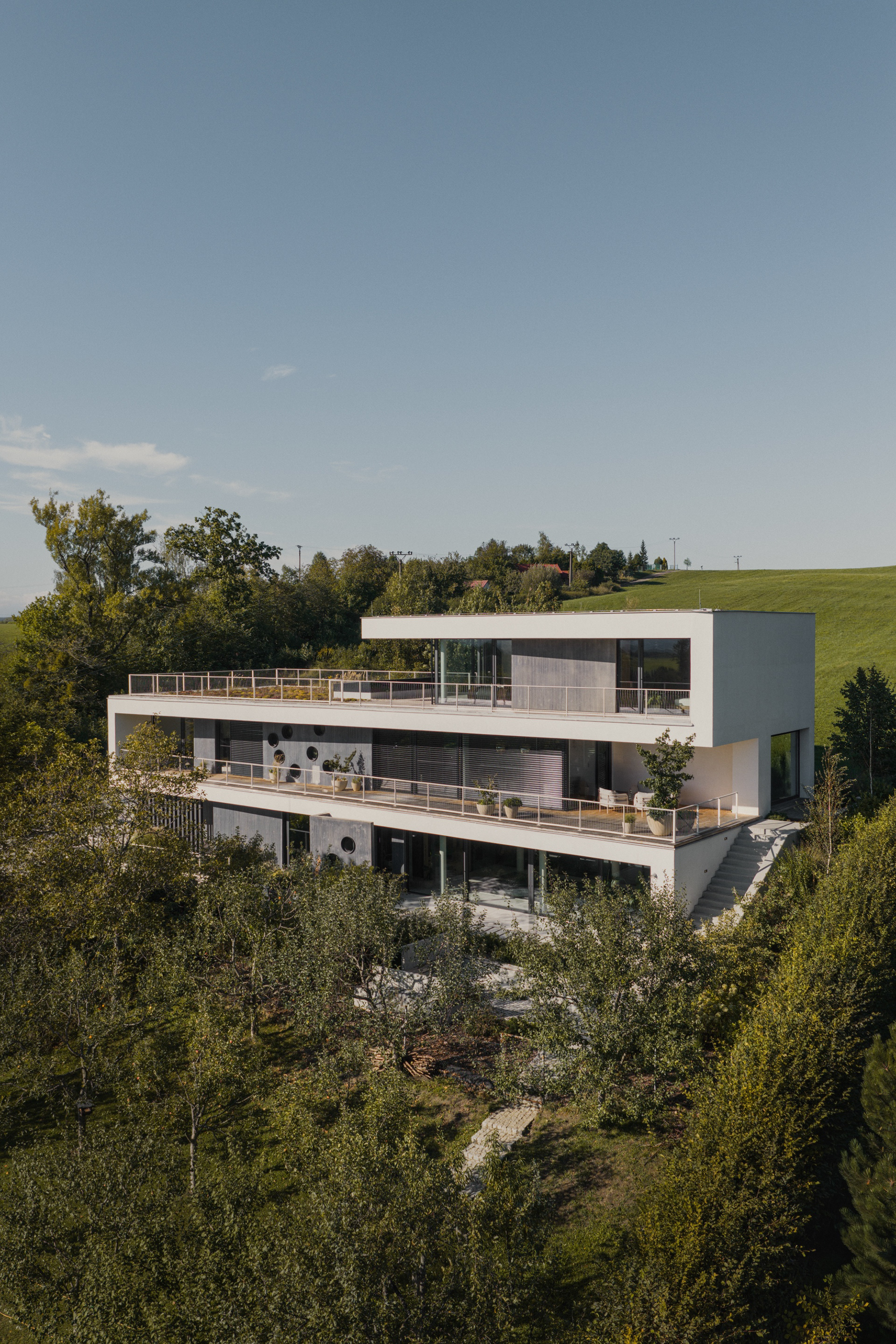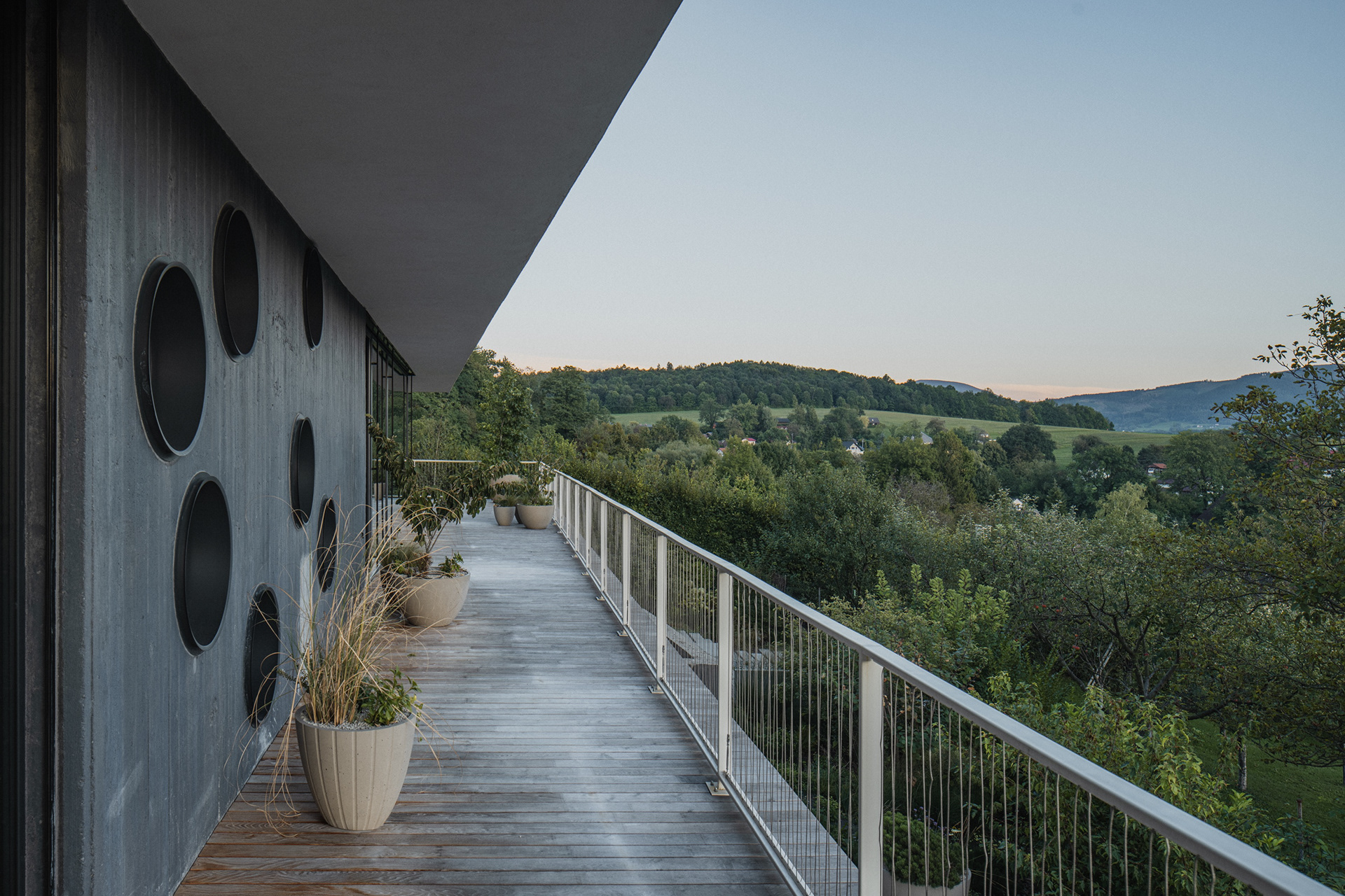 Rodinný dům ve Skalici vznikl na mimořádně náročném, ale současně výjimečně atraktivním pozemku. Celé území je výrazně svažité, se zřetelným terénním zlomem o výšce jednoho podlaží. Tato skutečnost se stala určujícím prvkem návrhu – architektonický koncept pracuje s terénem nikoli jako s omezením, ale jako s příležitostí k vytvoření stavby, která je s krajinou v přímém dialogu.