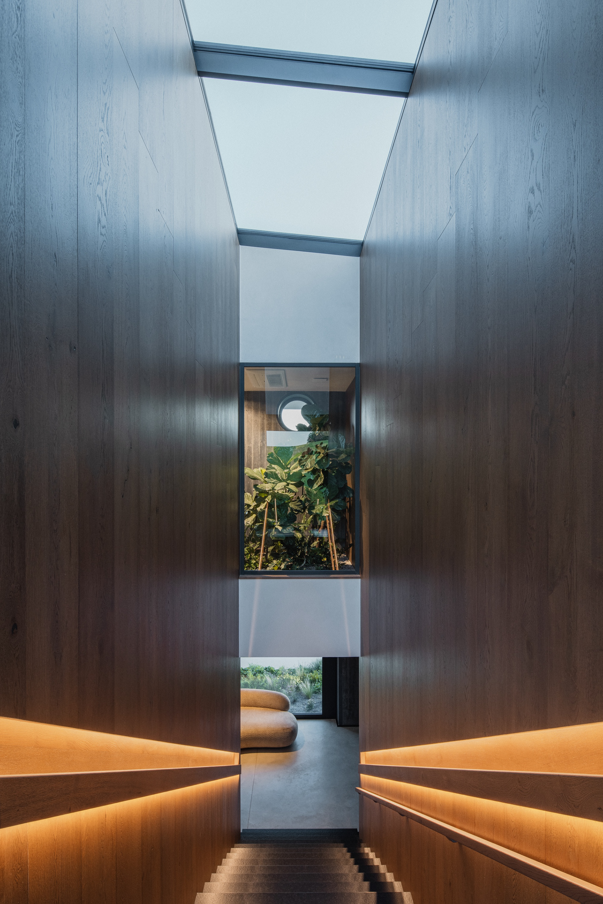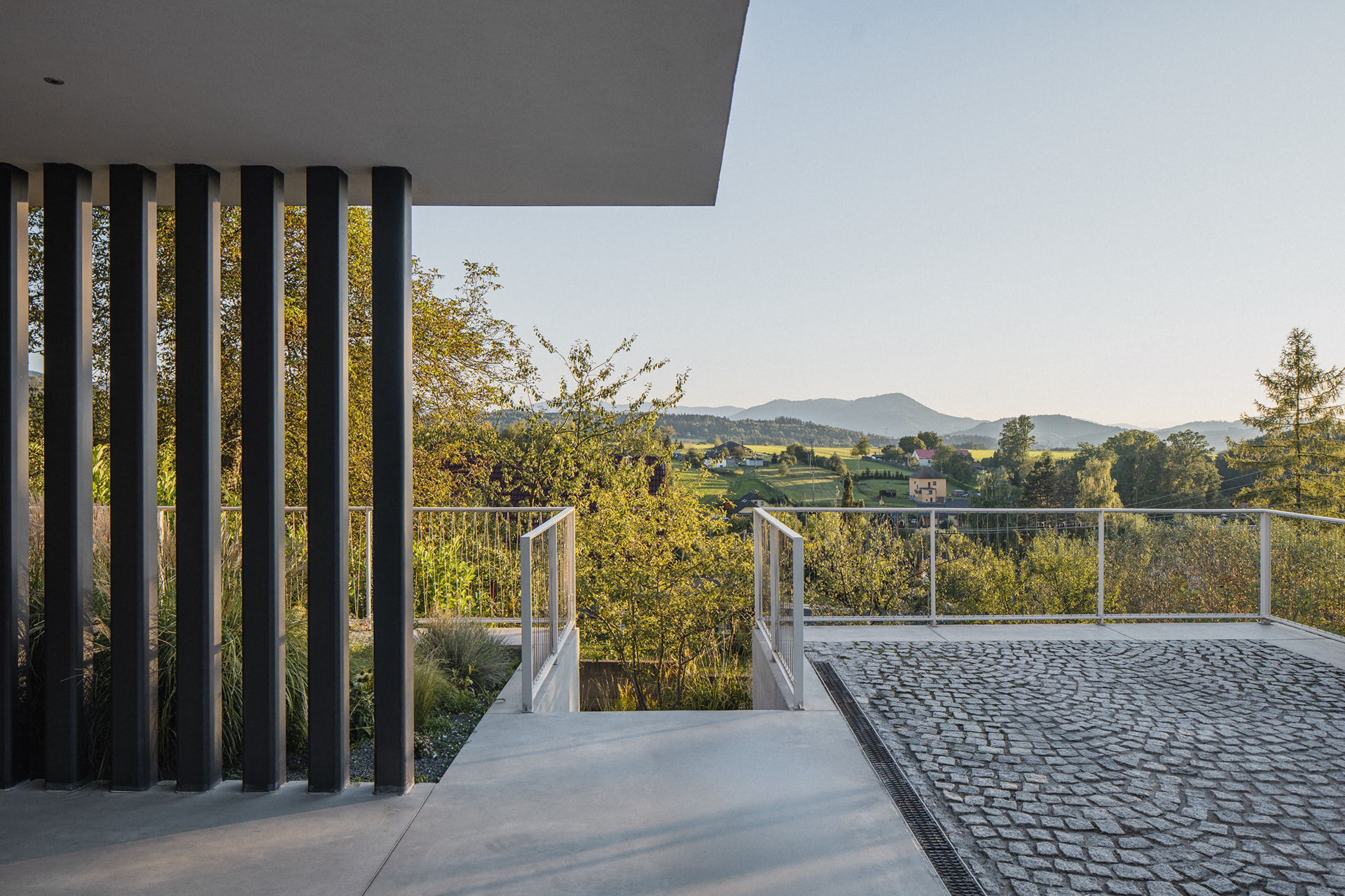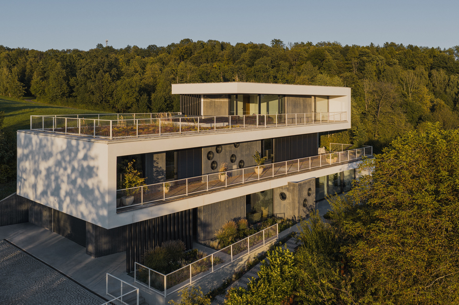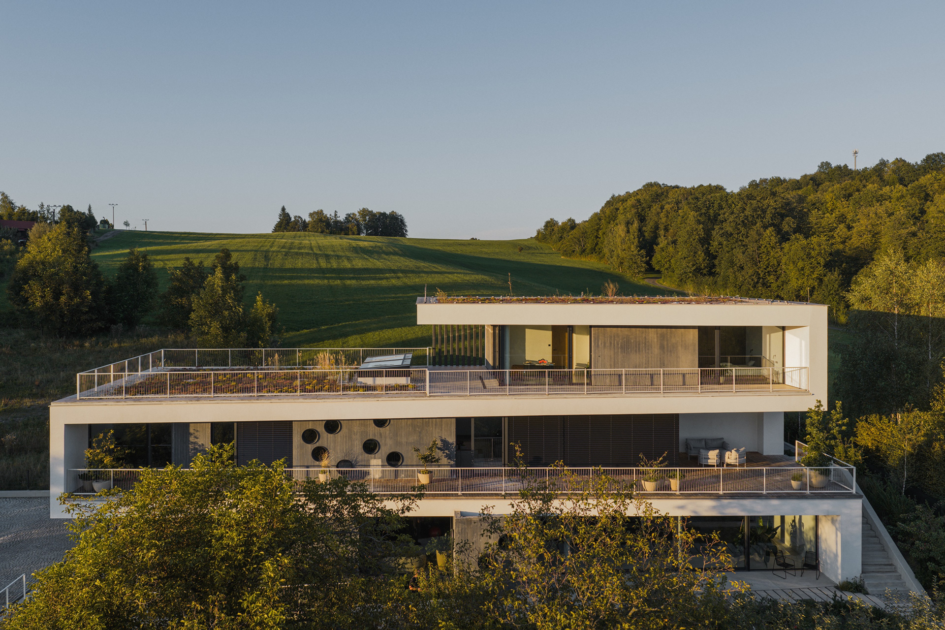 Rodinný dům ve Skalici vznikl na mimořádně náročném, ale současně výjimečně atraktivním pozemku. Celé území je výrazně svažité, se zřetelným terénním zlomem o výšce jednoho podlaží. Tato skutečnost se stala určujícím prvkem návrhu – architektonický koncept pracuje s terénem nikoli jako s omezením, ale jako s příležitostí k vytvoření stavby, která je s krajinou v přímém dialogu.