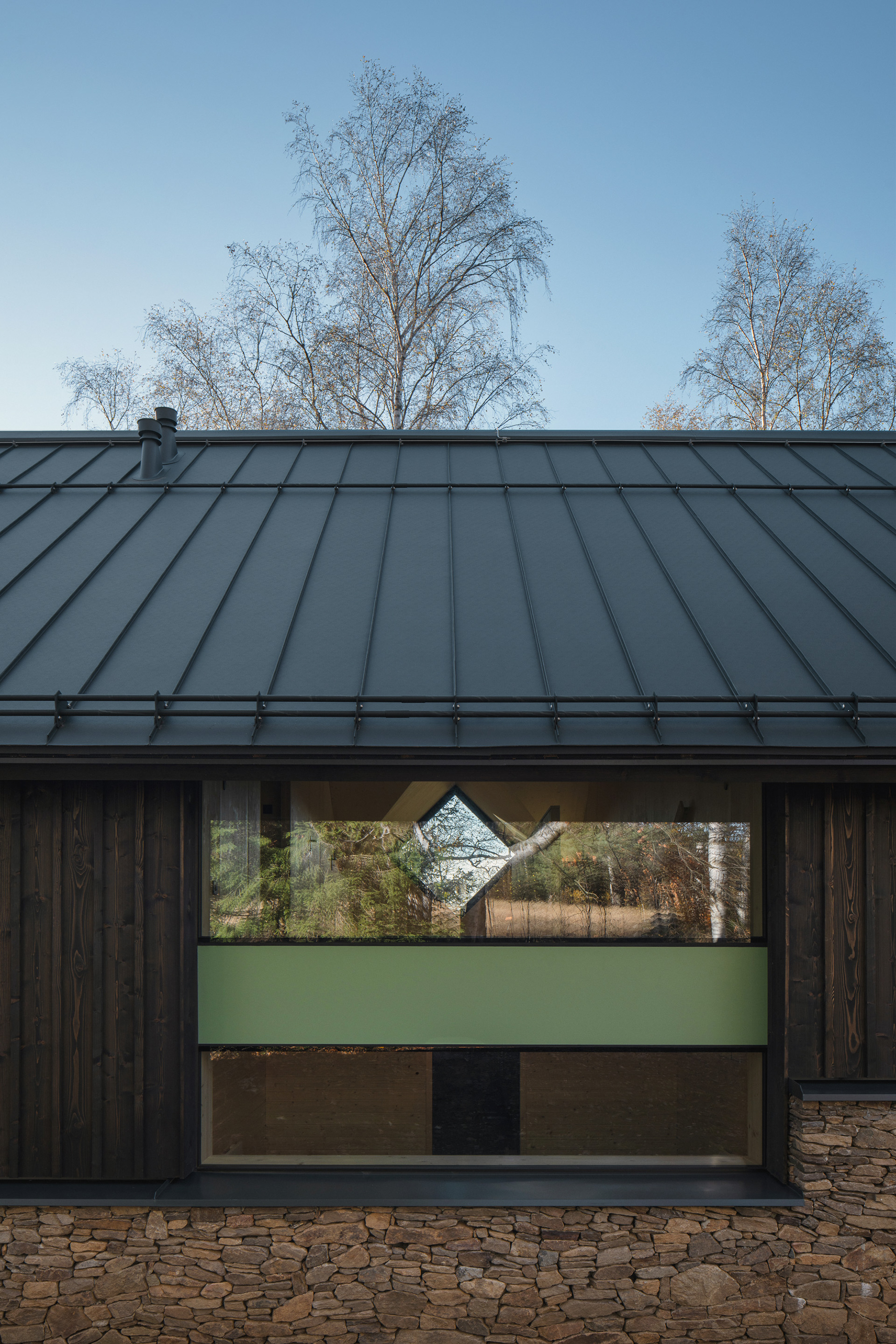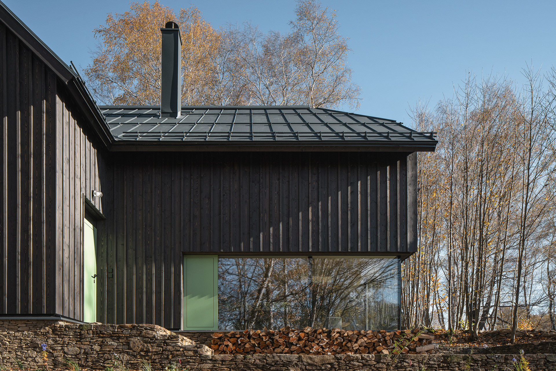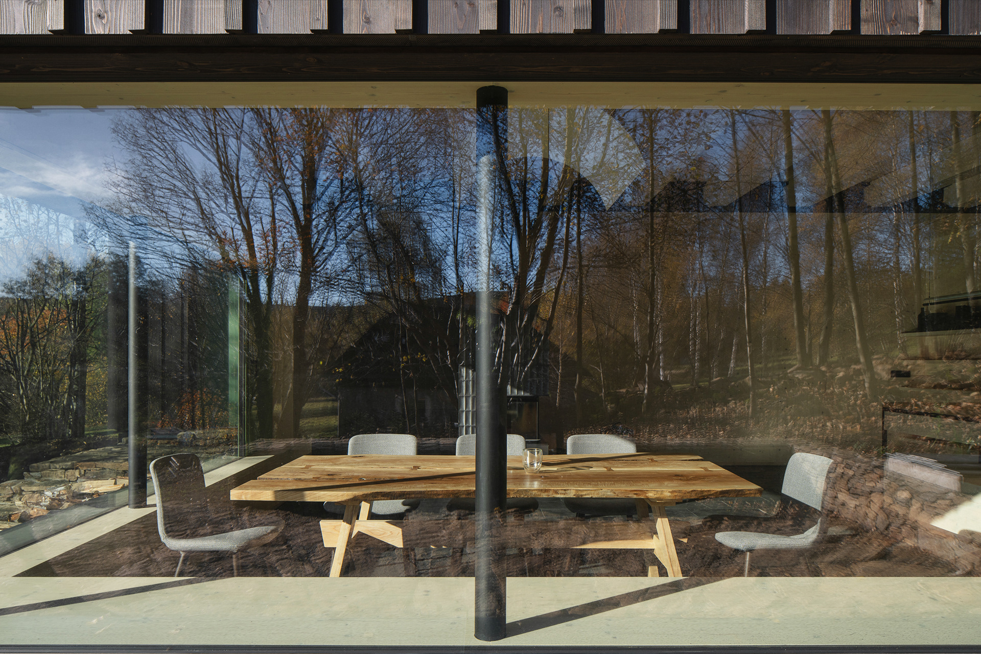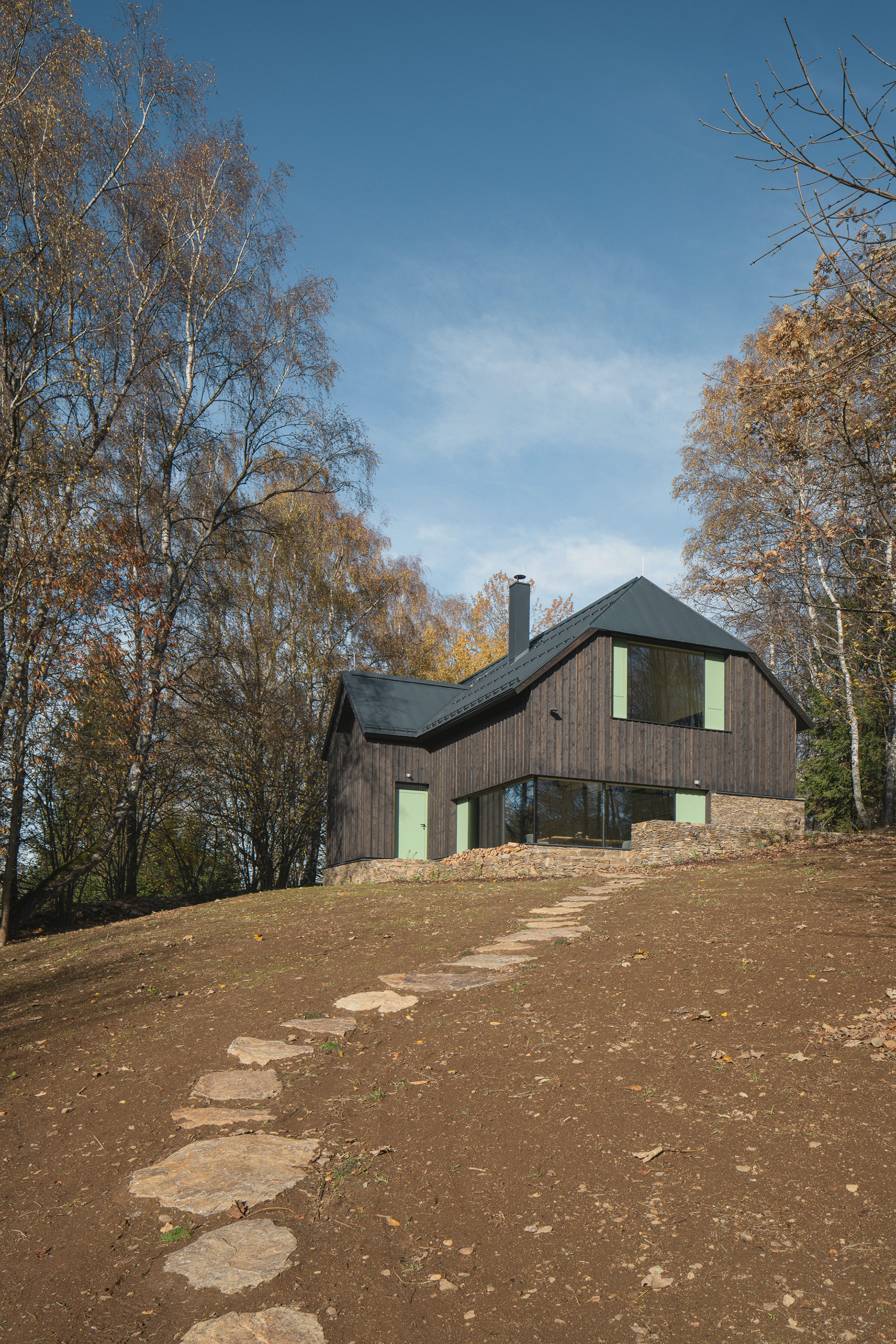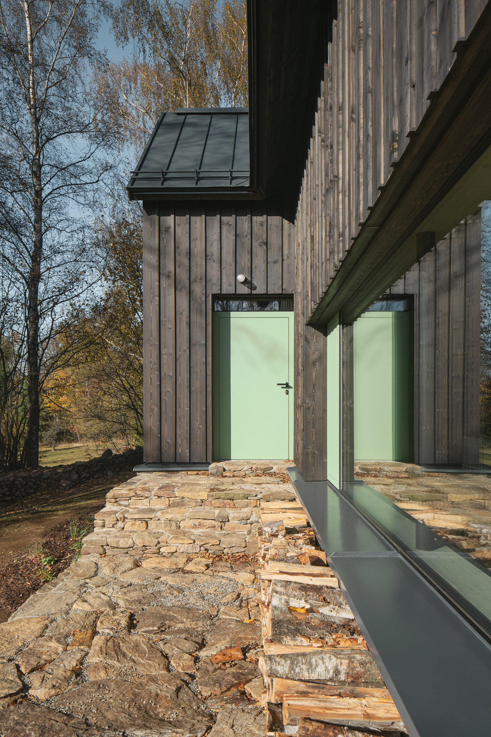 The construction site is part of the Šumava National Park. The Via Nova pilgrimage route to Svatá Hora near Příbram runs under the land. We placed the building according to local building customs and to take advantage of the beautiful views, parallel to the contour lines. The building is set into a slope with minimal landscaping. The land is not fenced, the terraces made of stone drifts around the perimeter were renovated. Natural materials in colors identical to the original buildings are dark stained wood and light plaster. The layout of the house is similar to a rural building with a typical division into housing and service.