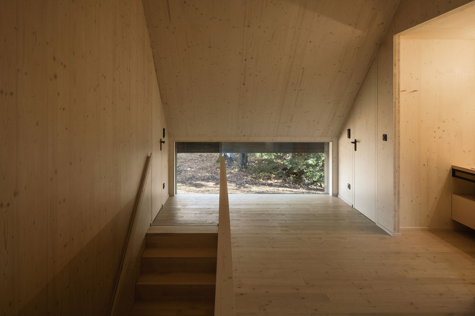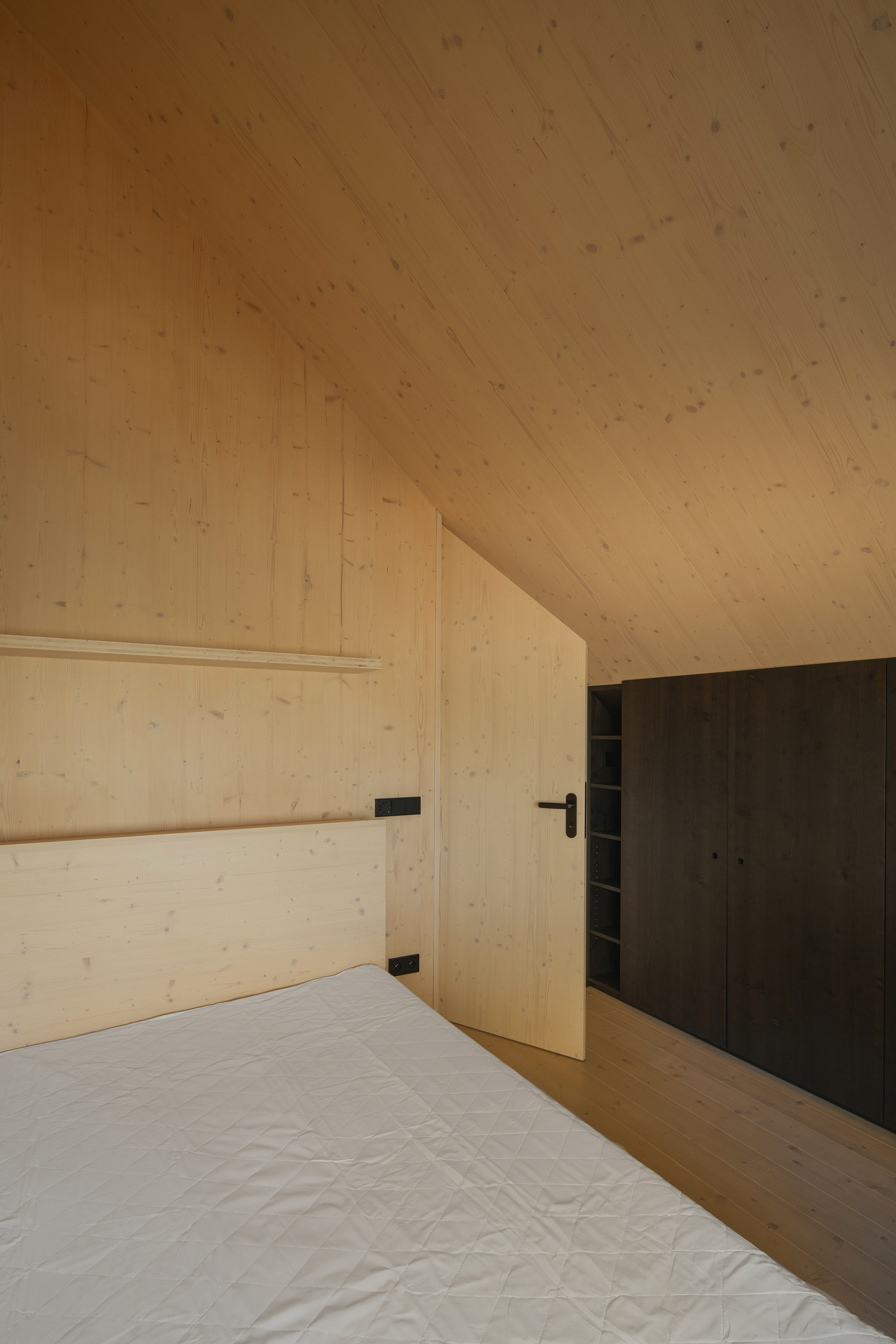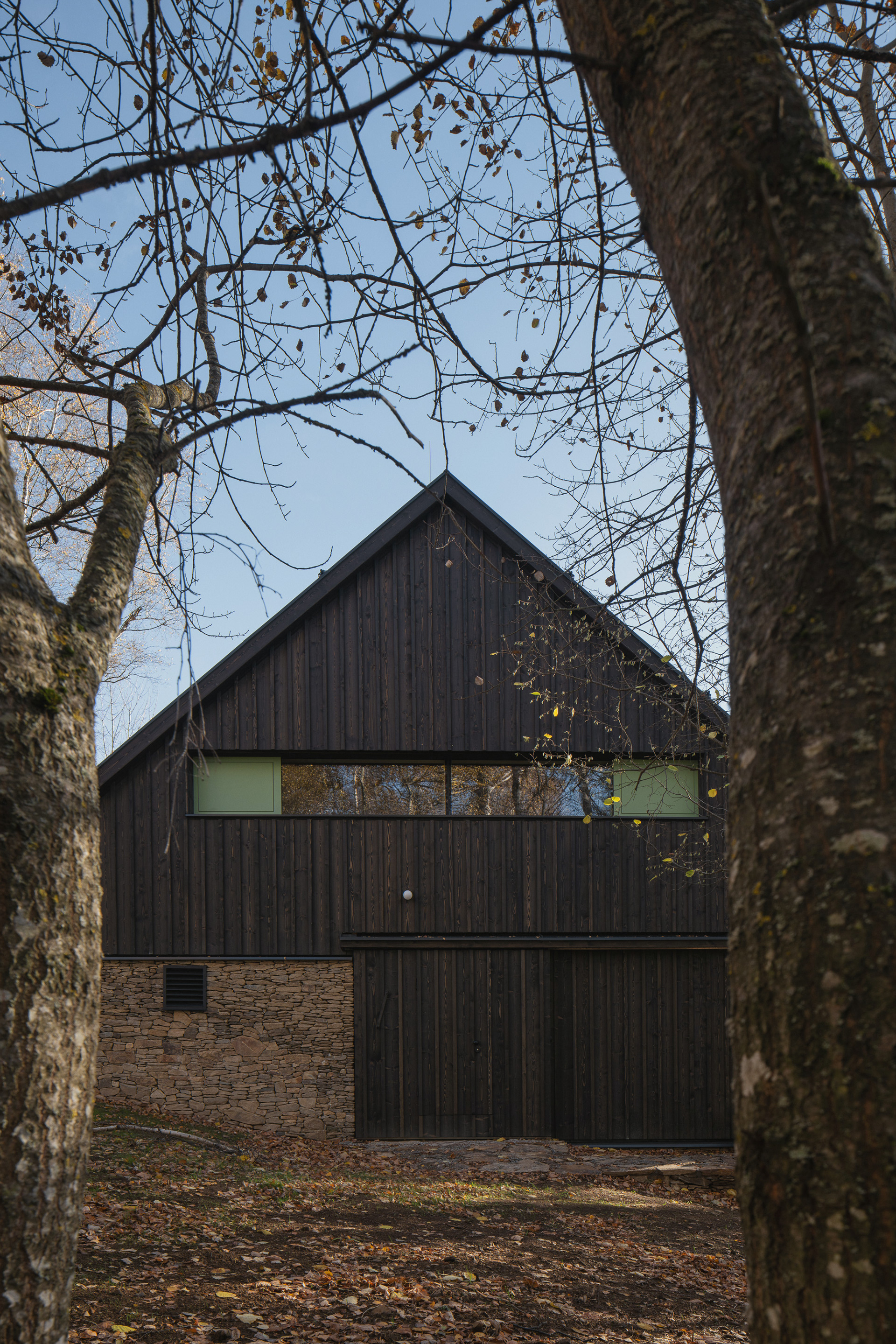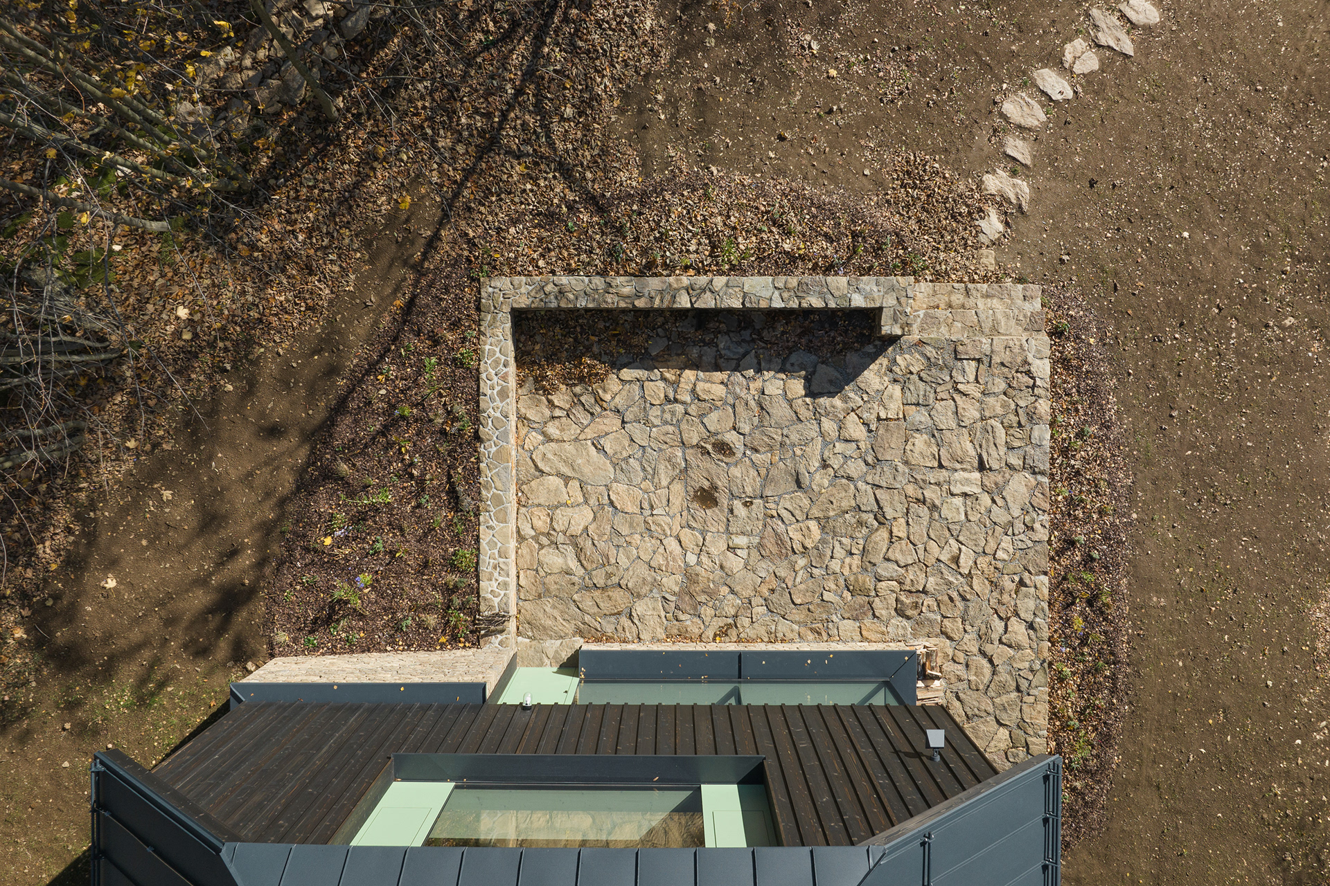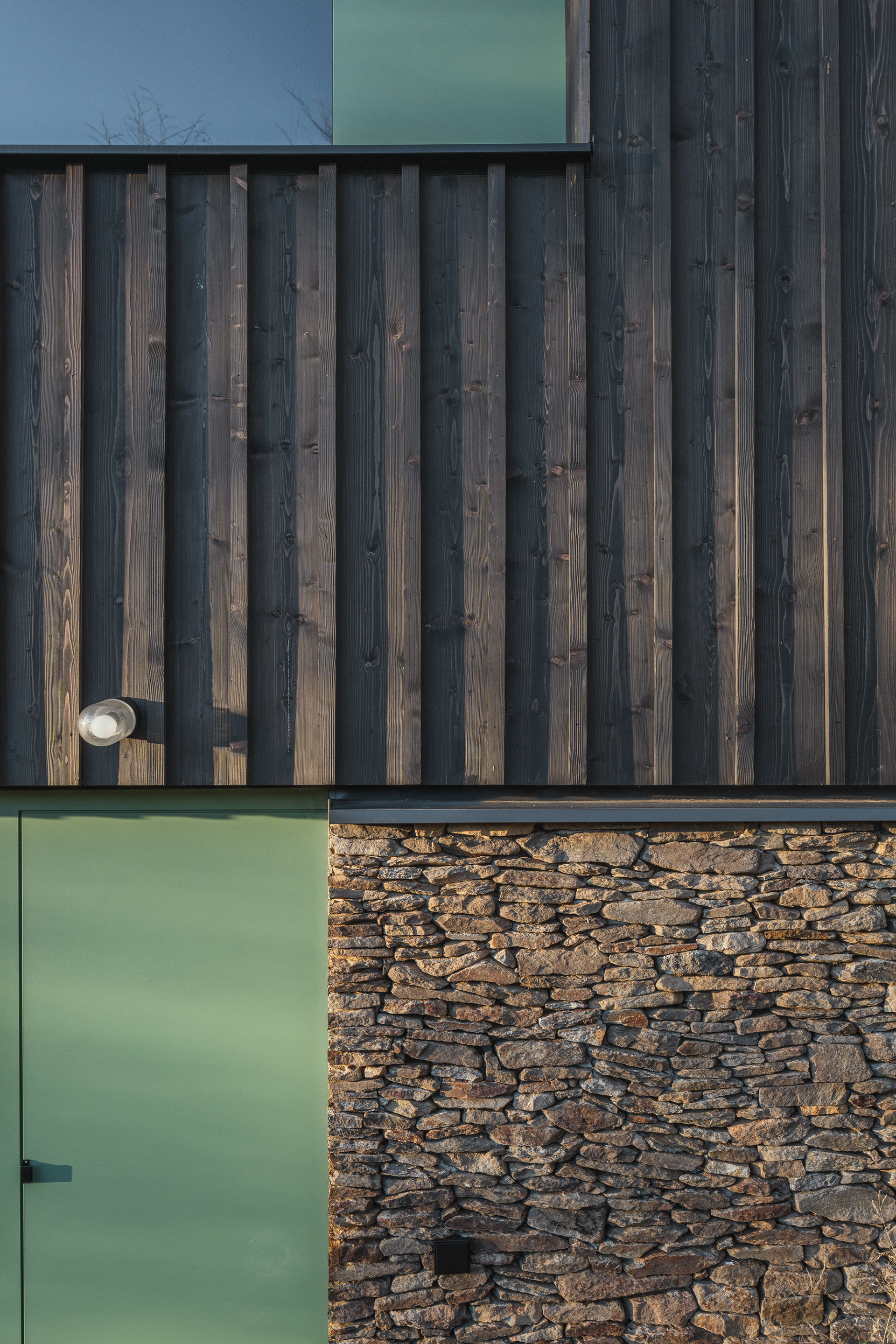 The construction site is part of the Šumava National Park. The Via Nova pilgrimage route to Svatá Hora near Příbram runs under the land. We placed the building according to local building customs and to take advantage of the beautiful views, parallel to the contour lines. The building is set into a slope with minimal landscaping. The land is not fenced, the terraces made of stone drifts around the perimeter were renovated. Natural materials in colors identical to the original buildings are dark stained wood and light plaster. The layout of the house is similar to a rural building with a typical division into housing and service.