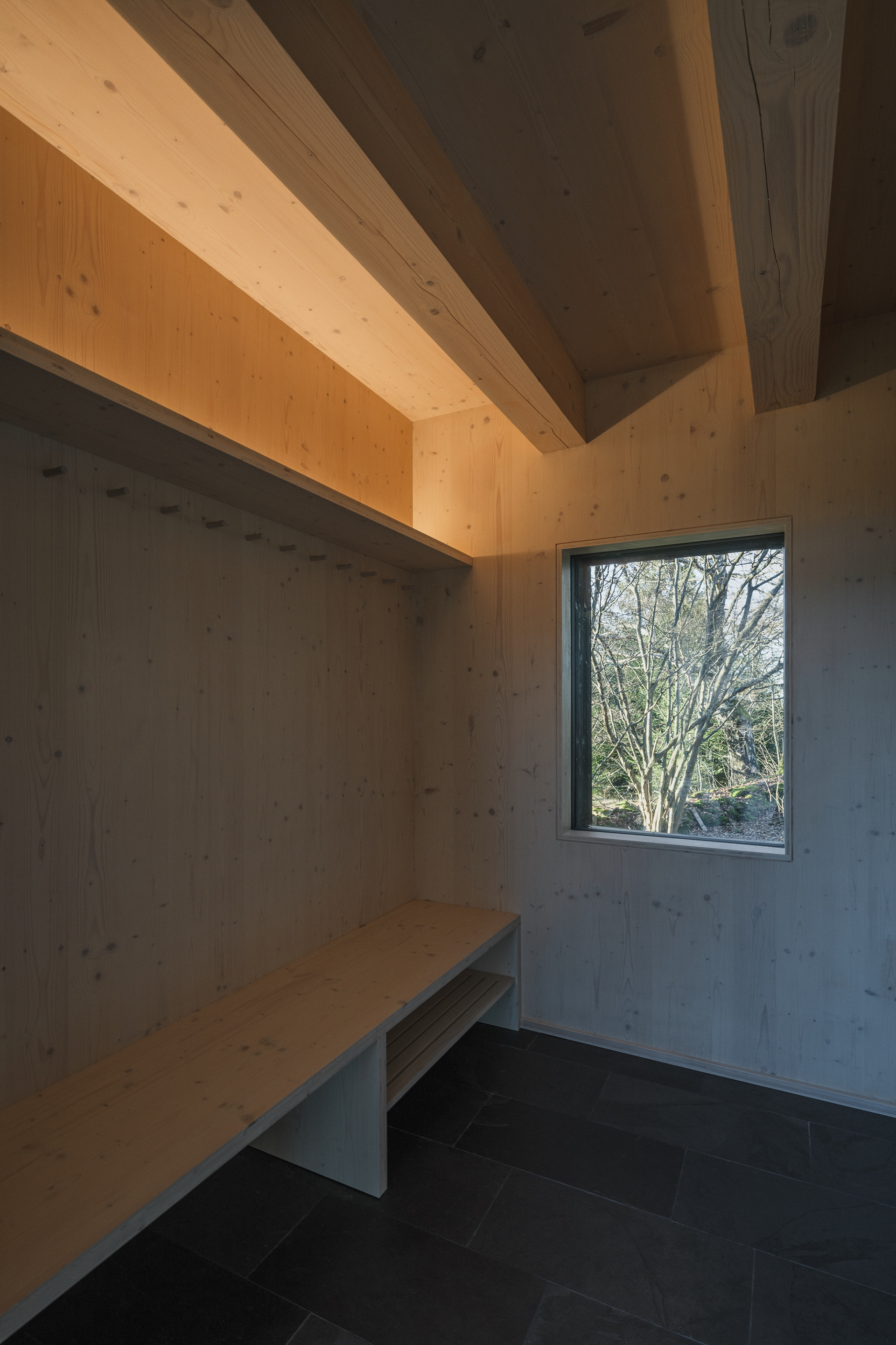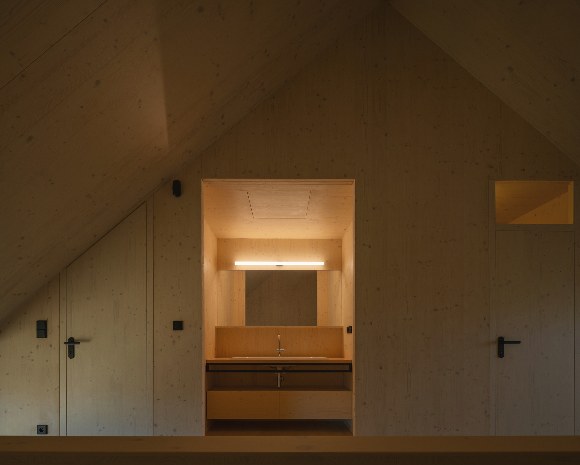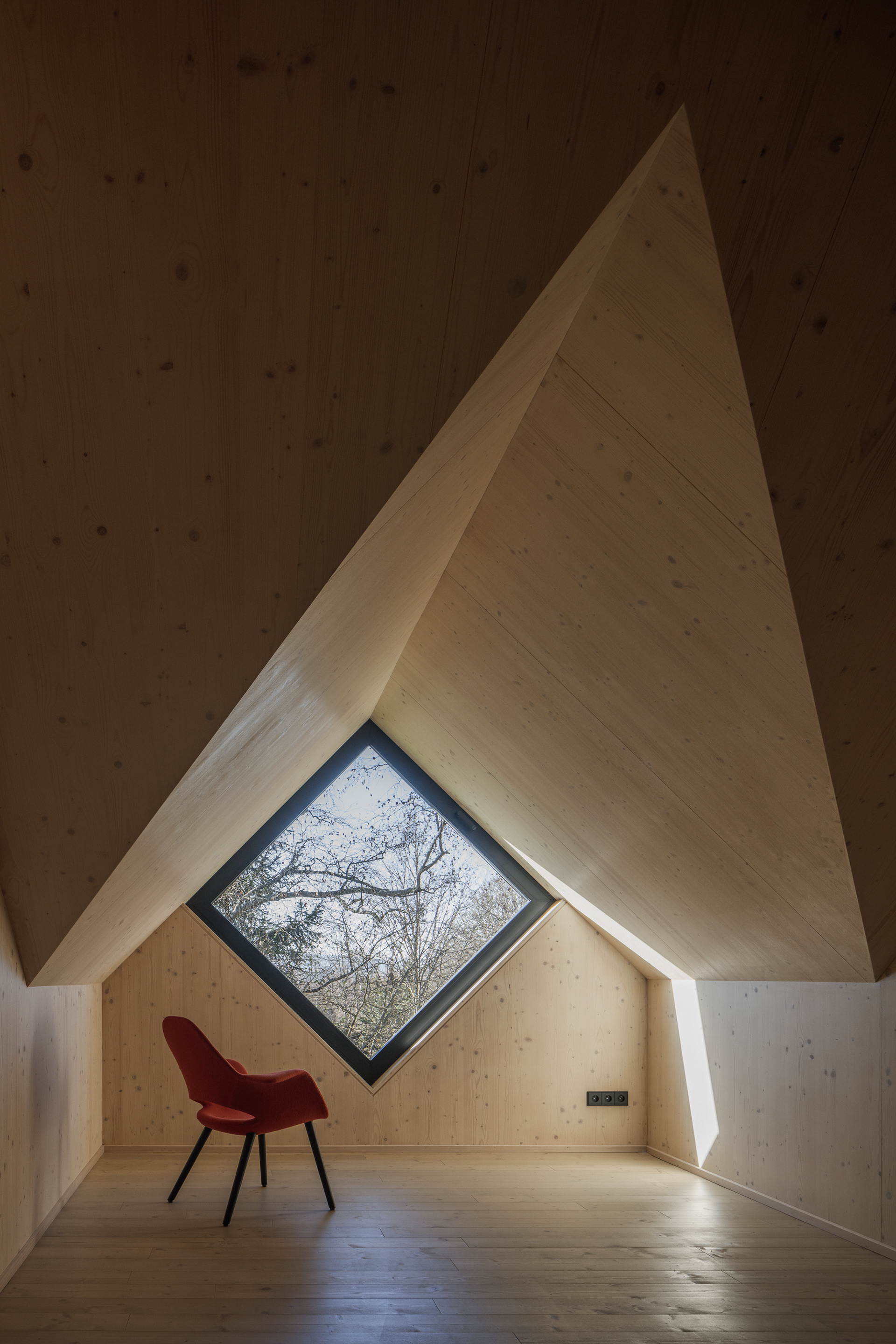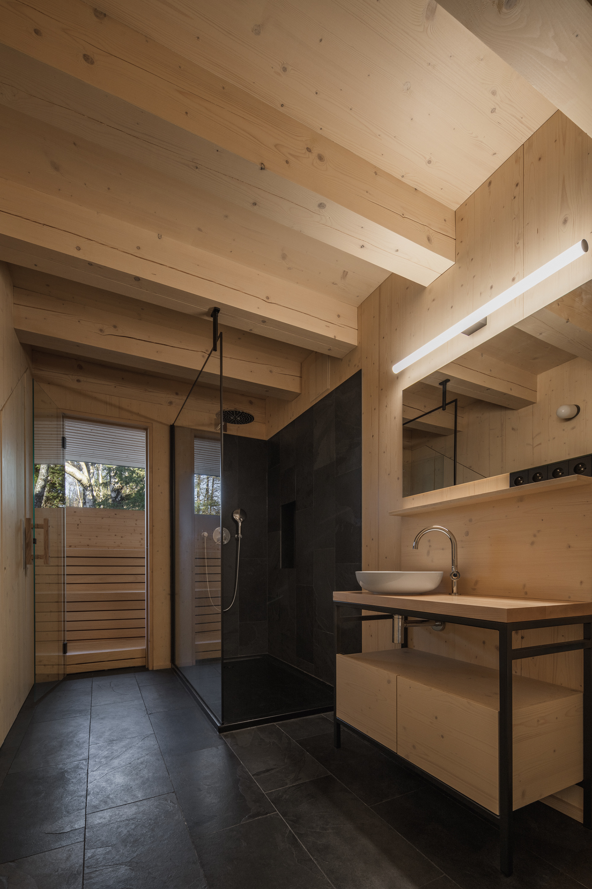 The construction site is part of the Šumava National Park. The Via Nova pilgrimage route to Svatá Hora near Příbram runs under the land. We placed the building according to local building customs and to take advantage of the beautiful views, parallel to the contour lines. The building is set into a slope with minimal landscaping. The land is not fenced, the terraces made of stone drifts around the perimeter were renovated. Natural materials in colors identical to the original buildings are dark stained wood and light plaster. The layout of the house is similar to a rural building with a typical division into housing and service.