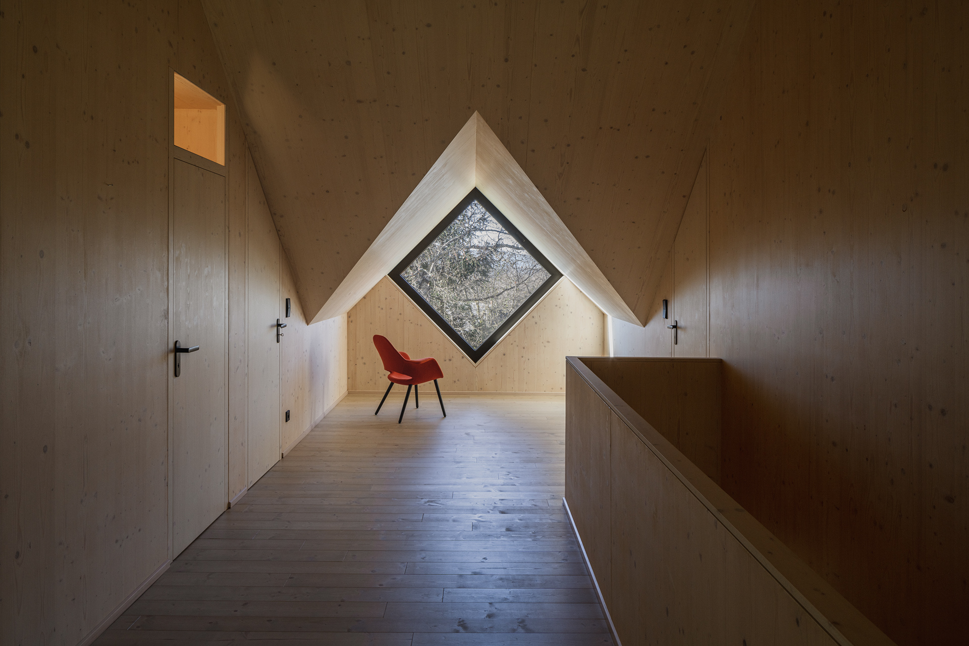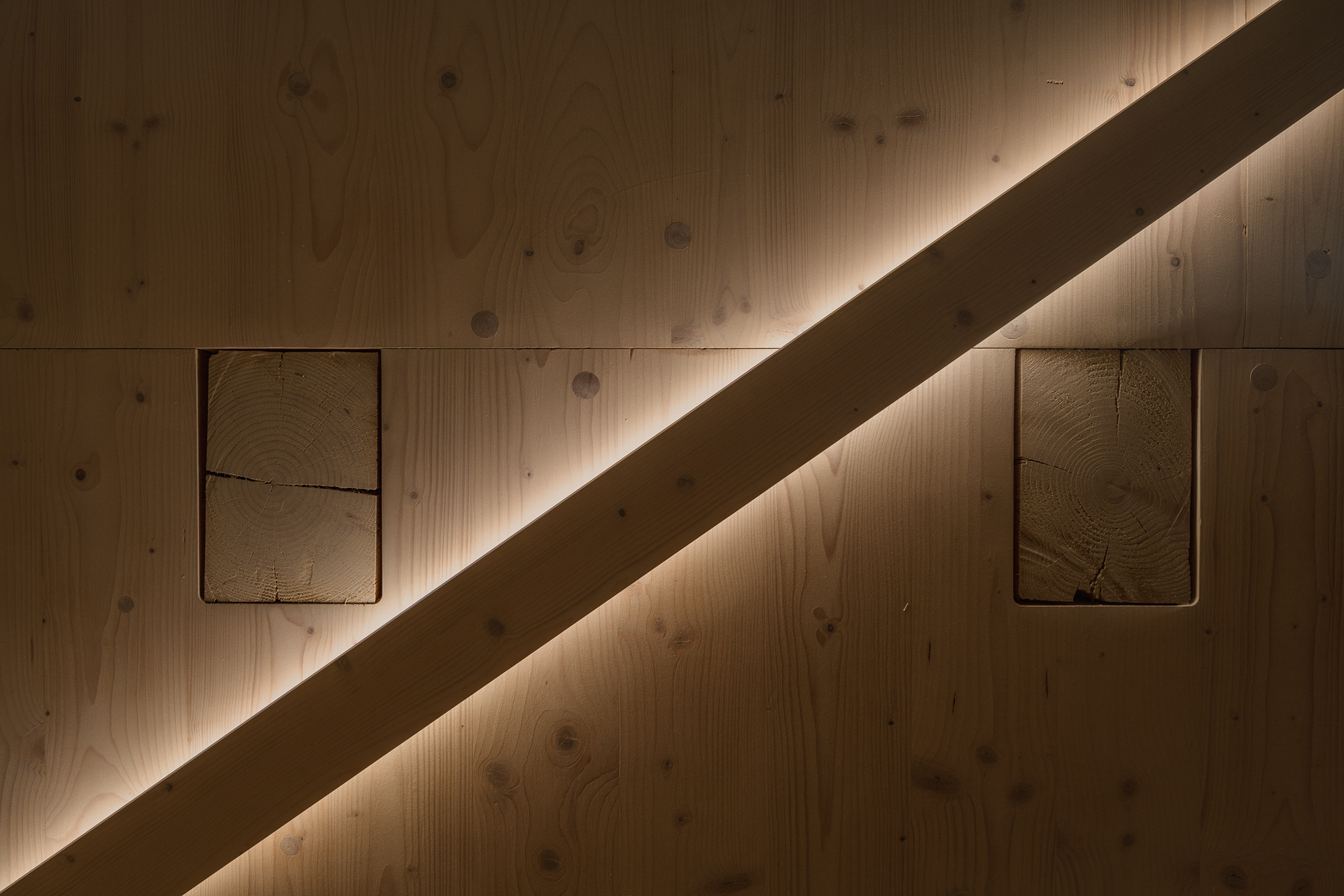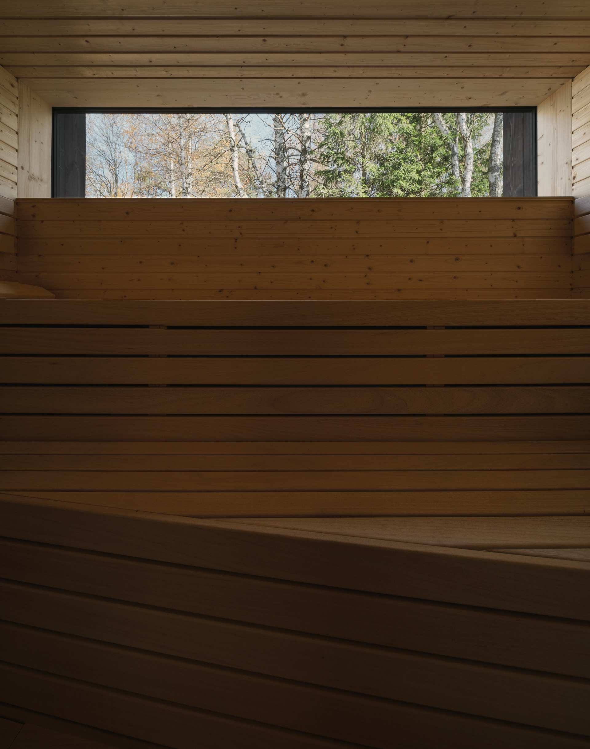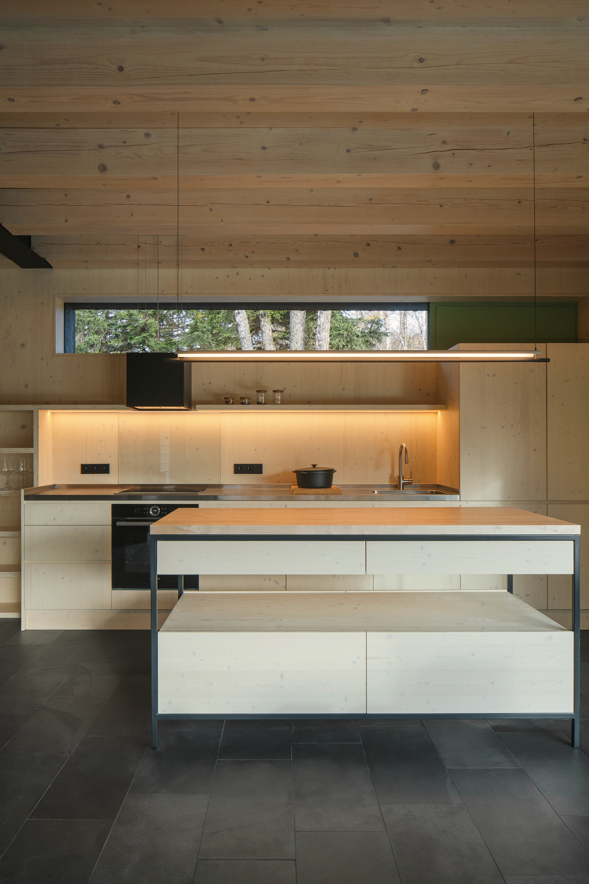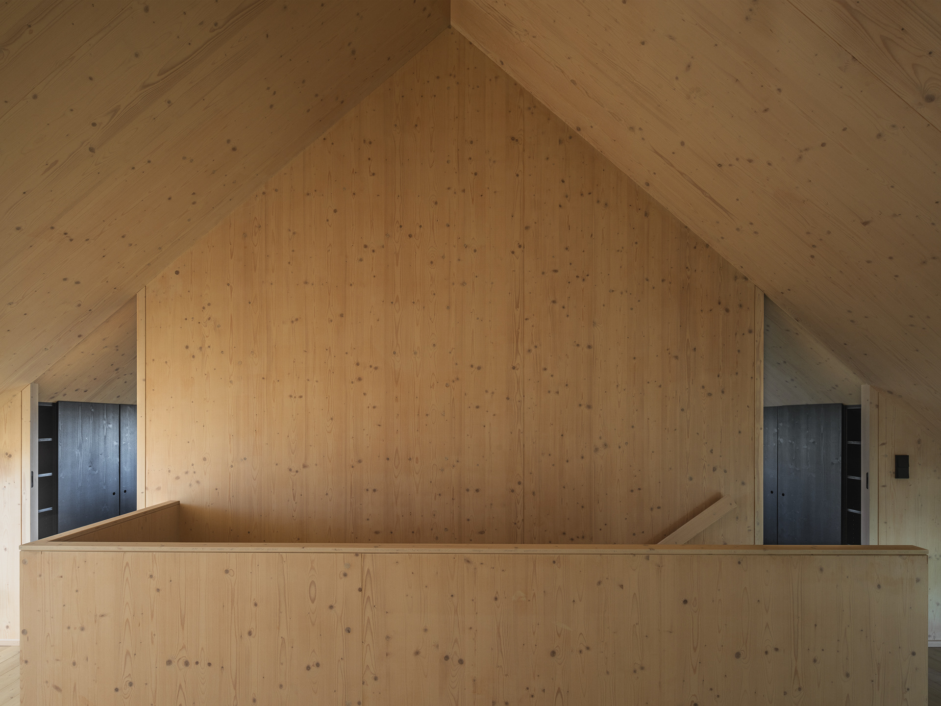The construction site is part of the Šumava National Park. The Via Nova pilgrimage route to Svatá Hora near Příbram runs under the land. We placed the building according to local building customs and to take advantage of the beautiful views, parallel to the contour lines. The building is set into a slope with minimal landscaping. The land is not fenced, the terraces made of stone drifts around the perimeter were renovated. Natural materials in colors identical to the original buildings are dark stained wood and light plaster. The layout of the house is similar to a rural building with a typical division into housing and service.