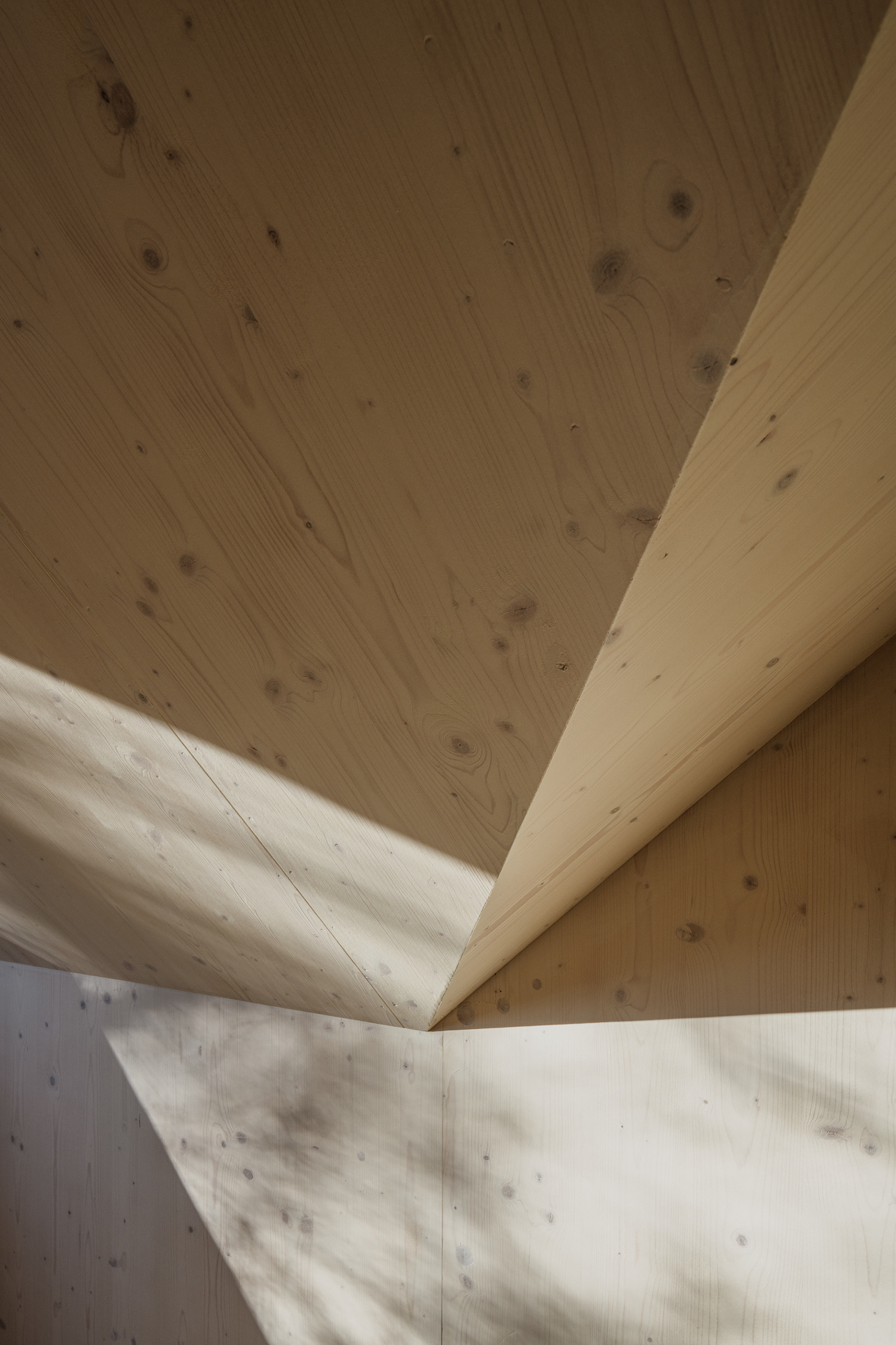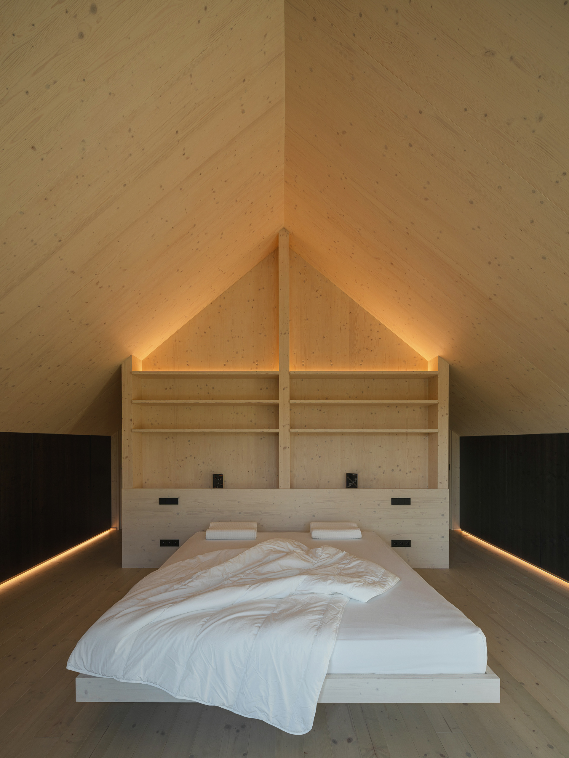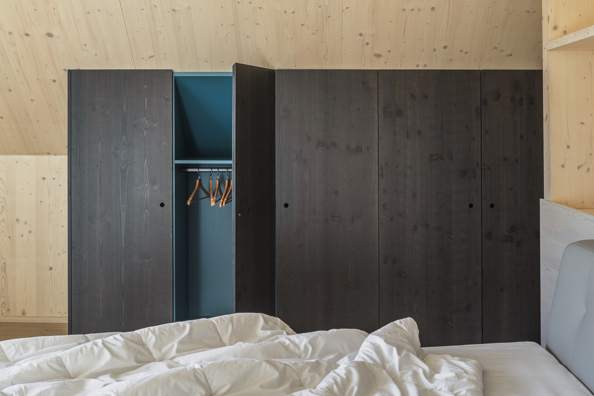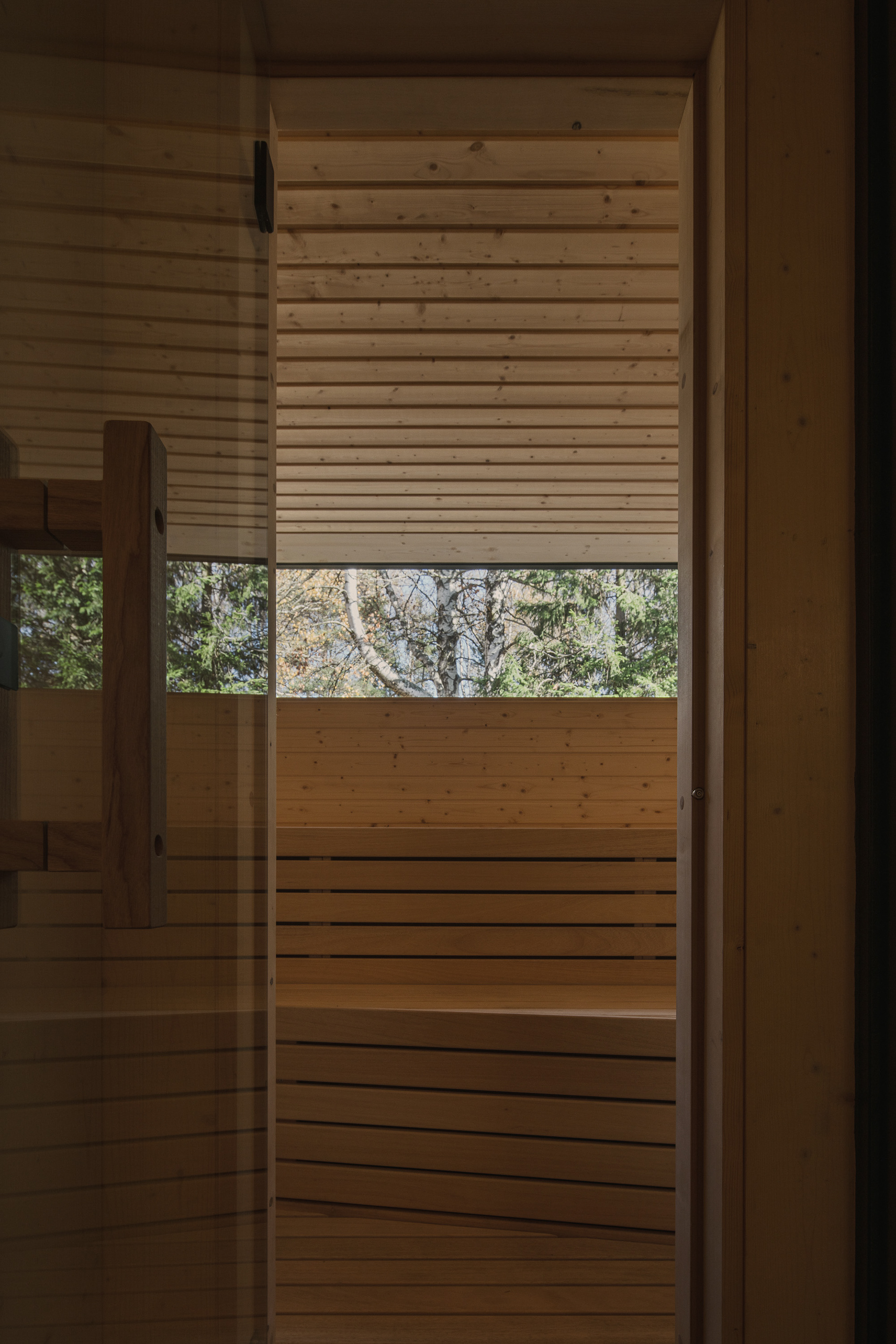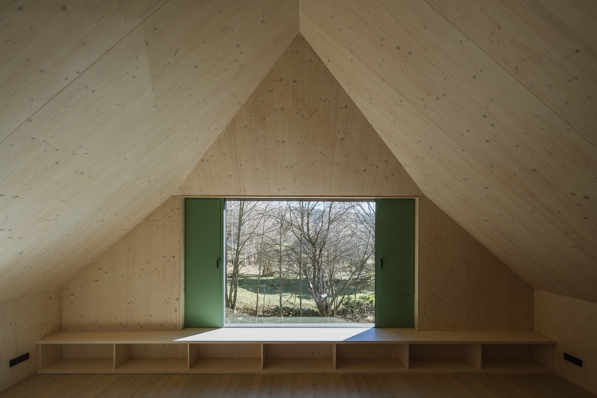The construction site is part of the Šumava National Park. The Via Nova pilgrimage route to Svatá Hora near Příbram runs under the land. We placed the building according to local building customs and to take advantage of the beautiful views, parallel to the contour lines. The building is set into a slope with minimal landscaping. The land is not fenced, the terraces made of stone drifts around the perimeter were renovated. Natural materials in colors identical to the original buildings are dark stained wood and light plaster. The layout of the house is similar to a rural building with a typical division into housing and service.