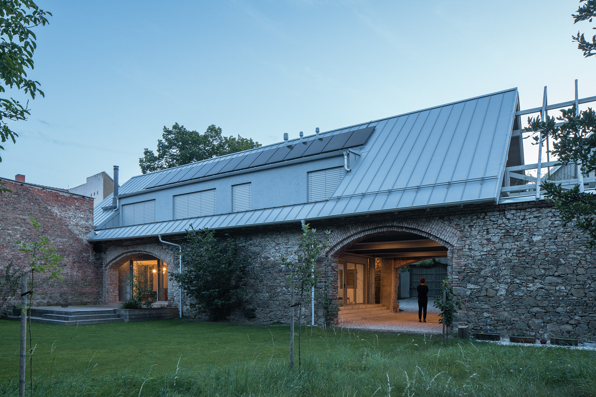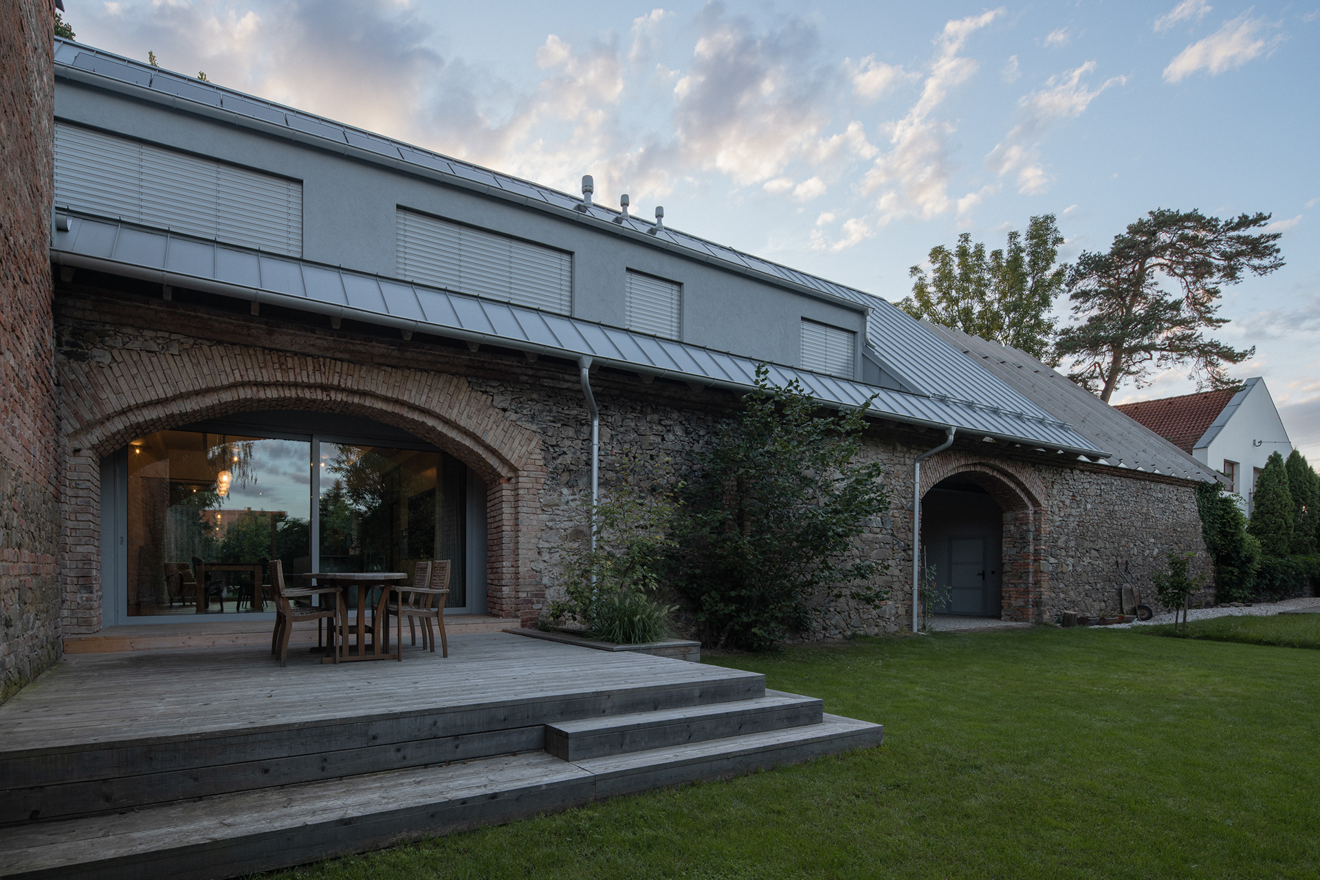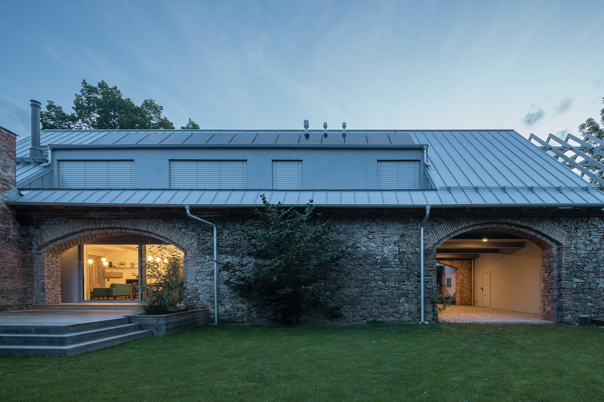 Vesnické tradiční tvarosloví, přitom doslova uprostřed města. Zachováváme torzo stodoly se všemi otvory a necháváme vyniknout poctivé kamenné konstrukci. Nová plechová střecha zastřešuje prostor mezi kamennými stěnami a novým domem a nenápadně prohlubuje kontrast obou historických vrstev. Ve druhém podlaží na severní straně vzniká terasa při výlezu z ložnice.