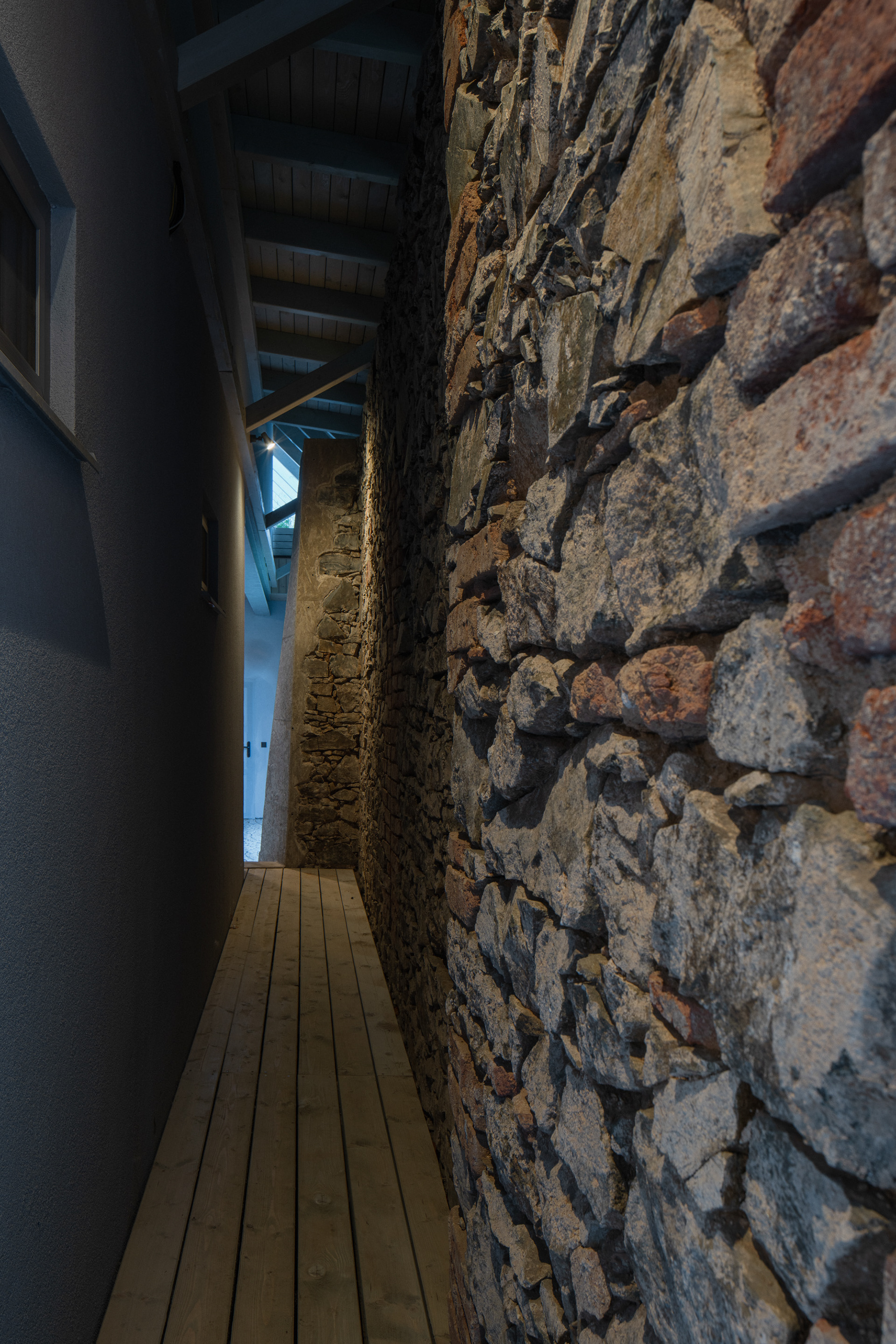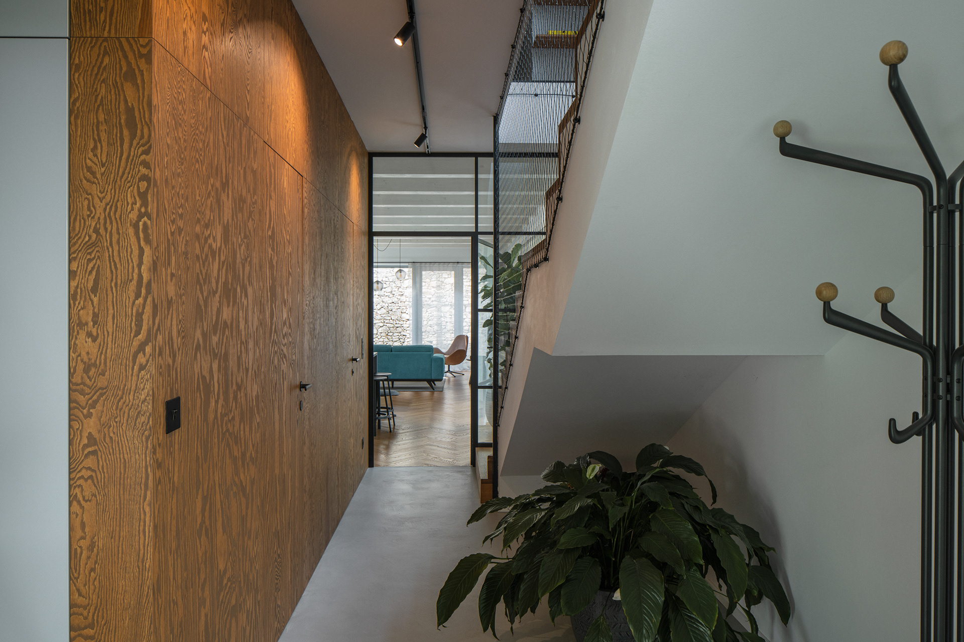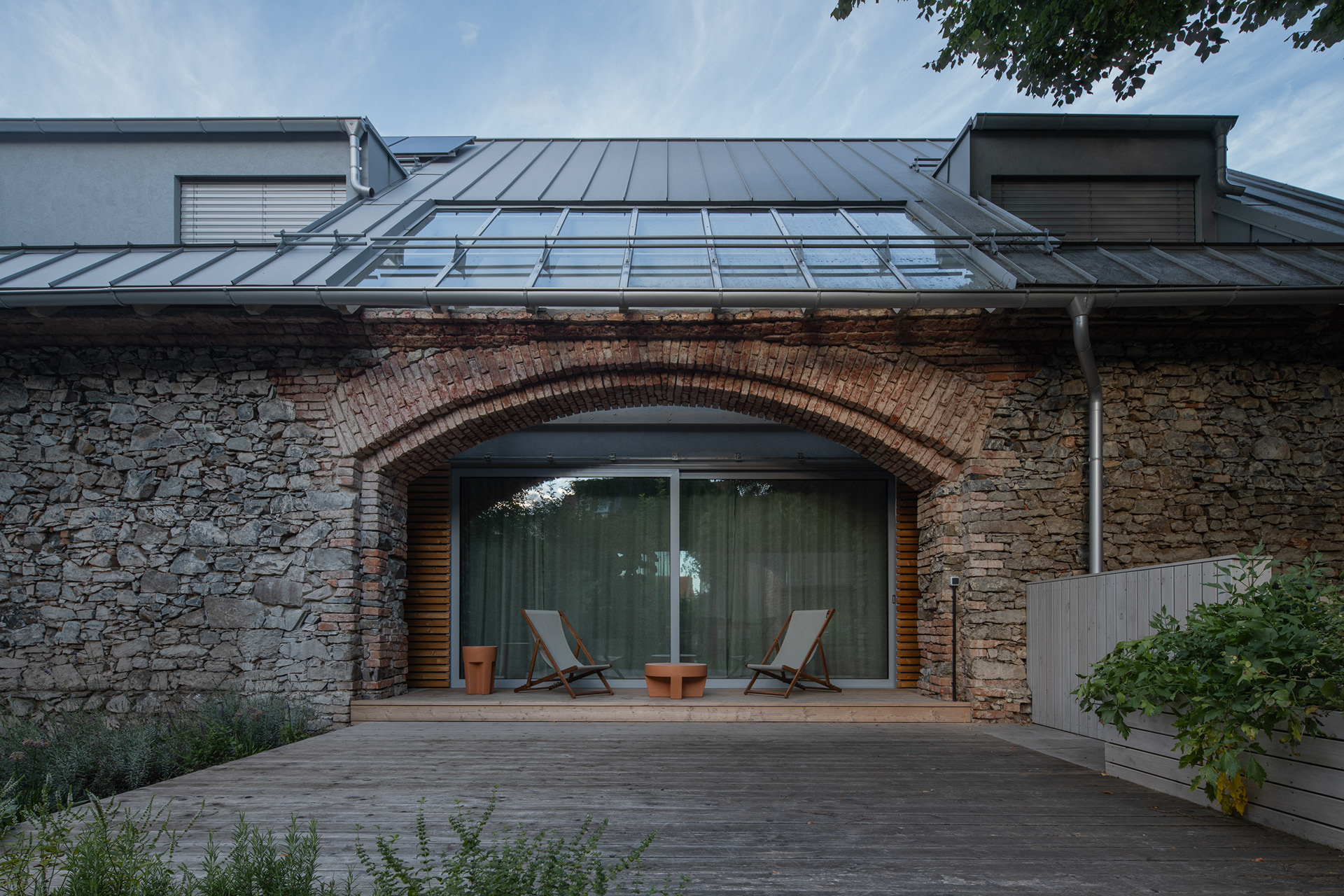 Vesnické tradiční tvarosloví, přitom doslova uprostřed města. Zachováváme torzo stodoly se všemi otvory a necháváme vyniknout poctivé kamenné konstrukci. Nová plechová střecha zastřešuje prostor mezi kamennými stěnami a novým domem a nenápadně prohlubuje kontrast obou historických vrstev. Ve druhém podlaží na severní straně vzniká terasa při výlezu z ložnice.
